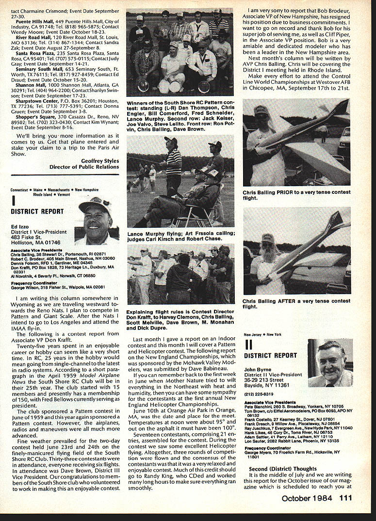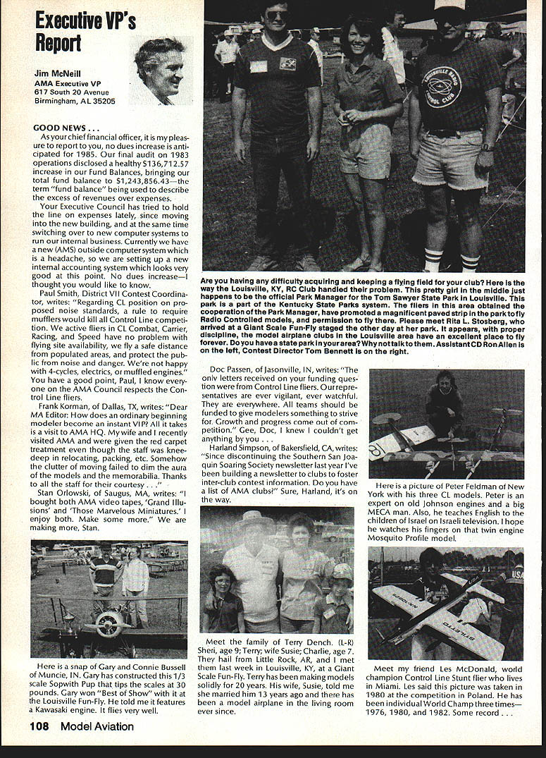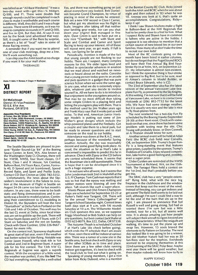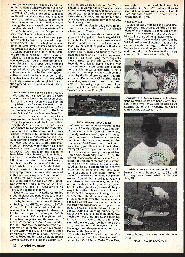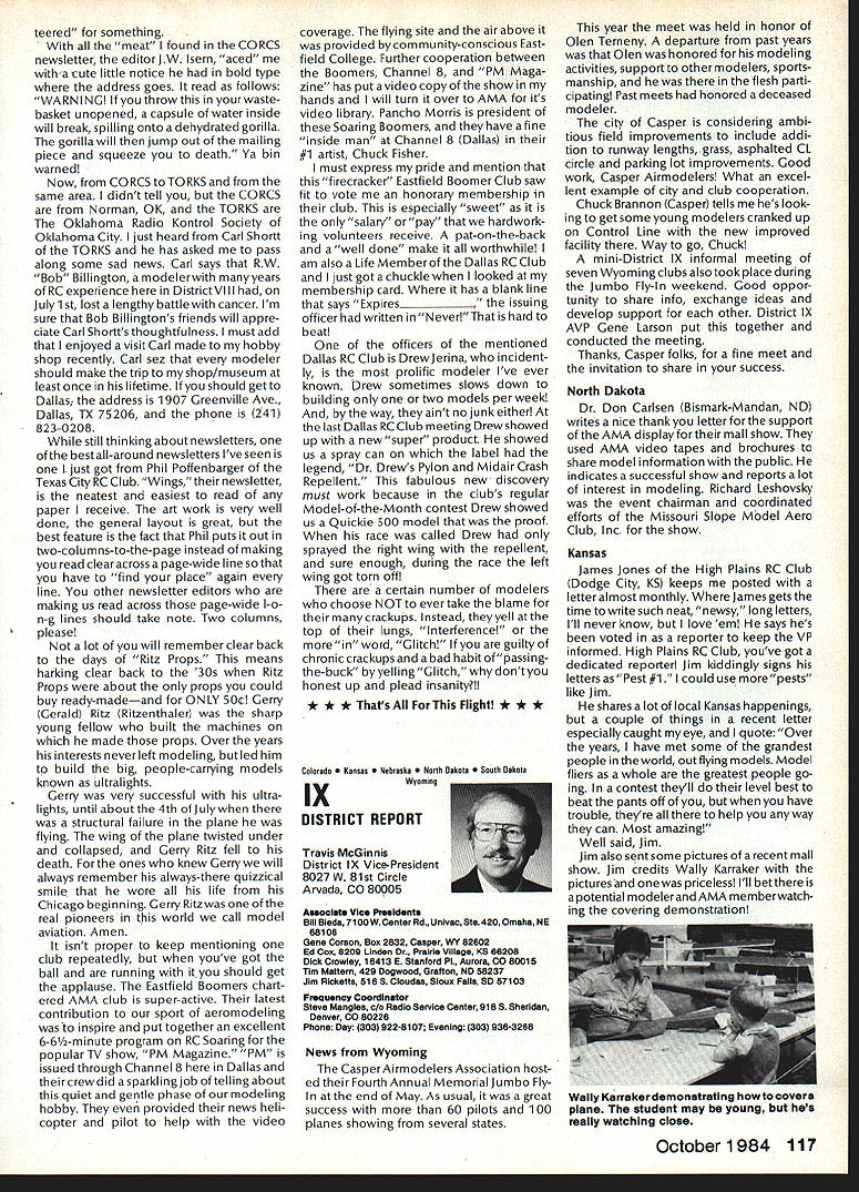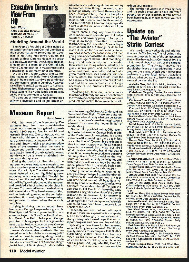 Earlier year followingOpen Letter received number AMA people asked official response entire membership could have benefit answers various questions noted letter response compo site thoughts severalAMA Executive Council members AMAs legal counsel AMA Executive Director others Three basic subjects interest future model aviation questioned Open Letter AMA response addresses particular subject insurance recommended reading members order better informed coverage provided AMA vs mis conceptions Open Letter OPEN LElTER ALL AMA MEMBERS OFFICERS AND STAFF Gentlemen am happy report Omahawks R/C Inc now has sufficient funds cover expected legal expenses involved defense Appeal Action being considered Supreme Court State Nebraska Noise Litigation will won lost through Omahawks efforts individual financial support modelers coast coast am no longer serving president Omahawks R/C Club nor speakforthat organization address fellow AMA members simply anotherAcademy mem berwho interested well-being proliferation hobby has enjoyed over 50 years Thirties built flew Rubber Gas Free Flight Forties Control Line added Since early Fifties RC has major interest initiated myfirst model club 1939 directed first AMA sanctioned meet 1946 throughout late Forties early Fifties organized directed AMA sanc tioned Plymouth International Elimination Meets held Omaha area Sixties Seventies continued assist promotion ourhobbythrough sanctioned Pattern Scale meets mall shows flying demonstrations course National MultiwingChampionships held annually through Seventies have three concerns feel major importance should addressed Omahawks Noise Clubs Insurance. Academy Academy ask give following questions thoughtful consideration find also concerned lets address problems attempt resolve NOISE Has AMA past really come grips noise problem Are fact too noisy Has AMA court through official negotiation ever saved flying site Most importantly now firm policy established will allow another flying site lostwithout organized national effort stand firm protect collective interests rights CHARTERING IstheAMAan organization modelers modelers fact organization chartered clubs dedicated building ever larger national entity Char tered clubs great financial value Academy Academy certainly value chartered clubs must AMA member join chartered club orderto recognized loyal member Academy share full benefits membership Must club char tered orderfor considered asset hobby forthe Academyto survive INSURANCE ourcurrent insurance pro gram conceived Alexander & Alexan der worth premium much protec tion really have considering multitude requirements involved fact policy $1 00000 deductible further fact reserve account $1 00000 has set aside protec tion membership theirlandlords What claims have paid past Has single noise suit ever defended What protection exists strictly injunc tive action no monetary demands made Very sincerely 0 L Olson Jr AMA #9529 Dear Mr 0 Olson Jr Re Response An Open Letter January 29 1983 AMA Executive Council heard person explanation suit filed against Omahawks R/C Club alleged noise pollution Council sympathetic clubs plight members Council felt could support cause individuals due fact Omahawks still chartered AMA asked keep Council apprised situation developed meantime moved passed Council go record giving total moral support Omahawks given such additional support might recommen ded insurance company legal counsel motion reported May 1983 issue Model Aviation page 102 Further updates plight Oma hawks reported Model Aviation magazine June July 1983 March 1984 issues June 1983 issue page 105 stated Oma hawks have legal defense fund asking donations anyone interested helping article stated AMA would collect forward checks made out Omahawks R/C Club Inc help fund drive John Worths letter April 27 1983 addressed restated moral support expressed Executive Council based advice AMAs insurance broker legal counsel Both advisors expressed view AMA should monitor legal proceedings closely out becoming party litigation Re spect positions both Omahawks AMA-affiliated clubs suggested thatAMA intrude defense Oma hawks position ably advanced clubs local counsel General Counsel however offered review documents case past come Furthermore attorneys office indicated willingness provide direct consultation Omaha clubs attorney desired Meanwhile have offered documentation statistics etc files might support Oma hawks case letter February 17 1984 addressed Omahawks attorney General Counsel requested him re view potential AMAs support Omahawks R/C Clubs position before Supreme Court perhaps filing amicus curiae friend court brief otherform support additionally requested supplied copies relevant decisions District Court matter pleadings filed Supreme Court Continued page 109 October1984 105 AMA HQ bY Executive Director including reports AMA President Executive VP Vice-Presidents AMA HO SERvICES STAFF 0O 0 Executive Director John Worth 0 Asaistent Executive Director vince Mankowaki 0 Executive Secretary Joyce HagerO Comptroller Gisele Jackson 0 Competition Services Director Micheline Madison 0 Special Services Director carl MaronayO Membership Director carol MerfeldO Public Relations Director Geoff StylesO Special Events Manager Douglas Pratt0 Publications Director carl WhealeyO Administrative Coordinator Bob \toislaveko 0 0 General Counsel Jeremiah Courtney Presidents Corner President ACADEMY OF MODEL AERONAUTICS JOHN C GRIGG 6387 Badger DriveHome 716 434-3955 Lockport NY 14094Work 716 631-6314 following report trip Peoples Republic China friendly model corn petition exchange model ing skills Mostly will discuss sight seeing portions trip Clarence Haught will undoubtedly cover competition much detail article Look report elsewhere issue well could have titled Fantastic Voyage trip will surely last minds team oncein-a-lifetime experience team included Lee Hines Wayne Drake FlA George Schroedter Bob White F2A Bob Sifleet Clarence Haught F2C CC Johnson FF team 