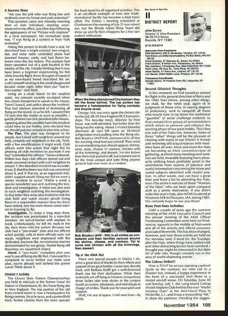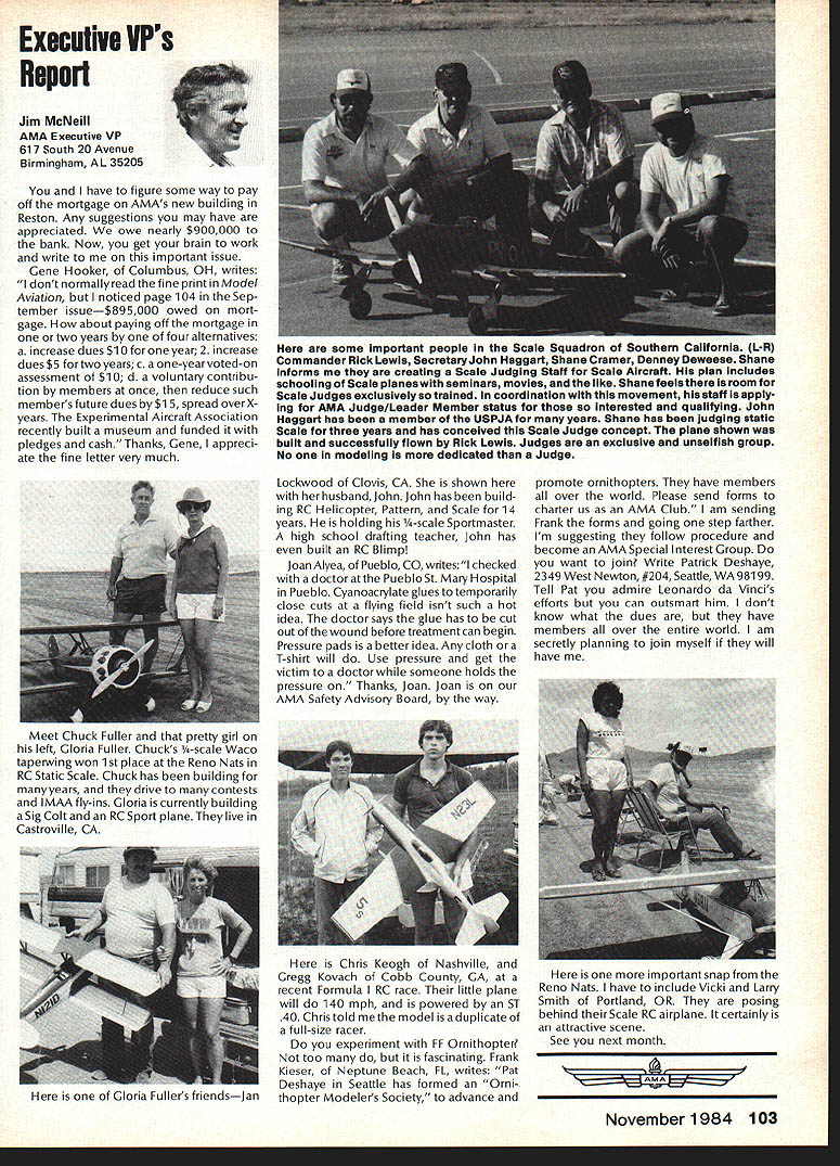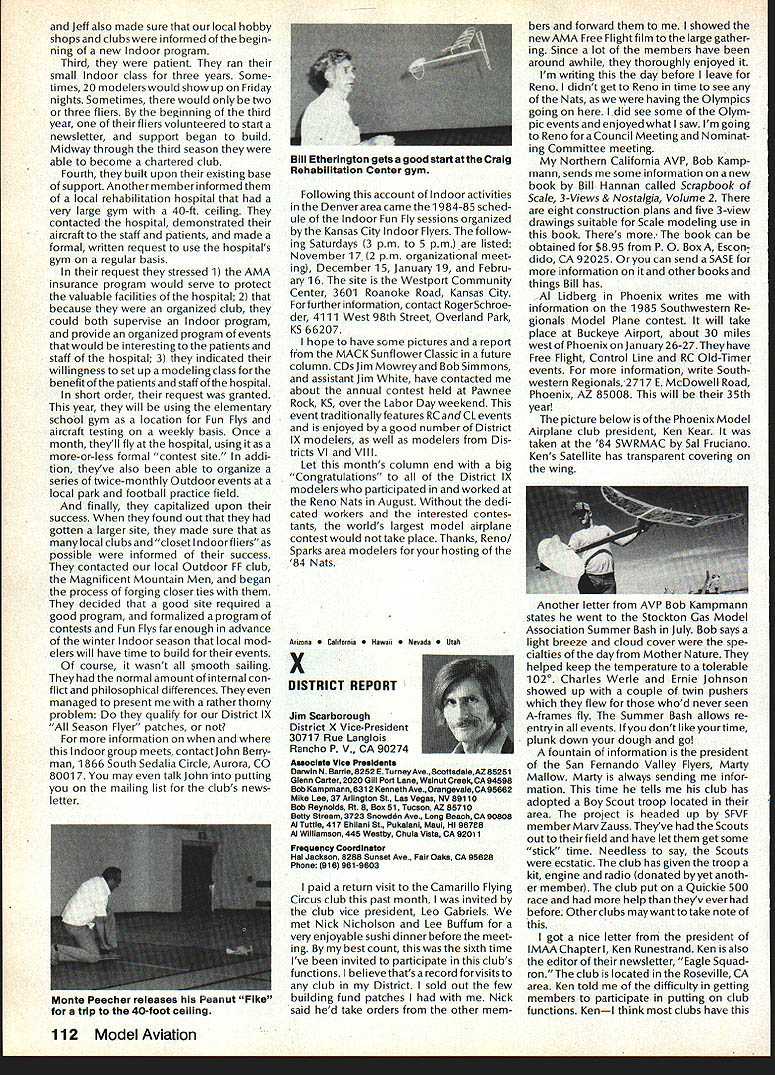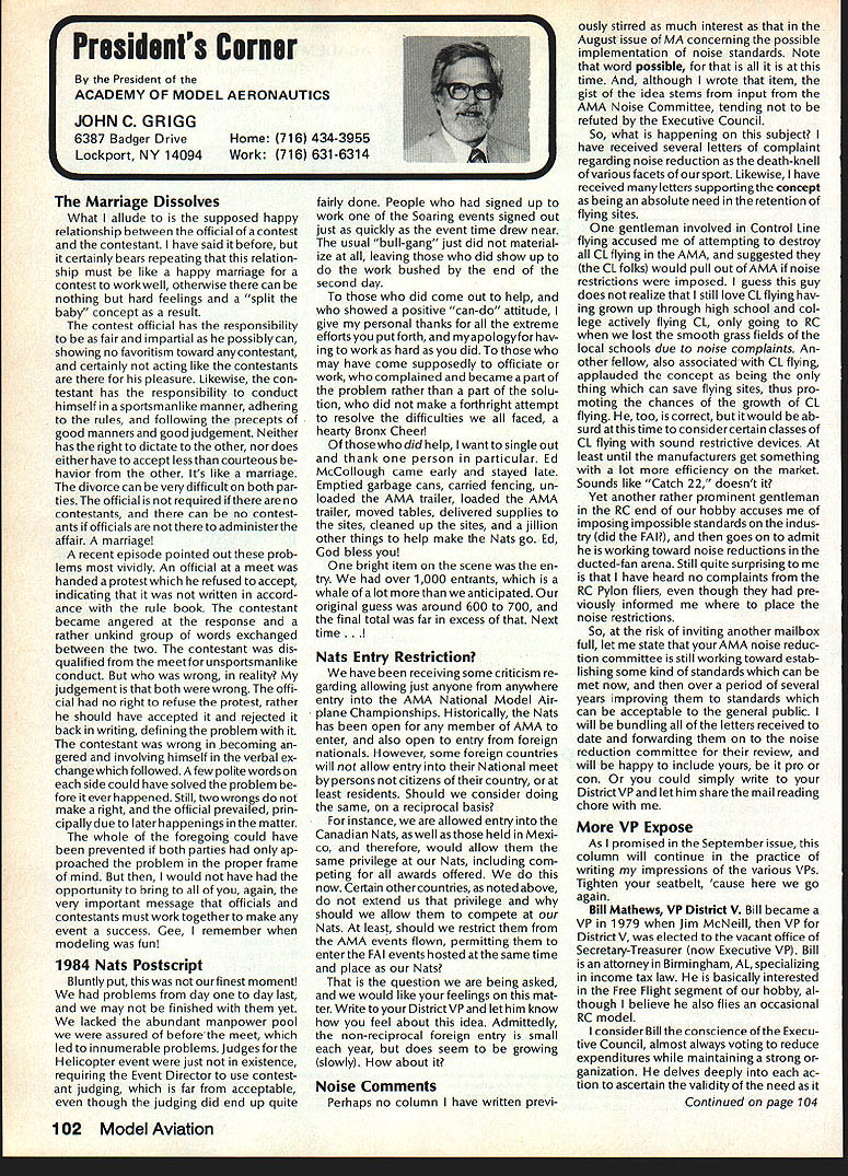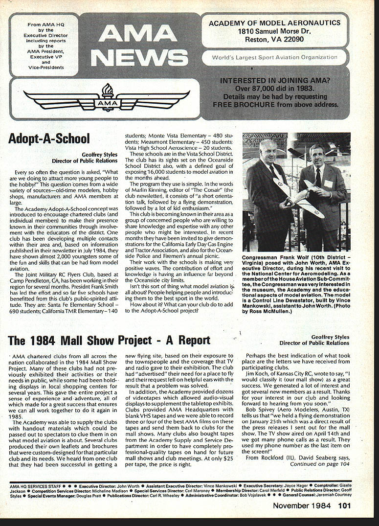 From AMA HQ bY Executive Director inciuding reports AMA President Executive VP Vice-Presidents Adopt-A- School Geoffrey Styles Director Public Relations Eveiy often question asked What doing attract young people hobby question comes wide variety sourcesold-time modelers hobby shops manufacturers AMA members large Academy Adopt-A-School concept introduced encourage chartered clubs individual members make presence known communities through involve ment educators district club has developing multiple contacts within area based information published newsletter July1984 have shown almost 2000 youngsters some fun skills can model aviation Joint Military RC Flyers Club based Camp Pendleton CA has workingintheir region several months Presidnt Frank Smith has led effort far five schools have benefitted clubs public-spirited atti tude Santa Fe Elementary School 690 students California TMR Elementaryi 40 students Monte Vista Elementary stu dents Meaumont Elementary students Vista High School Aeroscience tudents schools Vista School District club has its sights set Oceanside School District also defined goal exposing 16000 students model aviation months ahead program use simple words Marlin Kinning editor Corsair club newsletter consists ofa short orienta tion talk followed flying demonstration followed lot kid enthusiasm~ club becoming known theirarea group concerned people willing share knowledge expertise other people might interested recent months have invited give demon strations California Early Day Gas Engine TractorAssociation also Ocean side Police Firemens annual picnic work schools making very positive waves contribution effort knowledge having influence far beyond Oceanside city limits Isnt sort thing what model aviation about People helping people introduce ing best sport world about What can yourclub add Adopt-A-School project 1984 MaIl Show Project Report Geoffrey Styles Director Public Relations AMA chartered clubs across nation collaborated 1984 Mall Show Project clubs pre viously exhibited activities needs public some holding displays local shopping centers several years gave entire project sense experience and-adventure made great success ensures can work together again 1985 Academy able supply clubs handout materials could passed out spectators clue what model aviation about Several clubs produced own leaflets brochures custom-designed particular club its needs heard club successful getting new flying site based exposure townspeople coverage TV radio gave exhibition club advertised need place fly theirrequestfell helpful earswiththe result problem solved addition Academy provided dozens videotapes allowed audio-visual displays supplement tabletop exhibits Clubs provided AMA Headquarters blank VHS tapes able record three four best AMA films tapes send back clubs mall shows clubs also bought tapes Academy Supply Service De partment order have completely pro fessional-quality tapes hand future mall shows club meetings $25 per tape price right Perhaps best indication what took place letters have received participating clubs Jim Koch Kansas City RC wrote say would classify mall show great success generated lot interest got several new members result Thanks interest club looking forward hearing soon Bob Spivey Aero Modelers Austin TX tells us thatwe held flying demonstration January 25th direct result press releases sent out mall show TV show aired April 14th got phone calls result used phone number last item screen Rockford IL David Seaberg says Continued page 104 November1984 101 Congressman Frank Wolf 10th District Virginia posed John Worth AMA Ex ecutive Director during recent visit Natlonsi Center Aeromodeling As memberof House Aviation Sub-Commit teetheCongressmanwasveryinterested museum Academy educa tional aspects model aviation modei Control Line Devastator built Vince Mankowaki asslstantto John Worth Photo Ross McMullen AMA HO SERVICES STAFF 000 Executive Director John worth 0 Assistant Executive Director ymca Mankowaki 0 Executive Secretary Joyce Hager comptroiier Gisele Jackson etition Services Director Micheine Madison 0 Speciai Services Director Carl MaroneyC Membership Director Carol Merfeld 0 Pubiic Relations Director Geoff Styles S Special Events Manager Douglas Pratt 0 Pubiications Director Carl R wheeley 0 Administrative Coordinator Bob vojslavek0 00 Genersi Counasi Jeremiah Courtney Presidents Corner President ACADEMY OF MODEL AERONAUTICS JOHN C GRIGG 6387 Badger DriveHome 716 434-3955 Lockport NY 14094Work 716 631-6314 Marriage Dissolves What allude supposed happy relationship between official ofa contest contestant have said before certainly bears repeating relation ship must like happy marriage contest work well otherwise can nothing hard feelings split baby concept result contest official has responsibility asfairand impartial possiblycan showing no favoritism toward contestant certainly acting like contestants pleasure Likewise con testant has responsibility conduct himself sportsmanlike manner adhering rules following precepts good manners good judgement Neither has right dictate other nor does either have accept less courteous havior other Its like marriage divorce can very difficult both par ties official required no contestants can no contest ants officials administerthe affair marriage recent episode pointed out prob lems vividly An official meet handed protest refused accept indicating written accord ance rule book contestant became angered response rather unkind group words exchanged between two contestant dis qualified meetfor unsportsmanlike conduct wrong reality judgement both wrong offi cial no right refuse protest rather should have accepted rejected back writing defining problem contestant wrong becoming gered involving himself verbal ex change followed few polite words side could have solved problem fore ever happened Still two wrongs make right official prevailed prin cipally due later happenings matter whole foregoing could have prevented both p