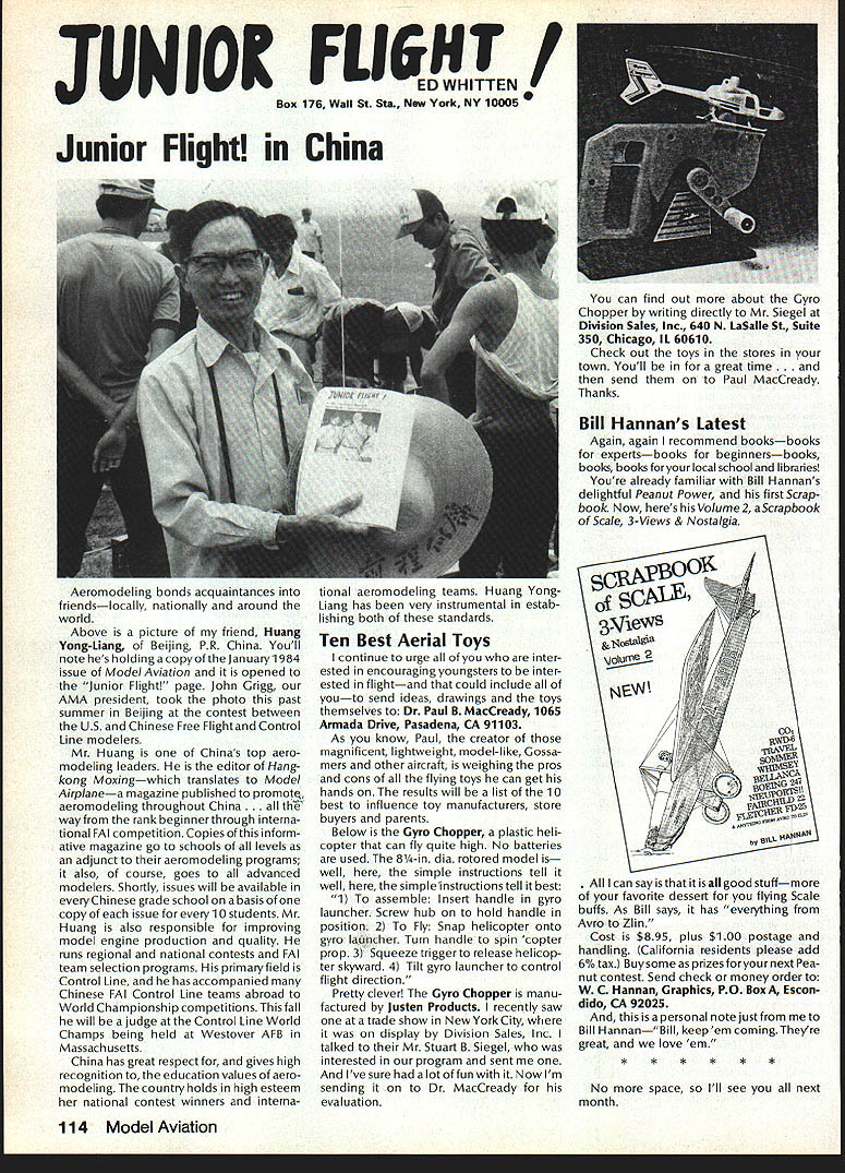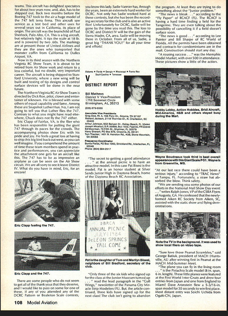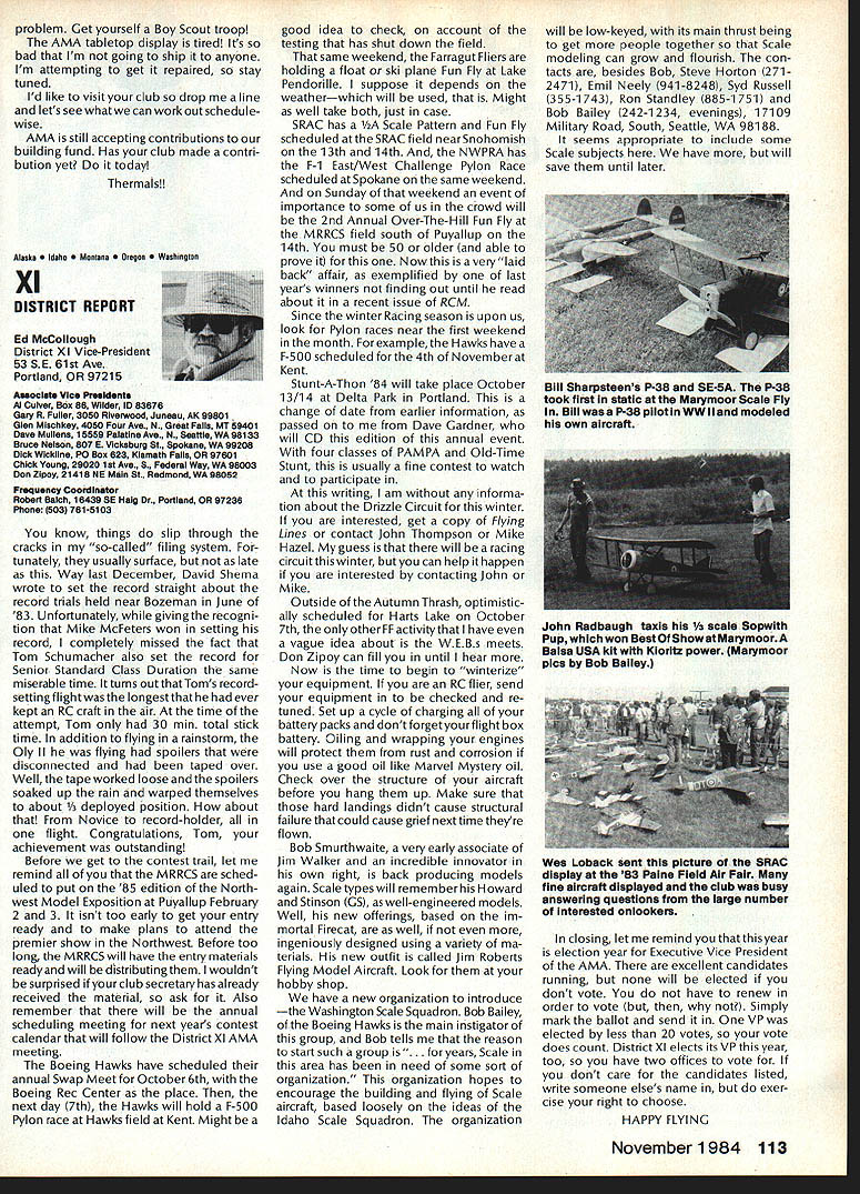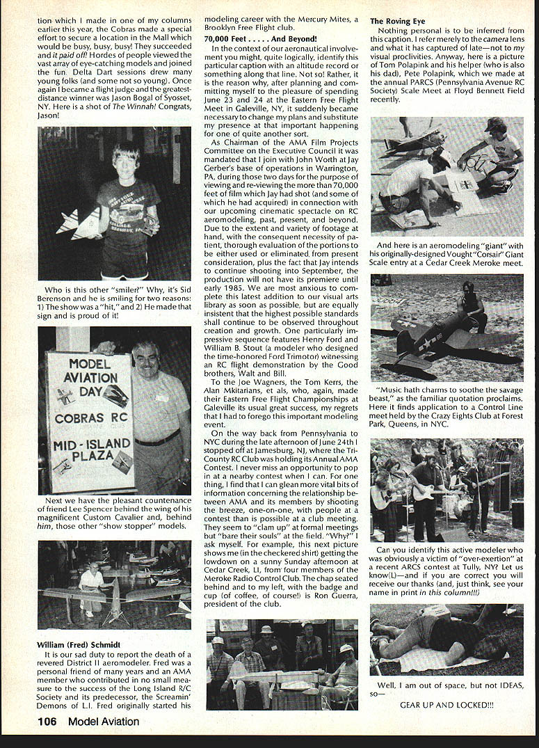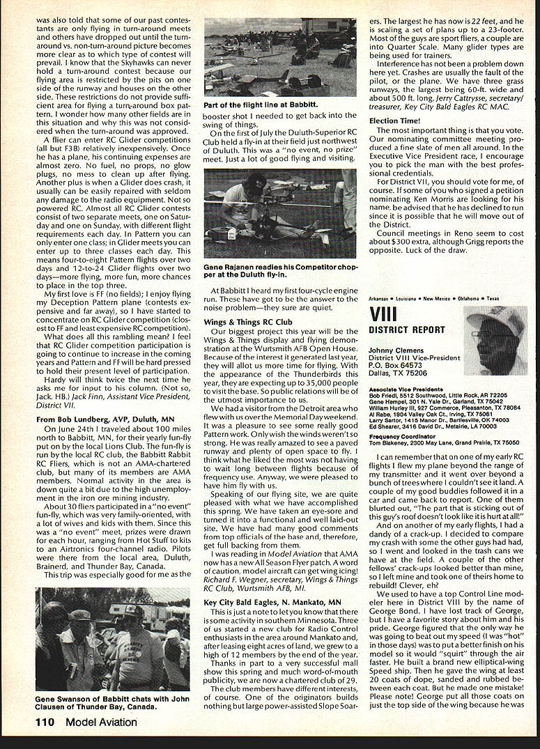 From AMA HQ bY Executive Director inciuding reports AMA President Executive VP Vice-Presidents Adopt-A- School Geoffrey Styles Director Public Relations Eveiy often question asked What doing attract young people hobby question comes wide variety sourcesold-time modelers hobby shops manufacturers AMA members large Academy Adopt-A-School concept introduced encourage chartered clubs individual members make presence known communities through involve ment educators district club has developing multiple contacts within area based information published newsletter July1984 have shown almost 2000 youngsters some fun skills can model aviation Joint Military RC Flyers Club based Camp Pendleton CA has workingintheir region several months Presidnt Frank Smith has led effort far five schools have benefitted clubs public-spirited atti tude Santa Fe Elementary School 690 students California TMR Elementaryi 40 students Monte Vista Elementary stu dents Meaumont Elementary students Vista High School Aeroscience tudents schools Vista School District club has its sights set Oceanside School District also defined goal exposing 16000 students model aviation months ahead program use simple words Marlin Kinning editor Corsair club newsletter consists ofa short orienta tion talk followed flying demonstration followed lot kid enthusiasm~ club becoming known theirarea group concerned people willing share knowledge expertise other people might interested recent months have invited give demon strations California Early Day Gas Engine TractorAssociation also Ocean side Police Firemens annual picnic work schools making very positive waves contribution effort knowledge having influence far beyond Oceanside city limits Isnt sort thing what model aviation about People helping people introduce ing best sport world about What can yourclub add Adopt-A-School project 1984 MaIl Show Project Report Geoffrey Styles Director Public Relations AMA chartered clubs across nation collaborated 1984 Mall Show Project clubs pre viously exhibited activities needs public some holding displays local shopping centers several years gave entire project sense experience and-adventure made great success ensures can work together again 1985 Academy able supply clubs handout materials could passed out spectators clue what model aviation about Several clubs produced own leaflets brochures custom-designed particular club its needs heard club successful getting new flying site based exposure townspeople coverage TV radio gave exhibition club advertised need place fly theirrequestfell helpful earswiththe result problem solved addition Academy provided dozens videotapes allowed audio-visual displays supplement tabletop exhibits Clubs provided AMA Headquarters blank VHS tapes able record three four best AMA films tapes send back clubs mall shows clubs also bought tapes Academy Supply Service De partment order have completely pro fessional-quality tapes hand future mall shows club meetings $25 per tape price right Perhaps best indication what took place letters have received participating clubs Jim Koch Kansas City RC wrote say would classify mall show great success generated lot interest got several new members result Thanks interest club looking forward hearing soon Bob Spivey Aero Modelers Austin TX tells us thatwe held flying demonstration January 25th direct result press releases sent out mall show TV show aired April 14th got phone calls result used phone number last item screen Rockford IL David Seaberg says Continued page 104 November1984 101 Congressman Frank Wolf 10th District Virginia posed John Worth AMA Ex ecutive Director during recent visit Natlonsi Center Aeromodeling As memberof House Aviation Sub-Commit teetheCongressmanwasveryinterested museum Academy educa tional aspects model aviation modei Control Line Devastator built Vince Mankowaki asslstantto John Worth Photo Ross McMullen AMA HO SERVICES STAFF 000 Executive Director John worth 0 Assistant Executive Director ymca Mankowaki 0 Executive Secretary Joyce Hager comptroiier Gisele Jackson etition Services Director Micheine Madison 0 Speciai Services Director Carl MaroneyC Membership Director Carol Merfeld 0 Pubiic Relations Director Geoff Styles S Special Events Manager Douglas Pratt 0 Pubiications Director Carl R wheeley 0 Administrative Coordinator Bob vojslavek0 00 Genersi Counasi Jeremiah Courtney Presidents Corner President ACADEMY OF MODEL AERONAUTICS JOHN C GRIGG 6387 Badger DriveHome 716 434-3955 Lockport NY 14094Work 716 631-6314 Marriage Dissolves What allude supposed happy relationship between official ofa contest contestant have said before certainly bears repeating relation ship must like happy marriage contest work well otherwise can nothing hard feelings split baby concept result contest official has responsibility asfairand impartial possiblycan showing no favoritism toward contestant certainly acting like contestants pleasure Likewise con testant has responsibility conduct himself sportsmanlike manner adhering rules following precepts good manners good judgement Neither has right dictate other nor does either have accept less courteous havior other Its like marriage divorce can very difficult both par ties official required no contestants can no contest ants officials administerthe affair marriage recent episode pointed out prob lems vividly An official meet handed protest refused accept indicating written accord ance rule book contestant became angered response rather unkind group words exchanged between two contestant dis qualified meetfor unsportsmanlike conduct wrong reality judgement both wrong offi cial no right refuse protest rather should have accepted rejected back writing defining problem contestant wrong becoming gered involving himself verbal ex change followed few polite words side could have solved problem fore ever happened Still two wrongs make right official prevailed prin cipally due later happenings matter whole foregoing could have prevented both p