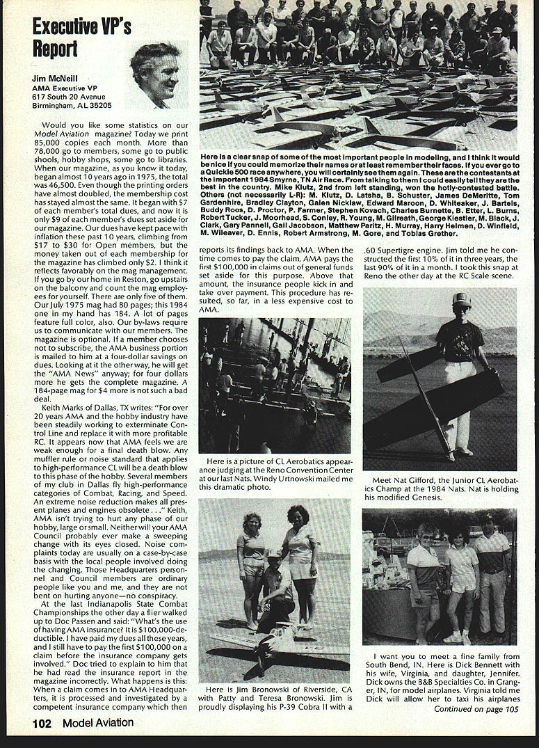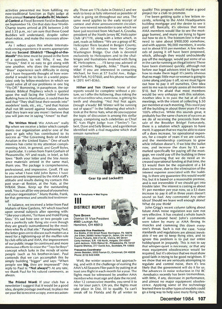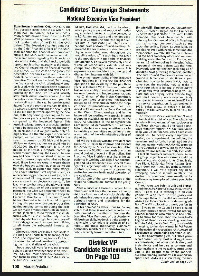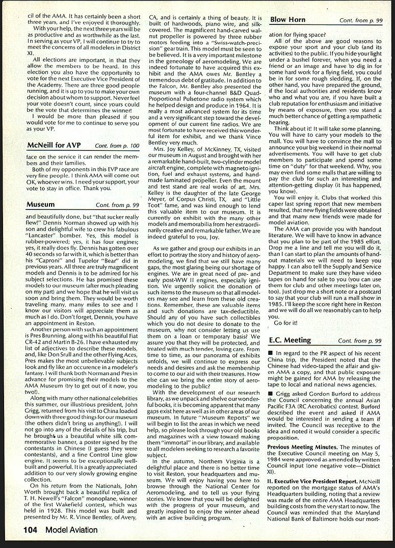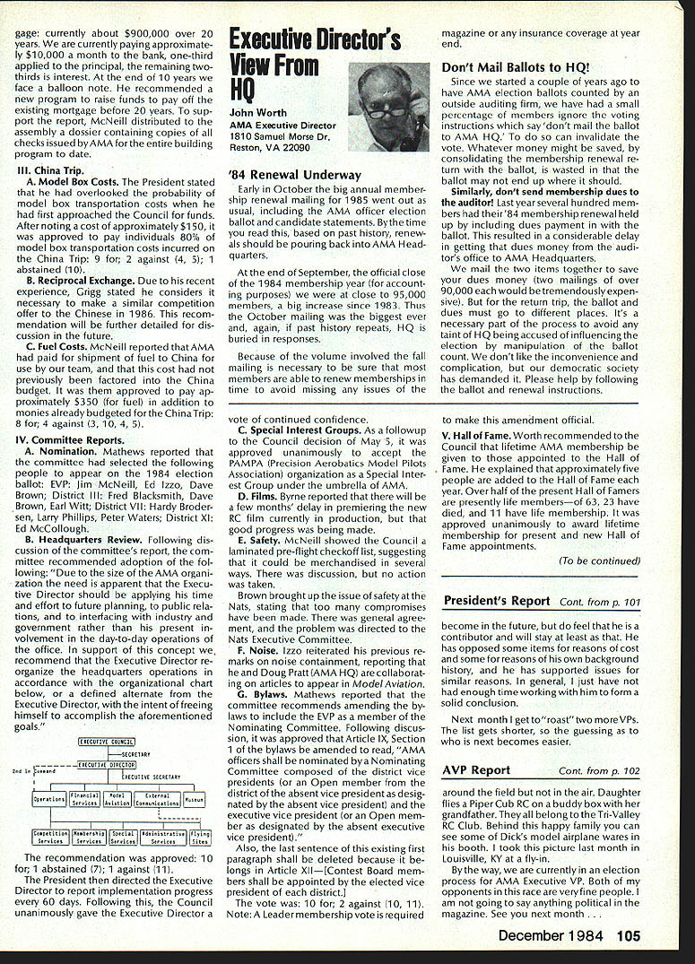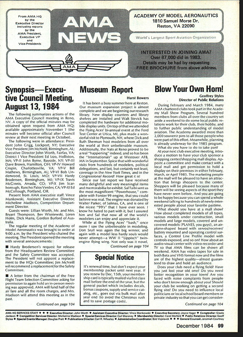 Synopsis Execu tive Council Meeting August 13 1984 following summarizes actions AMA Executive Council meeting Reno NV copy official minutes may obtained upon request AMA HQ available approximately November 1 minutes will become official after Council review next meeting October following attendance Presi dent John Grigg Lockport NY Executive Vice PresidentJim McNeill Birmingham AL Executive Director John Worth Fairfax VA District Vice President Ed Izzo Holliston MA VP-Il John Byrne Bayside NY VP-Ill Dave Brown Hamilton OH VP-IV Howard Crispin Charlottesville VA VP-V Bill Mathews Birmingham AL VP-VI Bob Un derwood St Louis MO VP-VII Hardy Brodersen Birmingham MI VP-IX Travis McGinnis Arvada CO VP-X Jim Scar borough Rancho Palos Verdes CA VP-XI Ed McCollough Portland OR Present AMA executive staff Vince Mankowski Assistant Executive Director Micheline Madison Competition Depart ment Director Guests Lillian Worth Mr Mrs Bryant Thompson Bev Wisniewski Loren HoIm Dick Marra Gordon Burford Aus tralia regular meeting Academy Model Aeronautics brought order 900 am President chaired meeting Presidentopened meeting several announcements Hardy Brodersens request release Headquarters Review Committee Safety Committee accepted President will appoint replace ment HQs Committee Jim McNeill wil recommend replacement Safety Committee letter chairman Free Flight Team Selection Committee asking permission again hold in-person meet ing approved AMA will fund half air fare room charges Mrs Madison will attend meeting past Continued page 104 Hurst Bowers has busy summer Reston museum expansion project almost complete beginning research library New display counters library shelves installed Walt Stevick has completed hardware additional mo bile display units top attended Flying Aces bi-annual event Ford Test Center Utica MI plus made won derful visit Plymouth NH Dick Ruth Sherman host modelers over world unbelievable museum Additionally Nats Reno proved real happening indeed has Internationals up Westover AFB MA September Spice thatwith wonderful visits hundreds modelers political delegations last certainly least coverage New York Times Congressiona/ Record great Since last report have received delightful very meaningful items memorabiliaforexhibitSalTaibisentus magnificent Powerhouse com plete Forster 99 engine could believe real engine donated Walter Parker Salinas CA nicest 99s have ever seen know hated part assured him Sal now worlds modelers can enjoy appreciate Flying Aces bash once saw unbelievable modeling Don Srull again big winner again model less hardy souls would never attempta WW II Lippisch twinengine flying wing novel Continued page 104 During February March 1984 AMA chartered clubs took part theAcade Mall Show Program Several hundred members clubs over country set aside weekend some local public re lations work club hobby further public understanding model aviation Academy awarded 2000 souvenir pins people part effort Meanwhile planning already underway 1985 program What have to take part next club executive meeting intro duce motion have club sponsor shopping center/shopping mall display Ap point committee make contact local mall get permission hold display premises either February March April1985 marketing people mall will pleased have attrac tion brings shoppers center Shoppers will pleased because will seeing aspects sport have never seen before going happy because can spend whole weekend talkingto hundreds newly-inter ested people about favorite pastime What should have mall show about completed models types various models under construction small models large models covered un covered models PLANES guys air plane-shaped board servos/receiver battery mounted operating control sur faces Control Line Profile model controls exposed about audio-visual center video-recorder TV AMA films can shown weekend AMA has video tapes sale both Beta VHS format now films highest qualityalmost guaran teed draw hold audience Does club need flying field Have just lost old need better recognition town Are faced noise complaints people dont know enough aboutyou Should club working getting second flying site need influence local politicians local school board members private industry can get considerContinued page 104 December 1984 99 AMA HQ Executive Director including reports AMA President Executive VP Vice-Presidents ACADEMY OF MODEL AERONAUTICS 1810 Samuel Morse Dr ] Reston VA 22090 Wo Id U q S i1tOi 0 qo Museum Report Blow Own Horn Geoffrey Styles Director Public Relations Special Notice Its renewal time dont expect membership packet until next year renew Dec 15th member shipcard istypicallymailedviafirstclass mail before end year general packet includes decals bonus coupons supply service cat alog etc goes out via bulk mail after year end avoid Christmas rush save postage costs AMA HO SERVICES STAFF 0S 0 Executive Director John worth 0 Assistant Executive Director vince Mankoweki S Executive Secretary Joyce Hager 0 Comptroller2 Gisele Jackson 0 Competition Services Director Micheiine Madison 0 Special Services Director Carl MaroneyS Membership Director Carol Merfeld 0 Public Relations Director Geoff StylesO Special EventsManager Douglas Pratt0 Publications Director Carl RWheeley0 Administrative Coordinator Bobvoislaveke 00 General Counsel Jeremiah Courtney Candidates Campaign Statements National Executive Vice President Dave Brown Hamilton OH AMA 617 first question people ask tell am running Executive VP would anyone want EVP Well answer question must first look up duties EVP AMA bylaws Executive Vice President shall Chief Financial Officer AMA shall monitor financial corporate affairs AMA make annual report membership regarding financial af fairs AMA shall make periodic reports less quarterly Execu tive Council regarding financial matters AMA. etc As AMA grows description becomes more im portant particularly reports Executive Council involved manage finances AMA budgetary proc ess used budget being propos