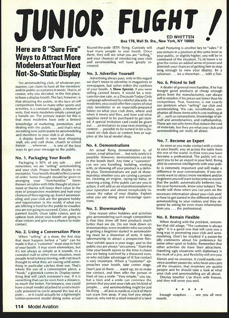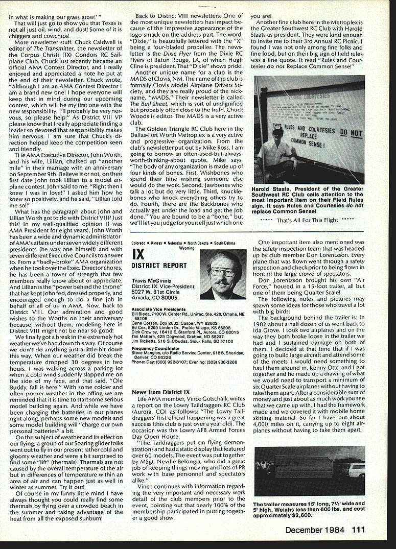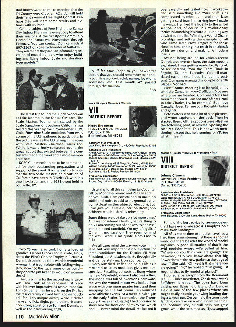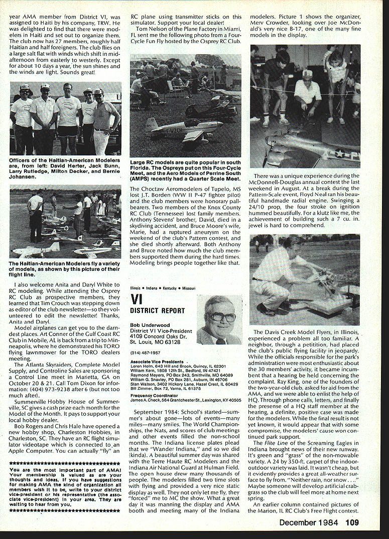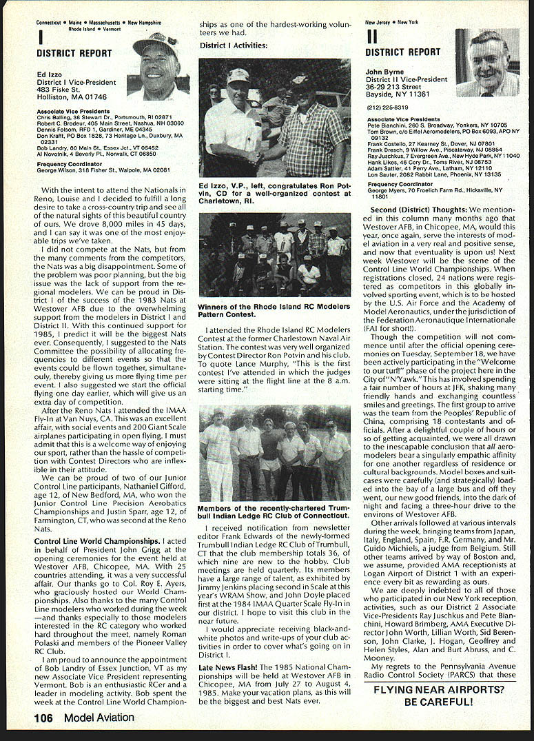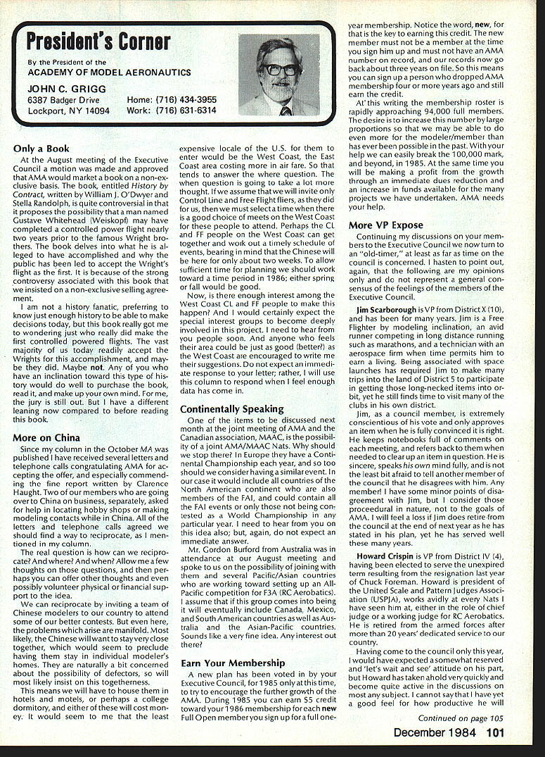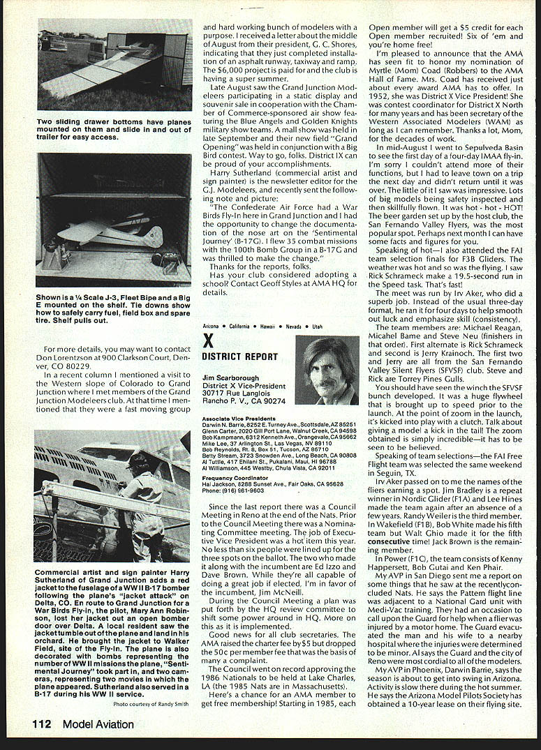 Synopsis Execu tive Council Meeting August 13 1984 following summarizes actions AMA Executive Council meeting Reno NV copy official minutes may obtained upon request AMA HQ available approximately November 1 minutes will become official after Council review next meeting October following attendance Presi dent John Grigg Lockport NY Executive Vice PresidentJim McNeill Birmingham AL Executive Director John Worth Fairfax VA District Vice President Ed Izzo Holliston MA VP-Il John Byrne Bayside NY VP-Ill Dave Brown Hamilton OH VP-IV Howard Crispin Charlottesville VA VP-V Bill Mathews Birmingham AL VP-VI Bob Un derwood St Louis MO VP-VII Hardy Brodersen Birmingham MI VP-IX Travis McGinnis Arvada CO VP-X Jim Scar borough Rancho Palos Verdes CA VP-XI Ed McCollough Portland OR Present AMA executive staff Vince Mankowski Assistant Executive Director Micheline Madison Competition Depart ment Director Guests Lillian Worth Mr Mrs Bryant Thompson Bev Wisniewski Loren HoIm Dick Marra Gordon Burford Aus tralia regular meeting Academy Model Aeronautics brought order 900 am President chaired meeting Presidentopened meeting several announcements Hardy Brodersens request release Headquarters Review Committee Safety Committee accepted President will appoint replace ment HQs Committee Jim McNeill wil recommend replacement Safety Committee letter chairman Free Flight Team Selection Committee asking permission again hold in-person meet ing approved AMA will fund half air fare room charges Mrs Madison will attend meeting past Continued page 104 Hurst Bowers has busy summer Reston museum expansion project almost complete beginning research library New display counters library shelves installed Walt Stevick has completed hardware additional mo bile display units top attended Flying Aces bi-annual event Ford Test Center Utica MI plus made won derful visit Plymouth NH Dick Ruth Sherman host modelers over world unbelievable museum Additionally Nats Reno proved real happening indeed has Internationals up Westover AFB MA September Spice thatwith wonderful visits hundreds modelers political delegations last certainly least coverage New York Times Congressiona/ Record great Since last report have received delightful very meaningful items memorabiliaforexhibitSalTaibisentus magnificent Powerhouse com plete Forster 99 engine could believe real engine donated Walter Parker Salinas CA nicest 99s have ever seen know hated part assured him Sal now worlds modelers can enjoy appreciate Flying Aces bash once saw unbelievable modeling Don Srull again big winner again model less hardy souls would never attempta WW II Lippisch twinengine flying wing novel Continued page 104 During February March 1984 AMA chartered clubs took part theAcade Mall Show Program Several hundred members clubs over country set aside weekend some local public re lations work club hobby further public understanding model aviation Academy awarded 2000 souvenir pins people part effort Meanwhile planning already underway 1985 program What have to take part next club executive meeting intro duce motion have club sponsor shopping center/shopping mall display Ap point committee make contact local mall get permission hold display premises either February March April1985 marketing people mall will pleased have attrac tion brings shoppers center Shoppers will pleased because will seeing aspects sport have never seen before going happy because can spend whole weekend talkingto hundreds newly-inter ested people about favorite pastime What should have mall show about completed models types various models under construction small models large models covered un covered models PLANES guys air plane-shaped board servos/receiver battery mounted operating control sur faces Control Line Profile model controls exposed about audio-visual center video-recorder TV AMA films can shown weekend AMA has video tapes sale both Beta VHS format now films highest qualityalmost guaran teed draw hold audience Does club need flying field Have just lost old need better recognition town Are faced noise complaints people dont know enough aboutyou Should club working getting second flying site need influence local politicians local school board members private industry can get considerContinued page 104 December 1984 99 AMA HQ Executive Director including reports AMA President Executive VP Vice-Presidents ACADEMY OF MODEL AERONAUTICS 1810 Samuel Morse Dr ] Reston VA 22090 Wo Id U q S i1tOi 0 qo Museum Report Blow Own Horn Geoffrey Styles Director Public Relations Special Notice Its renewal time dont expect membership packet until next year renew Dec 15th member shipcard istypicallymailedviafirstclass mail before end year general packet includes decals bonus coupons supply service cat alog etc goes out via bulk mail after year end avoid Christmas rush save postage costs AMA HO SERVICES STAFF 0S 0 Executive Director John worth 0 Assistant Executive Director vince Mankoweki S Executive Secretary Joyce Hager 0 Comptroller2 Gisele Jackson 0 Competition Services Director Micheiine Madison 0 Special Services Director Carl MaroneyS Membership Director Carol Merfeld 0 Public Relations Director Geoff StylesO Special EventsManager Douglas Pratt0 Publications Director Carl RWheeley0 Administrative Coordinator Bobvoislaveke 00 General Counsel Jeremiah Courtney Candidates Campaign Statements National Executive Vice President Dave Brown Hamilton OH AMA 617 first question people ask tell am running Executive VP would anyone want EVP Well answer question must first look up duties EVP AMA bylaws Executive Vice President shall Chief Financial Officer AMA shall monitor financial corporate affairs AMA make annual report membership regarding financial af fairs AMA shall make periodic reports less quarterly Execu tive Council regarding financial matters AMA. etc As AMA grows description becomes more im portant particularly reports Executive Council involved manage finances AMA budgetary proc ess used budget being propos