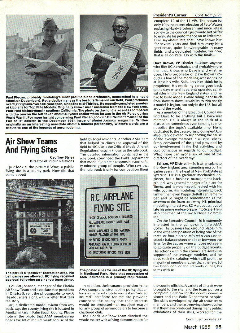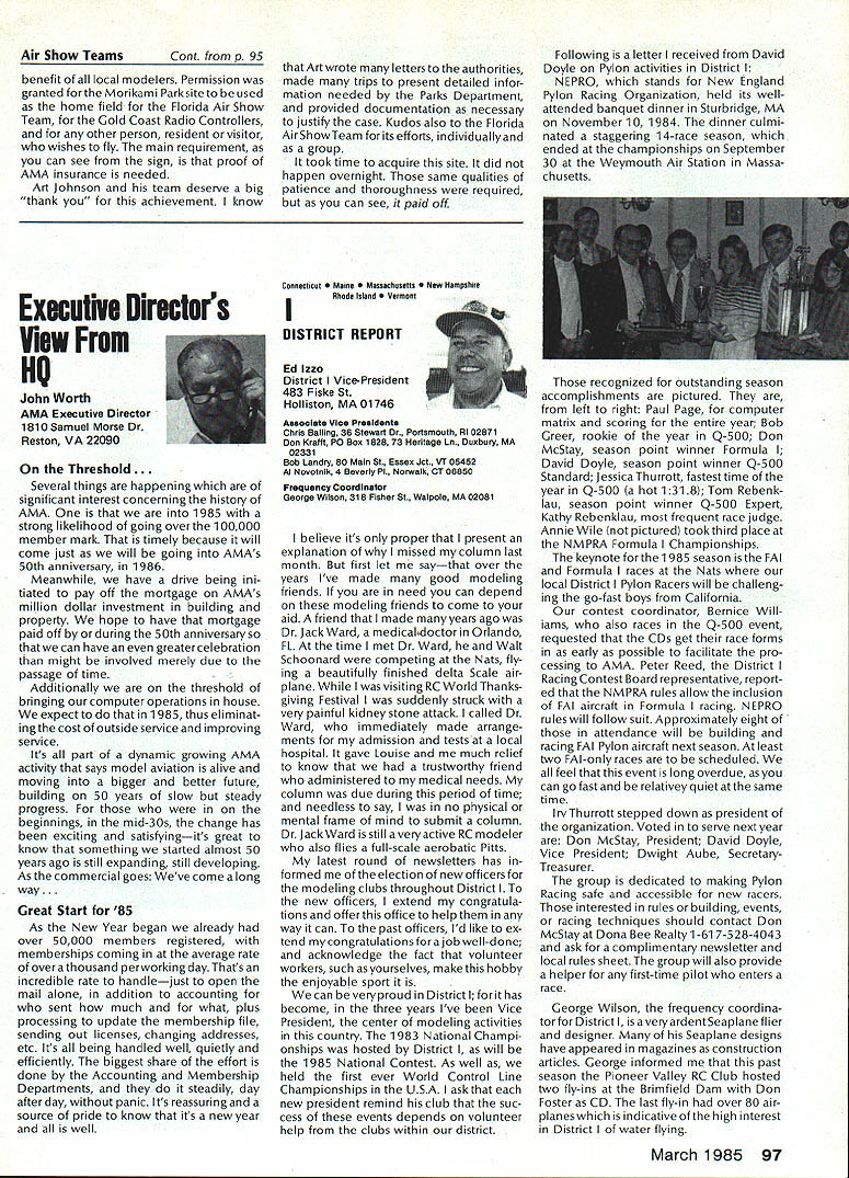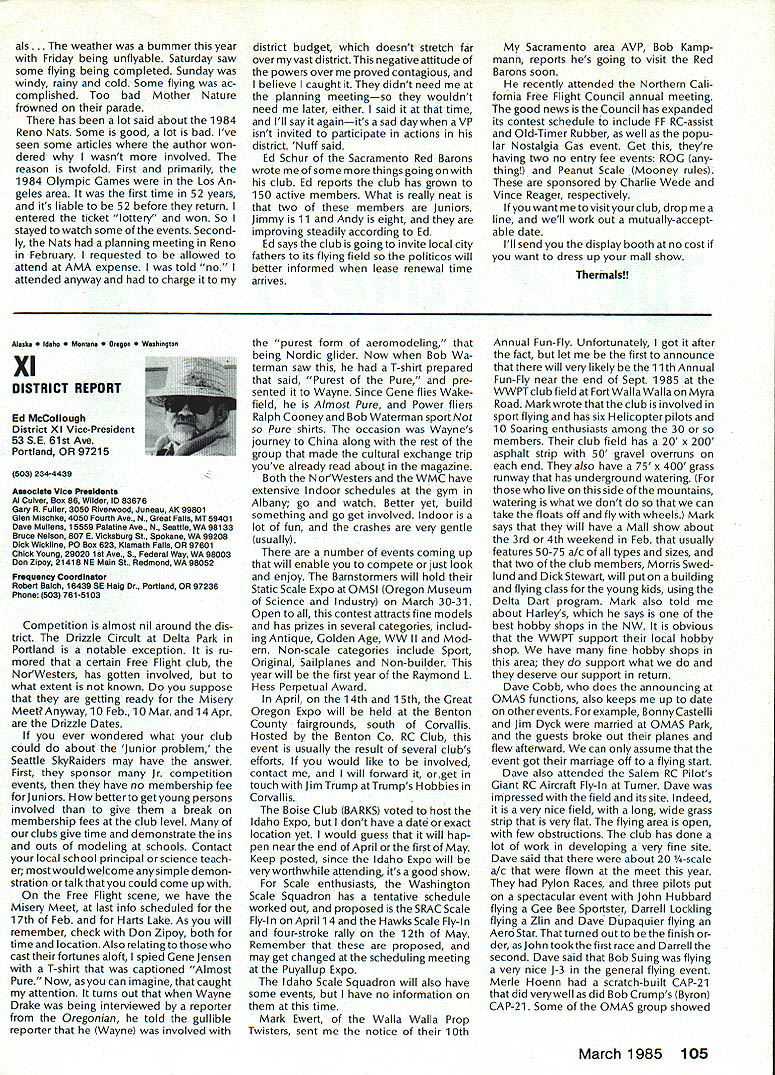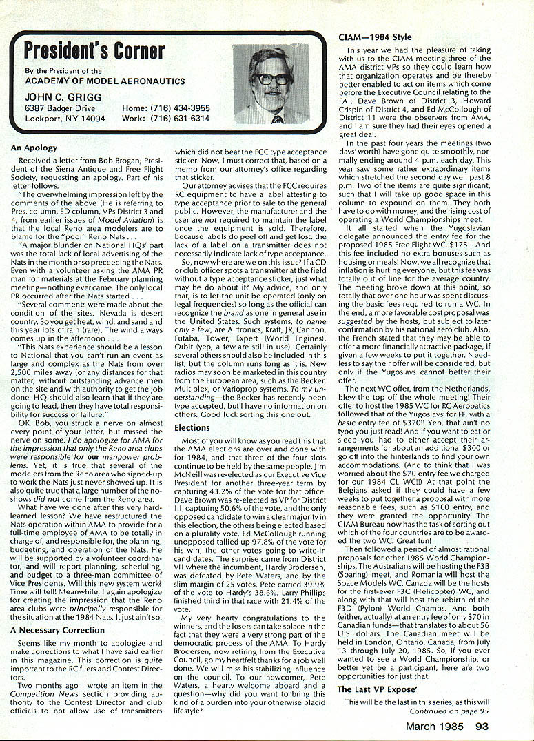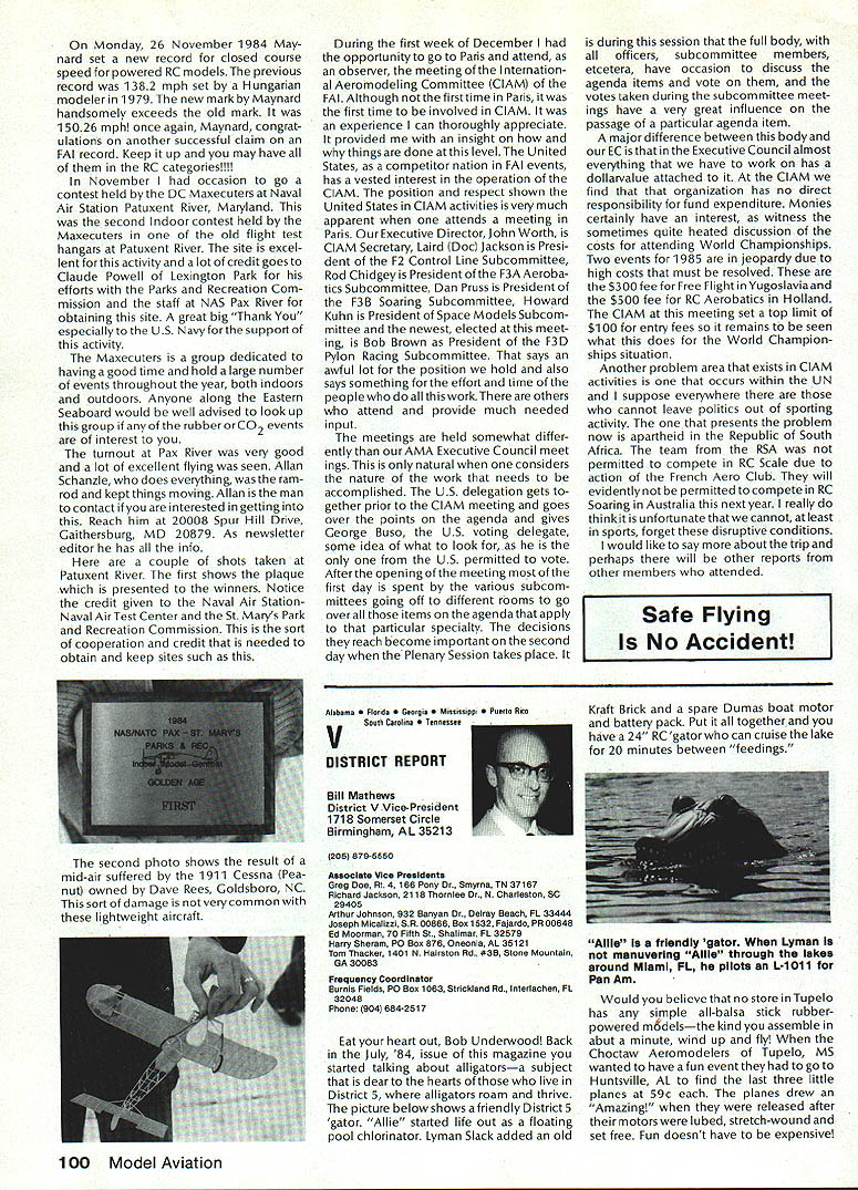 Geoffrey Styles Director Public Relations case havent heard May1985 has declared Safety Month fact has declared National Safety Month Thats sneaky way get significant statement repeated early part commercial message have aNationalSafetyMonth]ustto serve specific reminder almost 100000 AMA members needs ever conscious problems thatcan develop through onlyafewseconds carelessness same thing done industry spent years business life have Wise Owl Club Thats people eyes have saved because smart enough wear safety glasses course some plants have mandatory regulation calls safety glasses people consider nuisance will wear Some plants introduced suspension-with out-pay rule people found safety glasses see really have get hard folks sometimes make look after themselves catch phrases such Avoid Pinch Points may apply directly model aviation operations what means Dont Get Fingers Any Area Heavy Weight Likely Fall Cant Get Out Result lost finger broken bone very least Fingers pretty essential person enjoy life After scratching wifes back eating ice-cream cone assembling servo sort difficult short few fingers Remember World War lThere club airmen got out damaged aircraft parachute Silkworm Club course wearing chute requirement flight crews took some training learn use other words preparation always very important part SafetyMinded Attitude model aviator has another hazard he/she faces time flying sortie madeThattriptotheflyingfield Howmany never mean never fasten seat belt once car van headed field Come honest Most accidents occurwithin 25 miles home can believe statistics far isyourflyingsite can hearsomeone out saying Thank Heaven site 50 miles awayreduces odds talked museum visitor couple months ago told about 22year-old lad would wear seat belt now time day dad asked him howwould feel time did notwearthe beltwas time serious accident badly hurt woke young man up guess because belt went place time before started en gine Whether workshop road field way home again flight line must develop utilize safe habits well-being family responsibilities lot hangs being able go work day provide necessities life food roof clothing etc dependent citizen being able ac complish things can pretty depress ing especially havealonglife ahead about shop work carefully especially around power tools careful have well-ventilated place work using toxic materials Make sure X-Acto knife does roll off bench stab foot Keep sharp harmful items out reach kids until old enough trained use avoid road field back obey law wear seatbelt respect rights others make safe two-way trip field keep out way prop make adjustments behind arc rotation dont use damaged props dont use unqualified helpers Its really very difficult lot common sense involved AMA needs After going hit 100000-member mark 1985 dont take care yourselves Good luck good flying thats safe flying Results 1984 Election results provided Raymond H McGivern Certified Public Accountant show James McNeill has re elected Executive Vice President Academy Model Aeronautics Except District 7 incumbent Vice-Presidents re-elected other districts election official vote tally Executive Vice President James McNeil Dave Brown Ed Izzo Others Total District 3 Vice-President Dave Brown Earl Witt Fred Blacksmith Others Total District 7 Vice-President Peter Waters Hardy Brodersen * Larry Phillips Others Total District 11 Vice-President Ed McCollough* Others Total 7262 5647 3875 28 16812 1241 749 462 2 2454 733 708 392 3 1836 812 18 830 Museum Report Hurst G Bowers cold winds blowing leaves have fallen northern Virginiaa time modelers leave flyingfieldsforthe workshop visits museum Reston have delighted ever-increasing numbers AMA members guests visit us fact visitors arent involved modeling have heard museum After seeing leave wonderful appreciation just what hobby has offer Recently attractive lady noted very carefully examining exhibits Continued page 96 92 Model Aviation AMA HO Executive Director including reports AMA President Executive VP Vice-Presidents L L ACADEMY OF MODEL AERNAUTICS 1810 Samuel Morse Dr Reston VA 22090 Worlds Largest Sport Aviation Organization Safety Always Season AMA HO SERvICES STAFF 000 Executive Director John Worth 0 Nate General Manager ymca Mankowski 0 ExecutIve Coordinator Joyce Hager 0 Comptroller Gisele Jackson 0 Competition Services Director Micheline Madison 0 Special Services Director Carl Maroney 0 Membership Director Carol MerfeldO Public Relations Director Geoff Styles 0 Special Events Director Douglas Pratt 0 Publications Director Carl R Wheeley 0 Admlnlstmtive Coordinator Bob Voislavekooo General Counsel Jeremiah Courtney An Apology Received letter Bob Brogan Presi dent Sierra Antique Free Flight Society requesting apology Part letter follows overwhelming impression left bythe comments above referring Pres column ED column VPs District 3 4 earlier issues Model Aviation local Reno area modelers blame poor Reno Nats. major blunder National HQs part total lack local advertising Nats month orso preceedingthe Nats volunteer asking AMA PR man materials February planning meetingnothing ever came local PR occurred after Nats started Several comments made about condition sites Nevada desert country So get heat wind sand year lots rain rare wind always comes up afternoon Nats experience should lesson National cant run event large complex Nats over 2500 miles away distances matter outstanding advance men site authority get job done HQ should also learn going lead have total responsi bility success failure OK Bob struck nerve almost point letter missed nerve some apologize AMA impression Reno area clubs responsible manpower prob lems Yet true several ne modelersfrom Renoareawhosigwid-up work Nats just never showed up also quite true large number noshows did come Reno area What have done after very hardlearned lesson have restructured Nats operation within AMA provide full-time employee AMA totally charge responsible planning budgeting operation Nats will supported v