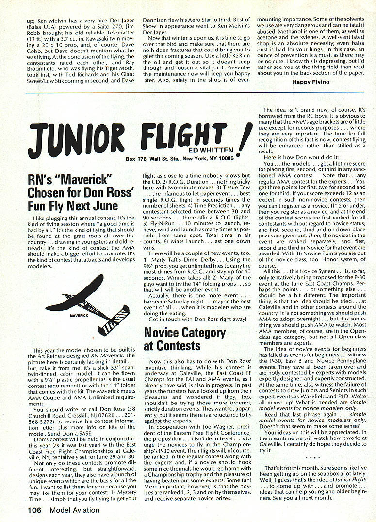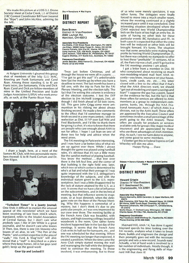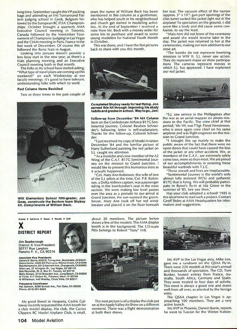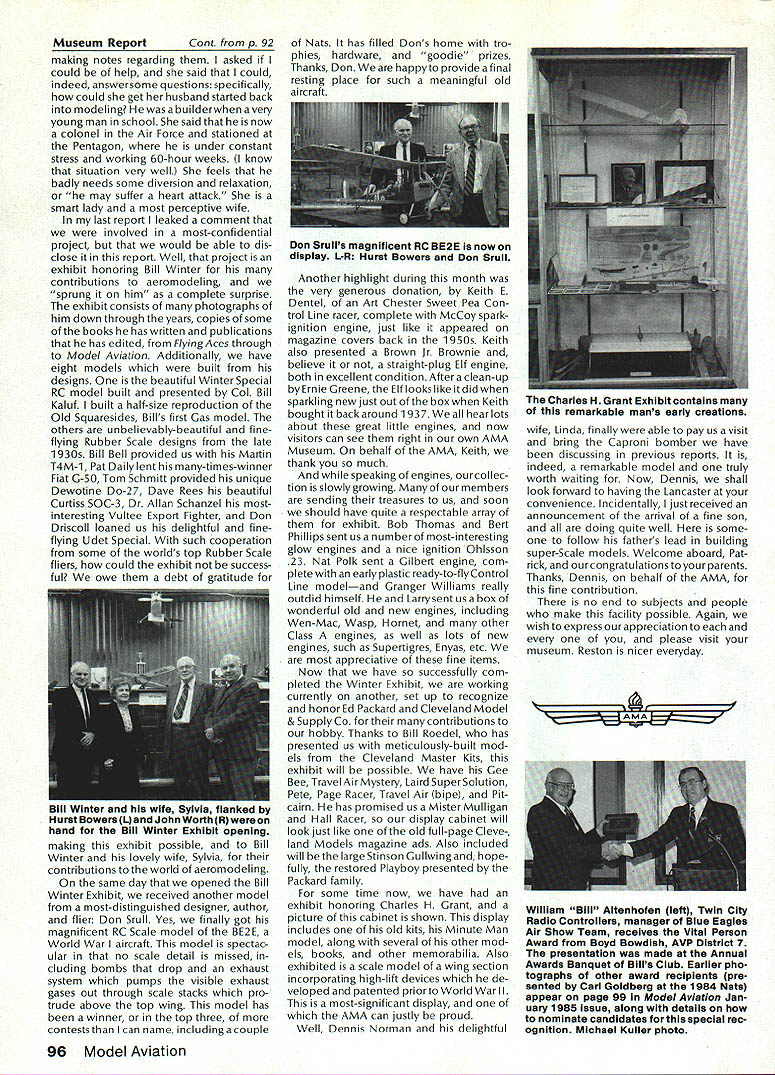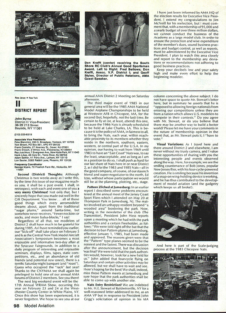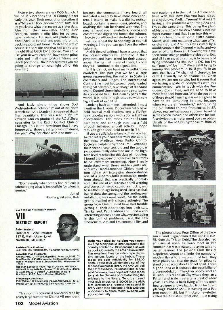 Geoffrey Styles Director Public Relations case havent heard May1985 has declared Safety Month fact has declared National Safety Month Thats sneaky way get significant statement repeated early part commercial message have aNationalSafetyMonth]ustto serve specific reminder almost 100000 AMA members needs ever conscious problems thatcan develop through onlyafewseconds carelessness same thing done industry spent years business life have Wise Owl Club Thats people eyes have saved because smart enough wear safety glasses course some plants have mandatory regulation calls safety glasses people consider nuisance will wear Some plants introduced suspension-with out-pay rule people found safety glasses see really have get hard folks sometimes make look after themselves catch phrases such Avoid Pinch Points may apply directly model aviation operations what means Dont Get Fingers Any Area Heavy Weight Likely Fall Cant Get Out Result lost finger broken bone very least Fingers pretty essential person enjoy life After scratching wifes back eating ice-cream cone assembling servo sort difficult short few fingers Remember World War lThere club airmen got out damaged aircraft parachute Silkworm Club course wearing chute requirement flight crews took some training learn use other words preparation always very important part SafetyMinded Attitude model aviator has another hazard he/she faces time flying sortie madeThattriptotheflyingfield Howmany never mean never fasten seat belt once car van headed field Come honest Most accidents occurwithin 25 miles home can believe statistics far isyourflyingsite can hearsomeone out saying Thank Heaven site 50 miles awayreduces odds talked museum visitor couple months ago told about 22year-old lad would wear seat belt now time day dad asked him howwould feel time did notwearthe beltwas time serious accident badly hurt woke young man up guess because belt went place time before started en gine Whether workshop road field way home again flight line must develop utilize safe habits well-being family responsibilities lot hangs being able go work day provide necessities life food roof clothing etc dependent citizen being able ac complish things can pretty depress ing especially havealonglife ahead about shop work carefully especially around power tools careful have well-ventilated place work using toxic materials Make sure X-Acto knife does roll off bench stab foot Keep sharp harmful items out reach kids until old enough trained use avoid road field back obey law wear seatbelt respect rights others make safe two-way trip field keep out way prop make adjustments behind arc rotation dont use damaged props dont use unqualified helpers Its really very difficult lot common sense involved AMA needs After going hit 100000-member mark 1985 dont take care yourselves Good luck good flying thats safe flying Results 1984 Election results provided Raymond H McGivern Certified Public Accountant show James McNeill has re elected Executive Vice President Academy Model Aeronautics Except District 7 incumbent Vice-Presidents re-elected other districts election official vote tally Executive Vice President James McNeil Dave Brown Ed Izzo Others Total District 3 Vice-President Dave Brown Earl Witt Fred Blacksmith Others Total District 7 Vice-President Peter Waters Hardy Brodersen * Larry Phillips Others Total District 11 Vice-President Ed McCollough* Others Total 7262 5647 3875 28 16812 1241 749 462 2 2454 733 708 392 3 1836 812 18 830 Museum Report Hurst G Bowers cold winds blowing leaves have fallen northern Virginiaa time modelers leave flyingfieldsforthe workshop visits museum Reston have delighted ever-increasing numbers AMA members guests visit us fact visitors arent involved modeling have heard museum After seeing leave wonderful appreciation just what hobby has offer Recently attractive lady noted very carefully examining exhibits Continued page 96 92 Model Aviation AMA HO Executive Director including reports AMA President Executive VP Vice-Presidents L L ACADEMY OF MODEL AERNAUTICS 1810 Samuel Morse Dr Reston VA 22090 Worlds Largest Sport Aviation Organization Safety Always Season AMA HO SERvICES STAFF 000 Executive Director John Worth 0 Nate General Manager ymca Mankowski 0 ExecutIve Coordinator Joyce Hager 0 Comptroller Gisele Jackson 0 Competition Services Director Micheline Madison 0 Special Services Director Carl Maroney 0 Membership Director Carol MerfeldO Public Relations Director Geoff Styles 0 Special Events Director Douglas Pratt 0 Publications Director Carl R Wheeley 0 Admlnlstmtive Coordinator Bob Voislavekooo General Counsel Jeremiah Courtney An Apology Received letter Bob Brogan Presi dent Sierra Antique Free Flight Society requesting apology Part letter follows overwhelming impression left bythe comments above referring Pres column ED column VPs District 3 4 earlier issues Model Aviation local Reno area modelers blame poor Reno Nats. major blunder National HQs part total lack local advertising Nats month orso preceedingthe Nats volunteer asking AMA PR man materials February planning meetingnothing ever came local PR occurred after Nats started Several comments made about condition sites Nevada desert country So get heat wind sand year lots rain rare wind always comes up afternoon Nats experience should lesson National cant run event large complex Nats over 2500 miles away distances matter outstanding advance men site authority get job done HQ should also learn going lead have total responsi bility success failure OK Bob struck nerve almost point letter missed nerve some apologize AMA impression Reno area clubs responsible manpower prob lems Yet true several ne modelersfrom Renoareawhosigwid-up work Nats just never showed up also quite true large number noshows did come Reno area What have done after very hardlearned lesson have restructured Nats operation within AMA provide full-time employee AMA totally charge responsible planning budgeting operation Nats will supported v