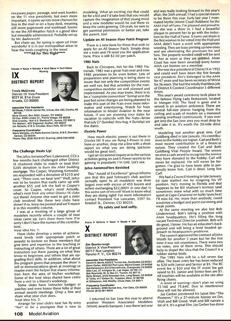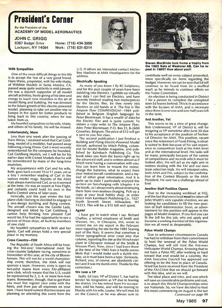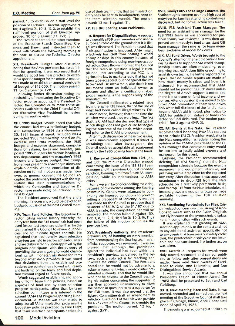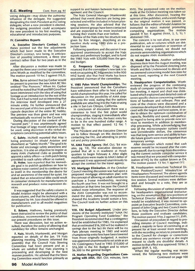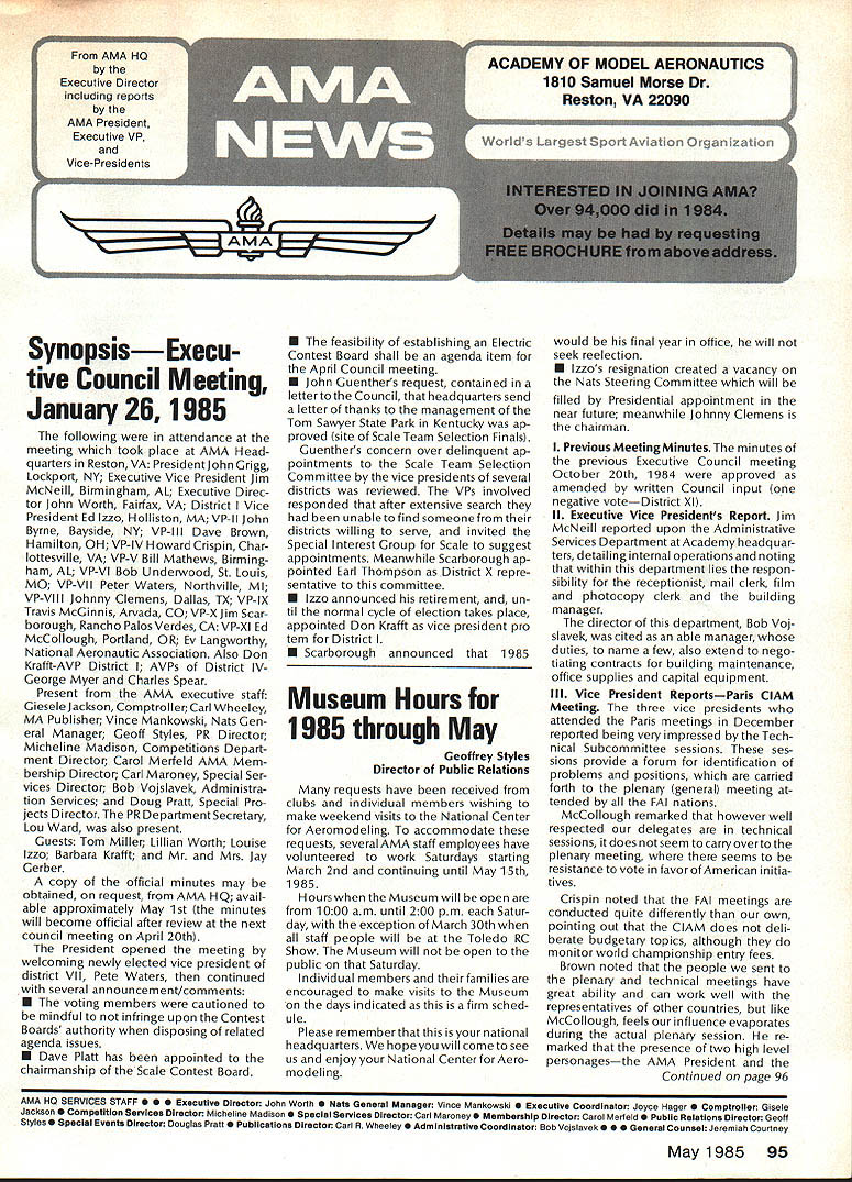 r following attendance meeting took place AMA Head quarters Reston VA PresidentJohn Grigg Lockport NY Executive Vice President Jim McNeilI Birmingham AL Executive Direc tor John Worth Fairfax VA District Vice President Ed Izzo Holliston MA VP-Il John Byrne Bayside NY VP-Ill Dave Brown Hamilton OH VP-IV Howard Crispin Char lottesville VA VP-V Bill Mathews Birming ham AL VP-VI Bob Underwood St Louis MO VP-VII Peter Waters Northville MI VP-VIII Johnny Clemens Dallas TX VP-IX Travis McGinnis Arvada CO VP-X Jim Scar borough Rancho Palos Verdes CA VP-XI Ed McCollough Portland OR Ev Langworthy National Aeronautic Association Also Don Krafft-AVP District AVPs District IVGeorge Myer Charles Spear Present AMA executive staff Giesele Jackson Comptroller Carl Wheeley MA Publisher Vince Mankowski Nats Gen eral Manager Geoff Styles PR Director Micheline Madison Competitions Depart ment Director Carol Merfeld AMA Mem bership Director Carl Maroney Special Ser vices Director Bob Vojslavek Administra tion Services Doug Pratt Special Pro jects Director PR Department Secretary Lou Ward also present Guests Tom Miller Lillian Worth Louise Izzo Barbara Krafft Mr Mrs Jay Gerber copy official minutes may obtained request AMA HQ avail able approximately May 1st minutes will become official after review next council meeting April 20th President opened meeting welcoming newly elected vice president district VII Pete Waters continued several announcement/comments voting members cautioned mindful infringe upon Contest Boards authority disposing related agenda issues Dave Platt has appointed chairmanship Scale Contest Board feasibility establishing Electric Contest Board shall agenda item April Council meeting John Guenthers request contained letter Council headquarters send letter thanks management Tom Sawyer State Park Kentucky ap proved site Scale Team Selection Finals Guenthers concern over delinquent ap pointments Scale Team Selection Committee vice presidents several districts reviewed VPs involved responded after extensive search unable find someone districts willing serve invited Special Interest Group Scale suggest appointments Meanwhile Scarborough ap pointed Earl Thompson District X repre sentative committee Izzo announced retirement un til normal cycle election takes place appointed Don Krafft vice president pro tem District Scarborough announced 1985 Museum Hours 1985 through May Geoffrey Styles Director Public Relations requests have received clubs individual members wishing make weekend visits National Center Aeromodeling accommodate requests several AMA staff employees have volunteered work Saturdays starting March 2nd continuing until May 15th 1985 Hours Museum will open 1000 am until 200 pm Satur day exception March 30th staff people will Toledo RC Show Museum will open public Saturday Individual members families encouraged make visits Museum days indicated firm sched ule Please rememberthat national headquarters hope will come see us enjoy National Center Aero modeling would final year office will seek reelection Izzos resignation created vacancy Nats Steering Committee will filled Presidential appointment near future meanwhile Johnny Clemens chairman I Previous Meeting Minutes minutes previous Executive Council meeting October 20th 1984 approved amended written Council input negative voteDistrict Xl II Executive Vice Presidents Report Jim McNeill reported upon Administrative Services Department Academy headquar ters detailing internal operations noting within department lies respon sibility receptionist mail clerk film photocopy clerk building manager director department Bob Voj slavek cited able manager duties name few also extend nego tiating contracts building maintenance office supplies capital equipment Ill Vice President ReportsParis ClAM Meeting three vice presidents attended Paris meetings December reported being very impressed Tech nical Subcommittee sessions ses sions provide forum identification problems positions carried forth plenary general meeting tended FAI nations McCollough remarked however well respected delegates technical sessions itdoesnotseemtocarryovertothe plenary meeting seems resistance vote favor American initia tives Crispin noted FAI meetings conducted quite differently own pointing out ClAM does deli berate budgetary topics although monitor world championship entry fees Brown noted people sent plenary technical meetings have great ability can work well representatives other countries like McCollough feels influence evaporates during actual plenary session re marked presence two high level personagesthe AMA President Continued page 96 May1985 95 AMA HQ Executive Director including reports AMA President Executive VP Vice-Presidents ACADEMY OF MODEL AERONAUTICS 1810 Samuel Morse Dr 3 Reston VA 22090 Synopsis Execu tive Council Meeting January 26 1985 AMA HO sERvicEs STAFF 0O 0 Executive Director John Worth e Nets General Manager vince Mankowski 0 Executive Coordinator Joyce Hager 0 Comptroller Gisele Jackson 0 CompetItion Services Director Micheline Madison 0 Special Services Director carl Maroneyo Membership Director carol Merfeld 0 Public Relations Director Geoff styles 0 Special Events Director Douglas Pratt 0 Publications Director carl R Wheeley 0 Administrative Coordinator Bob voaIavekeeeGeneral Counsel Jeremiah courtney ConL pg 95 voting delegatemay dilute authority influence delegate suggested designating AMA President voting delegate new president elected outgoing president could accompany new president first meeting educational introductory purposes IV Committee Reports A Executive Directors Contract Ma thews pointed out few adjustments made Executive Directors contract being anticipa tion possible retirement three year contract rather two years past After discussion motion made accept three year contract agreementfor John Worth modified committee motion passed 10 2 against 103 Film Byrne advised thatJaycerberwould present preview new AMA RC film entitled Pionee