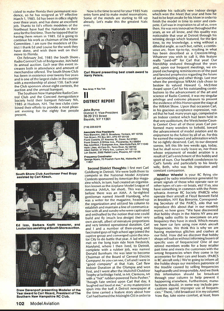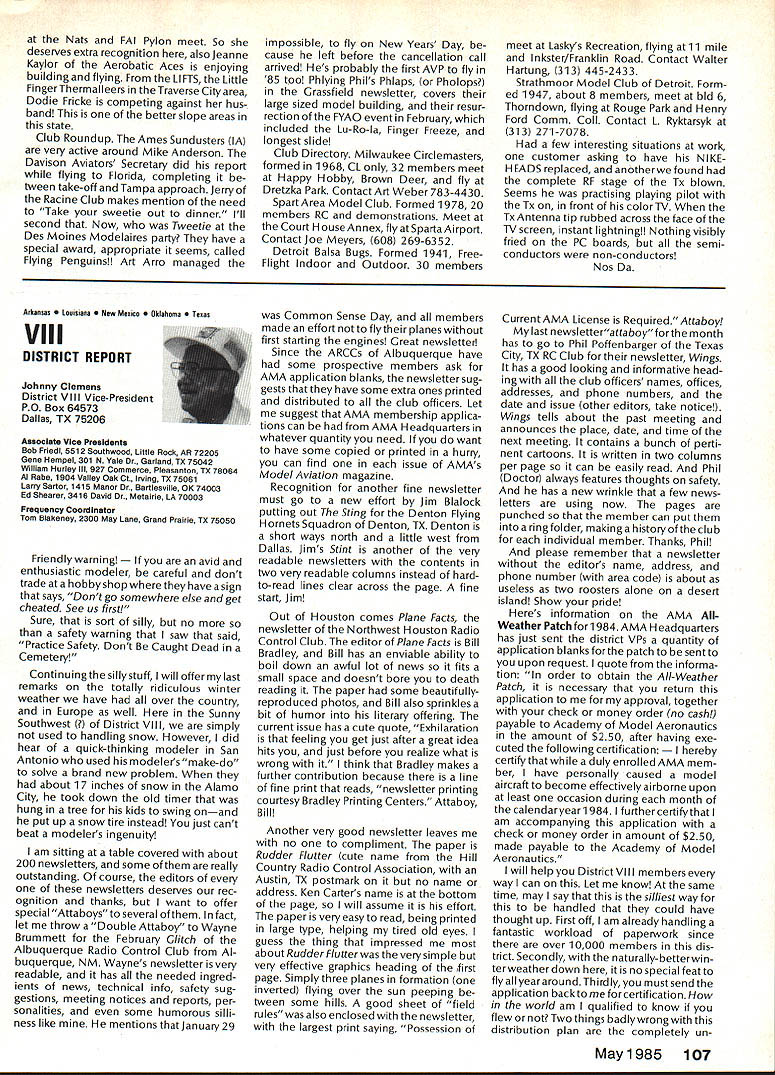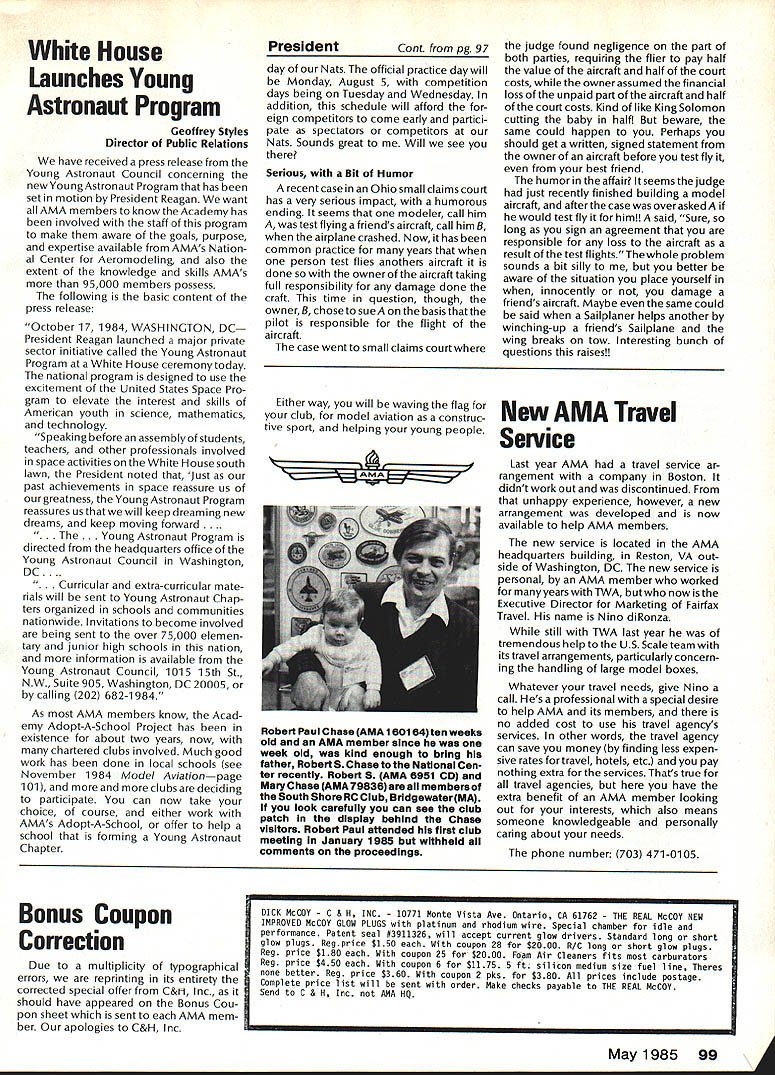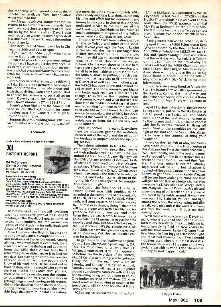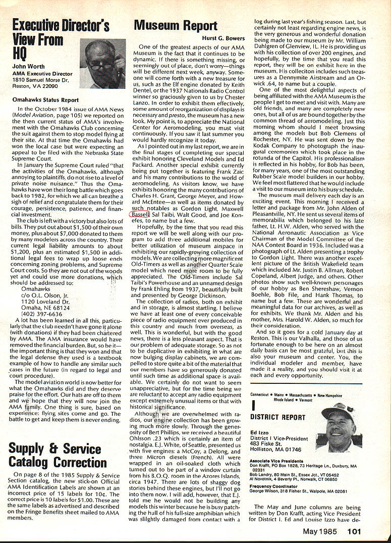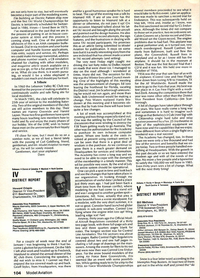 r following attendance meeting took place AMA Head quarters Reston VA PresidentJohn Grigg Lockport NY Executive Vice President Jim McNeilI Birmingham AL Executive Direc tor John Worth Fairfax VA District Vice President Ed Izzo Holliston MA VP-Il John Byrne Bayside NY VP-Ill Dave Brown Hamilton OH VP-IV Howard Crispin Char lottesville VA VP-V Bill Mathews Birming ham AL VP-VI Bob Underwood St Louis MO VP-VII Peter Waters Northville MI VP-VIII Johnny Clemens Dallas TX VP-IX Travis McGinnis Arvada CO VP-X Jim Scar borough Rancho Palos Verdes CA VP-XI Ed McCollough Portland OR Ev Langworthy National Aeronautic Association Also Don Krafft-AVP District AVPs District IVGeorge Myer Charles Spear Present AMA executive staff Giesele Jackson Comptroller Carl Wheeley MA Publisher Vince Mankowski Nats Gen eral Manager Geoff Styles PR Director Micheline Madison Competitions Depart ment Director Carol Merfeld AMA Mem bership Director Carl Maroney Special Ser vices Director Bob Vojslavek Administra tion Services Doug Pratt Special Pro jects Director PR Department Secretary Lou Ward also present Guests Tom Miller Lillian Worth Louise Izzo Barbara Krafft Mr Mrs Jay Gerber copy official minutes may obtained request AMA HQ avail able approximately May 1st minutes will become official after review next council meeting April 20th President opened meeting welcoming newly elected vice president district VII Pete Waters continued several announcement/comments voting members cautioned mindful infringe upon Contest Boards authority disposing related agenda issues Dave Platt has appointed chairmanship Scale Contest Board feasibility establishing Electric Contest Board shall agenda item April Council meeting John Guenthers request contained letter Council headquarters send letter thanks management Tom Sawyer State Park Kentucky ap proved site Scale Team Selection Finals Guenthers concern over delinquent ap pointments Scale Team Selection Committee vice presidents several districts reviewed VPs involved responded after extensive search unable find someone districts willing serve invited Special Interest Group Scale suggest appointments Meanwhile Scarborough ap pointed Earl Thompson District X repre sentative committee Izzo announced retirement un til normal cycle election takes place appointed Don Krafft vice president pro tem District Scarborough announced 1985 Museum Hours 1985 through May Geoffrey Styles Director Public Relations requests have received clubs individual members wishing make weekend visits National Center Aeromodeling accommodate requests several AMA staff employees have volunteered work Saturdays starting March 2nd continuing until May 15th 1985 Hours Museum will open 1000 am until 200 pm Satur day exception March 30th staff people will Toledo RC Show Museum will open public Saturday Individual members families encouraged make visits Museum days indicated firm sched ule Please rememberthat national headquarters hope will come see us enjoy National Center Aero modeling would final year office will seek reelection Izzos resignation created vacancy Nats Steering Committee will filled Presidential appointment near future meanwhile Johnny Clemens chairman I Previous Meeting Minutes minutes previous Executive Council meeting October 20th 1984 approved amended written Council input negative voteDistrict Xl II Executive Vice Presidents Report Jim McNeill reported upon Administrative Services Department Academy headquar ters detailing internal operations noting within department lies respon sibility receptionist mail clerk film photocopy clerk building manager director department Bob Voj slavek cited able manager duties name few also extend nego tiating contracts building maintenance office supplies capital equipment Ill Vice President ReportsParis ClAM Meeting three vice presidents attended Paris meetings December reported being very impressed Tech nical Subcommittee sessions ses sions provide forum identification problems positions carried forth plenary general meeting tended FAI nations McCollough remarked however well respected delegates technical sessions itdoesnotseemtocarryovertothe plenary meeting seems resistance vote favor American initia tives Crispin noted FAI meetings conducted quite differently own pointing out ClAM does deli berate budgetary topics although monitor world championship entry fees Brown noted people sent plenary technical meetings have great ability can work well representatives other countries like McCollough feels influence evaporates during actual plenary session re marked presence two high level personagesthe AMA President Continued page 96 May1985 95 AMA HQ Executive Director including reports AMA President Executive VP Vice-Presidents ACADEMY OF MODEL AERONAUTICS 1810 Samuel Morse Dr 3 Reston VA 22090 Synopsis Execu tive Council Meeting January 26 1985 AMA HO sERvicEs STAFF 0O 0 Executive Director John Worth e Nets General Manager vince Mankowski 0 Executive Coordinator Joyce Hager 0 Comptroller Gisele Jackson 0 CompetItion Services Director Micheline Madison 0 Special Services Director carl Maroneyo Membership Director carol Merfeld 0 Public Relations Director Geoff styles 0 Special Events Director Douglas Pratt 0 Publications Director carl R Wheeley 0 Administrative Coordinator Bob voaIavekeeeGeneral Counsel Jeremiah courtney ConL pg 95 voting delegatemay dilute authority influence delegate suggested designating AMA President voting delegate new president elected outgoing president could accompany new president first meeting educational introductory purposes IV Committee Reports A Executive Directors Contract Ma thews pointed out few adjustments made Executive Directors contract being anticipa tion possible retirement three year contract rather two years past After discussion motion made accept three year contract agreementfor John Worth modified committee motion passed 10 2 against 103 Film Byrne advised thatJaycerberwould present preview new AMA RC film entitled Pionee