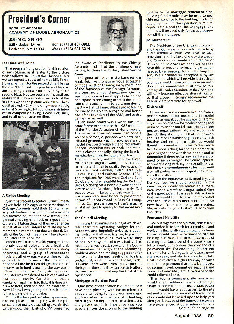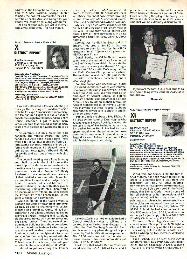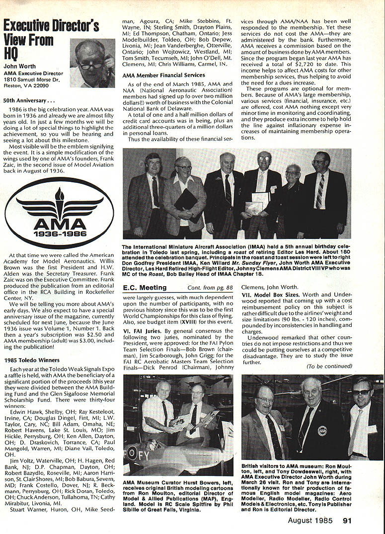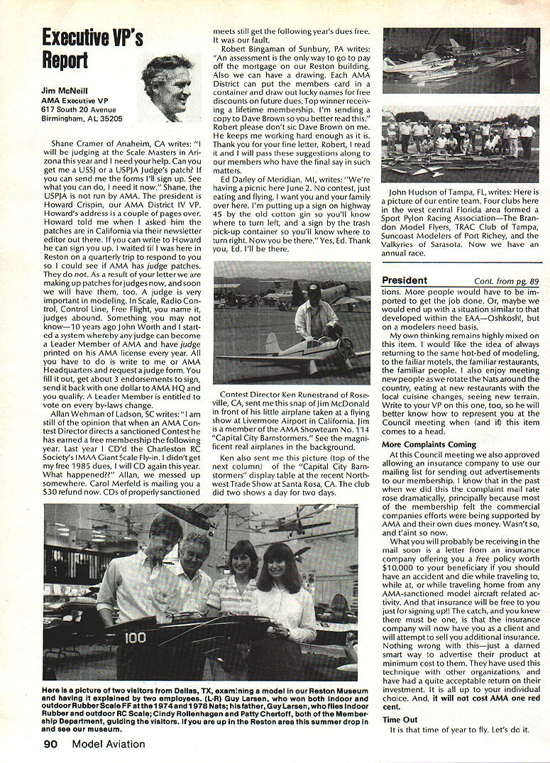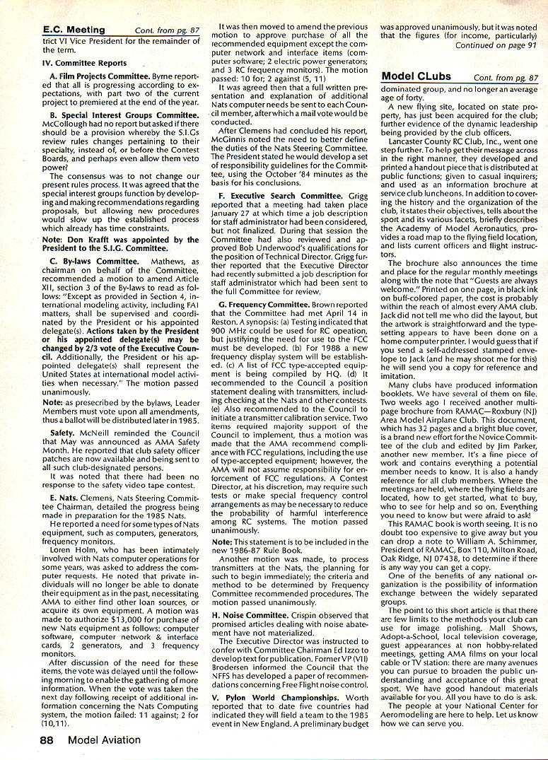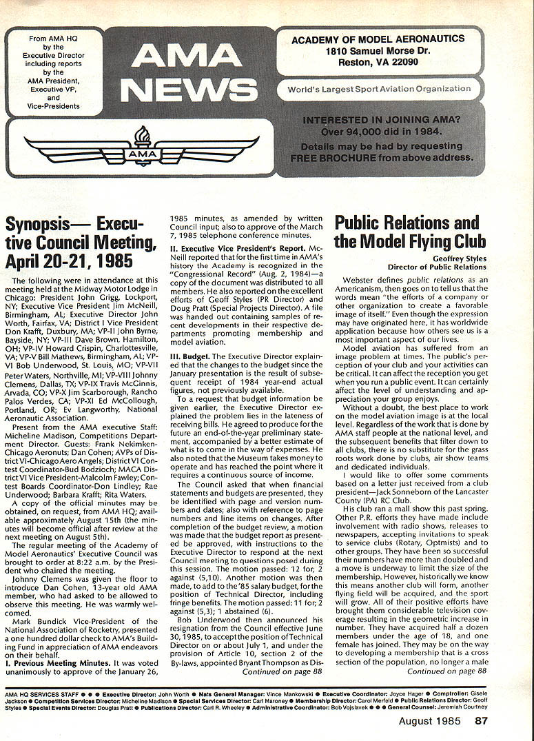 The following attendance meeting held Midway Motor Lodge Chicago President John Grigg Lockport NY Executive Vice President Jim McNeill Birmingham AL Executive Director John Worth Fairfax VA District Vice President Don Krafft Duxbury MA VP-Il John Byrne Bayside NY VP-Ill Dave Brown Hamilton OH VP-IV Howard Crispin Charlottesville VA VP-V Bill Mathews Birmingham AL VPVI Bob Underwood St Louis MO VP-VII Peter Waters Northville Ml VP-VI lii ohnny Clemens Dallas TX VP-IX Travis McGinnis Arvada CO VP-X Jim Scarborough Rancho Palos Verdes CA VP-XI Ed McCollough Portland OR Ev Langworthy National Aeronautic Association Present AMA executive Staff Micheline Madison Competitions Depart ment Director Guests Frank Nekimken Chicago Aeronuts Dan Cohen AVPs Dis trictVl-ChicagoAeroAngels District VI Con test Coordinator-Bud Bodzioch MACA Dis trictVl Vice President-Malcolm Fawley Con test Boards Coordinator-Don Lindley Rae Underwood Barbara Krafft Rita Waters copy official minutes may obtained request AMA HQ avail able approximately August 15th min utes will become official after review next meeting August 5th regular meeting Academy Model Aeronautics Executive Council brought order 822 am Presi dent chaired meeting Johnny Clemens given floor introduce Dan Cohen 13-year old AMA member asked allowed observe meeting warmly wel comed Mark Bundick Vice-President National Association Rocketry presented aone hundred dollarcheckto AMAs Build ing Fund appreciation AMA endeavors behalf I Previous Meeting Minutes voted unanimously approve January 26 1985 minutes amended written Council input also approve March 7 1985 telephone conference minutes II Executive Vice Presidents Report Mc Neill reported first time AMAs history Academy recognized Congressional Record Aug 2 1984a copy document distributed members also reported excellent efforts Geoff Styles PR Director Doug Pratt Special Projects Director file handed out containing samples re cent developments respective de partments promoting membership model aviation Ill Budget Executive Director explain ed changes budget since January presentation result subse quent receipt 1984 year-end actual figures previously available request budget information given earlier Executive Director ex plained problem lies lateness receiving bills agreed produce future end-of-the-year preliminary state ment accompanied b better estimate what come way expenses also noted Museum takes money operate has reached point requires continuous source income Council asked financial statements budgets presented identified page version num bers dates also reference page numbers line items changes After completion budget review motion made budget report present ed approved instructions Executive Director respond next Council meeting questions posed during session motion passed 12 2 against 510 Another motion made add 85 salary budget forthe position Technical Director including fringe benefits motion passed 11 2 against 53 1 abstained 6 Bob Underwood announced resignation Council effective June 301985 accept position Technical Director about July 1 under provision Article 10 section 2 By-laws appointed BryantThompson Dis Continued page 88 Webster defines public relations Americanism goes tell us words mean efforts company other organization create favorable image itself though expression may have originated has worldwide application because others see us important aspect lives Model aviation has suffered image problem times publics per ception club activities can critical can affect reception get run public event ltcan certainly affect level understanding ap preciation group enjoys Without doubt best place work model aviation image local level Regardless work done AMA staff people national level subsequent benefits filter down clubs no substitute grass roots work done clubs air show teams dedicated individuals would like offer some comments based letter just received club presidentJack Sonneborn Lancaster County PA RC Club club ran mall show past spring Other PR efforts have made include involvement radio shows releases newspapers accepting invitations speak service clubs Rotary Optmists other groups have successful numbers have doubled move underway limit size membership However historicallywe know means another club will form another flying field will acquired sport will grow positive efforts have brought considerable television cov erage resulting geometric increase number have acquired half dozen members under age 18 female has joined may way developing membership cross section population no longer male Continued page 88 August 1985 87 AMA HO Executive Director including reports AMA President Executive VP Vice-Presidents ACADEMY OF MODEL AERONAUTICS 1810 Samuel Morse Dr Reston VA 22090 Worlds Largest Sport ation Organ Synopsis ExecuPublic Relations tive Council Meetingthe Model Flying Club Geoffrey Styles April 20-21 1985Director Public Relations AMA HO SERVICES STAFF 000 Executive Director John Worth 0 Nets General Manager Vince Mankowaki 0 Executive Coordinator Joyce Hager 0 comptroller Gisele Jackaon 0 CompetitIon Services Director Micheline Madison 0 Speciel Services Director Carl MaroneyS Membership Director carol MerleldO Public Aeletlons Director Geoff Stylea0 Special Events Director Oouglaa Pratt 0 Pubilcetions pg 87 trict VI Vice President remainder term IV Committee Reports A Film Projects Committee Byrne report ed progressing according ex pectations part two current project premiered end year B Special Interest Groups Committee McCollough no report asked should provision whereby SlGs review rules changes pertaining specialty instead before Contest Boards perhaps allow veto power consensus change present rules process agreed special interest groups function develop ing making recommendations regarding proposals allowing new procedures would slow up established process already has time constraints Note Don Krafft appointed President SlG Committee C By-laws Committee Mathews chairman beh