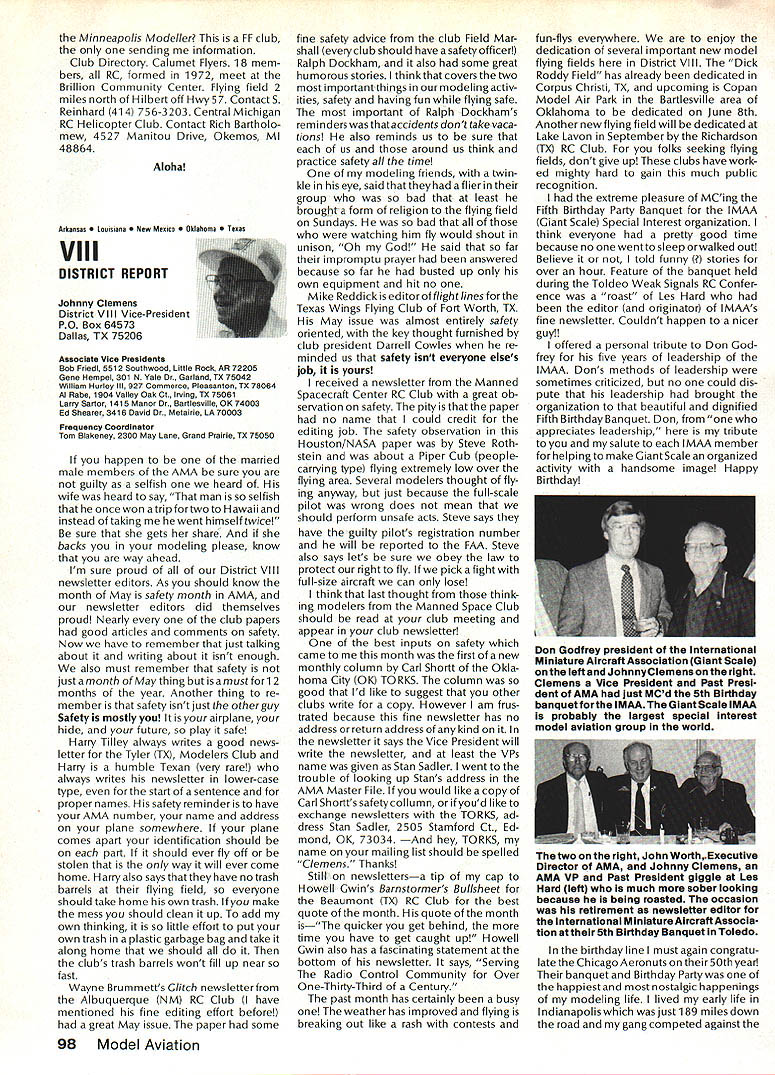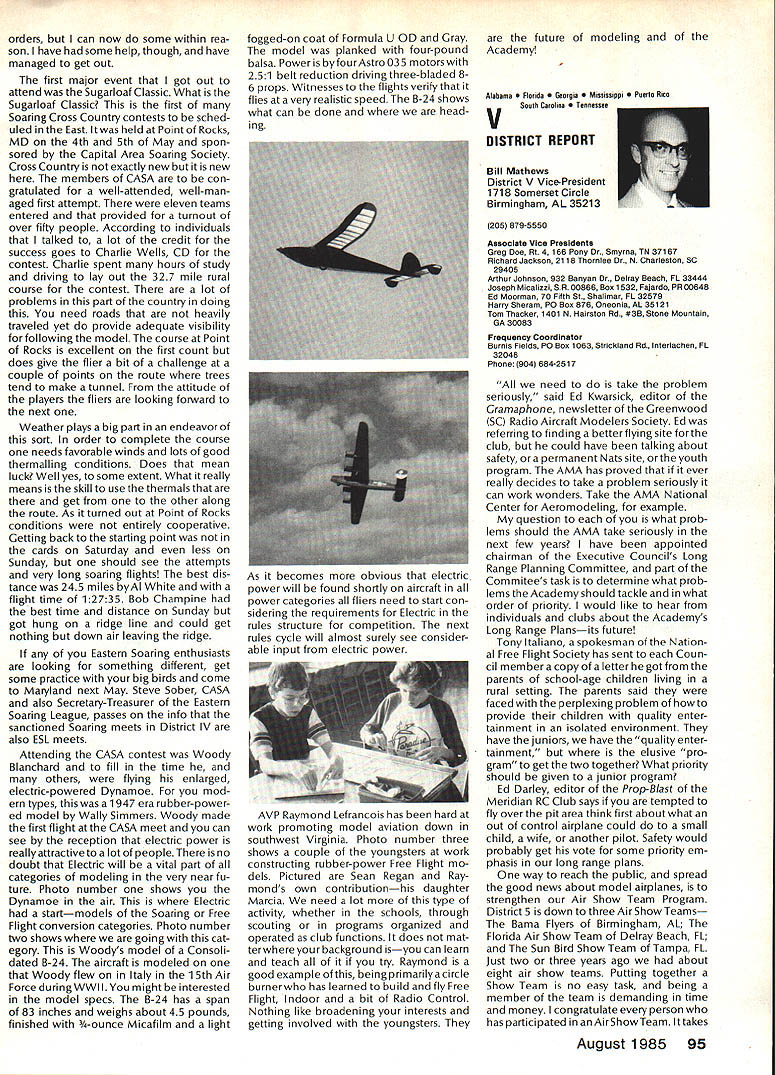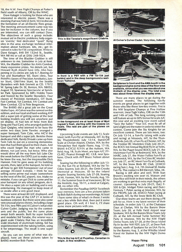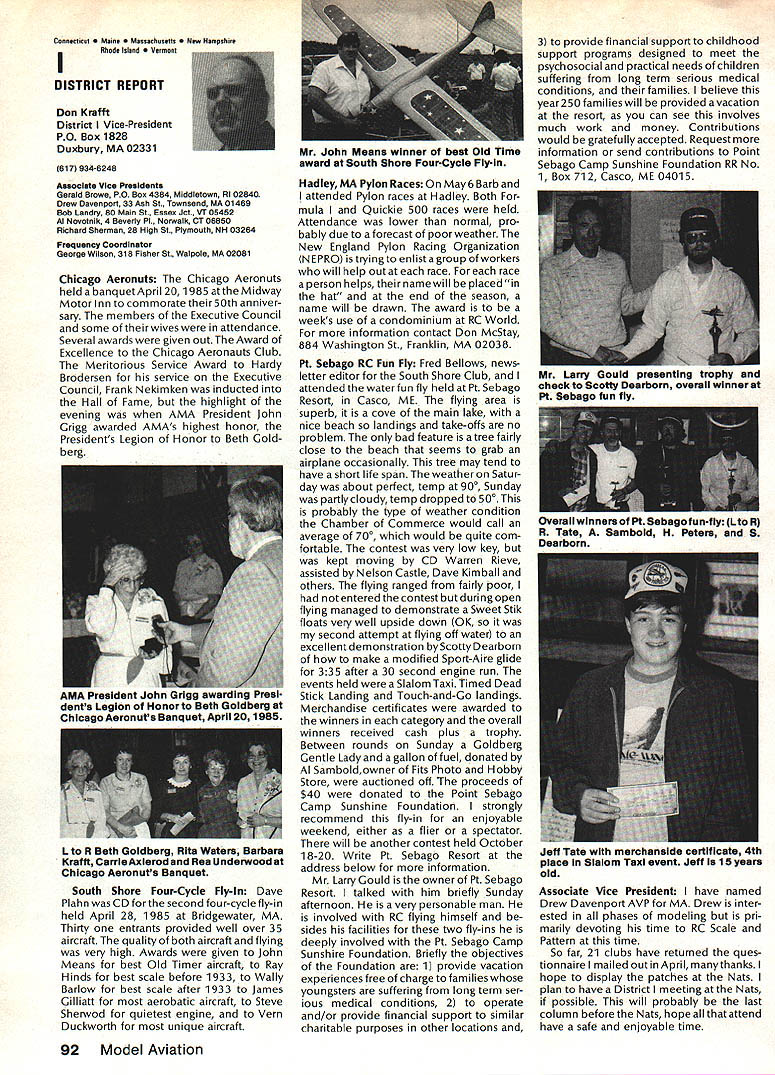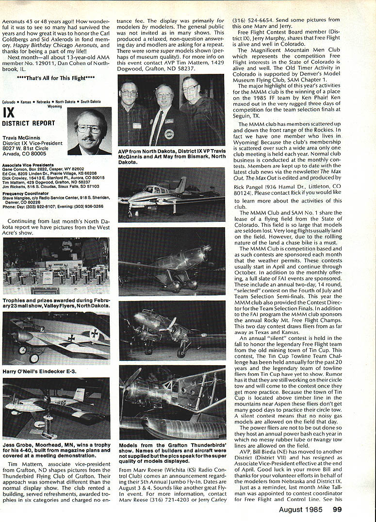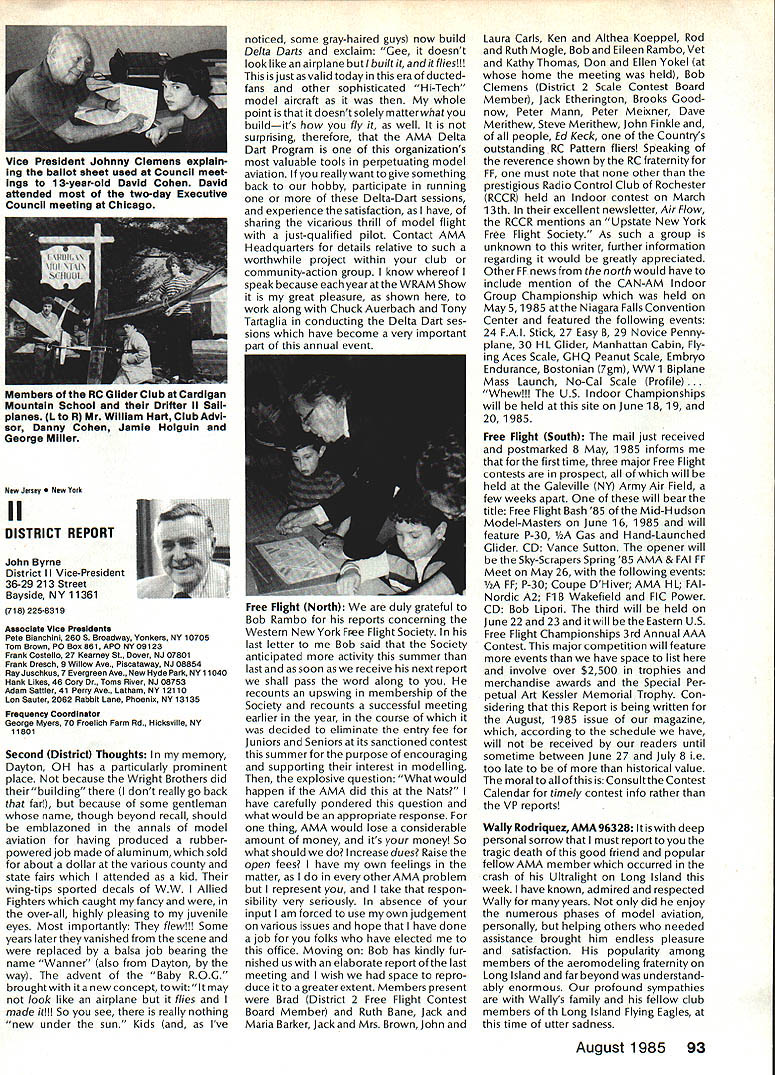 The following attendance meeting held Midway Motor Lodge Chicago President John Grigg Lockport NY Executive Vice President Jim McNeill Birmingham AL Executive Director John Worth Fairfax VA District Vice President Don Krafft Duxbury MA VP-Il John Byrne Bayside NY VP-Ill Dave Brown Hamilton OH VP-IV Howard Crispin Charlottesville VA VP-V Bill Mathews Birmingham AL VPVI Bob Underwood St Louis MO VP-VII Peter Waters Northville Ml VP-VI lii ohnny Clemens Dallas TX VP-IX Travis McGinnis Arvada CO VP-X Jim Scarborough Rancho Palos Verdes CA VP-XI Ed McCollough Portland OR Ev Langworthy National Aeronautic Association Present AMA executive Staff Micheline Madison Competitions Depart ment Director Guests Frank Nekimken Chicago Aeronuts Dan Cohen AVPs Dis trictVl-ChicagoAeroAngels District VI Con test Coordinator-Bud Bodzioch MACA Dis trictVl Vice President-Malcolm Fawley Con test Boards Coordinator-Don Lindley Rae Underwood Barbara Krafft Rita Waters copy official minutes may obtained request AMA HQ avail able approximately August 15th min utes will become official after review next meeting August 5th regular meeting Academy Model Aeronautics Executive Council brought order 822 am Presi dent chaired meeting Johnny Clemens given floor introduce Dan Cohen 13-year old AMA member asked allowed observe meeting warmly wel comed Mark Bundick Vice-President National Association Rocketry presented aone hundred dollarcheckto AMAs Build ing Fund appreciation AMA endeavors behalf I Previous Meeting Minutes voted unanimously approve January 26 1985 minutes amended written Council input also approve March 7 1985 telephone conference minutes II Executive Vice Presidents Report Mc Neill reported first time AMAs history Academy recognized Congressional Record Aug 2 1984a copy document distributed members also reported excellent efforts Geoff Styles PR Director Doug Pratt Special Projects Director file handed out containing samples re cent developments respective de partments promoting membership model aviation Ill Budget Executive Director explain ed changes budget since January presentation result subse quent receipt 1984 year-end actual figures previously available request budget information given earlier Executive Director ex plained problem lies lateness receiving bills agreed produce future end-of-the-year preliminary state ment accompanied b better estimate what come way expenses also noted Museum takes money operate has reached point requires continuous source income Council asked financial statements budgets presented identified page version num bers dates also reference page numbers line items changes After completion budget review motion made budget report present ed approved instructions Executive Director respond next Council meeting questions posed during session motion passed 12 2 against 510 Another motion made add 85 salary budget forthe position Technical Director including fringe benefits motion passed 11 2 against 53 1 abstained 6 Bob Underwood announced resignation Council effective June 301985 accept position Technical Director about July 1 under provision Article 10 section 2 By-laws appointed BryantThompson Dis Continued page 88 Webster defines public relations Americanism goes tell us words mean efforts company other organization create favorable image itself though expression may have originated has worldwide application because others see us important aspect lives Model aviation has suffered image problem times publics per ception club activities can critical can affect reception get run public event ltcan certainly affect level understanding ap preciation group enjoys Without doubt best place work model aviation image local level Regardless work done AMA staff people national level subsequent benefits filter down clubs no substitute grass roots work done clubs air show teams dedicated individuals would like offer some comments based letter just received club presidentJack Sonneborn Lancaster County PA RC Club club ran mall show past spring Other PR efforts have made include involvement radio shows releases newspapers accepting invitations speak service clubs Rotary Optmists other groups have successful numbers have doubled move underway limit size membership However historicallywe know means another club will form another flying field will acquired sport will grow positive efforts have brought considerable television cov erage resulting geometric increase number have acquired half dozen members under age 18 female has joined may way developing membership cross section population no longer male Continued page 88 August 1985 87 AMA HO Executive Director including reports AMA President Executive VP Vice-Presidents ACADEMY OF MODEL AERONAUTICS 1810 Samuel Morse Dr Reston VA 22090 Worlds Largest Sport ation Organ Synopsis ExecuPublic Relations tive Council Meetingthe Model Flying Club Geoffrey Styles April 20-21 1985Director Public Relations AMA HO SERVICES STAFF 000 Executive Director John Worth 0 Nets General Manager Vince Mankowaki 0 Executive Coordinator Joyce Hager 0 comptroller Gisele Jackaon 0 CompetitIon Services Director Micheline Madison 0 Speciel Services Director Carl MaroneyS Membership Director carol MerleldO Public Aeletlons Director Geoff Stylea0 Special Events Director Oouglaa Pratt 0 Pubilcetions pg 87 trict VI Vice President remainder term IV Committee Reports A Film Projects Committee Byrne report ed progressing according ex pectations part two current project premiered end year B Special Interest Groups Committee McCollough no report asked should provision whereby SlGs review rules changes pertaining specialty instead before Contest Boards perhaps allow veto power consensus change present rules process agreed special interest groups function develop ing making recommendations regarding proposals allowing new procedures would slow up established process already has time constraints Note Don Krafft appointed President SlG Committee C By-laws Committee Mathews chairman beh
