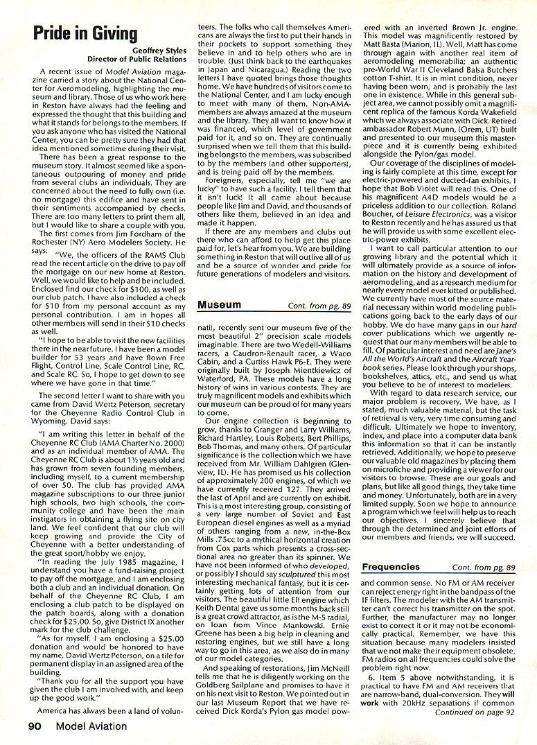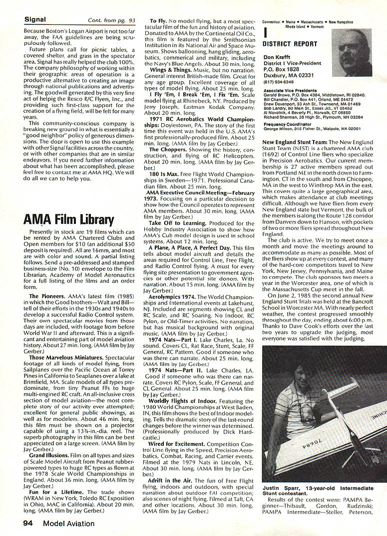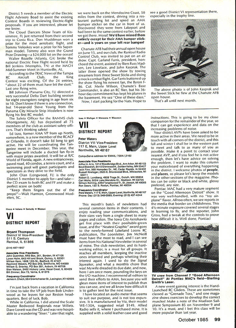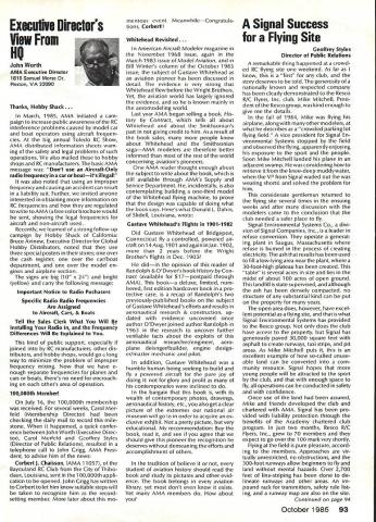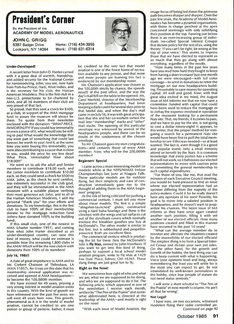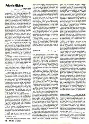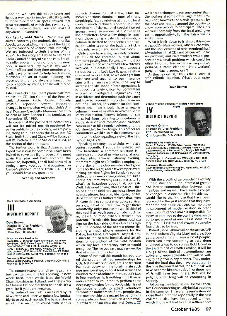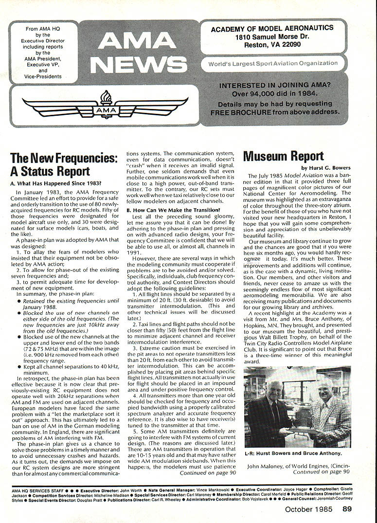 A What Has Happened Since 1983 January 1983 AMA Frequency Committee led effortto provide forasafe orderly transition use 80 newlyacquired frequencies RC models Fifty frequencies designated model aircraft use 30 desig nated surface models cars boats like phase-in plan adopted byAMA designed 1 allay fears modelers insisted equipment obso leted AMA action 2 allow phase-out existing seven frequencies 3 permit adequate time develop ment new equipment summary phase-in plan Retained existing frequencies until January 1988 Blocked use new channels either side old frequencies new frequencies just 10kHz away old frequencies Blocked use new channels upper lower end two bands 72 & 75MHz within image ie 900 kHz removed other frequency range Kept channel separations 40 kHz minimum retrospect phase-in plan has effective because now clear pre viously-existing RC equipment does operate well 20kHz separations AM FM used adjacent channels European modelers have faced same problem let marketplace sort out approach has ultimately led ban use AM German modeling community England significant problems AM interfering FM phase-in plan gives us chance solve problems atimelymannerand avoid unnecessary crashes hazards As turns out demands impose RC system designs stringent foralmostanycommercial communica tions systems communication system data communications doesnt crash receives invalid signal Further seldom demands mobile communicationsworkwell close high power out-of-band trans mitter contrary RC sets must workwellwhenwetaxi relativelycloseto fellow modelers adjacent channels B How Can Make Transition Lest preceding sound gloomy let assure can done adhering phase-in plan pressing advanced radio designs Fre quency Committee confident will able use almost channels 1991 However several ways modeling community must cooperate problems avoided and/or solved Specifically individuals club frequency con trol authority Contest Directors should adopt following guidelines 1 flight lines should separated minimum 20 ft 30 ft desirable avoid transmitter intermodulation other technical issues will discussed later 2 Taxi lines flight paths should closer fifty 50 feet flight line minimize adjacent channel receiver intermodulation interference 3 Extreme caution must exercised pit areas operate transmitters less 20 ft other avoid transmit ter intermodulation can accom plished placing pit areas behind specific flight lines transmitters actually use flight should placed impound area under positive frequency control 4 transmitters year old should checked frequency occu pied bandwidth using properly calibrated spectrum analyzer accurate frequency reference also wise have receivers tuned transmitter time 5 Some AM transmitters definitely going interfere FM systems current design reasons discussed later AM transmitters operation 10-15 years old may have rather wide AM modulation sidebands happeis modelers must use patience Continued page 90 Hurst C Bowers July 1985 Model Aviation ban ner edition provided three full pages magnificent color pictures National Center Aeromodeling museum highlighted extravaganza color throughout three-story atrium benefit have visited new headquarters Reston hope will gain some comprehen sion appreciation unbelievably beautiful facility museum library continue grow chances good six months ago would hardly rec ognize today Its much better iriij5rnvements additions will continue case dynamic living institu tion members other visitors friends never cease amaze us seemingly endless flow significant aeromodeling memorabilia also receiving publications documents growing library archives recent highlight Academy visit Mr Mrs Bruce Anthony Hopkins MN brought presented museum beautiful presti gious Walt Billett Trophy behalf Twin City Radio Controllers Model Airplane Club significant point out Bruce three-time winner meaningful award John Maloney of World Engines ICincin Continued page 90 October 1985 89 AMA HO Executive Director including reports AMA President Executive VP Vice-Presidents AMA Woclds LarpetfpocfAViAiOn Oraniation New FrequenciesMuseum Report Status Report L-R Hurst Bowers Bruce Anthony AMA HO SERVICES STAFF OOS Executive Director John Worth 0 Nets Genemi Manager i/moe Mankowaki 0 Executive Coordinator Joyce Hager 0 Comptroller Gisele Jackaon 0 Competition Services Director Micheline Madiaon0 Special Services Director Carl Maroney0 Membership Director Carol MerfeldO Public Relations Director Geoff Styleae Special Events Director Douglaa Pratt 0 Publications Director Carl e Giving Geoffrey Styles Director Public Relations recent issue Model Aviation maga zine carried story about National Cen ter Aeromodeling highlighting mu seum library us work Reston have always feeling expressed thought thatthis building what stands belongs members ask anyone has visited National Center can pretty sure idea mentioned sometime during theirvisit has great response museum story almost seemed like spon taneous outpouring money pride several clubs individuals concerned about need fully own ie no mortgage edifice have sent sentiments accompanied checks too letters print would like share couple first comes Jim Fordham Rochester NY Aero Modelers Society says officers RAMS Club read recent article drive payoff mortgage new home Reston Well would like help included Enclosed find check $1 00 well club patch have also included check $10 personal account personal contribution am hopes other members will send $10 checks well 1 hope able visit newfacilities near future have model builder 53 years have flown Free Flight Control Line Scale Control Line RC Scale RC So hope get down see have gone time second letter want share came David Wertz Peterson secretary Cheyenne Radio Control Club Wyoming David says am writing letter behalf Cheyenne RC Club AMA Charter No 2000 individual member AMA Cheyenne RC Club about 11/2 years old has grown seven founding members including myself current membership over 50 club has provided AMA magazine sub