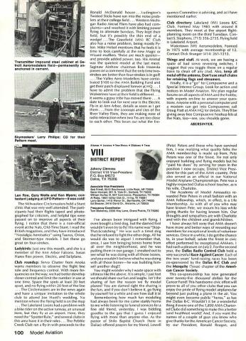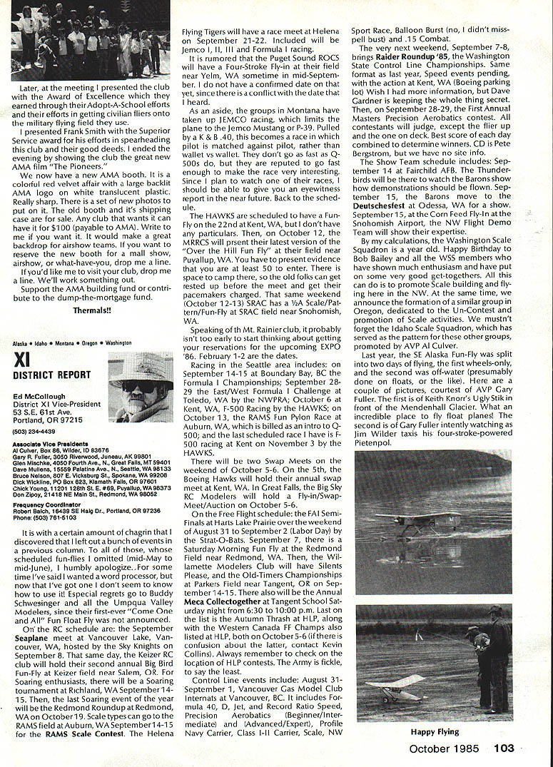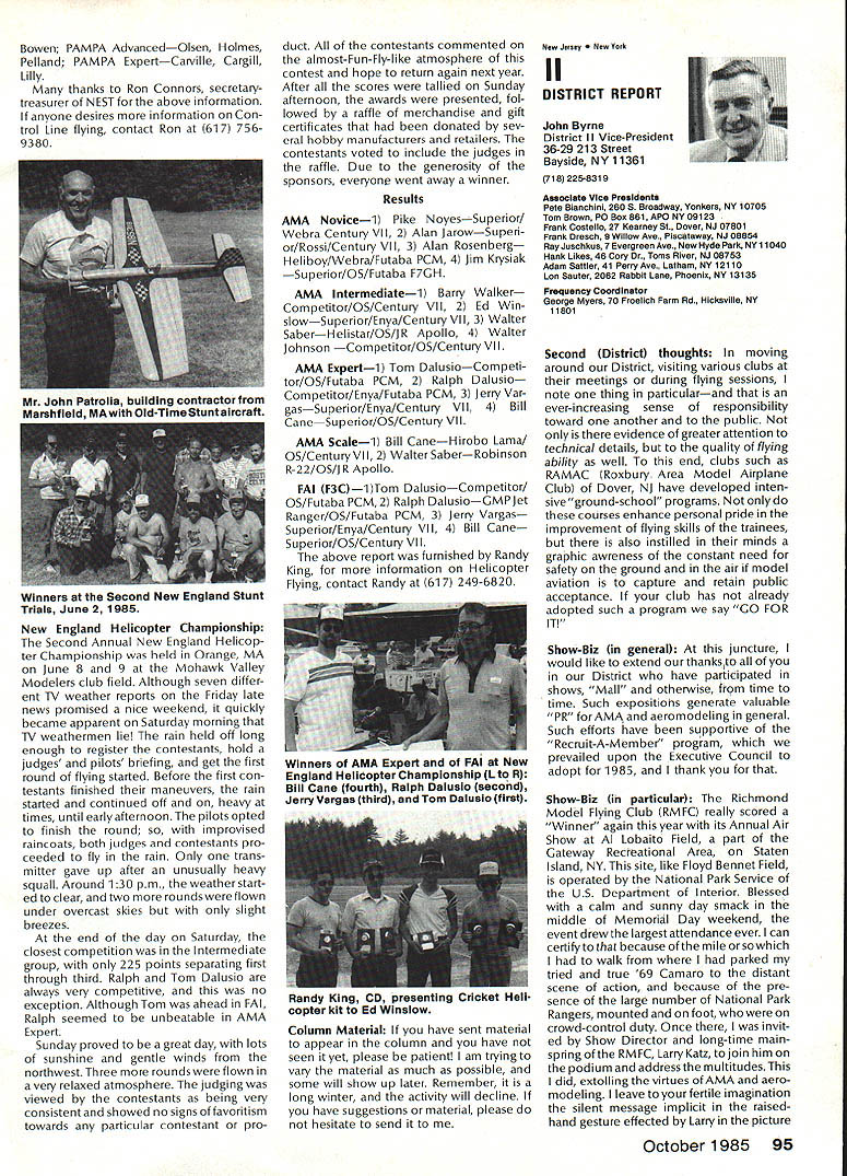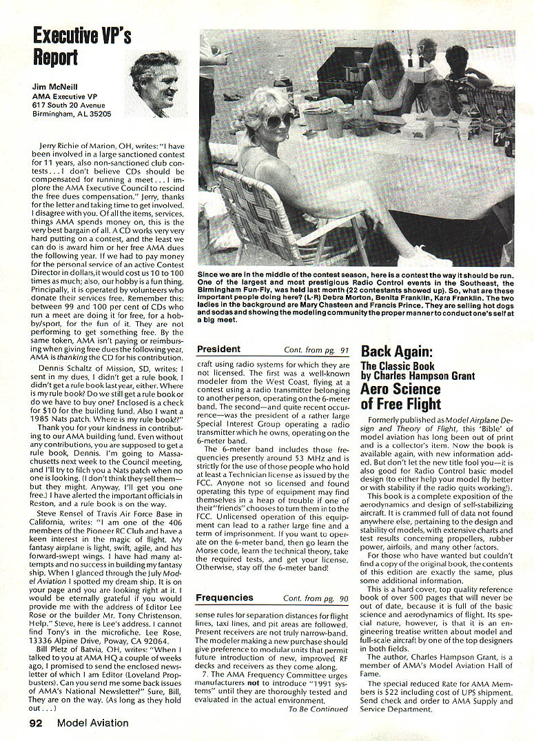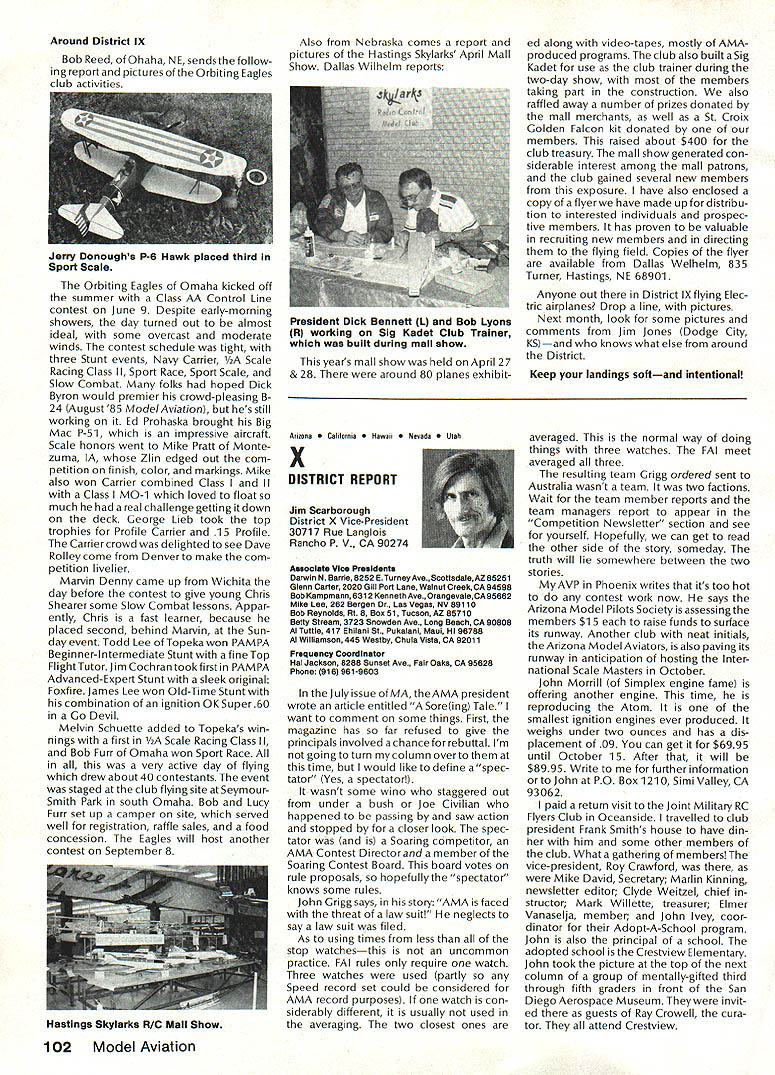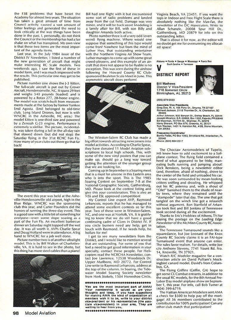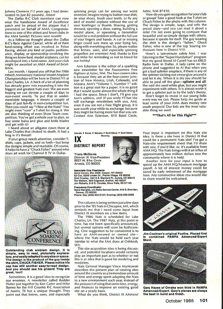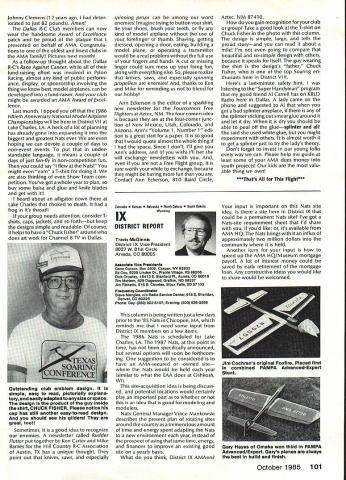 A What Has Happened Since 1983 January 1983 AMA Frequency Committee led effortto provide forasafe orderly transition use 80 newlyacquired frequencies RC models Fifty frequencies designated model aircraft use 30 desig nated surface models cars boats like phase-in plan adopted byAMA designed 1 allay fears modelers insisted equipment obso leted AMA action 2 allow phase-out existing seven frequencies 3 permit adequate time develop ment new equipment summary phase-in plan Retained existing frequencies until January 1988 Blocked use new channels either side old frequencies new frequencies just 10kHz away old frequencies Blocked use new channels upper lower end two bands 72 & 75MHz within image ie 900 kHz removed other frequency range Kept channel separations 40 kHz minimum retrospect phase-in plan has effective because now clear pre viously-existing RC equipment does operate well 20kHz separations AM FM used adjacent channels European modelers have faced same problem let marketplace sort out approach has ultimately led ban use AM German modeling community England significant problems AM interfering FM phase-in plan gives us chance solve problems atimelymannerand avoid unnecessary crashes hazards As turns out demands impose RC system designs stringent foralmostanycommercial communica tions systems communication system data communications doesnt crash receives invalid signal Further seldom demands mobile communicationsworkwell close high power out-of-band trans mitter contrary RC sets must workwellwhenwetaxi relativelycloseto fellow modelers adjacent channels B How Can Make Transition Lest preceding sound gloomy let assure can done adhering phase-in plan pressing advanced radio designs Fre quency Committee confident will able use almost channels 1991 However several ways modeling community must cooperate problems avoided and/or solved Specifically individuals club frequency con trol authority Contest Directors should adopt following guidelines 1 flight lines should separated minimum 20 ft 30 ft desirable avoid transmitter intermodulation other technical issues will discussed later 2 Taxi lines flight paths should closer fifty 50 feet flight line minimize adjacent channel receiver intermodulation interference 3 Extreme caution must exercised pit areas operate transmitters less 20 ft other avoid transmit ter intermodulation can accom plished placing pit areas behind specific flight lines transmitters actually use flight should placed impound area under positive frequency control 4 transmitters year old should checked frequency occu pied bandwidth using properly calibrated spectrum analyzer accurate frequency reference also wise have receivers tuned transmitter time 5 Some AM transmitters definitely going interfere FM systems current design reasons discussed later AM transmitters operation 10-15 years old may have rather wide AM modulation sidebands happeis modelers must use patience Continued page 90 Hurst C Bowers July 1985 Model Aviation ban ner edition provided three full pages magnificent color pictures National Center Aeromodeling museum highlighted extravaganza color throughout three-story atrium benefit have visited new headquarters Reston hope will gain some comprehen sion appreciation unbelievably beautiful facility museum library continue grow chances good six months ago would hardly rec ognize today Its much better iriij5rnvements additions will continue case dynamic living institu tion members other visitors friends never cease amaze us seemingly endless flow significant aeromodeling memorabilia also receiving publications documents growing library archives recent highlight Academy visit Mr Mrs Bruce Anthony Hopkins MN brought presented museum beautiful presti gious Walt Billett Trophy behalf Twin City Radio Controllers Model Airplane Club significant point out Bruce three-time winner meaningful award John Maloney of World Engines ICincin Continued page 90 October 1985 89 AMA HO Executive Director including reports AMA President Executive VP Vice-Presidents AMA Woclds LarpetfpocfAViAiOn Oraniation New FrequenciesMuseum Report Status Report L-R Hurst Bowers Bruce Anthony AMA HO SERVICES STAFF OOS Executive Director John Worth 0 Nets Genemi Manager i/moe Mankowaki 0 Executive Coordinator Joyce Hager 0 Comptroller Gisele Jackaon 0 Competition Services Director Micheline Madiaon0 Special Services Director Carl Maroney0 Membership Director Carol MerfeldO Public Relations Director Geoff Styleae Special Events Director Douglaa Pratt 0 Publications Director Carl e Giving Geoffrey Styles Director Public Relations recent issue Model Aviation maga zine carried story about National Cen ter Aeromodeling highlighting mu seum library us work Reston have always feeling expressed thought thatthis building what stands belongs members ask anyone has visited National Center can pretty sure idea mentioned sometime during theirvisit has great response museum story almost seemed like spon taneous outpouring money pride several clubs individuals concerned about need fully own ie no mortgage edifice have sent sentiments accompanied checks too letters print would like share couple first comes Jim Fordham Rochester NY Aero Modelers Society says officers RAMS Club read recent article drive payoff mortgage new home Reston Well would like help included Enclosed find check $1 00 well club patch have also included check $10 personal account personal contribution am hopes other members will send $10 checks well 1 hope able visit newfacilities near future have model builder 53 years have flown Free Flight Control Line Scale Control Line RC Scale RC So hope get down see have gone time second letter want share came David Wertz Peterson secretary Cheyenne Radio Control Club Wyoming David says am writing letter behalf Cheyenne RC Club AMA Charter No 2000 individual member AMA Cheyenne RC Club about 11/2 years old has grown seven founding members including myself current membership over 50 club has provided AMA magazine sub