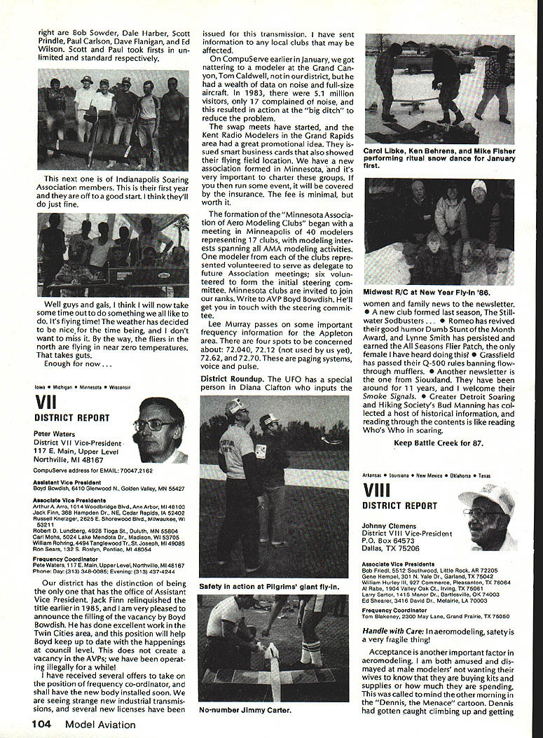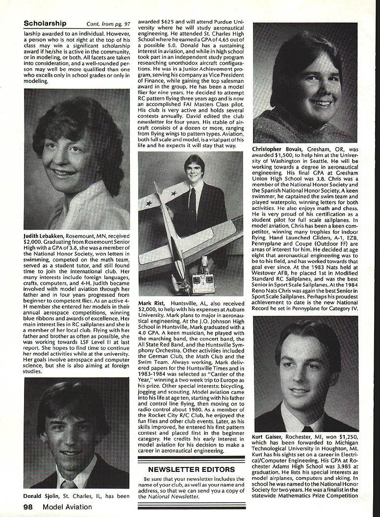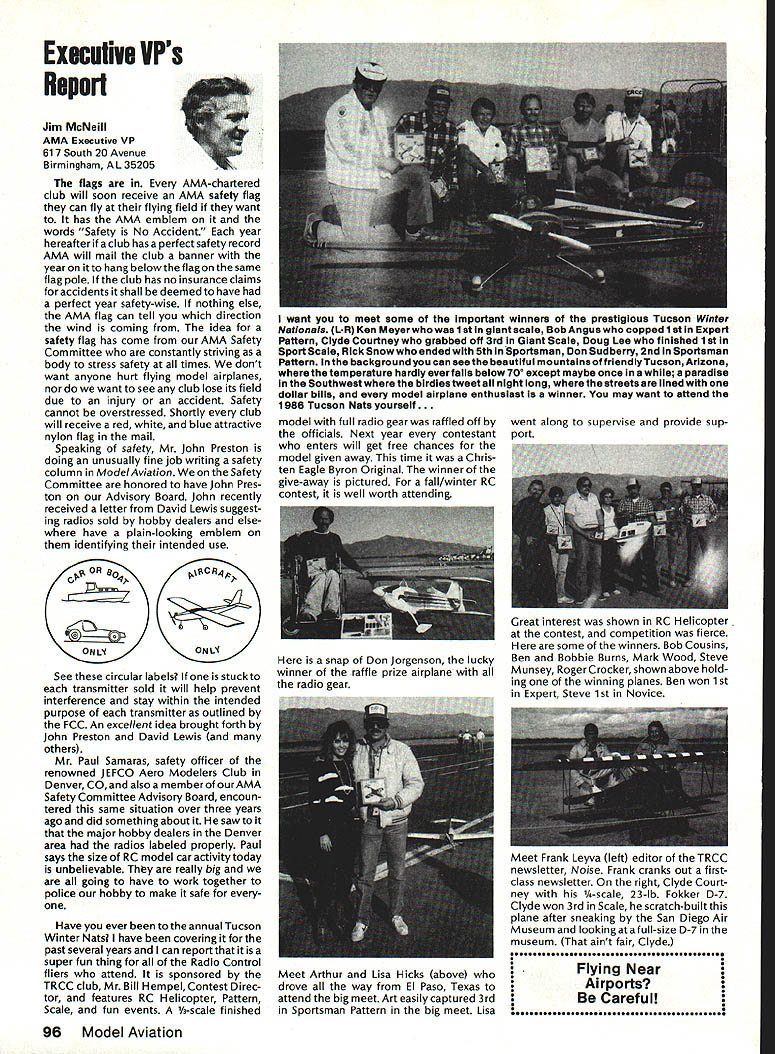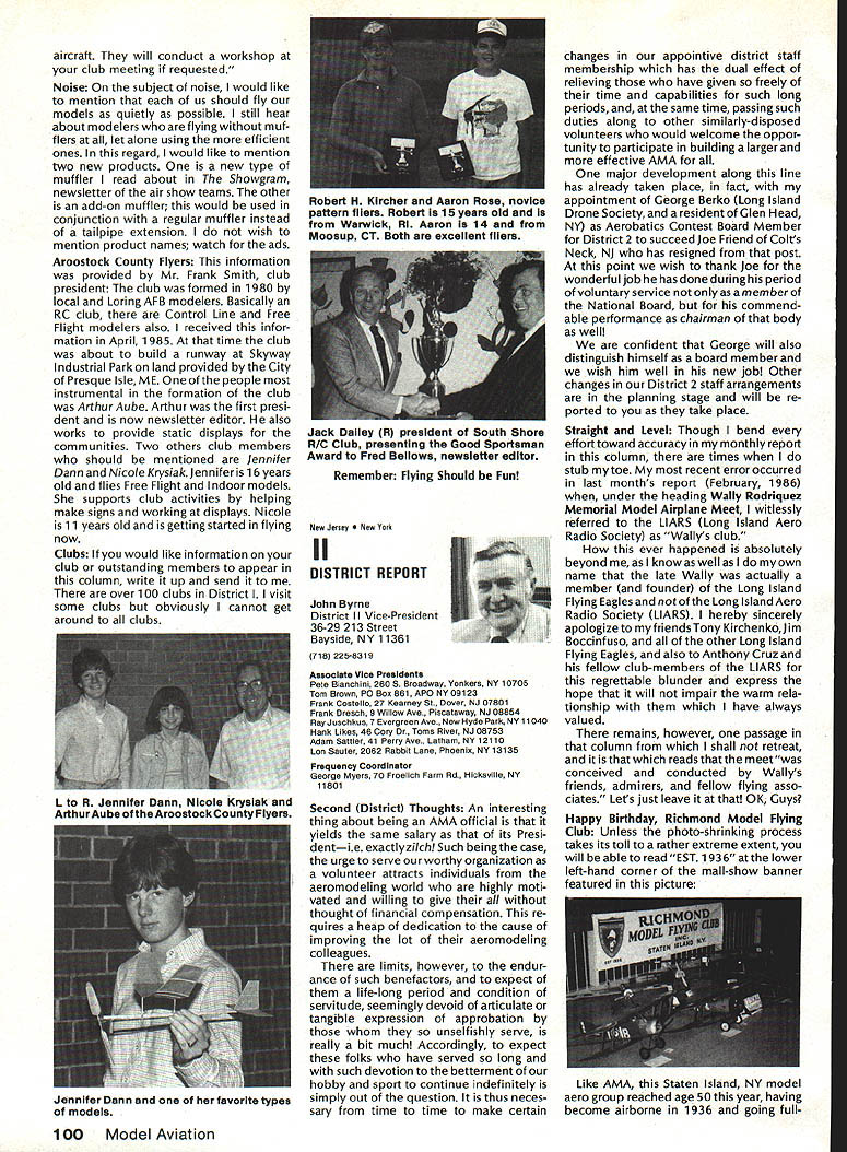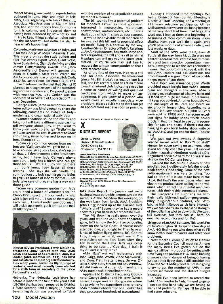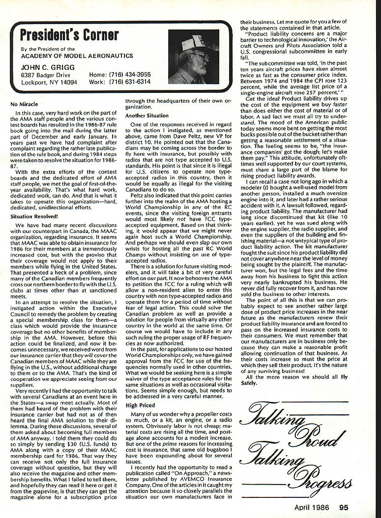 Model Aeronautics Howard Crispin Sound The heading may tend confuse rationale behind important time has come think resultant operating model engines sound level undesirable sure calling sound noise talk about equates blockbuster rock next door jack hammers tearing up sidewalk pile driver up block Fl 5 just flew overat 1000 feet afterburner need downplay term noise ever noise mentioned can almost certainly get instant response someone neighborhood Sound measurable value something can work going strive control level sound operate new column ModelAviation will serve asaforumforthe dissemination data information methods dealing sound its relation model avia tion community obtaining preservation flying sites prime im portance sport Without sites no clubs model aviation suffers fatally community AMA Committee Sound Studies new committee has formed pur pose coordinating efforts required get operating levels sound down can meet community federal regulations Federal regulations Yes have virtually ignored exist will take look future article As committee gets mov ing expected great deal material out somewhere will directed through channel providing unified front tackle prob lem begin has fair amount material sent possible application has Noise Com mittee place within Executive Coun cil several years committee did good work within scope study involved beginning reference being dealt area FAI instituted sound level F3A RC Aerobatics com petition measured meter engine ground full power maximum value 105 dBA Work done regardthe data collected two F3A Team selections readings taken Master/FAI aircraft two Nationalsdid answer questions requirement asked Attaining F3A level difficult though can readily meet standard little value us will look greater detail Outline Future Actions order ac complish reduction operating sound levels aft categories model air craft operation support entire spectrum aeromodeling community necessary serves no useful purpose Free Flight Control Line Helicopter Pylon Racing Giant Scalers Fun Fliers contend flying does contribute problem Manufacturers particular going responsive small segment sport fact af segments contribute overall problem flying site today may twenty miles nearest dwel ling doesnt guarantee next month development going up south end field will look input committee requests special interest groups SIGs get involved desirable SIC appoint dividual go-between handle flow information look out interests group Manufacturers vendors engines propellers mufflers tuned pipes other accessories need immediately completely involved program reduce sound level model aviation activities groups need responsive needs consumer restrictions being placed upon model flier final analysis will manufacturer will have provide us ma terials needed solve problems need have FAI reevaluate status sound measurement cur rently regulated FAI also needs expand its view beyond F3A look entire spectrum reality practical ly engines manufactured out side United States Giant Scale engines modified cases engines made outside country manufacturing nations probably have much problem will catch up eventually representatives ClAM need con sider action very seriously Community ordinances varied across country bottom line regarding sound quite uniform boils down what legally permissible neigh bors property line levels very low take good look level generate distances involved will find very quickly run problem four stroker does help because ordinances measure annoyance factoronly dBA level next article will look some ordinances also some Fedeal Government rules Guidelines will published showing perform sound survey particularflyingsite hints whatto information obtain will information published type equipment should use meet local requirements Items interest dividuals willing jump ahead modify own equipment will also published Information gleaned cor respondence will provided assist dealing local authorities Above else need assistance have anything re motely relates sound send off member committee AMA head quarters committee members Howard Crispin Chairman Ed McCol lough Vince Mankowski Dave Peltz Pete Waters Refer AMA News sec tion Model Aviation addresses AMA Scholarship Winners 1985 AMA Scholarship Committee has announced names 1985 winners scholarships total $10000 will divided between eight people selected committee Checks have already sent various colleges uni versities young people pursuing higher education goals Members Academy Scholarship Committee Bob Stalick Chairman Albany OR Cliff Telford Bethesda MD Bob Underwood Reston VA Betty Stream Long Beach CA general current AMA member eligible scholarContinued page 97 94 Model Aviation AMA HO Executive Director including reports AMA President Executive VP L Vice-Presidents ThisaSound AMA HO 5ERVICE5 STAFF 0 Executive Director John Worth 0 Executive Coordinator Joyce Hager 0 comptroller Gisele Jackson 0 CompetitIon Services Director Micheline Madison 0 Nets General Manager Vince Mankowski0 Special Services Director Carl Maroney0 Membership Director carol Merield 0 Special Events Director Douglas Pratt 0 Public Relations Director Geoff Styles 0 Technical Director Bob Underwood 0 Administrative Coordinator Bob VojalavekO Publications Director Carl R Wheeleyo General Counsel Jeremiah courtney Presidsnts Corner President ACADEMY OF MODEL AERONAUTICS JOHN C GRIGG 6387 Badger DriveHome 716 434-3955 Lockport NY 14094Work 716 631-6314 No Miracle case very hard work part AMA staff people various con test boards has resulted 1986-87 rule book going mail during latter part December early January years past have complaint after complaint regarding rather late publica tion rule book during 1984 steps taken resolve situation 198687 extra efforts contest boards dedicated effort AMA staff people met goal first-of-theyear availability Thats what hard work dedicated work can what takes operate organizationhard dedicated unidirectional efforts Situation Resolved have recent di