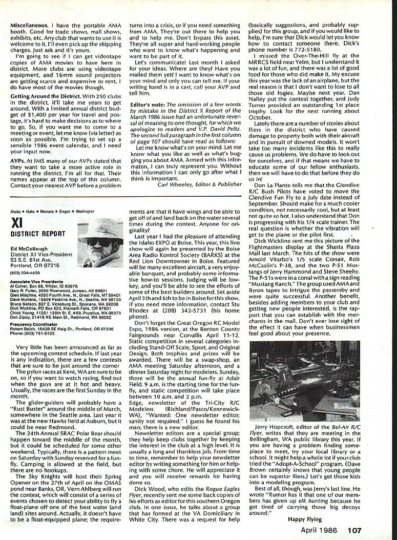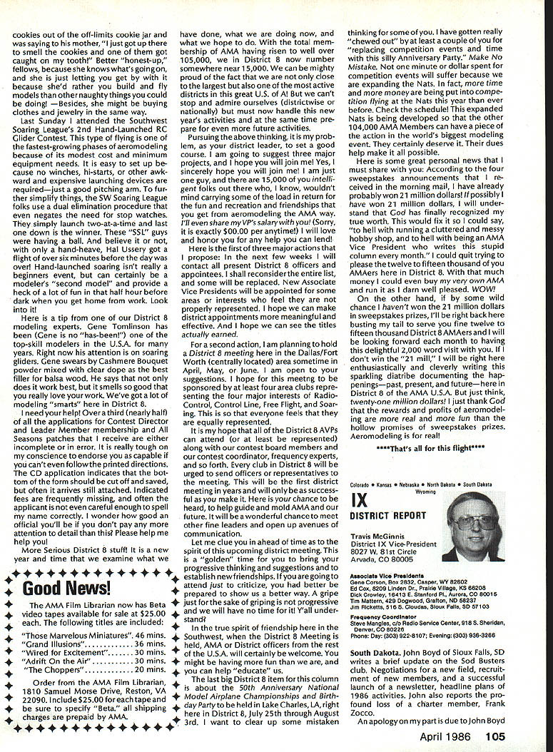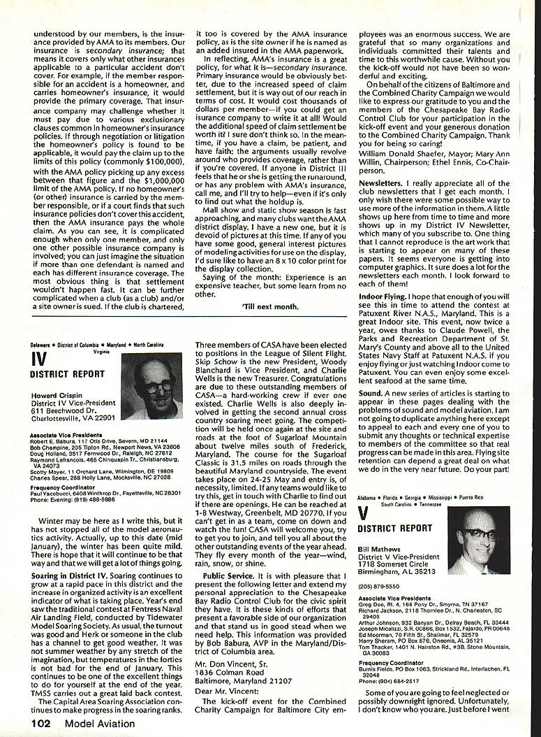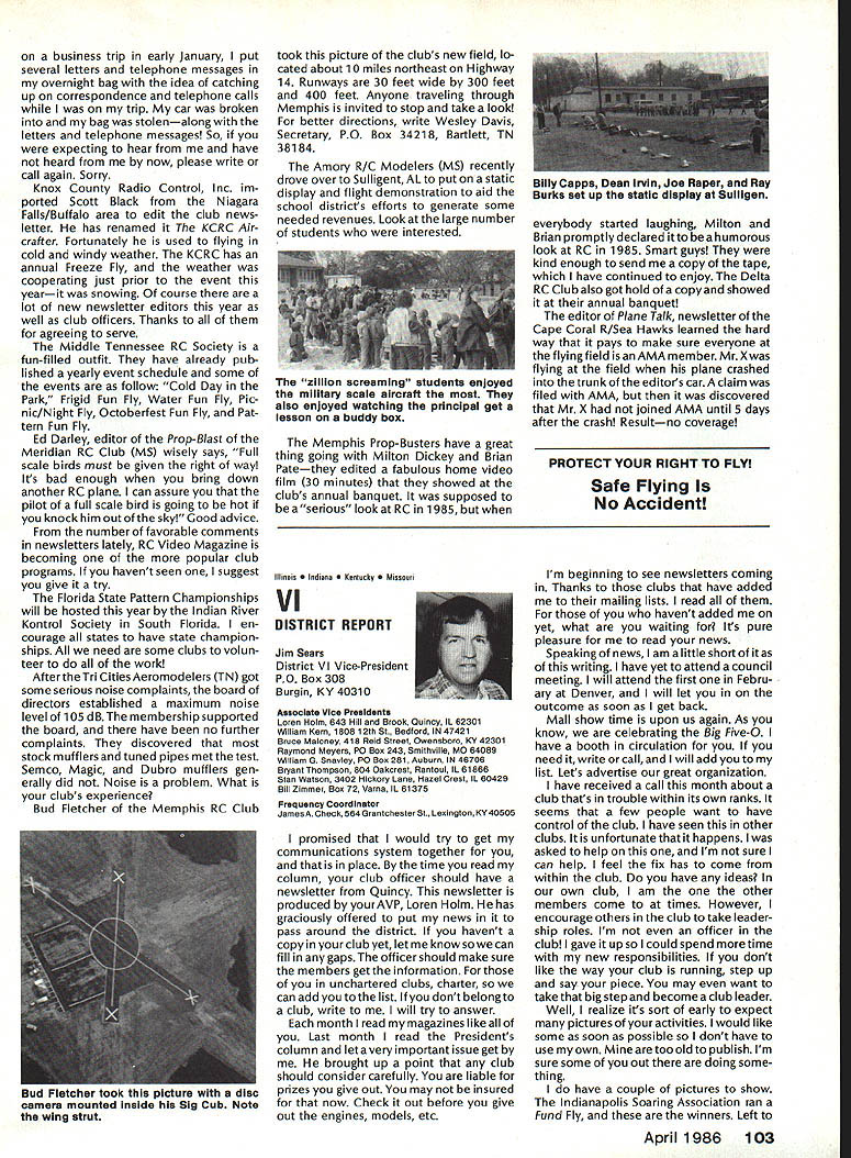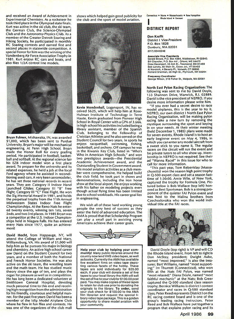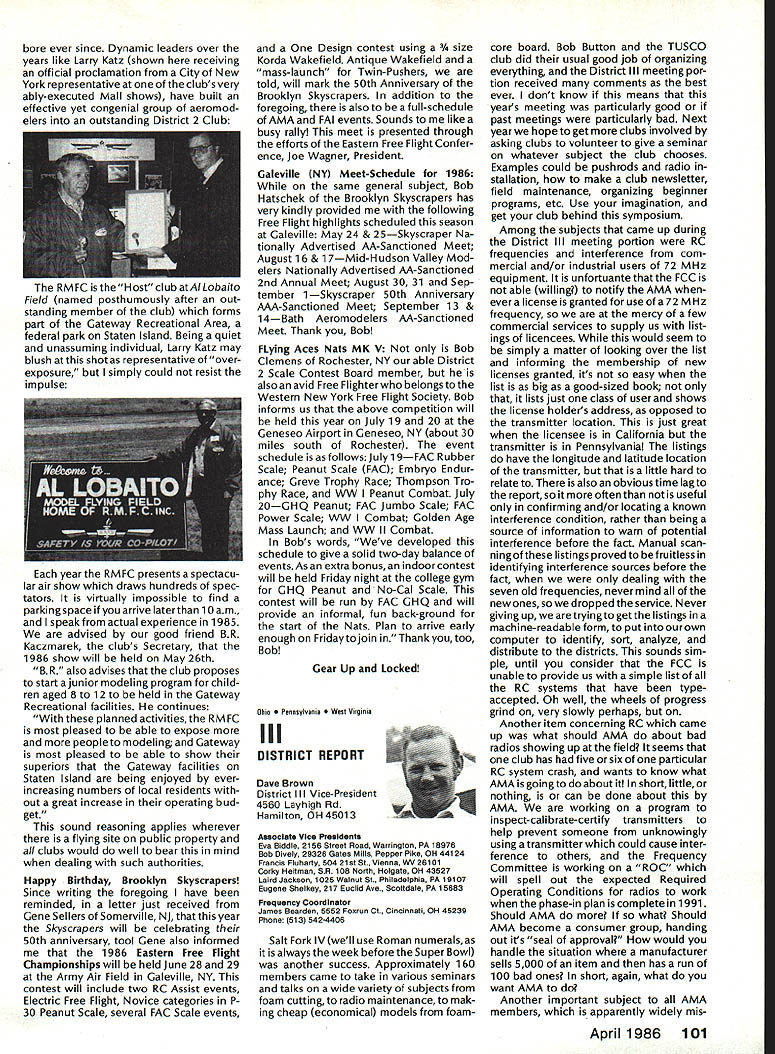 Model Aeronautics Howard Crispin Sound The heading may tend confuse rationale behind important time has come think resultant operating model engines sound level undesirable sure calling sound noise talk about equates blockbuster rock next door jack hammers tearing up sidewalk pile driver up block Fl 5 just flew overat 1000 feet afterburner need downplay term noise ever noise mentioned can almost certainly get instant response someone neighborhood Sound measurable value something can work going strive control level sound operate new column ModelAviation will serve asaforumforthe dissemination data information methods dealing sound its relation model avia tion community obtaining preservation flying sites prime im portance sport Without sites no clubs model aviation suffers fatally community AMA Committee Sound Studies new committee has formed pur pose coordinating efforts required get operating levels sound down can meet community federal regulations Federal regulations Yes have virtually ignored exist will take look future article As committee gets mov ing expected great deal material out somewhere will directed through channel providing unified front tackle prob lem begin has fair amount material sent possible application has Noise Com mittee place within Executive Coun cil several years committee did good work within scope study involved beginning reference being dealt area FAI instituted sound level F3A RC Aerobatics com petition measured meter engine ground full power maximum value 105 dBA Work done regardthe data collected two F3A Team selections readings taken Master/FAI aircraft two Nationalsdid answer questions requirement asked Attaining F3A level difficult though can readily meet standard little value us will look greater detail Outline Future Actions order ac complish reduction operating sound levels aft categories model air craft operation support entire spectrum aeromodeling community necessary serves no useful purpose Free Flight Control Line Helicopter Pylon Racing Giant Scalers Fun Fliers contend flying does contribute problem Manufacturers particular going responsive small segment sport fact af segments contribute overall problem flying site today may twenty miles nearest dwel ling doesnt guarantee next month development going up south end field will look input committee requests special interest groups SIGs get involved desirable SIC appoint dividual go-between handle flow information look out interests group Manufacturers vendors engines propellers mufflers tuned pipes other accessories need immediately completely involved program reduce sound level model aviation activities groups need responsive needs consumer restrictions being placed upon model flier final analysis will manufacturer will have provide us ma terials needed solve problems need have FAI reevaluate status sound measurement cur rently regulated FAI also needs expand its view beyond F3A look entire spectrum reality practical ly engines manufactured out side United States Giant Scale engines modified cases engines made outside country manufacturing nations probably have much problem will catch up eventually representatives ClAM need con sider action very seriously Community ordinances varied across country bottom line regarding sound quite uniform boils down what legally permissible neigh bors property line levels very low take good look level generate distances involved will find very quickly run problem four stroker does help because ordinances measure annoyance factoronly dBA level next article will look some ordinances also some Fedeal Government rules Guidelines will published showing perform sound survey particularflyingsite hints whatto information obtain will information published type equipment should use meet local requirements Items interest dividuals willing jump ahead modify own equipment will also published Information gleaned cor respondence will provided assist dealing local authorities Above else need assistance have anything re motely relates sound send off member committee AMA head quarters committee members Howard Crispin Chairman Ed McCol lough Vince Mankowski Dave Peltz Pete Waters Refer AMA News sec tion Model Aviation addresses AMA Scholarship Winners 1985 AMA Scholarship Committee has announced names 1985 winners scholarships total $10000 will divided between eight people selected committee Checks have already sent various colleges uni versities young people pursuing higher education goals Members Academy Scholarship Committee Bob Stalick Chairman Albany OR Cliff Telford Bethesda MD Bob Underwood Reston VA Betty Stream Long Beach CA general current AMA member eligible scholarContinued page 97 94 Model Aviation AMA HO Executive Director including reports AMA President Executive VP L Vice-Presidents ThisaSound AMA HO 5ERVICE5 STAFF 0 Executive Director John Worth 0 Executive Coordinator Joyce Hager 0 comptroller Gisele Jackson 0 CompetitIon Services Director Micheline Madison 0 Nets General Manager Vince Mankowski0 Special Services Director Carl Maroney0 Membership Director carol Merield 0 Special Events Director Douglas Pratt 0 Public Relations Director Geoff Styles 0 Technical Director Bob Underwood 0 Administrative Coordinator Bob VojalavekO Publications Director Carl R Wheeleyo General Counsel Jeremiah courtney Presidsnts Corner President ACADEMY OF MODEL AERONAUTICS JOHN C GRIGG 6387 Badger DriveHome 716 434-3955 Lockport NY 14094Work 716 631-6314 No Miracle case very hard work part AMA staff people various con test boards has resulted 1986-87 rule book going mail during latter part December early January years past have complaint after complaint regarding rather late publica tion rule book during 1984 steps taken resolve situation 198687 extra efforts contest boards dedicated effort AMA staff people met goal first-of-theyear availability Thats what hard work dedicated work can what takes operate organizationhard dedicated unidirectional efforts Situation Resolved have recent di