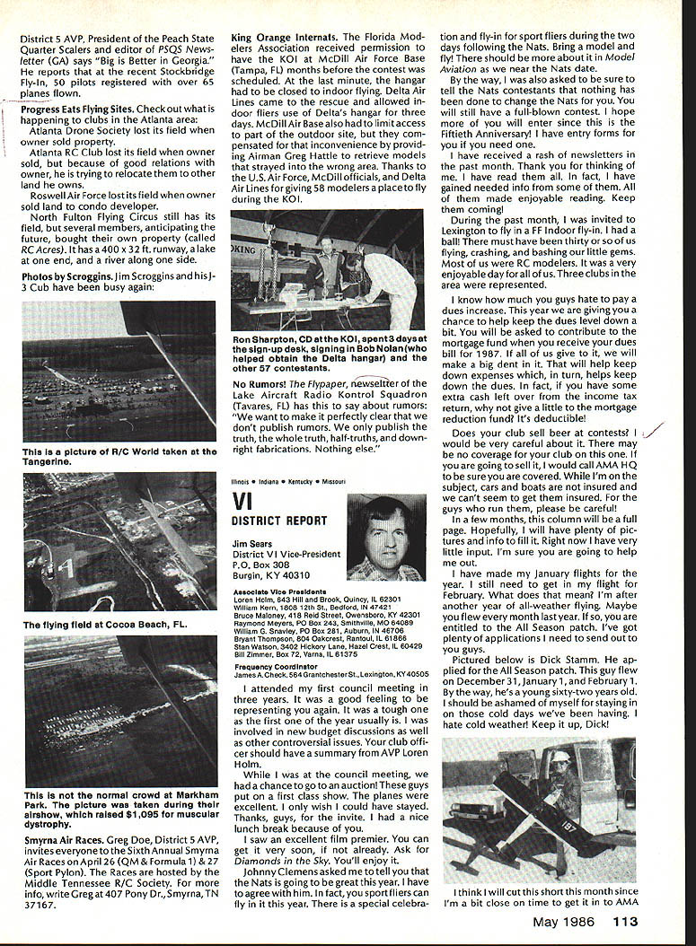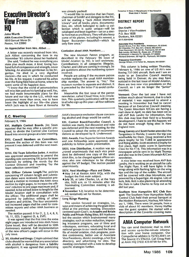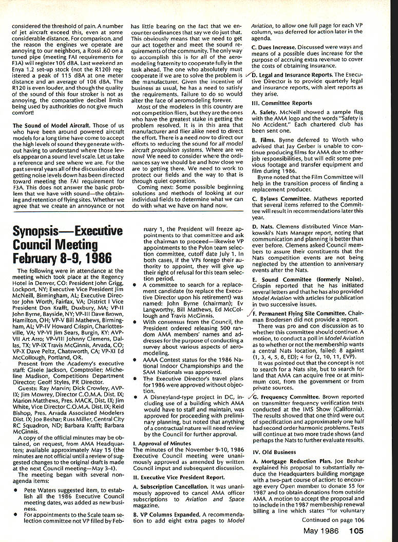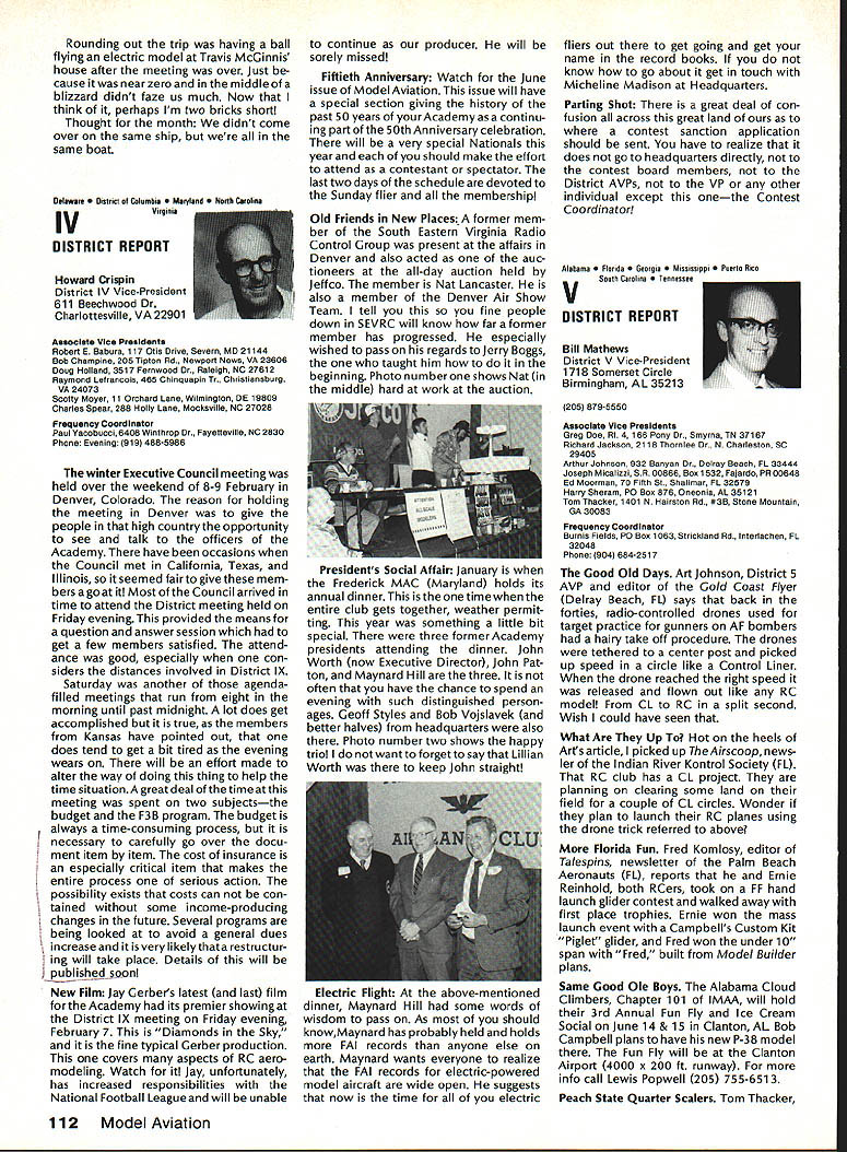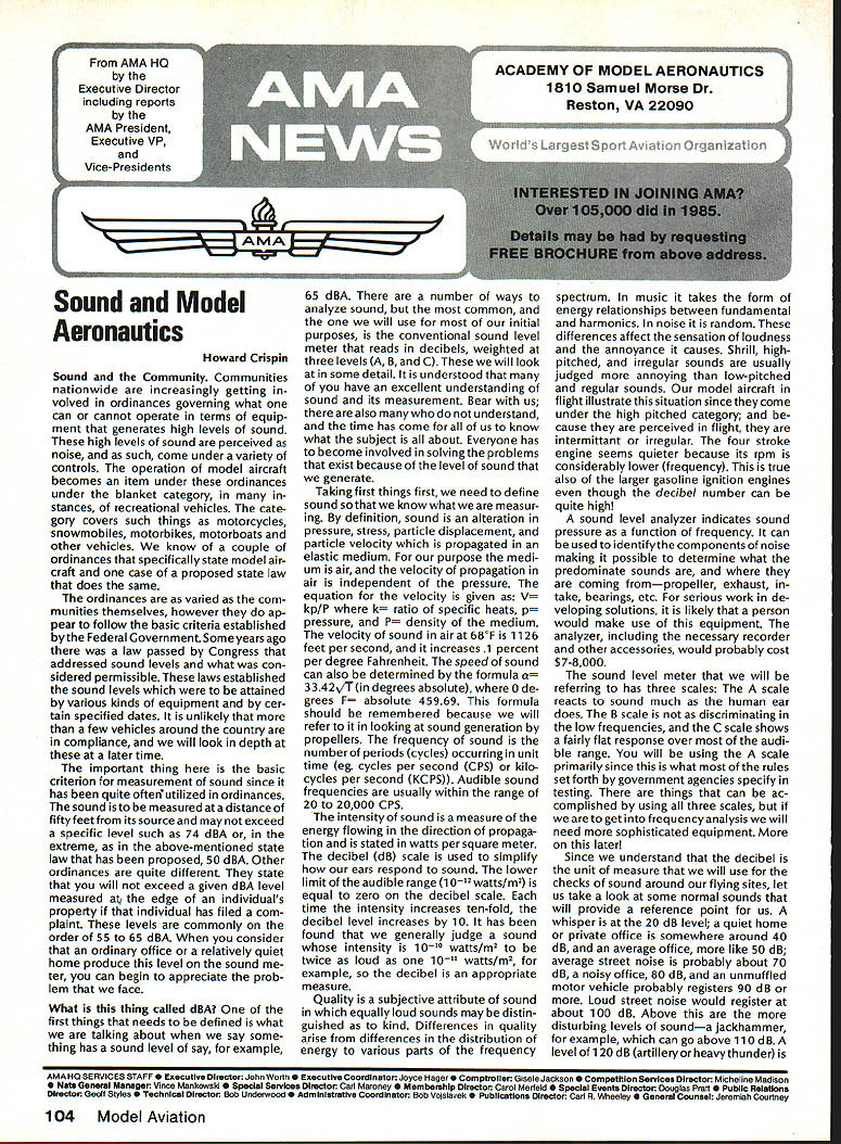 Sound Model Aeronautics Howard Crispin Sound Community Communities nationwide increasingly getting volved ordinances governing what can cannot operate terms equip ment generates high levels sound high levels sound perceived noise such come under variety controls operation model aircraft becomes item under ordinances under blanket category stances recreational vehicles cate gory covers such things motorcycles snowmobiles motorbikes motorboats other vehicles know couple ordinances specifically state model air craft case proposed state law does same ordinances varied com munities themselves however ap pear follow basic criteria established Federal Government Some years ago law passed Congress addressed sound levels what con sidered permissible laws established sound levels attained various kinds equipment cer tain specified dates unlikely few vehicles around country compliance will look depth later time important thing basic criterion measurement sound since has quite ofteri utilized ordinances sound measured distance fifty feet its source may exceed specific level such 74 dBA extreme above-mentioned state law has proposed 50 dBA Other ordinances quite different state will exceed given dBA level measured edge individuals property individual has filed com plaint levels commonly order 55 65 dBA consider ordinary office relatively quiet home produce level sound ter can begin appreciate prob lem face What thing called dRA first things needs defined what talking about say some thing has sound level say example 65 dBA number ways analyze sound common will use initial purposes conventional sound level meter reads decibels weighted three levels Band CThese will look some detail understood have excellent understanding sound its measurement Bear us also understand time has come us know what subject about Everyone has become involved solvingthe problems exist because level sound generate Taking first things first need define sound sothatwe knowwhatweare measur ing definition sound alteration pressure stress particle displacement particle velocity propagated elastic medium purpose medi um air velocity propagation air independent pressure equation velocity given V kp/P k ratio specific heats p pressure P density medium velocity sound air 680F 1126 feet per second increases 1 percent per degree Fahrenheit speed sound can also determined formula vTin degrees absolute 0 de grees F absolute 45969 formula should remembered because will refer looking sound generation propellers frequency sound number periods cycles occurring unit time eg cycles per second CPS kilocycles per second KCPS) Audible sound frequencies usually within range 20 20000 CPS intensity sound measure energy flowing direction propaga tion stated watts per square meter decibel dB scale used simplify ears respond sound lower limit audible range 1 Q12 watts/in2 equal zero decibel scale time intensity increases ten-fold decibel level increases 10 has found generally judge sound intensity 10 watts/in2 twice loud 10 watts/in2 example decibel appropriate measure Quality subjective attribute sound equally loud sounds may distin guished kind Differences quality arise differences distribution energy various parts frequency spectrum music takes form energy relationships between fundamental harmonics noise random differences affect sensation loudness annoyance causes Shrill highpitched irregular sounds usually judged annoying low-pitched regular sounds model aircraft flight illustrate situation since come under high pitched category cause perceived flight intermittant irregular four stroke engine seems quieter because its rpm considerably lower frequency true also larger gasoline ignition engines though decibel number can quite high sound level analyzer indicates sound pressure function frequency can used identifythe components noise making possible determine what predominate sounds coming frompropeller exhaust take bearings etc serious work de veloping solutions likely person would make use equipment analyzer including necessary recorder other accessories would probably cost $ 7-80 00 sound level meter will referring has three scales scale reacts sound much human ear does B scale discriminating low frequencies C scale shows fairly flat response over audi ble range will using scale primarily since what rules set forth government agencies specify testing things can ac complished using three scales get frequency analysis will need sophisticated equipment later Since understand decibel unit measure will use checks sound around flying sites let us take look some normal sounds will provide reference point us whisper 20 dB level quiet home private office somewhere around 40 dB average office like 50 dB average street noise probably about 70 dB noisy office 80 dB unmuffled motor vehicle probably registers 90 dB Loud street noise would register about 100 dB Above disturbing levels sounda jackhammer example can go above 110 dB level 120dB artilleryor heavythunder 104 Model Aviation AMA HO Executive Director including reports AMA President Executive VP Vice-Presidents AMA HO SERVICES STAFF 0 Executive Director John Worth 0 Executive Coordinator Joyce Hager 0 Comptroller Gisele Jackson 0 Competition Services Director Micheline Madison Nets General Msnager Vince Mankowski0 Special Services Director Carl Maroneye Membership Director Carol Mertelde Special Events Director Oouglas Pratt 0 Public Relations Director Geoff Styles 0 Technical Director Bob Underwood 0 Administrative Coordinator Bob Voislaveke Publications Director Carl 8 Wheeieyo General Counsel Jeremiah Courtney considered threshold pain number jet aircraft exceed some considerable distance comparison reason engines operate annoying neighbors Rossi 60 tuned pipe meeting FAI requirements F3A will register 105 dBA Last weekend Enya 12 set-up stock R120 reg istered peak 115 dBA meter distance average 108 dBA Ri 20 louder though quality sound four stroker annoying comparative decibel limits being used authori