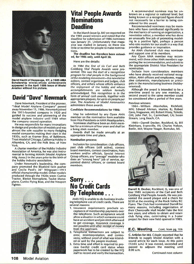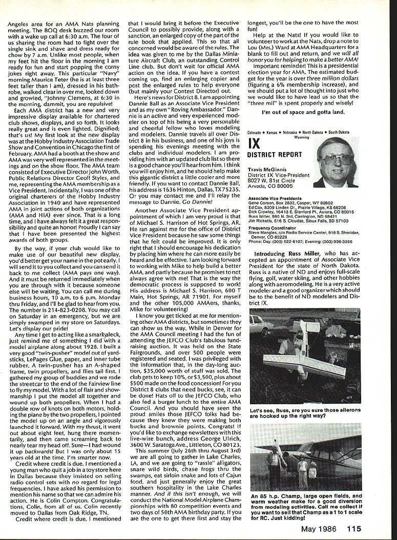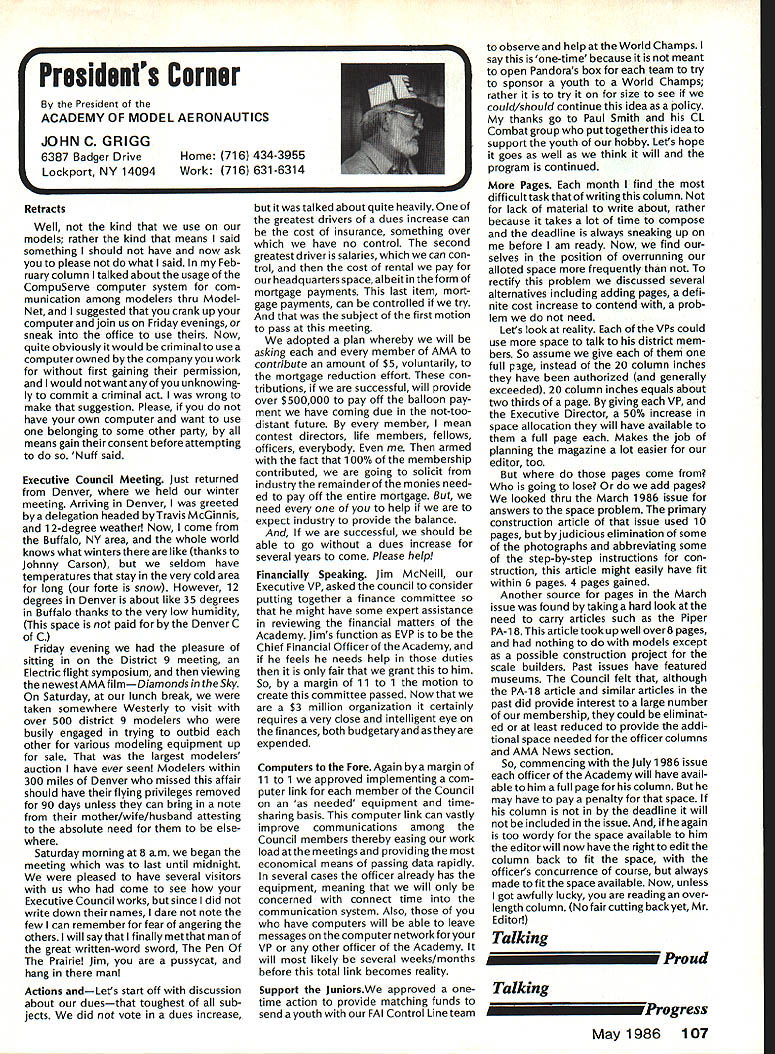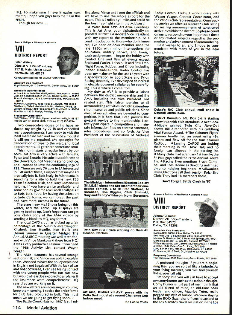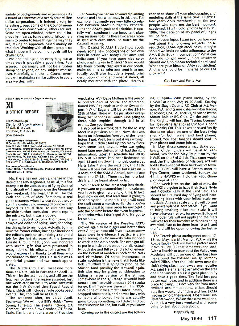 Sound Model Aeronautics Howard Crispin Sound Community Communities nationwide increasingly getting volved ordinances governing what can cannot operate terms equip ment generates high levels sound high levels sound perceived noise such come under variety controls operation model aircraft becomes item under ordinances under blanket category stances recreational vehicles cate gory covers such things motorcycles snowmobiles motorbikes motorboats other vehicles know couple ordinances specifically state model air craft case proposed state law does same ordinances varied com munities themselves however ap pear follow basic criteria established Federal Government Some years ago law passed Congress addressed sound levels what con sidered permissible laws established sound levels attained various kinds equipment cer tain specified dates unlikely few vehicles around country compliance will look depth later time important thing basic criterion measurement sound since has quite ofteri utilized ordinances sound measured distance fifty feet its source may exceed specific level such 74 dBA extreme above-mentioned state law has proposed 50 dBA Other ordinances quite different state will exceed given dBA level measured edge individuals property individual has filed com plaint levels commonly order 55 65 dBA consider ordinary office relatively quiet home produce level sound ter can begin appreciate prob lem face What thing called dRA first things needs defined what talking about say some thing has sound level say example 65 dBA number ways analyze sound common will use initial purposes conventional sound level meter reads decibels weighted three levels Band CThese will look some detail understood have excellent understanding sound its measurement Bear us also understand time has come us know what subject about Everyone has become involved solvingthe problems exist because level sound generate Taking first things first need define sound sothatwe knowwhatweare measur ing definition sound alteration pressure stress particle displacement particle velocity propagated elastic medium purpose medi um air velocity propagation air independent pressure equation velocity given V kp/P k ratio specific heats p pressure P density medium velocity sound air 680F 1126 feet per second increases 1 percent per degree Fahrenheit speed sound can also determined formula vTin degrees absolute 0 de grees F absolute 45969 formula should remembered because will refer looking sound generation propellers frequency sound number periods cycles occurring unit time eg cycles per second CPS kilocycles per second KCPS) Audible sound frequencies usually within range 20 20000 CPS intensity sound measure energy flowing direction propaga tion stated watts per square meter decibel dB scale used simplify ears respond sound lower limit audible range 1 Q12 watts/in2 equal zero decibel scale time intensity increases ten-fold decibel level increases 10 has found generally judge sound intensity 10 watts/in2 twice loud 10 watts/in2 example decibel appropriate measure Quality subjective attribute sound equally loud sounds may distin guished kind Differences quality arise differences distribution energy various parts frequency spectrum music takes form energy relationships between fundamental harmonics noise random differences affect sensation loudness annoyance causes Shrill highpitched irregular sounds usually judged annoying low-pitched regular sounds model aircraft flight illustrate situation since come under high pitched category cause perceived flight intermittant irregular four stroke engine seems quieter because its rpm considerably lower frequency true also larger gasoline ignition engines though decibel number can quite high sound level analyzer indicates sound pressure function frequency can used identifythe components noise making possible determine what predominate sounds coming frompropeller exhaust take bearings etc serious work de veloping solutions likely person would make use equipment analyzer including necessary recorder other accessories would probably cost $ 7-80 00 sound level meter will referring has three scales scale reacts sound much human ear does B scale discriminating low frequencies C scale shows fairly flat response over audi ble range will using scale primarily since what rules set forth government agencies specify testing things can ac complished using three scales get frequency analysis will need sophisticated equipment later Since understand decibel unit measure will use checks sound around flying sites let us take look some normal sounds will provide reference point us whisper 20 dB level quiet home private office somewhere around 40 dB average office like 50 dB average street noise probably about 70 dB noisy office 80 dB unmuffled motor vehicle probably registers 90 dB Loud street noise would register about 100 dB Above disturbing levels sounda jackhammer example can go above 110 dB level 120dB artilleryor heavythunder 104 Model Aviation AMA HO Executive Director including reports AMA President Executive VP Vice-Presidents AMA HO SERVICES STAFF 0 Executive Director John Worth 0 Executive Coordinator Joyce Hager 0 Comptroller Gisele Jackson 0 Competition Services Director Micheline Madison Nets General Msnager Vince Mankowski0 Special Services Director Carl Maroneye Membership Director Carol Mertelde Special Events Director Oouglas Pratt 0 Public Relations Director Geoff Styles 0 Technical Director Bob Underwood 0 Administrative Coordinator Bob Voislaveke Publications Director Carl 8 Wheeieyo General Counsel Jeremiah Courtney considered threshold pain number jet aircraft exceed some considerable distance comparison reason engines operate annoying neighbors Rossi 60 tuned pipe meeting FAI requirements F3A will register 105 dBA Last weekend Enya 12 set-up stock R120 reg istered peak 115 dBA meter distance average 108 dBA Ri 20 louder though quality sound four stroker annoying comparative decibel limits being used authori