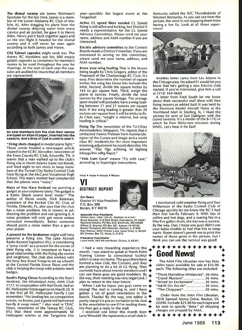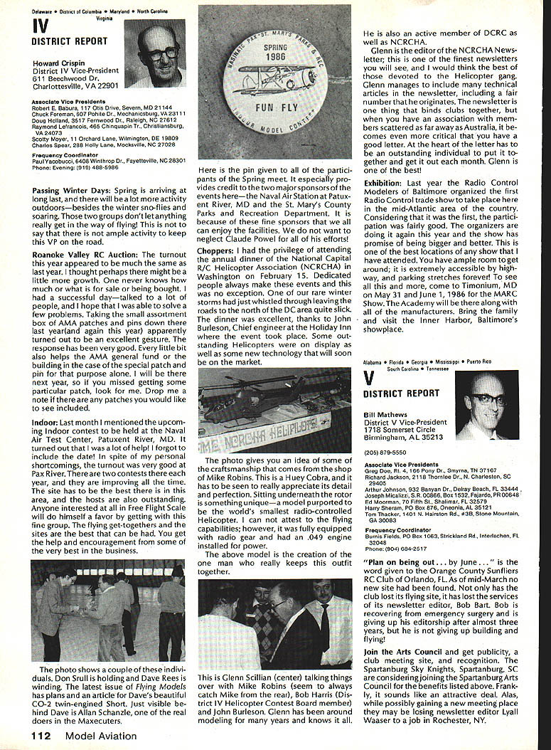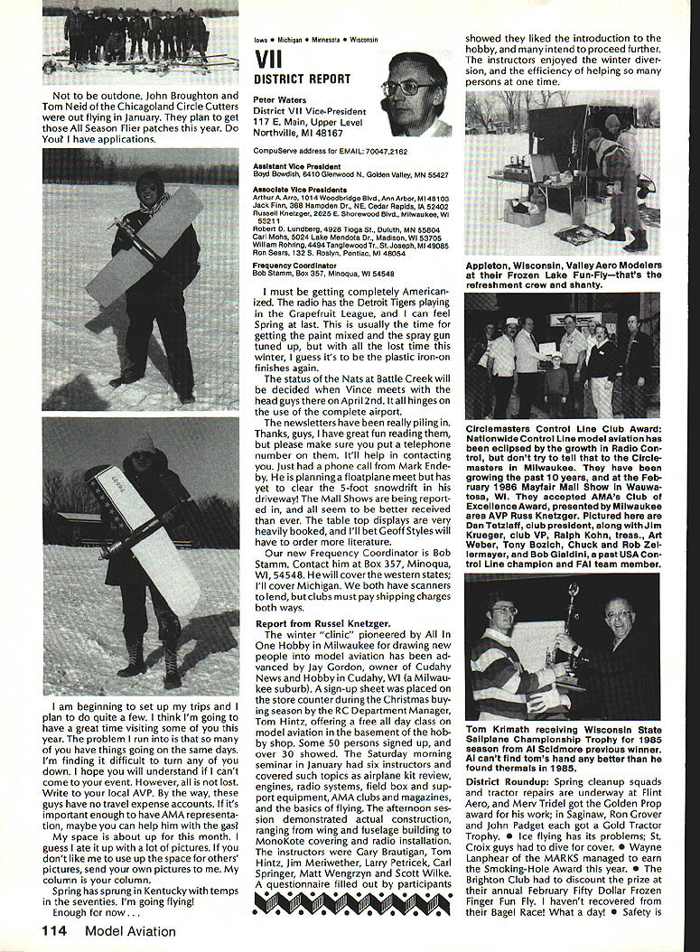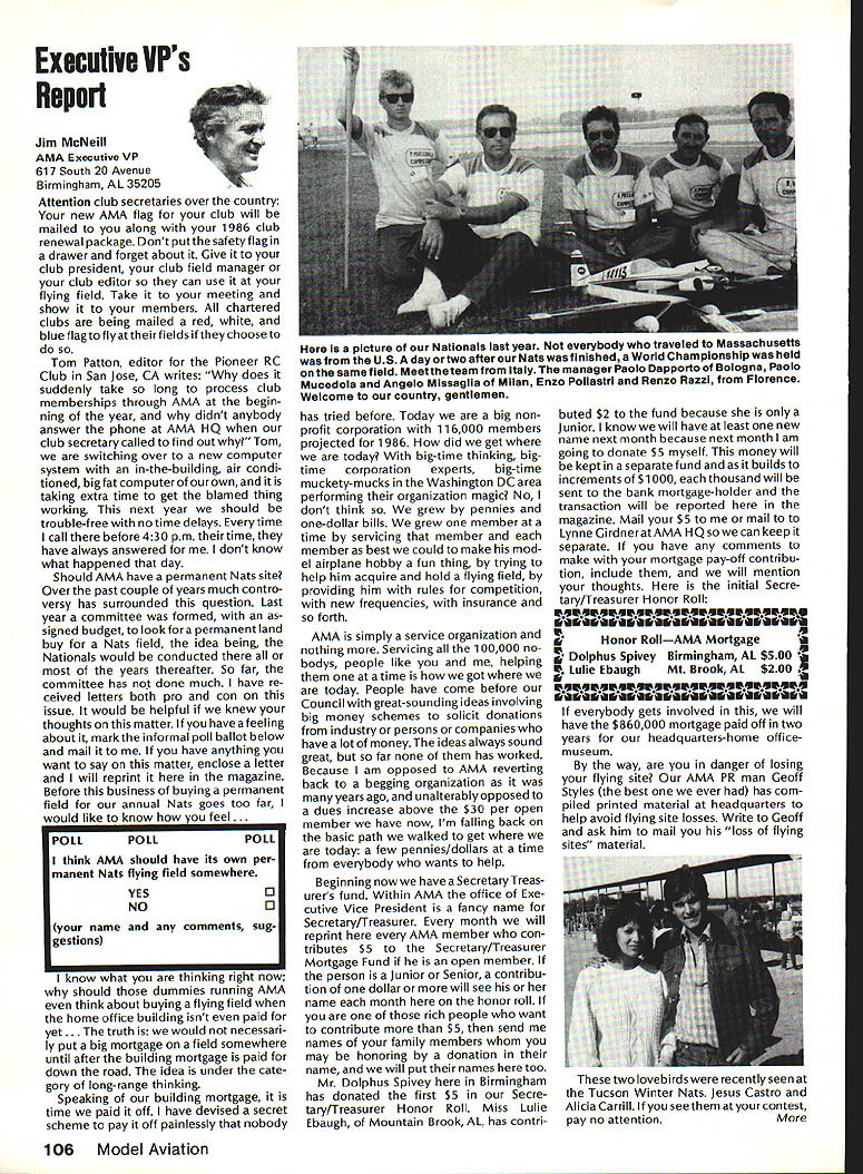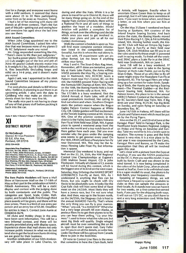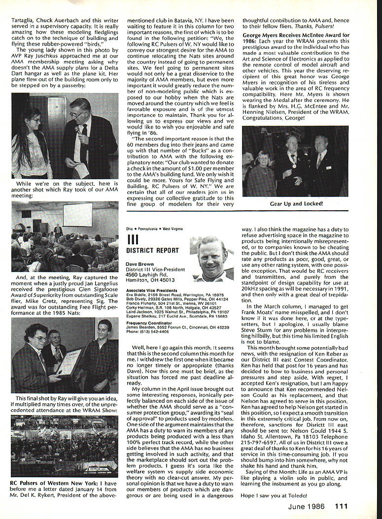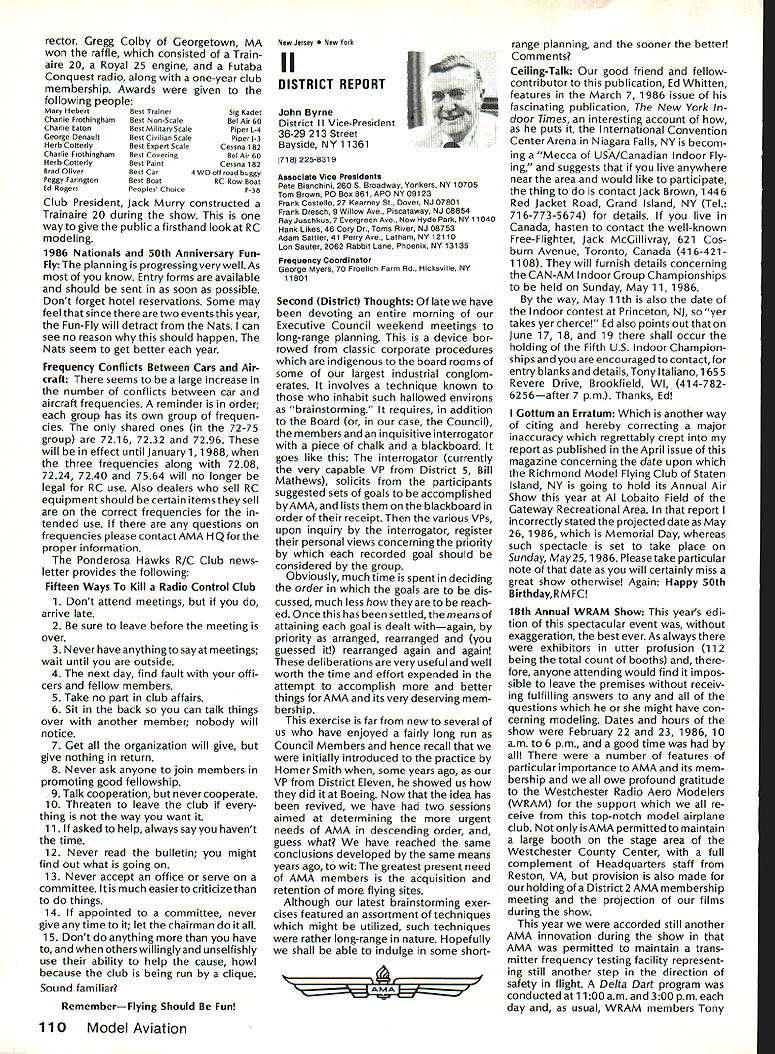 444 ,4 AMA HO Executive Director including reports bythe President utive VP Vice-Presidents 7 44 44 44 AMA Bylaws include various stand ing rules supplement Bylaws concerning details organization opera tion Among standing rules involving AMA Nominations Commit tee procedures making nomina tions AMA officers being elected year 1986 will electing AMA President Vice Presidents Districts 1 5 9 servc three-year terms begin ning 1986 procedures nomination will follow Nominating Committee 1 Composition 11 Vice Presidents Execu tive Vice-President sit Nomina ting Committee will constitute Committee total b Members Nominating Commit tee shall barred becoming nominees office themselves c Voting proxies permitted long proxy same district absent Vice President has permis sion writing vote An Open member designated absent EVP may act proxy EVP telegram absentee will suffice written permission d The President may appoint member Committee nor ex officio member neither may Executive Director member Committee 1 Chairman chairman Nominating Com mittee shall elected among committee members majority vote b The current AMA President absence Executive Director will call meeting order Once chairman Nominating Committee elected President ED will relinquish chair leave meeting 3 Recording Secretary Recording Secretary shall a keep full accurate detailed written minutes proceedings b assist Teller distribution collection tabulation ballots c submit President Executive Vice President meeting chairman Executive Director full written report meeting results voting procedures within 48 hours after adjournment 4 Meeting Conduct a The President ED shall open meeting preside committee members elect chairman b The newly-elected chairman shall dis miss President ED appoint Recording Secretary Teller Teller shall candidate office 5 Candidate Nominations nomination letters must received AMA Headquarters fifteen 15 days prior convening Nominating Committee Annual Meeting Furthermore letter acceptance bythe candidate must file AMA HQ prior meeting Because Nominating Committee scheduled meet July 25 deadline nomination receipt AMA HQ close business Thursday July 10 6 Selection Nominees a Limited three 3 upon ballot elective office b The assembly shall examine evaluate discuss written proposals candi dacy office see 5 nomination let ters shall read aloud Recording Secretary c The discussion period shall limited ten 10 minutes per candidate d An incumbent automatically placed ballot exceptthatavote by3/4of committee against may withhold cumbents name ballot see laws Article IX section 2 7 Voting a One vote per person per ballot b Oral voting shall district starting District progressing numerical ly ascending sequence through District Xl EVP desired voting secret ballots shall written c If placing incumbents name ballot question voting issue shall precede voting other nominees see 6d Voting placing nominees ballot shall follow sequence Presi dent Executive Vice President Vice Presi dents d When three names nom 8 Finalization Proceedings Recording Secretarys report see 3c shall submitted Vice Presidents EVP within 15 days meeting comments corrections approval report must approved 3/4 tendees meeting Vice Presidents EVP proxies 9 Adjournment An affirmative vote adjournment motion duly made seconded will ad journ meeting Sound Model Aeronautics Howard Crispin Reactions sound What does take arouse ire neighbors comes sound factors course basically reaction result complaints broadcast about community see reports newsletters elsewhere will happen Well does happen matters favorite flying site located Tomorrow could day someone builds off end runway complaints begin Just past week happened reading article Science 86 concerning increasing population world particular Kenya area under discussion population doubled past twenty years results ban use drums night rather primitive area world communities electricity telephones running water other con veniences accustomed Imagine no talking drums because disturb populace Sound level method generation can annoyance defense can gather lower Continued page 104 AMA HO sERvicEs STAFF 0 Executive Director John Worth 0 Executive Coordinator Joyce Hager 0 Comptroller Giaeie Jackson 0 Competition Services Director Micheilne Madison 0 Nats General Manager ymca Mankowaki 0 Special Services DImctor cart Maroney0 Memberahip DIrector caroi Merfeid 0 Special Event Director Dougias Pratt 0 Public Relations Director Geoff Styies 0 Technical Director Bob Underwood 0 Administrative Coordinator Bob voisiaveke Publications Director Osri R Wheeieye Generai Counsel Jeremiah courtney June1986 103 ACADEMY OF MODEL AERONAUTICS 1810 Samuel Morse Dr Reston VA 22090 444 444A 4 CV44 fl mated elimination will simple ma 1986 Nominatingjority vote e simple majority prevails See 6d Procedureexception f If three names submitted district national office chairman may move nomination acclamation AMAs Executive councli lequissient Board Directors basicaiiy composed President Executive vice President Executive Director 11 district vice Presidents officers provided space month AMA News pubilcation What say space however matterof personai viewpoint sole responsibiiity ot author views may may represent officisi position AMA Executive councli Sound Cont pg 103 level attempt bring within accept able limits question What standards Let us look couple typical localities bit guid ance need tQ go Community standards will vary general will fall within certain limits differences runs methods enforcement Given par ticular town rural district will have make determination dBa levels written code methods used locality measuring enforcing code mention made method reference type meter such concerned whetherthesound level istakenayard source fifty feet source corner complainants property responding complaint method determining compliance level sound property line measuring method need use ordertotackle possibilityof problems field would like quote couple s
