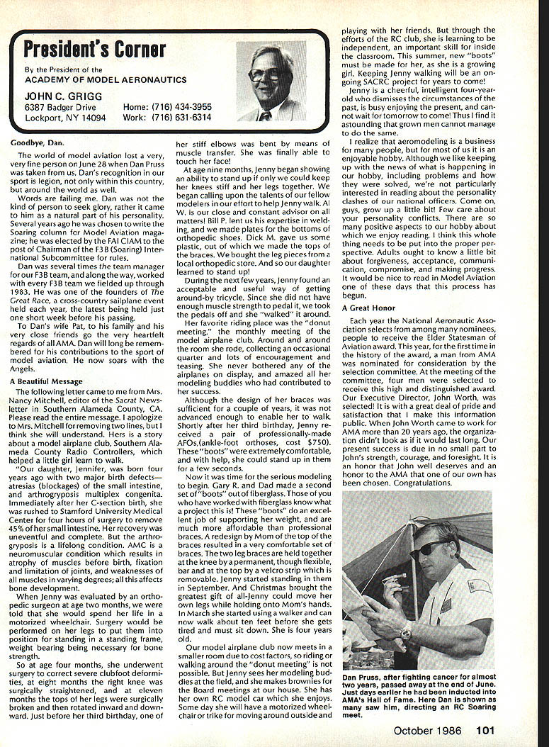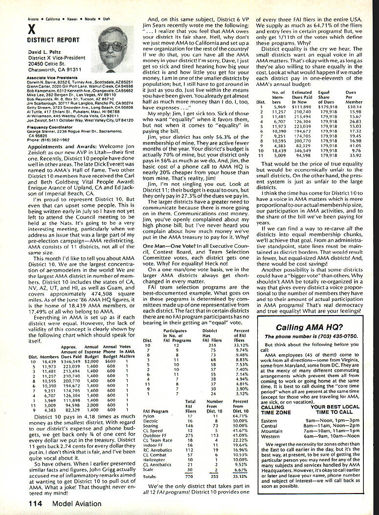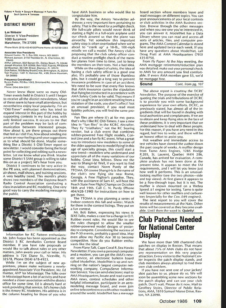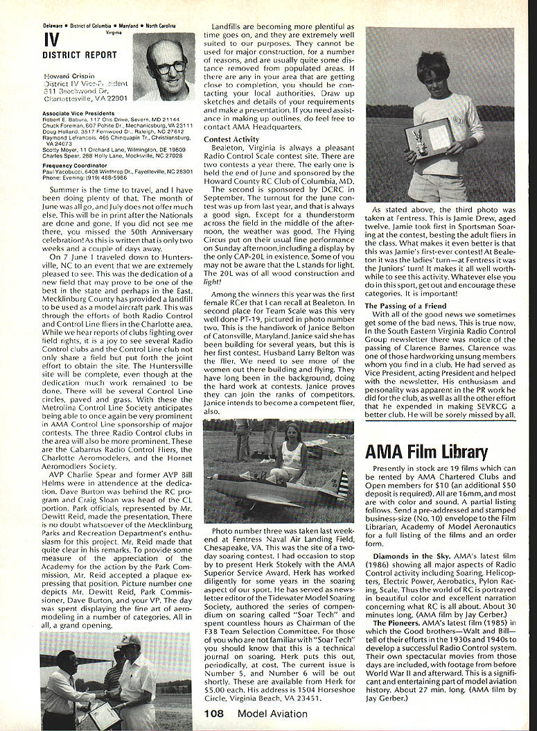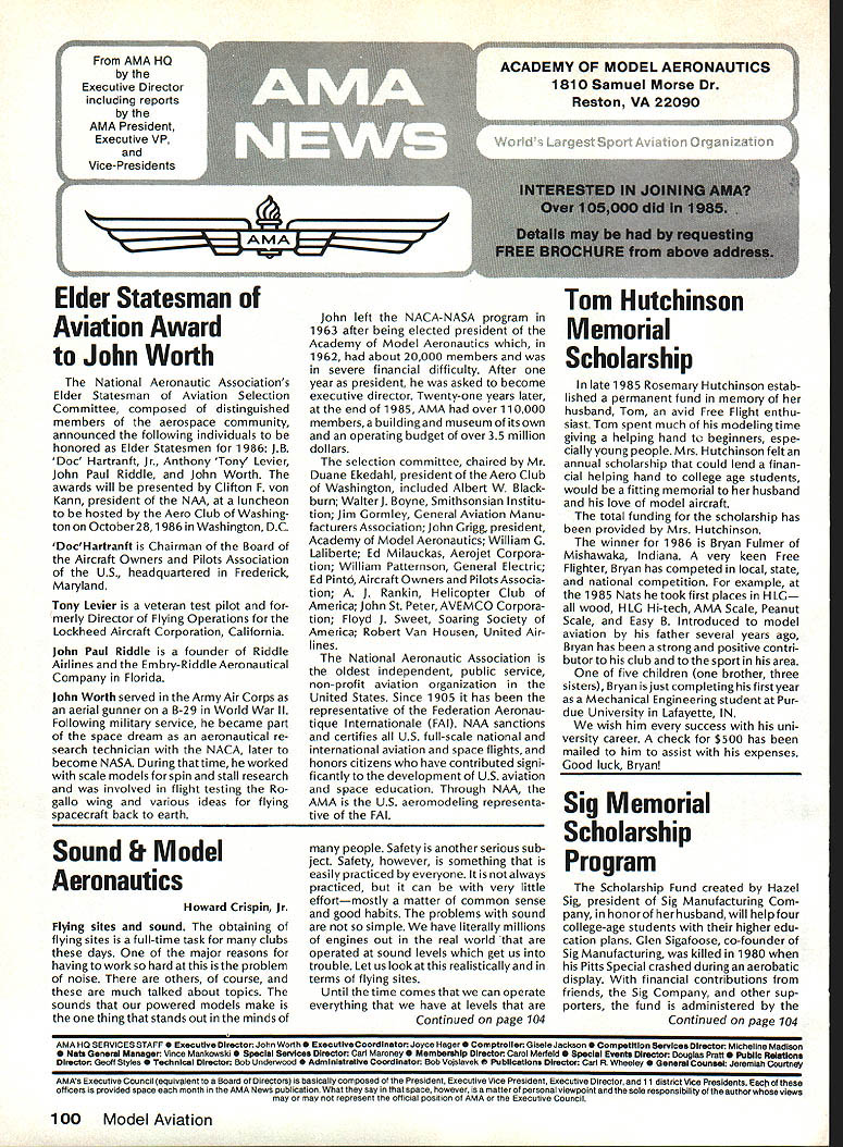 The National Aeronautic Associations Elder Statesman Aviation Selection Committee composed distinguished members aerospace community announced following individuals honored Elder Statesmen 1986 JB Doc Hartranft Jr Anthony Tony Levier John Paul Riddle John Worth awards will presented Clifton F von Kann president NM luncheon hosted Aero Club Washing ton October 281986 Washington DC DocHartranft Chairman Board Aircraft Owners Pilots Association US headquartered Frederick Maryland Tony Levier veteran test pilot merly Director Flying Operations Lockheed Aircraft Corporation California John Paul Riddle founder Riddle Airlines Embry-RiddleAeronautical Company Florida John Worth served Army Air Corps aerial gunner B-29 World War II Following military service became part space dream aeronautical re search technician NACA later become NASA Duringthattime worked scale models spin stall research involved flight testing Ro gallo wing various ideas flying spacecraft back earth Sound ft Model Aeronautics Howard Crispin Jr Flying sites sound obtaining flying sites full-time task clubs days major reasons having work hard problem noise others course much talked about topics sounds powered models make thing stands out minds John left NACA-NASA program 1963 after being elected president Academy Model Aeronautics 1962 about 20000 members severe financial difficulty After year president asked become executive director Twenty-one years later end 1985 AMA over 110000 membersabuildingand museum its own operating budget over 35 million dollars selection committee chaired Mr Duane Ekedahi president Aero Club Washington included Albert W Black burn WalterJ Boyne Smithsonsian Institu tion Jim Gormley General Aviation Manu facturers Association John Grigg president Academy Model Aeronautics William C Laliberte Ed Milauckas Aerojet Corpora tion William Patternson General Electric Ed Pinto Aircraft Owners PilotsAssocia tion J Rankin Helicopter Club America John St Peter AVEMCO Corpora tion Floyd J Sweet Soaring Society America Robert Van Housen United Air lines National Aeronautic Association oldest independent public service non-profit aviation organization United States Since 1905 has representative Federation Aeronau tique Internationale FAI NAA sanctions certifies US full-scale national international aviation space flights honors citizens have contributed signi ficantly development US aviation space education Through NM AMA US aeromodeling representa tive FAI people Safety another serious sub ject Safety however something easily practiced everyone always practiced can very little effortmostly matter common sense good habits problems sound simple have literally millions engines out real world operated sound levels get us trouble Let us look realistically terms flying sites Until time comes can operate everything have levels Continued page 104 late 1985 Rosemary H utchinson estab lished permanent fund memory husband Tom avid Free Flight enthu siast Tom spent much modeling time giving helping hand beginners espe cially young people Mrs H utchinson felt annual scholarship could lend finan cial helping hand college age students would fitting memorial husband love model aircraft total funding scholarship has provided Mrs Hutchinson winner 1986 Bryan Fulmer Mishawaka Indiana very keen Free Flighter Bryan has competed local state national competition example 1985 Nats took first places H LG wood HLG Hi-tech AMA Scale Peanut Scale Easy B Introduced model aviation father several years ago Bryan has strong positive contri butor club sport area five children brother three sisters Bryan isjust completing first year Mechanical Engineering student Pur due University Lafayette IN wish him success uni versity career check $500 has mailed him assist expenses Good luck Bryan Sig Memorial Scholarship Program Scholarship Fund created Hazel Sig president Sig Manufacturing Com pany honor husband will help four college-age students higher edu cation plans Glen Sigafoose co-founder Sig Manufacturing killed 1980 Pitts Special crashed during aerobatic display financial contributions friends Sig Company other sup porters fund administered Continued page 104 AMA HO SERVICES STAFF 0 Executive Director John Worth 0 Executive Coordinator Joyce Hager 0 Comptroller GiseleJackaon S Competition Services Director Micheline Maditan Nets General Menager Vince MankowakiS Special Services Director Carl Maroneye Membership Director Carol Merfeld 0 Special Events Director Douglas Pratt 0 Public Relations Director Geoff Styles S Technical Dlrector Bob underwood @ Administrative Coordinator Bob Voislavek 0 Publications Director Carl R WheeleyS General Counsel Jeremiah Courtn 100 Model Aviation AMA HQ Executive Director including reports AMA President Executive VP Vice-Presidents Elder Statesman ofTom Hutchinson Aviation AwardMemorial John WorthScholarship AMAs Executive Council lequivlent Board Directors basically composed President Executive Vice President Executive Director 11 district Vice Presidents officers provided space month AMA News publication What say space however isa matterot personal viewpoint sole responsibility author views may may represent official position AMA Executive Council rPre sidents Corner President ACADEMY OF MODEL AERONAUTICS JOHN C GRIGG 6387 Badger DriveHome 716 434-3955 Lockport NY 14094Work 716631-6314 Goodbye Dan world model aviation lost very very fine person June28 Dan Pruss taken us Dans recognition sport legion within country around world well Words failing Dan kind person seek glory rather came him natural part personality Several years ago chosen write Soaring column Model Aviation maga zine elected FAI ClAM post Chairman F3B Soaring Inter national Subcommittee rules Dan several times team manager F3 B team alongthe way worked F3 B team fielded up through 1983 founders Great Race cross-country sailplane event held year latest being held just short week before passing Dans wife Pat family very close friends go very heart