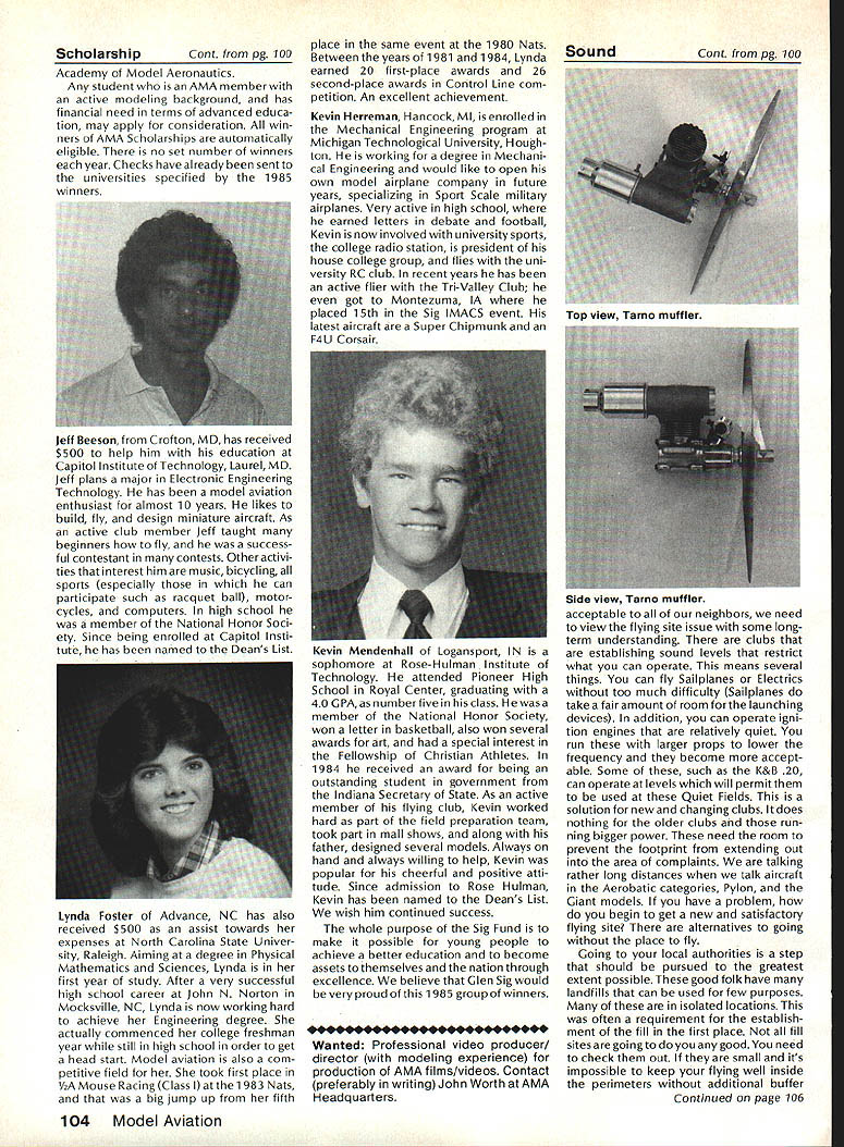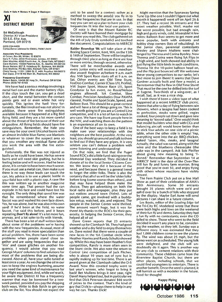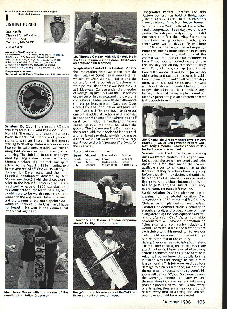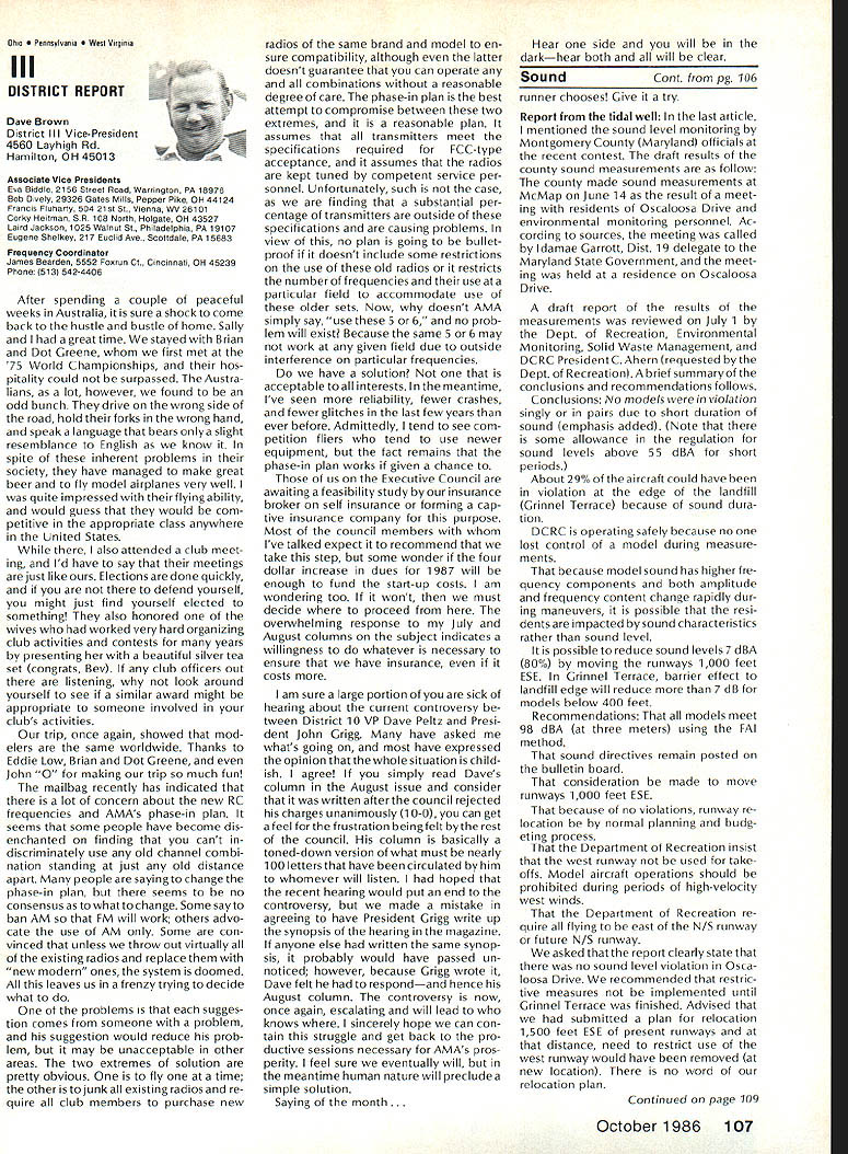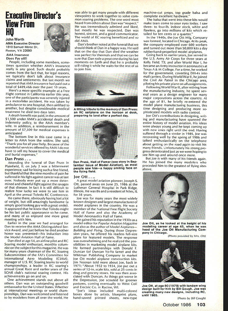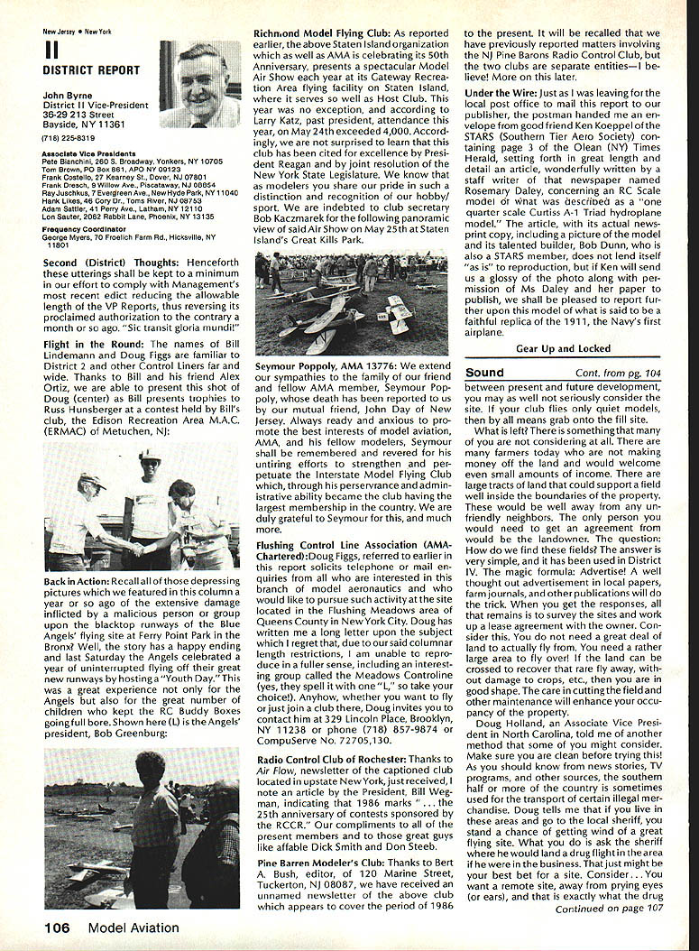 The National Aeronautic Associations Elder Statesman Aviation Selection Committee composed distinguished members aerospace community announced following individuals honored Elder Statesmen 1986 JB Doc Hartranft Jr Anthony Tony Levier John Paul Riddle John Worth awards will presented Clifton F von Kann president NM luncheon hosted Aero Club Washing ton October 281986 Washington DC DocHartranft Chairman Board Aircraft Owners Pilots Association US headquartered Frederick Maryland Tony Levier veteran test pilot merly Director Flying Operations Lockheed Aircraft Corporation California John Paul Riddle founder Riddle Airlines Embry-RiddleAeronautical Company Florida John Worth served Army Air Corps aerial gunner B-29 World War II Following military service became part space dream aeronautical re search technician NACA later become NASA Duringthattime worked scale models spin stall research involved flight testing Ro gallo wing various ideas flying spacecraft back earth Sound ft Model Aeronautics Howard Crispin Jr Flying sites sound obtaining flying sites full-time task clubs days major reasons having work hard problem noise others course much talked about topics sounds powered models make thing stands out minds John left NACA-NASA program 1963 after being elected president Academy Model Aeronautics 1962 about 20000 members severe financial difficulty After year president asked become executive director Twenty-one years later end 1985 AMA over 110000 membersabuildingand museum its own operating budget over 35 million dollars selection committee chaired Mr Duane Ekedahi president Aero Club Washington included Albert W Black burn WalterJ Boyne Smithsonsian Institu tion Jim Gormley General Aviation Manu facturers Association John Grigg president Academy Model Aeronautics William C Laliberte Ed Milauckas Aerojet Corpora tion William Patternson General Electric Ed Pinto Aircraft Owners PilotsAssocia tion J Rankin Helicopter Club America John St Peter AVEMCO Corpora tion Floyd J Sweet Soaring Society America Robert Van Housen United Air lines National Aeronautic Association oldest independent public service non-profit aviation organization United States Since 1905 has representative Federation Aeronau tique Internationale FAI NAA sanctions certifies US full-scale national international aviation space flights honors citizens have contributed signi ficantly development US aviation space education Through NM AMA US aeromodeling representa tive FAI people Safety another serious sub ject Safety however something easily practiced everyone always practiced can very little effortmostly matter common sense good habits problems sound simple have literally millions engines out real world operated sound levels get us trouble Let us look realistically terms flying sites Until time comes can operate everything have levels Continued page 104 late 1985 Rosemary H utchinson estab lished permanent fund memory husband Tom avid Free Flight enthu siast Tom spent much modeling time giving helping hand beginners espe cially young people Mrs H utchinson felt annual scholarship could lend finan cial helping hand college age students would fitting memorial husband love model aircraft total funding scholarship has provided Mrs Hutchinson winner 1986 Bryan Fulmer Mishawaka Indiana very keen Free Flighter Bryan has competed local state national competition example 1985 Nats took first places H LG wood HLG Hi-tech AMA Scale Peanut Scale Easy B Introduced model aviation father several years ago Bryan has strong positive contri butor club sport area five children brother three sisters Bryan isjust completing first year Mechanical Engineering student Pur due University Lafayette IN wish him success uni versity career check $500 has mailed him assist expenses Good luck Bryan Sig Memorial Scholarship Program Scholarship Fund created Hazel Sig president Sig Manufacturing Com pany honor husband will help four college-age students higher edu cation plans Glen Sigafoose co-founder Sig Manufacturing killed 1980 Pitts Special crashed during aerobatic display financial contributions friends Sig Company other sup porters fund administered Continued page 104 AMA HO SERVICES STAFF 0 Executive Director John Worth 0 Executive Coordinator Joyce Hager 0 Comptroller GiseleJackaon S Competition Services Director Micheline Maditan Nets General Menager Vince MankowakiS Special Services Director Carl Maroneye Membership Director Carol Merfeld 0 Special Events Director Douglas Pratt 0 Public Relations Director Geoff Styles S Technical Dlrector Bob underwood @ Administrative Coordinator Bob Voislavek 0 Publications Director Carl R WheeleyS General Counsel Jeremiah Courtn 100 Model Aviation AMA HQ Executive Director including reports AMA President Executive VP Vice-Presidents Elder Statesman ofTom Hutchinson Aviation AwardMemorial John WorthScholarship AMAs Executive Council lequivlent Board Directors basically composed President Executive Vice President Executive Director 11 district Vice Presidents officers provided space month AMA News publication What say space however isa matterot personal viewpoint sole responsibility author views may may represent official position AMA Executive Council rPre sidents Corner President ACADEMY OF MODEL AERONAUTICS JOHN C GRIGG 6387 Badger DriveHome 716 434-3955 Lockport NY 14094Work 716631-6314 Goodbye Dan world model aviation lost very very fine person June28 Dan Pruss taken us Dans recognition sport legion within country around world well Words failing Dan kind person seek glory rather came him natural part personality Several years ago chosen write Soaring column Model Aviation maga zine elected FAI ClAM post Chairman F3B Soaring Inter national Subcommittee rules Dan several times team manager F3 B team alongthe way worked F3 B team fielded up through 1983 founders Great Race cross-country sailplane event held year latest being held just short week before passing Dans wife Pat family very close friends go very heart