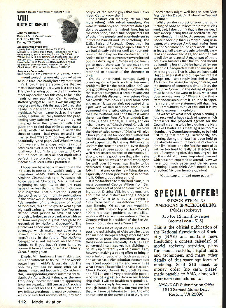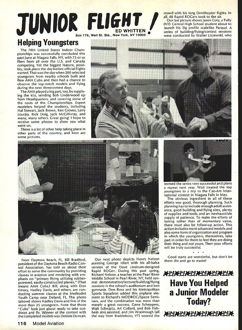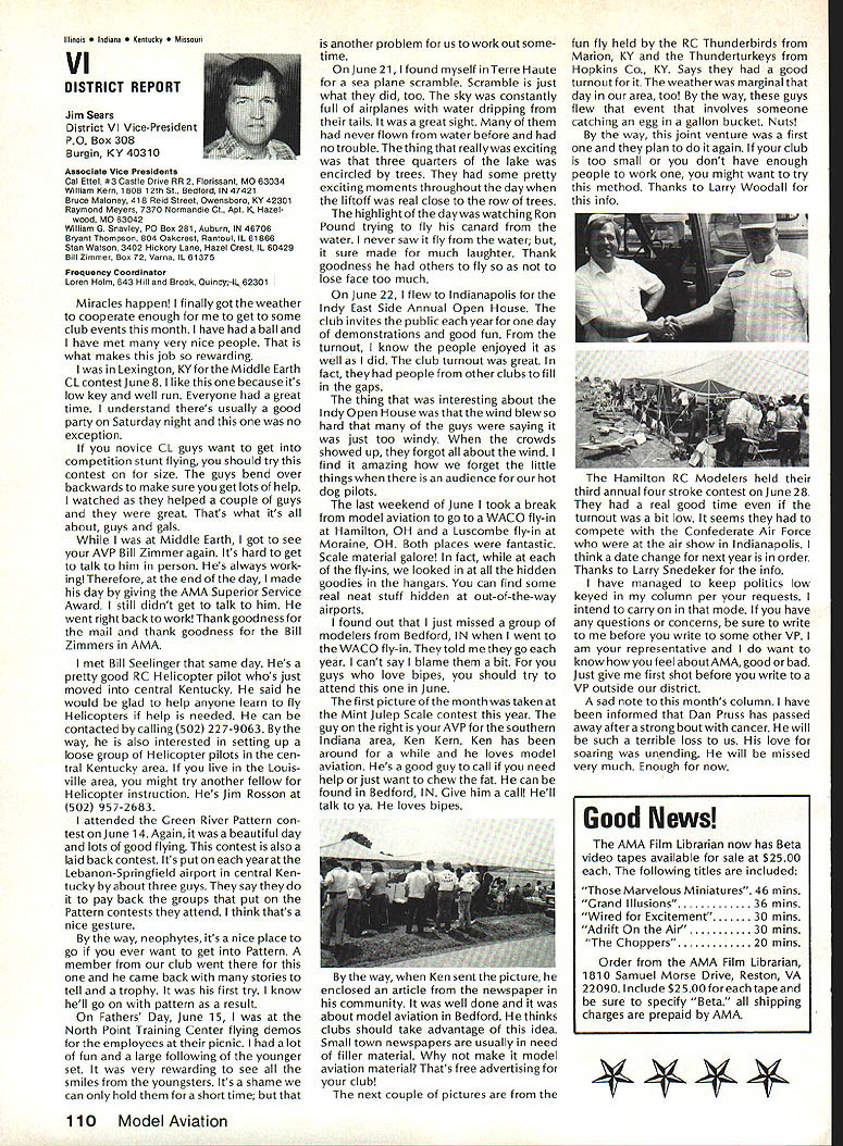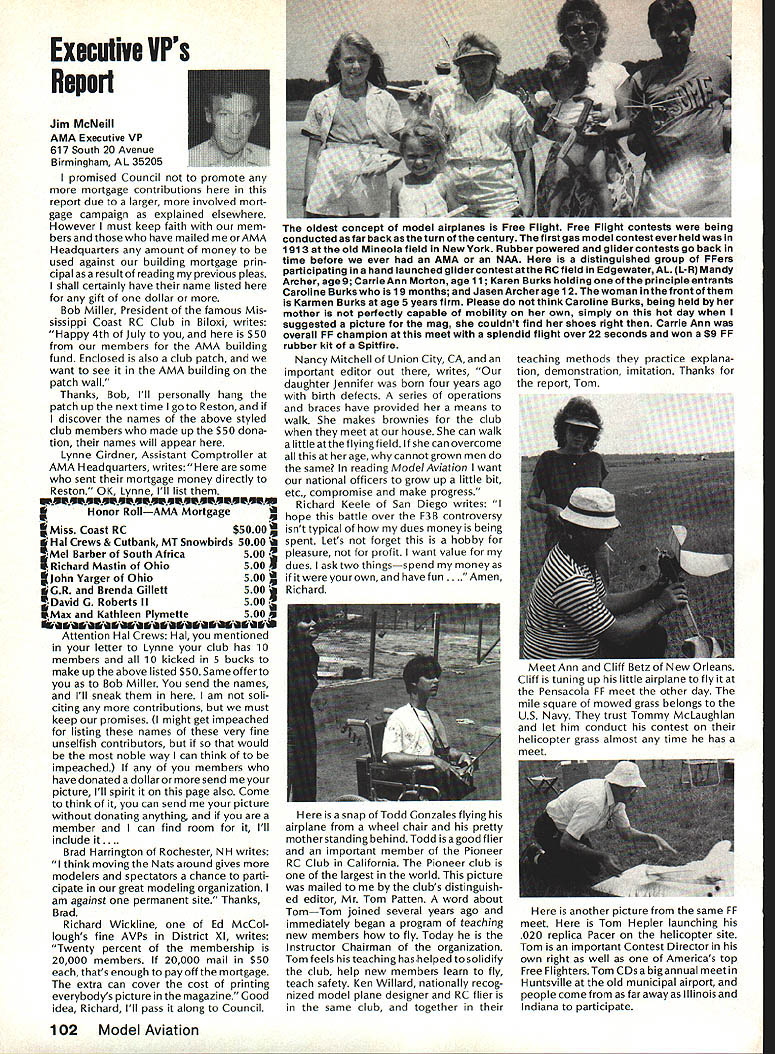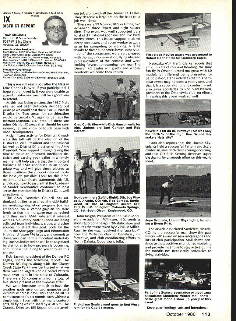 The National Aeronautic Associations Elder Statesman Aviation Selection Committee composed distinguished members aerospace community announced following individuals honored Elder Statesmen 1986 JB Doc Hartranft Jr Anthony Tony Levier John Paul Riddle John Worth awards will presented Clifton F von Kann president NM luncheon hosted Aero Club Washing ton October 281986 Washington DC DocHartranft Chairman Board Aircraft Owners Pilots Association US headquartered Frederick Maryland Tony Levier veteran test pilot merly Director Flying Operations Lockheed Aircraft Corporation California John Paul Riddle founder Riddle Airlines Embry-RiddleAeronautical Company Florida John Worth served Army Air Corps aerial gunner B-29 World War II Following military service became part space dream aeronautical re search technician NACA later become NASA Duringthattime worked scale models spin stall research involved flight testing Ro gallo wing various ideas flying spacecraft back earth Sound ft Model Aeronautics Howard Crispin Jr Flying sites sound obtaining flying sites full-time task clubs days major reasons having work hard problem noise others course much talked about topics sounds powered models make thing stands out minds John left NACA-NASA program 1963 after being elected president Academy Model Aeronautics 1962 about 20000 members severe financial difficulty After year president asked become executive director Twenty-one years later end 1985 AMA over 110000 membersabuildingand museum its own operating budget over 35 million dollars selection committee chaired Mr Duane Ekedahi president Aero Club Washington included Albert W Black burn WalterJ Boyne Smithsonsian Institu tion Jim Gormley General Aviation Manu facturers Association John Grigg president Academy Model Aeronautics William C Laliberte Ed Milauckas Aerojet Corpora tion William Patternson General Electric Ed Pinto Aircraft Owners PilotsAssocia tion J Rankin Helicopter Club America John St Peter AVEMCO Corpora tion Floyd J Sweet Soaring Society America Robert Van Housen United Air lines National Aeronautic Association oldest independent public service non-profit aviation organization United States Since 1905 has representative Federation Aeronau tique Internationale FAI NAA sanctions certifies US full-scale national international aviation space flights honors citizens have contributed signi ficantly development US aviation space education Through NM AMA US aeromodeling representa tive FAI people Safety another serious sub ject Safety however something easily practiced everyone always practiced can very little effortmostly matter common sense good habits problems sound simple have literally millions engines out real world operated sound levels get us trouble Let us look realistically terms flying sites Until time comes can operate everything have levels Continued page 104 late 1985 Rosemary H utchinson estab lished permanent fund memory husband Tom avid Free Flight enthu siast Tom spent much modeling time giving helping hand beginners espe cially young people Mrs H utchinson felt annual scholarship could lend finan cial helping hand college age students would fitting memorial husband love model aircraft total funding scholarship has provided Mrs Hutchinson winner 1986 Bryan Fulmer Mishawaka Indiana very keen Free Flighter Bryan has competed local state national competition example 1985 Nats took first places H LG wood HLG Hi-tech AMA Scale Peanut Scale Easy B Introduced model aviation father several years ago Bryan has strong positive contri butor club sport area five children brother three sisters Bryan isjust completing first year Mechanical Engineering student Pur due University Lafayette IN wish him success uni versity career check $500 has mailed him assist expenses Good luck Bryan Sig Memorial Scholarship Program Scholarship Fund created Hazel Sig president Sig Manufacturing Com pany honor husband will help four college-age students higher edu cation plans Glen Sigafoose co-founder Sig Manufacturing killed 1980 Pitts Special crashed during aerobatic display financial contributions friends Sig Company other sup porters fund administered Continued page 104 AMA HO SERVICES STAFF 0 Executive Director John Worth 0 Executive Coordinator Joyce Hager 0 Comptroller GiseleJackaon S Competition Services Director Micheline Maditan Nets General Menager Vince MankowakiS Special Services Director Carl Maroneye Membership Director Carol Merfeld 0 Special Events Director Douglas Pratt 0 Public Relations Director Geoff Styles S Technical Dlrector Bob underwood @ Administrative Coordinator Bob Voislavek 0 Publications Director Carl R WheeleyS General Counsel Jeremiah Courtn 100 Model Aviation AMA HQ Executive Director including reports AMA President Executive VP Vice-Presidents Elder Statesman ofTom Hutchinson Aviation AwardMemorial John WorthScholarship AMAs Executive Council lequivlent Board Directors basically composed President Executive Vice President Executive Director 11 district Vice Presidents officers provided space month AMA News publication What say space however isa matterot personal viewpoint sole responsibility author views may may represent official position AMA Executive Council rPre sidents Corner President ACADEMY OF MODEL AERONAUTICS JOHN C GRIGG 6387 Badger DriveHome 716 434-3955 Lockport NY 14094Work 716631-6314 Goodbye Dan world model aviation lost very very fine person June28 Dan Pruss taken us Dans recognition sport legion within country around world well Words failing Dan kind person seek glory rather came him natural part personality Several years ago chosen write Soaring column Model Aviation maga zine elected FAI ClAM post Chairman F3B Soaring Inter national Subcommittee rules Dan several times team manager F3 B team alongthe way worked F3 B team fielded up through 1983 founders Great Race cross-country sailplane event held year latest being held just short week before passing Dans wife Pat family very close friends go very heart