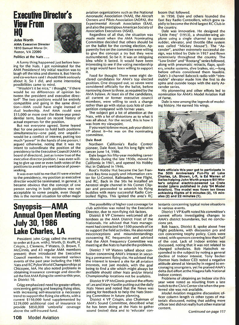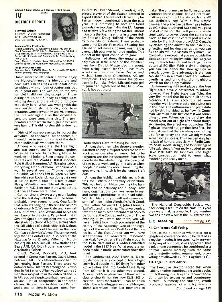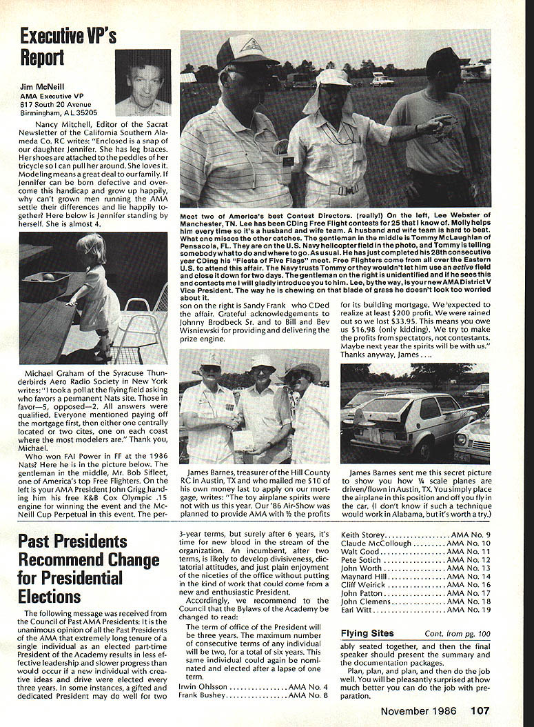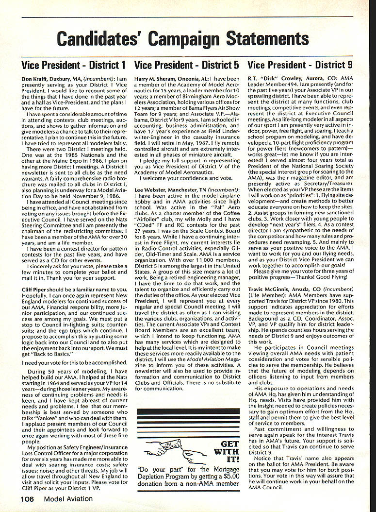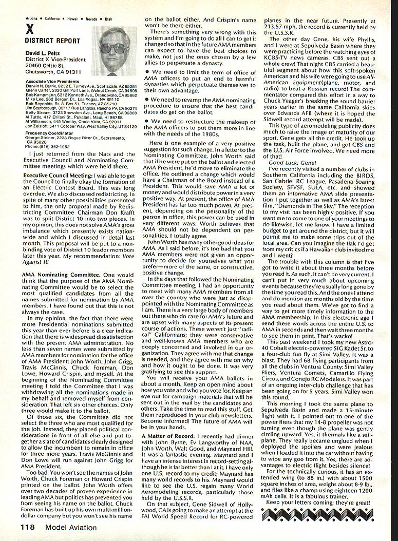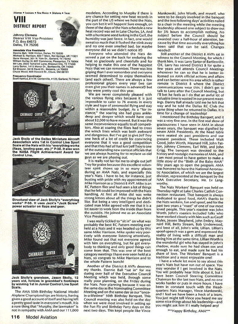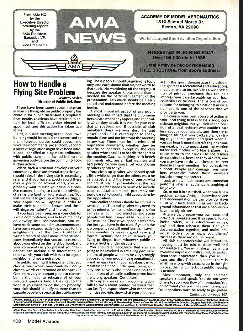 r Handle Flying Site Problem Geoffrey Styles Director Public Relations have some recent instances flying site public property has come public discussion Complaints nearby residents have resulted ac tion local officials either elected appointed action has taken two forms First public meeting local town building would called advertised interested parties could appear voice comments pro con Second piece legislation might have intro duced identified bylaw ordinance public comments invited before governing body before community took further action such situation develops community several steps should take flying site essentially safe have good record over period several years will probably want state case posi tive manner hoping retain privilege using land future activities will want give up struggle opposition will appear order make complaints known will hinge safety noise have preparing club such confrontation believe develop confrontations will have made some sound measurements have some records ready produce enlightenment town trustees written record noise measurements indi cates immediately concerned about effect neighborhood comments present evi dence can include such information other words club wishes good neighbor nuisance public hearings important choose words very carefully Poorlychosen words can rebound speaker very important point remem ber need rehearse selected speakers before get floor want job properly club should identify no six capable people tospeakatthe public meeting people should given topic should limit his/her words topic No wandering off target just because speaker knows needed particular segment presentation much should clearly stated understood before meeting begins important aspect public meeting impact club mem bers create appear especial ly speak vital case speakers possible club members dress wellin shirt tie jacketand unless called upon speak remain silent interrupt meeting way must no rebuttal opposition comments whether truthful incorrect except club speaker task handle part meeting Catcalls laughing back bench comments etc bad manners bad policy cause Let chosen speakers speak clean-up speaker should speak little longer others must very capable type person can adjust his/her presentation last minute He/she needs able include some rebuttal comments preferably fac tually based counter wild accusations opposition earlier speakers should limited two minutes final speaker may need up five minutes his/her clean-up talk can say lot two minutes some people will find impossible speak five minutes Choose people well best have club job properly will need less seven teen minutes make good case forestall actions could remove flying privileges whatever public private field under discussion should recognize going involved selling job front people may very strongly opposed model-flying operations easy task speakers cannot maintain cool under questioning nervous about speaking feet front hostile audience have wrong speakers Get others Back up speakers documentation Talk AMA about printed materials can justify sport show what other com munities provide show what type people sport demonstrate value sport recreational educational medium AMA has wide selec tion printed brochures can help impress case favorably local councilors trustees reasons belonging national associa tion services provide course best course action local flying field good con siderate neighbor Put yourself posi tion local resident couldnt care less about model aircraft try imagine sitting backyard day try ing get some peace quiet can hear model aircraft engines dron ing nearby Try understand worried father mother fear plane may cause harm kids dismiss attitudes because real may have best counter open meeting front real live support People gain courage num bersespecially numbers include strong supporters Look much better comedian performs audience laughing jokes So put nutshell face problem contact AMA see what advice documentation can provide Have facts lined up well back ground information AMA people can have big picture Afterwards prepare own case individual speakers special topics noise safety skills educational values etc rehearse Get documentation together make indi vidual folders councilmen/ trustees board club supporters will attend meeting must told dress well conservatively will make much favorable impression shirt tie jacket clean-shoe appearance will jeans dirty T-shirts anything wrong casual dress right place right time public meeting neither Most important selected speakers should speak want others spoil flow information want positive story interrupted speakers must ready go preferContinued page 107 AMA HO SERVICES STAFF 0 Executive Director John Worth 0 ExecutiveCoordinator oyce riagers omptroIIer useleJackaon S Competition Services Dlrectoi- Micheline Madison 0 Nets General Managen Vince MankowaldO Special Services Diractor Carl Marqney@ Memberahip Directon Carol Morbid S Special Events Directon Douglas Pratt S Public Relations Diracton Geoff Styles 0 Technical Diracton Bob underwood @ Administrative Cocfdlnston Bob voislaveke Publications Directon Carl R Wheeleye General Counsel Jeremiah Courtney 100 Model Aviation AMA HO Executive Director including reports AMA President Executive VP Vice-Presidents ACADEMY OF MODEL AERONAUTICS 1810 Samuel Morse Dr on VA 22090 AMAs Executive Council equivalent toe Board Directors basically composed President Executive vice President Executive Director 11 district vice PresldentsEscI officers provided space month AMA News publication What say space however isa matterof personal viewpoint sole responsibility author views may may represent official position AMA Executive Council Sound h Model Aeronautics Howard Crispin Jr Sound Nationals wide-scale measurement sound levels made first time since Academy has involved sound model aeronautics hundred percent cover age year however sufficient give committee some basic informa tion course chart future looks levels be
