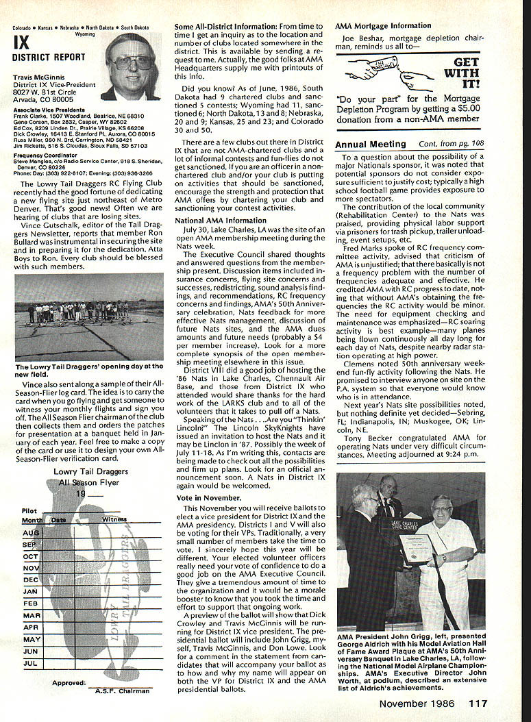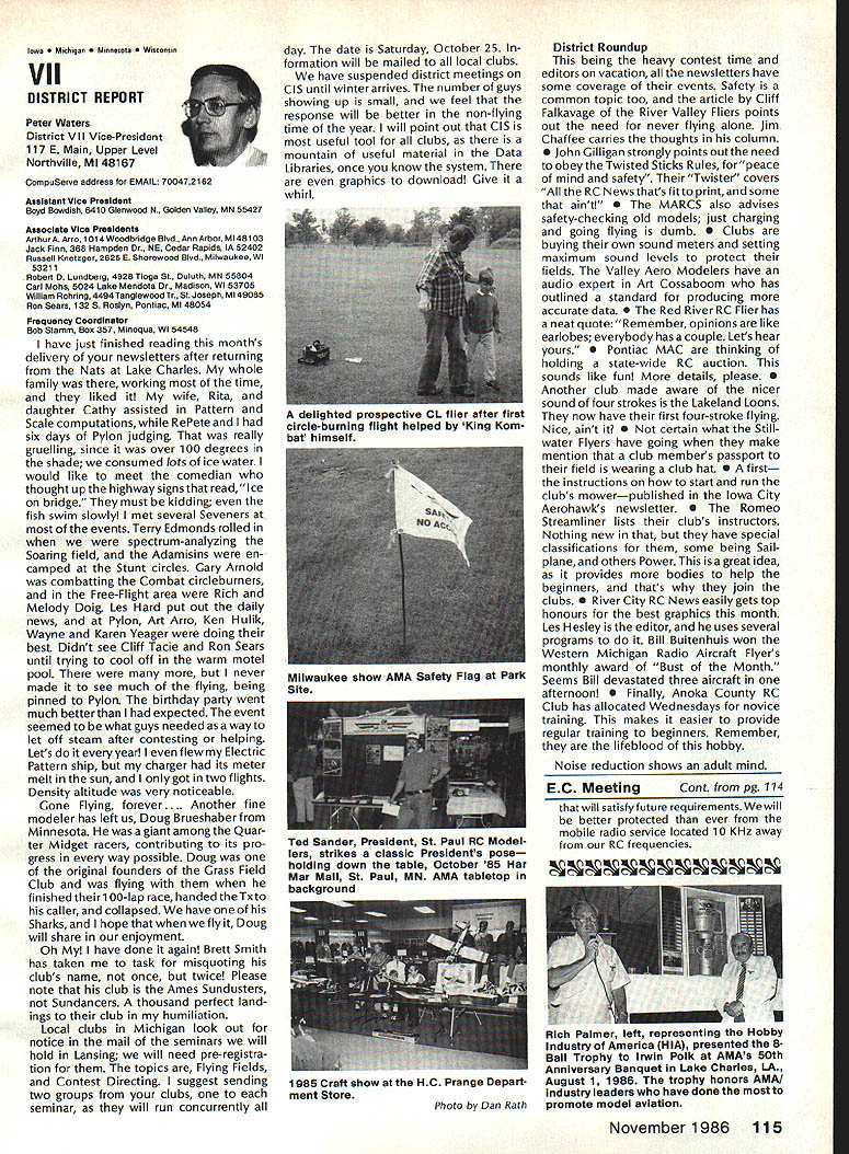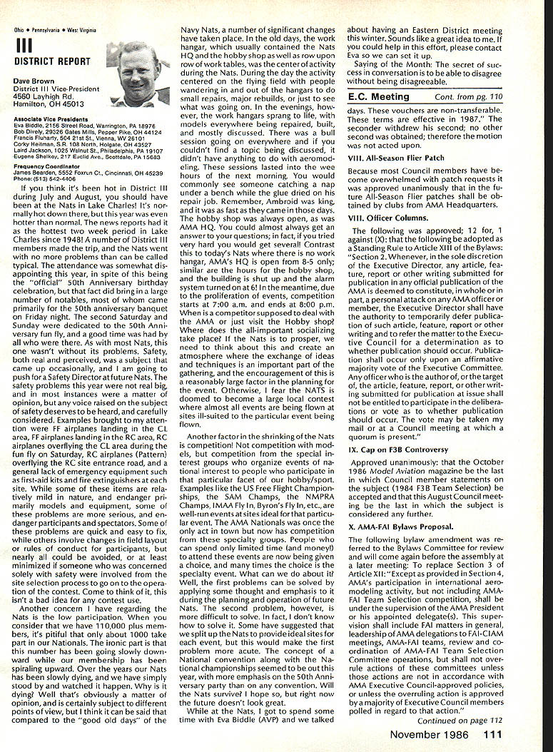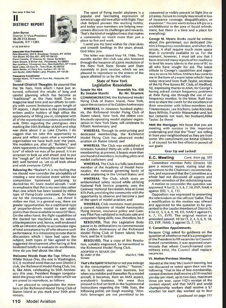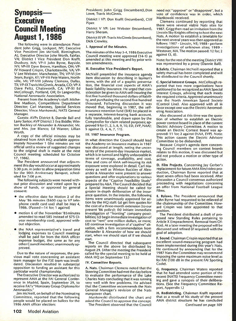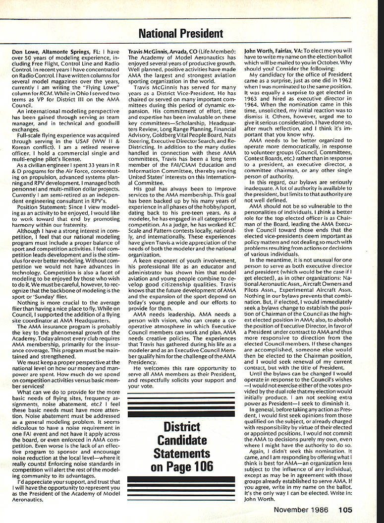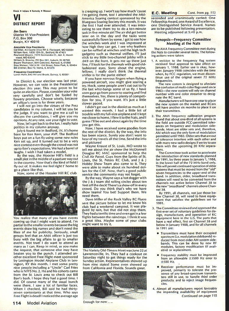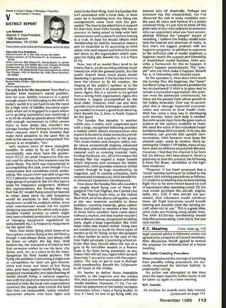 r Handle Flying Site Problem Geoffrey Styles Director Public Relations have some recent instances flying site public property has come public discussion Complaints nearby residents have resulted ac tion local officials either elected appointed action has taken two forms First public meeting local town building would called advertised interested parties could appear voice comments pro con Second piece legislation might have intro duced identified bylaw ordinance public comments invited before governing body before community took further action such situation develops community several steps should take flying site essentially safe have good record over period several years will probably want state case posi tive manner hoping retain privilege using land future activities will want give up struggle opposition will appear order make complaints known will hinge safety noise have preparing club such confrontation believe develop confrontations will have made some sound measurements have some records ready produce enlightenment town trustees written record noise measurements indi cates immediately concerned about effect neighborhood comments present evi dence can include such information other words club wishes good neighbor nuisance public hearings important choose words very carefully Poorlychosen words can rebound speaker very important point remem ber need rehearse selected speakers before get floor want job properly club should identify no six capable people tospeakatthe public meeting people should given topic should limit his/her words topic No wandering off target just because speaker knows needed particular segment presentation much should clearly stated understood before meeting begins important aspect public meeting impact club mem bers create appear especial ly speak vital case speakers possible club members dress wellin shirt tie jacketand unless called upon speak remain silent interrupt meeting way must no rebuttal opposition comments whether truthful incorrect except club speaker task handle part meeting Catcalls laughing back bench comments etc bad manners bad policy cause Let chosen speakers speak clean-up speaker should speak little longer others must very capable type person can adjust his/her presentation last minute He/she needs able include some rebuttal comments preferably fac tually based counter wild accusations opposition earlier speakers should limited two minutes final speaker may need up five minutes his/her clean-up talk can say lot two minutes some people will find impossible speak five minutes Choose people well best have club job properly will need less seven teen minutes make good case forestall actions could remove flying privileges whatever public private field under discussion should recognize going involved selling job front people may very strongly opposed model-flying operations easy task speakers cannot maintain cool under questioning nervous about speaking feet front hostile audience have wrong speakers Get others Back up speakers documentation Talk AMA about printed materials can justify sport show what other com munities provide show what type people sport demonstrate value sport recreational educational medium AMA has wide selec tion printed brochures can help impress case favorably local councilors trustees reasons belonging national associa tion services provide course best course action local flying field good con siderate neighbor Put yourself posi tion local resident couldnt care less about model aircraft try imagine sitting backyard day try ing get some peace quiet can hear model aircraft engines dron ing nearby Try understand worried father mother fear plane may cause harm kids dismiss attitudes because real may have best counter open meeting front real live support People gain courage num bersespecially numbers include strong supporters Look much better comedian performs audience laughing jokes So put nutshell face problem contact AMA see what advice documentation can provide Have facts lined up well back ground information AMA people can have big picture Afterwards prepare own case individual speakers special topics noise safety skills educational values etc rehearse Get documentation together make indi vidual folders councilmen/ trustees board club supporters will attend meeting must told dress well conservatively will make much favorable impression shirt tie jacket clean-shoe appearance will jeans dirty T-shirts anything wrong casual dress right place right time public meeting neither Most important selected speakers should speak want others spoil flow information want positive story interrupted speakers must ready go preferContinued page 107 AMA HO SERVICES STAFF 0 Executive Director John Worth 0 ExecutiveCoordinator oyce riagers omptroIIer useleJackaon S Competition Services Dlrectoi- Micheline Madison 0 Nets General Managen Vince MankowaldO Special Services Diractor Carl Marqney@ Memberahip Directon Carol Morbid S Special Events Directon Douglas Pratt S Public Relations Diracton Geoff Styles 0 Technical Diracton Bob underwood @ Administrative Cocfdlnston Bob voislaveke Publications Directon Carl R Wheeleye General Counsel Jeremiah Courtney 100 Model Aviation AMA HO Executive Director including reports AMA President Executive VP Vice-Presidents ACADEMY OF MODEL AERONAUTICS 1810 Samuel Morse Dr on VA 22090 AMAs Executive Council equivalent toe Board Directors basically composed President Executive vice President Executive Director 11 district vice PresldentsEscI officers provided space month AMA News publication What say space however isa matterof personal viewpoint sole responsibility author views may may represent official position AMA Executive Council Sound h Model Aeronautics Howard Crispin Jr Sound Nationals wide-scale measurement sound levels made first time since Academy has involved sound model aeronautics hundred percent cover age year however sufficient give committee some basic informa tion course chart future looks levels be