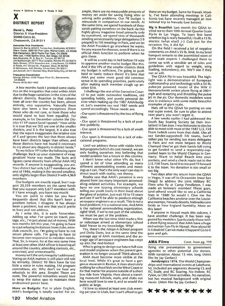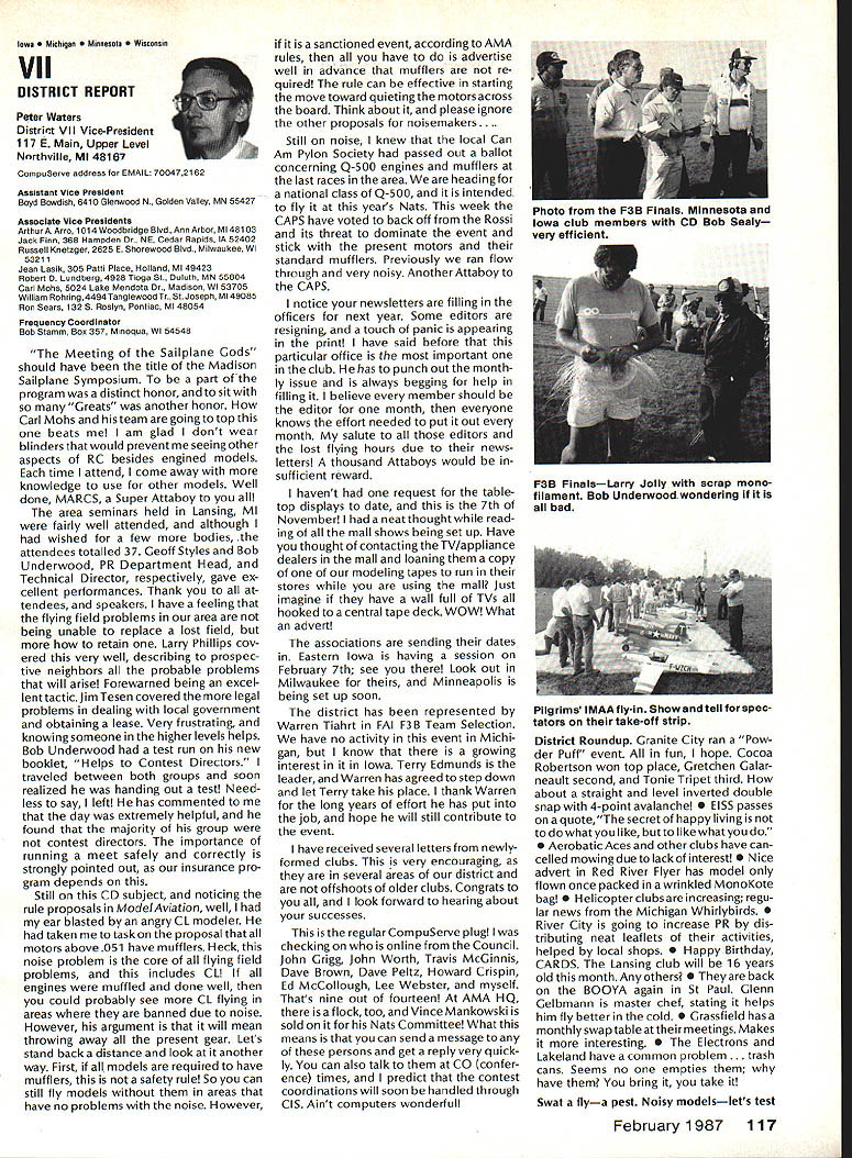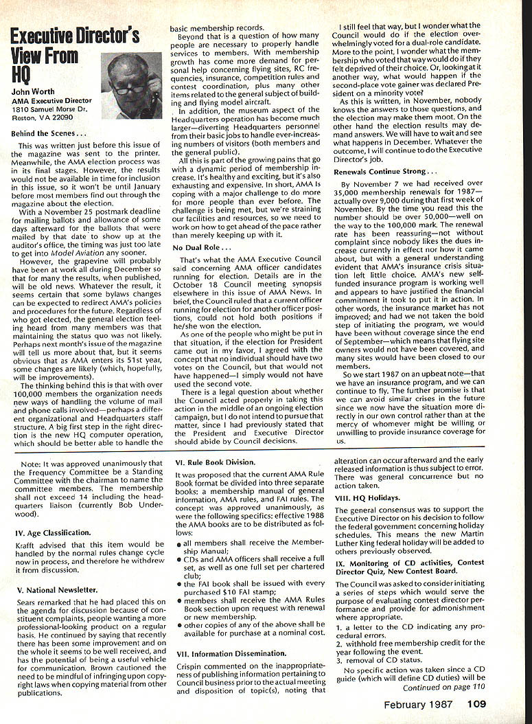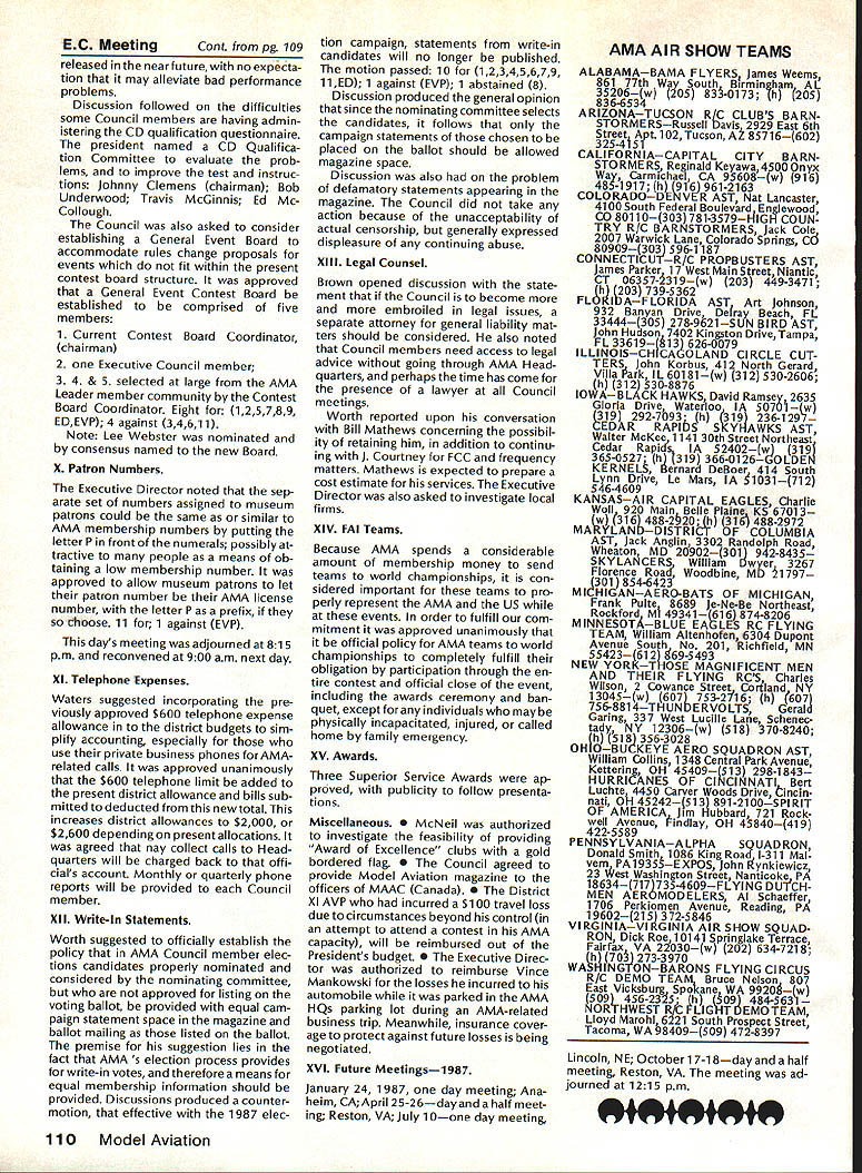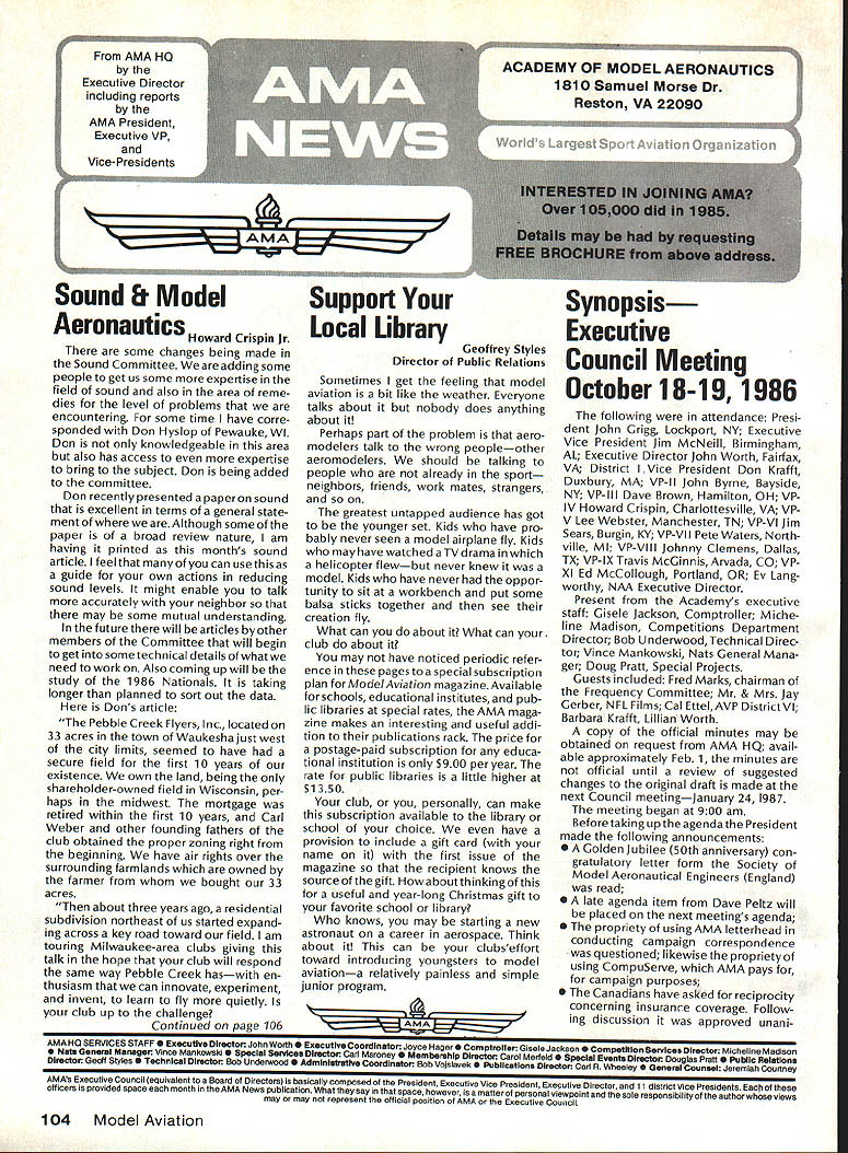 There some changes being made Sound Committee adding some people get us some expertise field sound also area reme dies level problems encountering some time have corre sponded Don Hyslop Pewauke WI Don knowledgeable area also has access expertise bring subject Don being added committee Don recently presented paper sound excellent terms general state ment Although some paper broad review nature am having printed months sound article feel can use guide own actions reducing sound levels might enable talk accurately neighbor may some mutual understanding future will articles other members Committee will begin get some technical details whatwe need work Also coming up will study 1986 Nationals taking longer planned sort out data Dons article Pebble Creek Flyers Inc located 33 acres town Waukesha just west city limits seemed have secure field first 10 years existence own land being shareholder-owned field Wisconsin per haps midwest mortgage retired within first 10 years Carl Weber other founding fathers club obtained proper zoning right beginning have air rights over surrounding farmlands owned farmer bought 33 acres about three years ago residential subdivision northeast us started expand ing across key road toward field am touring Milwaukee-area clubs giving talk hope club will respond same way Pebble Creek haswith en thusiasm can innovate experiment invent learn fly quietly club up challenge Continued page 106 Geoffrey Styles Director Public Relations Sometimes get feeling model aviation bit like weather Everyone talks about nobody does anything about Perhaps part problem aero modelers talk wrong peopleother aeromodelers should talking people already sport neighbors friends work mates strangers greatest untapped audience has got younger set Kids have pro bably never seen model airplane fly Kids may have watchedaTVdrama helicopter flewbut never knew model Kids have never oppor tunity sit workbench put some balsa sticks together see creation fly What can about What can club about may have noticed periodic refer ence pages special subscription plan ModelAviation magazine Available schools educational institutes pub lic libraries special rates AMA maga zine makes interesting useful addi tion publications rack price postage-paid subscription educa tional institution $900 per year rate public libraries little higher $1 350 club personally can make subscription available library school choice have provision include gift card name first issue magazine recipient knows source gift Howaboutthinkingof useful year-long Christmas gift favorite school library knows may starting new astronaut career aerospace Think about can clubseffort toward introducing youngsters model aviationa relatively painless simple junior program following attendance Presi dent John Grigg Lockport NY Executive Vice President Jim McNeill Birmingham AL Executive Director John Worth Fairfax VA District Vice President Don Krafft Duxbury MA VP-Il John Byrne Bayside NY VP-Ill Dave Brown Hamilton OH VPIV Howard Crispin Charlottesville VA VPV Lee Webster Manchester TN VP-VI Jim Sears Burgin KY VP-VII Pete Waters North ville Ml VP-VIII Johnny Clemens Dallas TX VP-IX Travis McGinnis Arvada CC VP Xl Ed McCollough Portland OR Ev Lang worthy NAA Executive Director Present Academys executive staff Gisele Jackson Comptroller Miche line Madison Competitions Department Director Bob U nderwood Technical Direc tor Vince Mankowski Nats General Mana ger Doug Pratt Special Projects Guests included Fred Marks chairman Frequency Committee Mr & Mrs Jay Gerber NFL Films Cal EttelAVP District VI Barbara Krafft Lillian Worth copy official minutes may obtained request AMA HQ avail able approximately Feb 1 minutes official until review suggested changes original draft made next Council meetingJanuary 24 1987 meeting began 900 am Before taking up agenda President made following announcements Golden Jubilee 50th anniversary con gratulatory letter form Society Model Aeronautical Engineers England read late agenda item Dave Peltz will placed next meetings agenda propriety using AMA letterhead conducting campaign correspondence questioned likewise propriety using CompuServe AMA pays for campaign purposes Canadians have asked reciprocity concerning insurance coverage Follow ing discussion approved unani AMA HO SERVICES STAFF 0 Executive Director John Worth 0 Executive Coordinator Joyce Hager S Comptroller Gisele Jackson etltlon Services Director Micheline Madison 0 Nets General Manager Vince Mankowakie Special Services Directon Cart Maroneye Membership Directon Carol Mart aide Special Events Directon Douglas Pratt S Public Relations Directon Geoff Styles 0 Technical Director Bob undeood 0 Administrative Coordinaton Bob VoislavekO Publications Director Carl WheeleyS General Counsel Jeremiah Courtney 104 Model Aviation AMA HO Executive Director including reports AMA President Executive VP Vice-Presidents Sound ft ModelSupport YourSynopsis Aeronautics Howard Crispin Jr Local LibraryExecutive Council Meeting October 18-19 1986 AMAs Esecutiva Council equivalent Board Directoral basically composed President Executive Vice President Exeputive Director 11 district vice Presidents officers provided space month AMA Nems publication What say space homever smatter personal viewpoint sole responsibility author views may may represent official position AMA Executive Council mously AMA provide insurance coverage normal sport flying USA well competition Model Airplane Association Canada mem bers I Previous Minutes approved unanimously accept August 1 September 13 1986 minutes amended written Council input II Executive VP Report McNeiII advised made cus tomary post-Nats budget evaluation reported operation cost $54477 expenses less budgeted income short due low attendance III Committee Reports A Bylaws Newly appointed chairman Crispin distributed new standing rule pro posal discussion action concerning acceptability person concurrently holding offices executive director president E