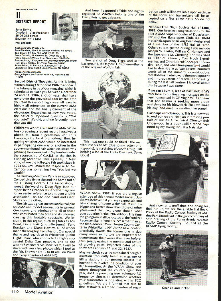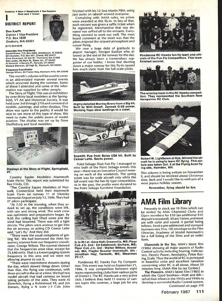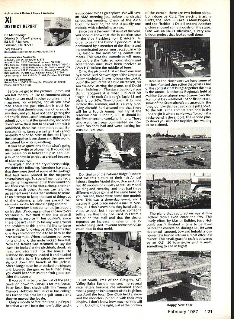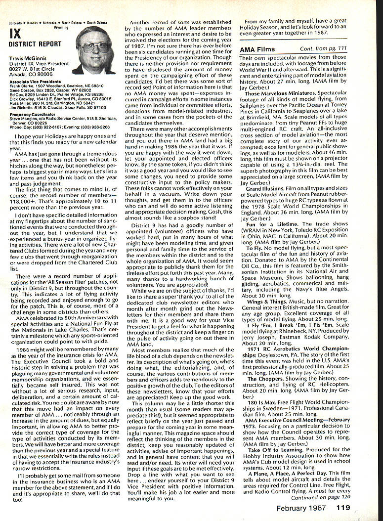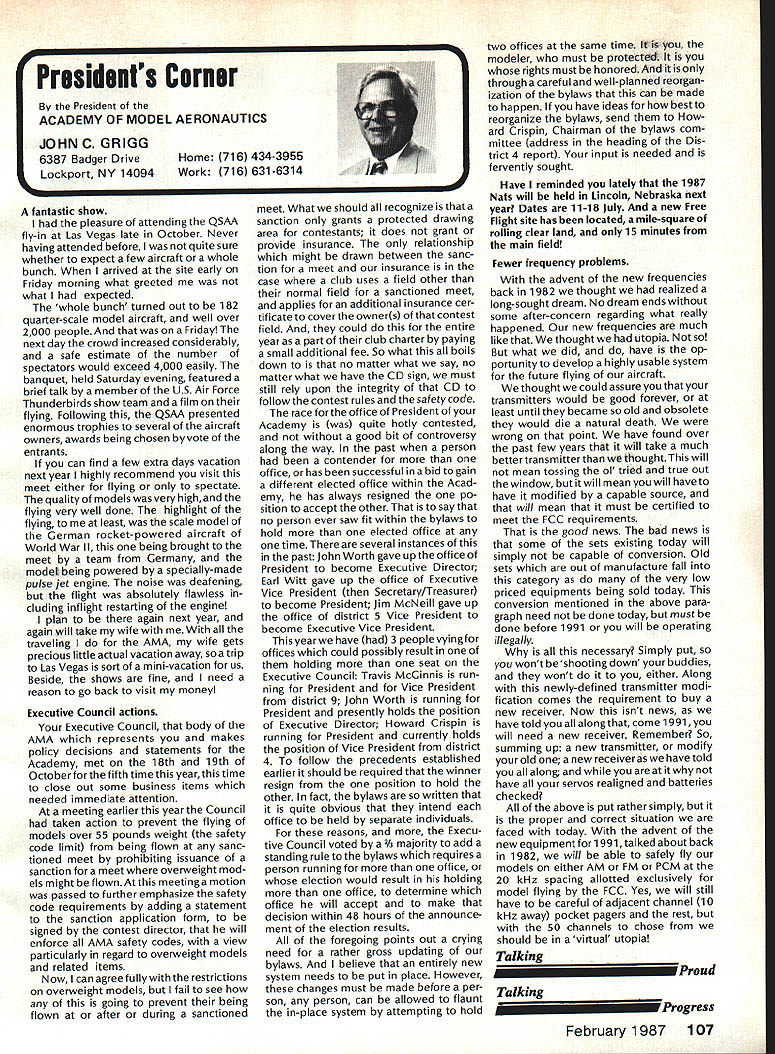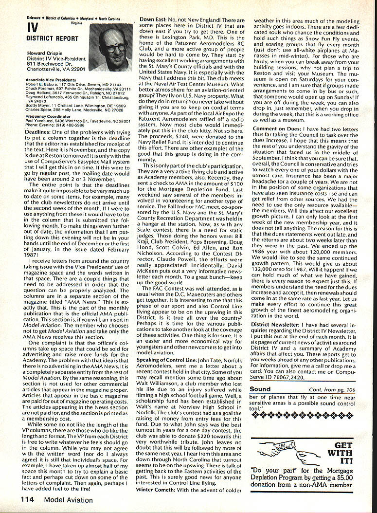 There some changes being made Sound Committee adding some people get us some expertise field sound also area reme dies level problems encountering some time have corre sponded Don Hyslop Pewauke WI Don knowledgeable area also has access expertise bring subject Don being added committee Don recently presented paper sound excellent terms general state ment Although some paper broad review nature am having printed months sound article feel can use guide own actions reducing sound levels might enable talk accurately neighbor may some mutual understanding future will articles other members Committee will begin get some technical details whatwe need work Also coming up will study 1986 Nationals taking longer planned sort out data Dons article Pebble Creek Flyers Inc located 33 acres town Waukesha just west city limits seemed have secure field first 10 years existence own land being shareholder-owned field Wisconsin per haps midwest mortgage retired within first 10 years Carl Weber other founding fathers club obtained proper zoning right beginning have air rights over surrounding farmlands owned farmer bought 33 acres about three years ago residential subdivision northeast us started expand ing across key road toward field am touring Milwaukee-area clubs giving talk hope club will respond same way Pebble Creek haswith en thusiasm can innovate experiment invent learn fly quietly club up challenge Continued page 106 Geoffrey Styles Director Public Relations Sometimes get feeling model aviation bit like weather Everyone talks about nobody does anything about Perhaps part problem aero modelers talk wrong peopleother aeromodelers should talking people already sport neighbors friends work mates strangers greatest untapped audience has got younger set Kids have pro bably never seen model airplane fly Kids may have watchedaTVdrama helicopter flewbut never knew model Kids have never oppor tunity sit workbench put some balsa sticks together see creation fly What can about What can club about may have noticed periodic refer ence pages special subscription plan ModelAviation magazine Available schools educational institutes pub lic libraries special rates AMA maga zine makes interesting useful addi tion publications rack price postage-paid subscription educa tional institution $900 per year rate public libraries little higher $1 350 club personally can make subscription available library school choice have provision include gift card name first issue magazine recipient knows source gift Howaboutthinkingof useful year-long Christmas gift favorite school library knows may starting new astronaut career aerospace Think about can clubseffort toward introducing youngsters model aviationa relatively painless simple junior program following attendance Presi dent John Grigg Lockport NY Executive Vice President Jim McNeill Birmingham AL Executive Director John Worth Fairfax VA District Vice President Don Krafft Duxbury MA VP-Il John Byrne Bayside NY VP-Ill Dave Brown Hamilton OH VPIV Howard Crispin Charlottesville VA VPV Lee Webster Manchester TN VP-VI Jim Sears Burgin KY VP-VII Pete Waters North ville Ml VP-VIII Johnny Clemens Dallas TX VP-IX Travis McGinnis Arvada CC VP Xl Ed McCollough Portland OR Ev Lang worthy NAA Executive Director Present Academys executive staff Gisele Jackson Comptroller Miche line Madison Competitions Department Director Bob U nderwood Technical Direc tor Vince Mankowski Nats General Mana ger Doug Pratt Special Projects Guests included Fred Marks chairman Frequency Committee Mr & Mrs Jay Gerber NFL Films Cal EttelAVP District VI Barbara Krafft Lillian Worth copy official minutes may obtained request AMA HQ avail able approximately Feb 1 minutes official until review suggested changes original draft made next Council meetingJanuary 24 1987 meeting began 900 am Before taking up agenda President made following announcements Golden Jubilee 50th anniversary con gratulatory letter form Society Model Aeronautical Engineers England read late agenda item Dave Peltz will placed next meetings agenda propriety using AMA letterhead conducting campaign correspondence questioned likewise propriety using CompuServe AMA pays for campaign purposes Canadians have asked reciprocity concerning insurance coverage Follow ing discussion approved unani AMA HO SERVICES STAFF 0 Executive Director John Worth 0 Executive Coordinator Joyce Hager S Comptroller Gisele Jackson etltlon Services Director Micheline Madison 0 Nets General Manager Vince Mankowakie Special Services Directon Cart Maroneye Membership Directon Carol Mart aide Special Events Directon Douglas Pratt S Public Relations Directon Geoff Styles 0 Technical Director Bob undeood 0 Administrative Coordinaton Bob VoislavekO Publications Director Carl WheeleyS General Counsel Jeremiah Courtney 104 Model Aviation AMA HO Executive Director including reports AMA President Executive VP Vice-Presidents Sound ft ModelSupport YourSynopsis Aeronautics Howard Crispin Jr Local LibraryExecutive Council Meeting October 18-19 1986 AMAs Esecutiva Council equivalent Board Directoral basically composed President Executive Vice President Exeputive Director 11 district vice Presidents officers provided space month AMA Nems publication What say space homever smatter personal viewpoint sole responsibility author views may may represent official position AMA Executive Council mously AMA provide insurance coverage normal sport flying USA well competition Model Airplane Association Canada mem bers I Previous Minutes approved unanimously accept August 1 September 13 1986 minutes amended written Council input II Executive VP Report McNeiII advised made cus tomary post-Nats budget evaluation reported operation cost $54477 expenses less budgeted income short due low attendance III Committee Reports A Bylaws Newly appointed chairman Crispin distributed new standing rule pro posal discussion action concerning acceptability person concurrently holding offices executive director president E