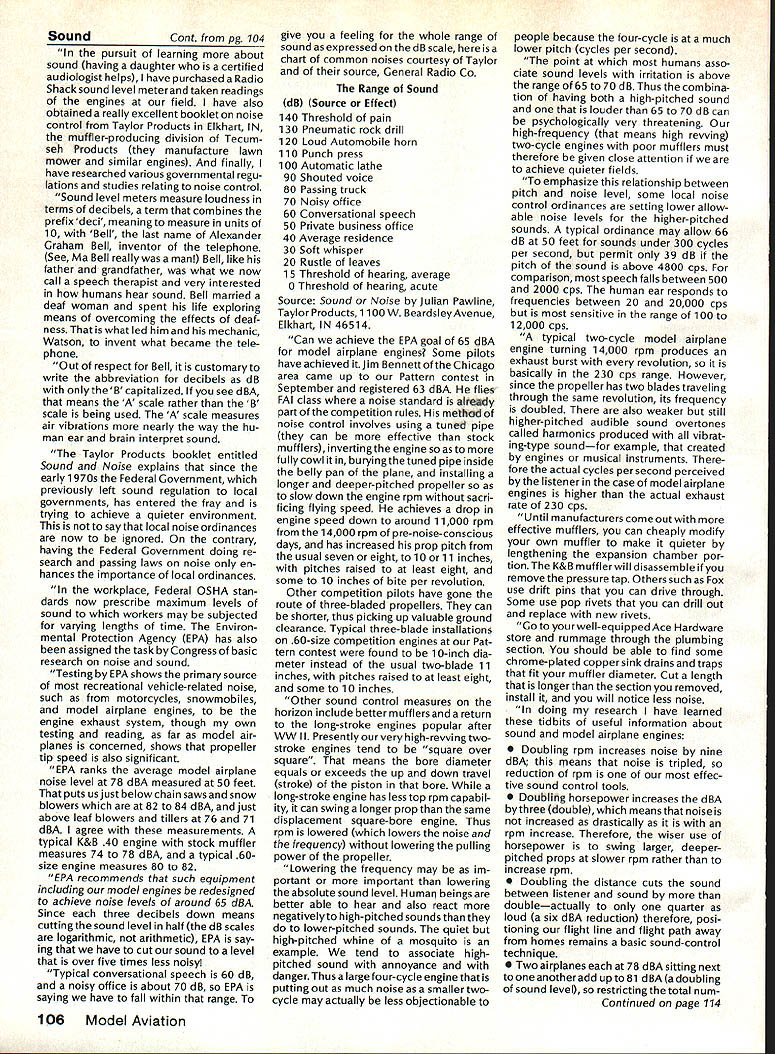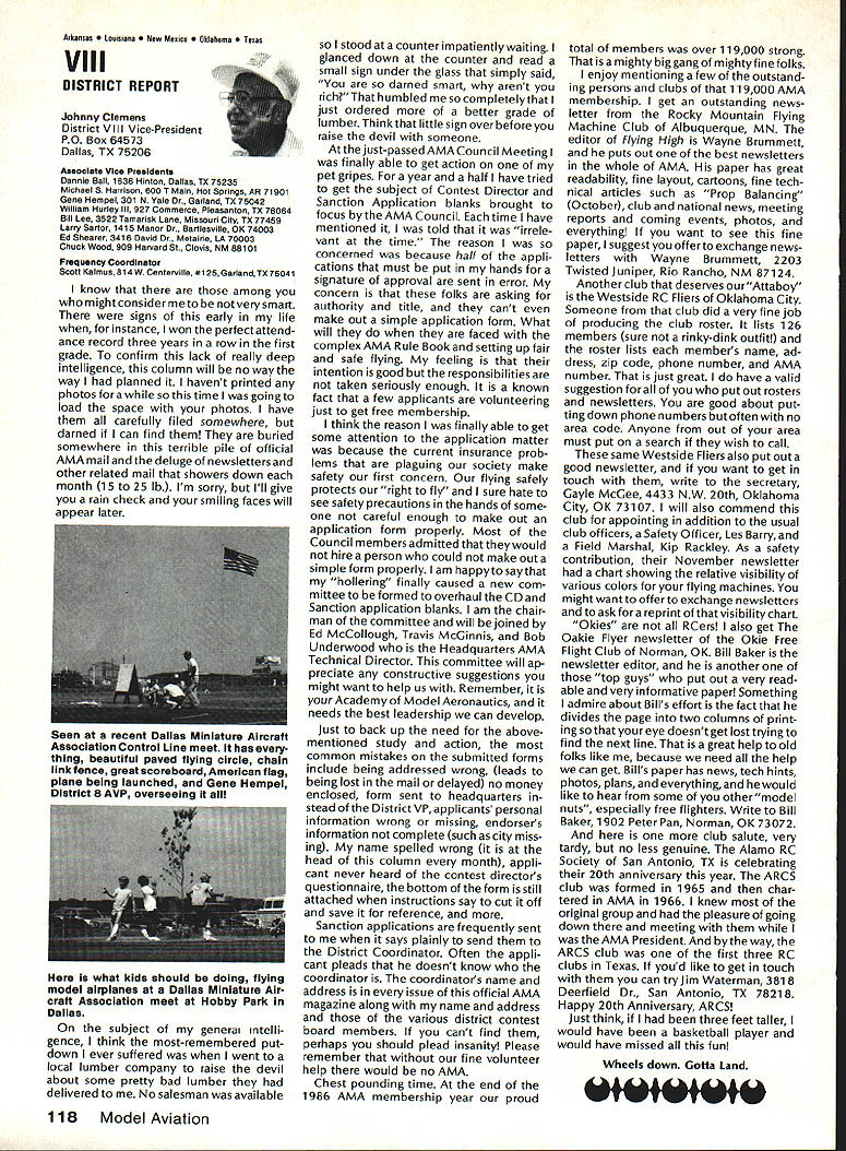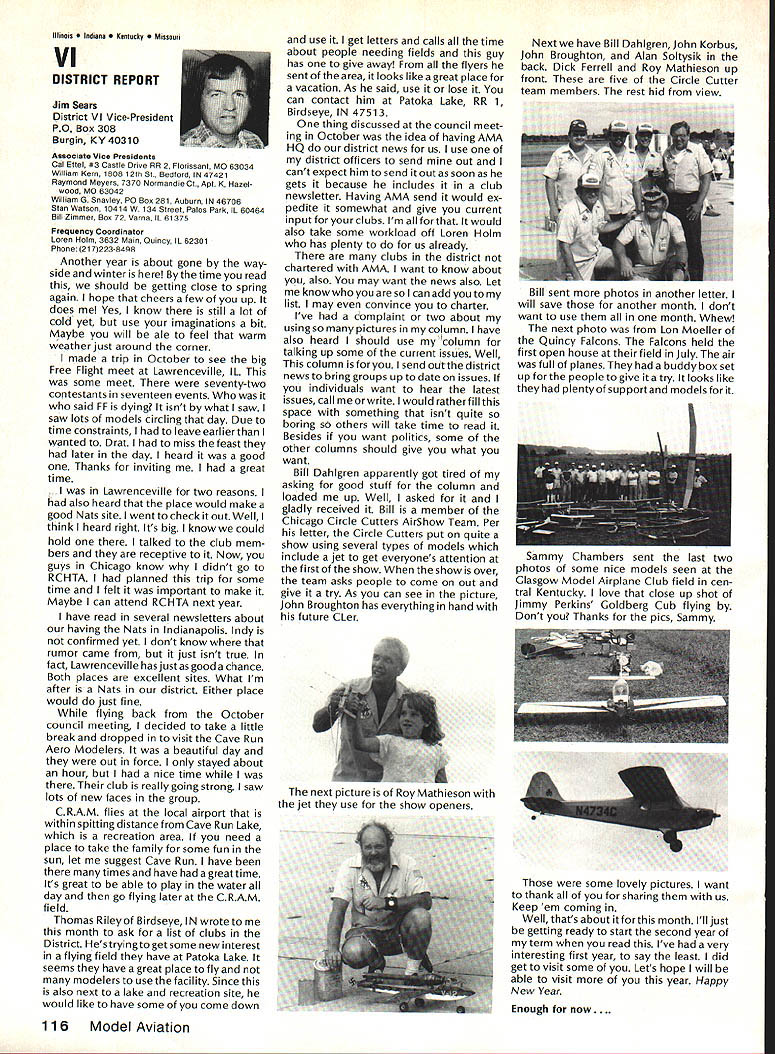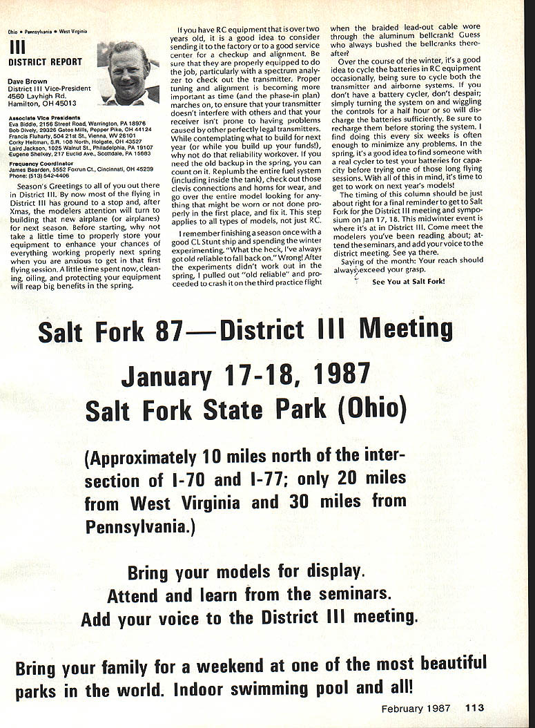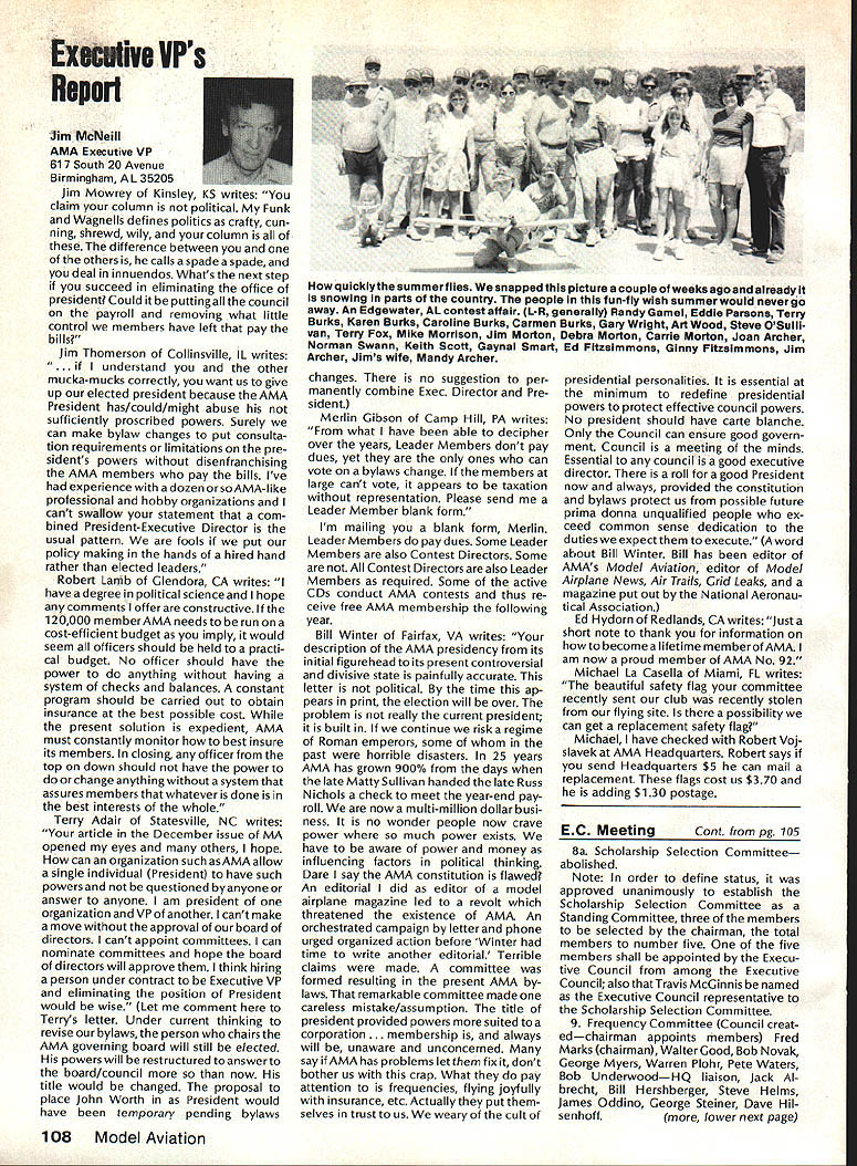 There some changes being made Sound Committee adding some people get us some expertise field sound also area reme dies level problems encountering some time have corre sponded Don Hyslop Pewauke WI Don knowledgeable area also has access expertise bring subject Don being added committee Don recently presented paper sound excellent terms general state ment Although some paper broad review nature am having printed months sound article feel can use guide own actions reducing sound levels might enable talk accurately neighbor may some mutual understanding future will articles other members Committee will begin get some technical details whatwe need work Also coming up will study 1986 Nationals taking longer planned sort out data Dons article Pebble Creek Flyers Inc located 33 acres town Waukesha just west city limits seemed have secure field first 10 years existence own land being shareholder-owned field Wisconsin per haps midwest mortgage retired within first 10 years Carl Weber other founding fathers club obtained proper zoning right beginning have air rights over surrounding farmlands owned farmer bought 33 acres about three years ago residential subdivision northeast us started expand ing across key road toward field am touring Milwaukee-area clubs giving talk hope club will respond same way Pebble Creek haswith en thusiasm can innovate experiment invent learn fly quietly club up challenge Continued page 106 Geoffrey Styles Director Public Relations Sometimes get feeling model aviation bit like weather Everyone talks about nobody does anything about Perhaps part problem aero modelers talk wrong peopleother aeromodelers should talking people already sport neighbors friends work mates strangers greatest untapped audience has got younger set Kids have pro bably never seen model airplane fly Kids may have watchedaTVdrama helicopter flewbut never knew model Kids have never oppor tunity sit workbench put some balsa sticks together see creation fly What can about What can club about may have noticed periodic refer ence pages special subscription plan ModelAviation magazine Available schools educational institutes pub lic libraries special rates AMA maga zine makes interesting useful addi tion publications rack price postage-paid subscription educa tional institution $900 per year rate public libraries little higher $1 350 club personally can make subscription available library school choice have provision include gift card name first issue magazine recipient knows source gift Howaboutthinkingof useful year-long Christmas gift favorite school library knows may starting new astronaut career aerospace Think about can clubseffort toward introducing youngsters model aviationa relatively painless simple junior program following attendance Presi dent John Grigg Lockport NY Executive Vice President Jim McNeill Birmingham AL Executive Director John Worth Fairfax VA District Vice President Don Krafft Duxbury MA VP-Il John Byrne Bayside NY VP-Ill Dave Brown Hamilton OH VPIV Howard Crispin Charlottesville VA VPV Lee Webster Manchester TN VP-VI Jim Sears Burgin KY VP-VII Pete Waters North ville Ml VP-VIII Johnny Clemens Dallas TX VP-IX Travis McGinnis Arvada CC VP Xl Ed McCollough Portland OR Ev Lang worthy NAA Executive Director Present Academys executive staff Gisele Jackson Comptroller Miche line Madison Competitions Department Director Bob U nderwood Technical Direc tor Vince Mankowski Nats General Mana ger Doug Pratt Special Projects Guests included Fred Marks chairman Frequency Committee Mr & Mrs Jay Gerber NFL Films Cal EttelAVP District VI Barbara Krafft Lillian Worth copy official minutes may obtained request AMA HQ avail able approximately Feb 1 minutes official until review suggested changes original draft made next Council meetingJanuary 24 1987 meeting began 900 am Before taking up agenda President made following announcements Golden Jubilee 50th anniversary con gratulatory letter form Society Model Aeronautical Engineers England read late agenda item Dave Peltz will placed next meetings agenda propriety using AMA letterhead conducting campaign correspondence questioned likewise propriety using CompuServe AMA pays for campaign purposes Canadians have asked reciprocity concerning insurance coverage Follow ing discussion approved unani AMA HO SERVICES STAFF 0 Executive Director John Worth 0 Executive Coordinator Joyce Hager S Comptroller Gisele Jackson etltlon Services Director Micheline Madison 0 Nets General Manager Vince Mankowakie Special Services Directon Cart Maroneye Membership Directon Carol Mart aide Special Events Directon Douglas Pratt S Public Relations Directon Geoff Styles 0 Technical Director Bob undeood 0 Administrative Coordinaton Bob VoislavekO Publications Director Carl WheeleyS General Counsel Jeremiah Courtney 104 Model Aviation AMA HO Executive Director including reports AMA President Executive VP Vice-Presidents Sound ft ModelSupport YourSynopsis Aeronautics Howard Crispin Jr Local LibraryExecutive Council Meeting October 18-19 1986 AMAs Esecutiva Council equivalent Board Directoral basically composed President Executive Vice President Exeputive Director 11 district vice Presidents officers provided space month AMA Nems publication What say space homever smatter personal viewpoint sole responsibility author views may may represent official position AMA Executive Council mously AMA provide insurance coverage normal sport flying USA well competition Model Airplane Association Canada mem bers I Previous Minutes approved unanimously accept August 1 September 13 1986 minutes amended written Council input II Executive VP Report McNeiII advised made cus tomary post-Nats budget evaluation reported operation cost $54477 expenses less budgeted income short due low attendance III Committee Reports A Bylaws Newly appointed chairman Crispin distributed new standing rule pro posal discussion action concerning acceptability person concurrently holding offices executive director president E