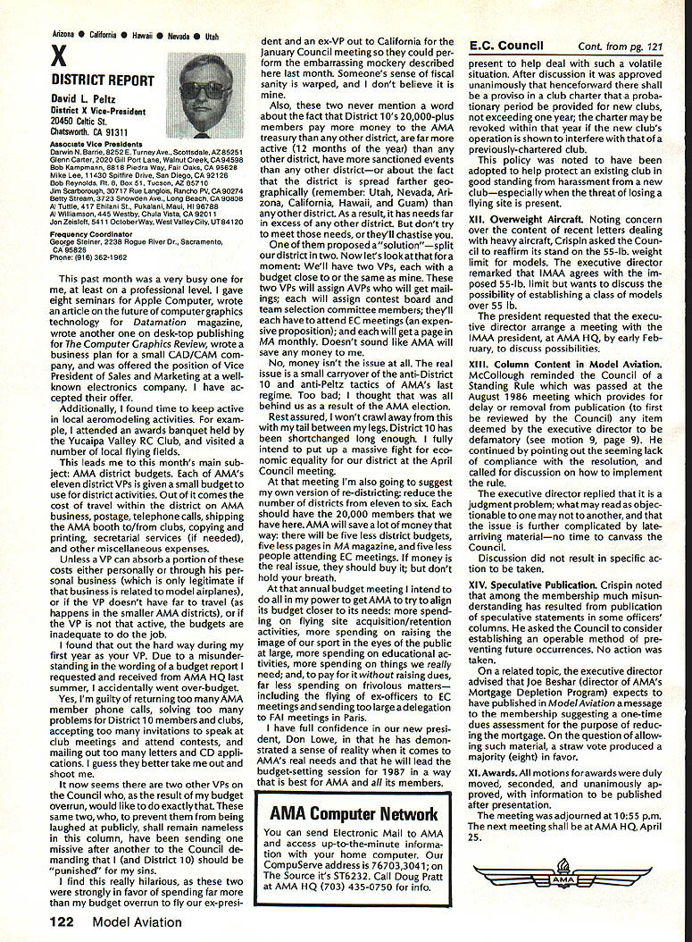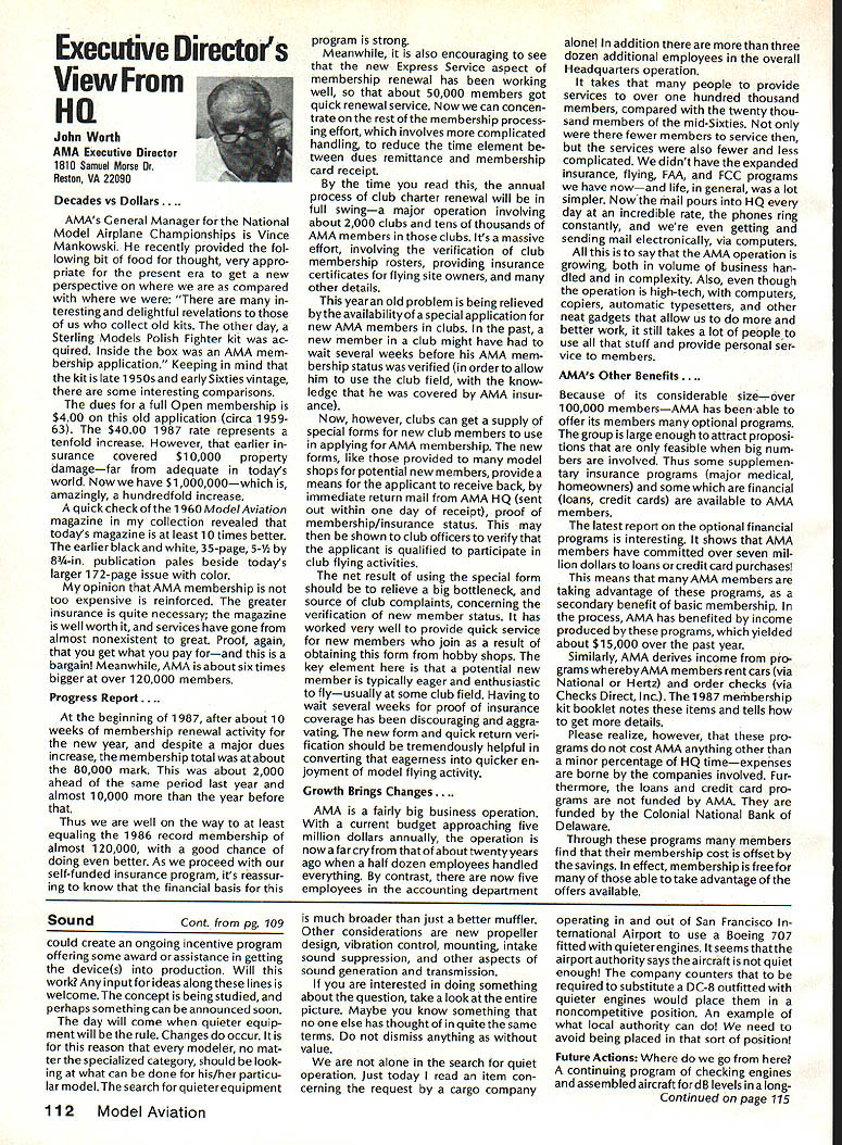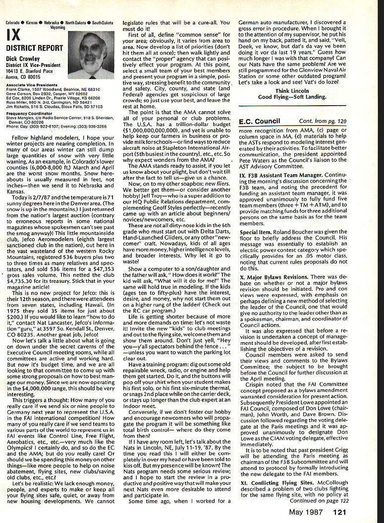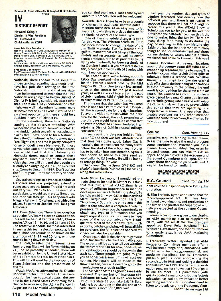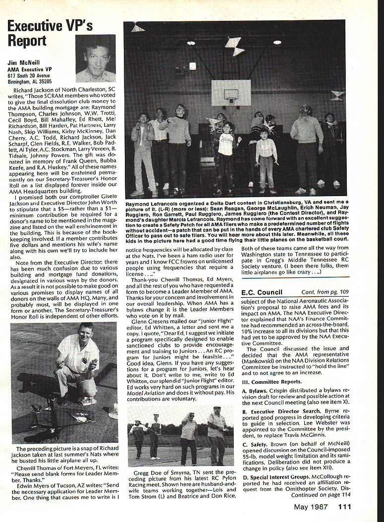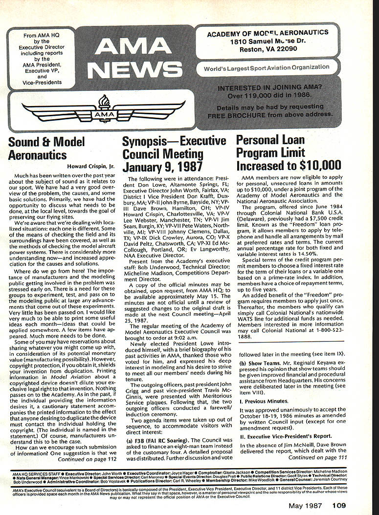 From AMA HO Executive Director including reports AMA President Executive VP Vice-Presidents L Sound & Model Aeronautics Howard Crispin Jr Much has written over past year about subject sound relates sport have very good over view problem causes some basic solutions Primarily have opportunity discuss what needs done local level towards goal preserving flying sites aware dealing loca lized situations different Some means checking field its surroundings have covered well methods checking model aircraft power systems considerably understanding nowand increased appre ciation causes solutions go impor tance manufacturers modeling public getting involved problem stressed early need groups experiment test pass modeling public large advance ments come Out experiments Very little has passed would like very much able print some useful ideas monthideas could applied somewhere few items have ap peared Much needs done Some may have reservations about sharing whatever might come up consideration its potential monetary value manufacturing possibility However copyright protection obtain shields invention duplication Printing information Model Aviation about copyrighted device doesnt dilute ex clusive legal right invention Nothing passes Academy As past individual providing information desires cautionary statement accom panies printed information effect anyone desiringto duplicate device must contact individual holding copyright individual named statement course manufacturers un derstand case can encourage such submission information suggestion Continued page 112 following attendance Presi dent Don Lowe Altamonte Springs FL Executive Director John Worth Fairfax VA District Vice President Don Krafft Dux bury MA VP-Il John Byrne Bayside NY VP Ill Dave Brown Hamilton OH VP-IV Howard Crispin Charlottesville VA VP-V Lee Webster Manchester TN VP-VI Jim Sears Burgin KY VP-VII Pete Waters North ville Ml VP-VIII Johnny Clemens Dallas TX VP-IX Dick Crowley Aurora CO VP-X David Peltz Chatsworth CA VP-XI Ed Mc Collough Portland OR Ev Langworthy NAA Executive Director Present Academys executive staff Bob Underwood Technical Director Micheline Madison Competitions Depart ment Director copy official minutes may obtained upon request AMA HQ available approximately May 15 minutes official until review suggested changes original draft made next Council meetingApril 25 1987 regular meeting Academy Model Aeronautics Executive Council brought order 902 am Newly elected President Lowe intro duced himself brief biography past activities AMA thanked voted him expressed deep interest modeling desire strive meet members needs during tenure outgoing officers past presidentJohn Grigg past vice-president Travis Mc Ginnis presented Meritorious Service plaques Following two outgoing officers conducted farewell induction ceremony Two agenda items taken up out sequence accommodate visitors direct interest a F3B FAI RC Soaring Council asked finance eight-man team instead customary four detailed proposal distributed Further discussion vote AMA members now eligible apply personal unsecured loans amounts up $10000 under joint program Academy Model Aeronautics National Aeronautic Association program offered since June 1984 through Colonial National Bank USA Delaware previously $7500 credit limit Known Freedom loan pro gram allows members apply tele phone handle arrangements mail preferred rates terms current annual percentage rate both fixed variable interest rates 1450% Special terms credit program per mit members choose fixed interest rate term loans variable based prime-rate index addition members have choice repayment terms up five years An added benefit Freedom pro gram requires members apply just once Thereafter members qualify can simply call Colonial Nationals nationwide WATS line additional funds needed Members interested information may call Colonial National 1-800-5231888 followed later meeting see item IX b Show Teams Mr Reginald Keyawa ex pressed opinion showteams should given improved financial procedural assistance Headquarters concerns deliberated later meeting see item VIII I Previous Minutes approved unanimously accept October 18-19 1986 minutes amended written Council input except amendment request II Executive Vice-Presidents Report absence Jim McNeill Dave Brown delivered report dealt Continued page 111 AMA HO SERVICES STAFF S Executive Director John Worth S Executive Coordinator Joyce Hager 0 Comptrolier Gisele Jsckson0 Competition Services Director Micheline Madison 0 Nets General Managar vince MankowakiS Special Services DIrector carl MaroneyS Special Events Director Douglas Pratt 0 Public Relations Director Geoff Styles 0 Technical Director Bob Underwood 0 AdmInistrative Coordinator Bob VojalavekO Publications DIrector carl R WheeleyS Membership Director Mike Woodfolk0 General Counsel Jeremiah Courtney May1987 109 Synopsis Executive Personal Loan Council MeetingProgram Limit January 9 1987Increased $10000 AMAs Executive Council equivalent toaBoard Directors basically composed President Executive Vice President Executive Director 11 district Vice Presidents officers provided space month AMA News publication Whet say space however matter personal viewpoint sole responsibility author views may may represent official position AMA Executive Council Presidents Corner President ACADEMY OF MODEL AERONAUTICS DON LOWE 902 Little Bend Rd Altamonte Springs FL 32701 Since last talked have spent week AMA Headquarters Reston VA say least saturated information overall impression dont know anyone could hold job president organization have full-time employ ment well Academys business complex administered mix paid staff Headquarters volunteer help rest us Since AMA Council president district VPs responsible planning overall functioning Academy must privy important goings-on Headquartersthus constantflurryof correspondence phone calls use computer link Compu Serve 48 people Headquarters en gaged activities membership sales management cost