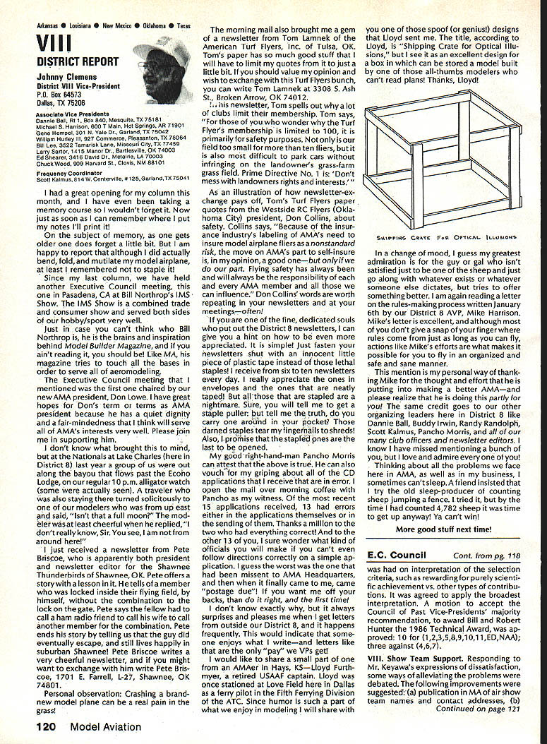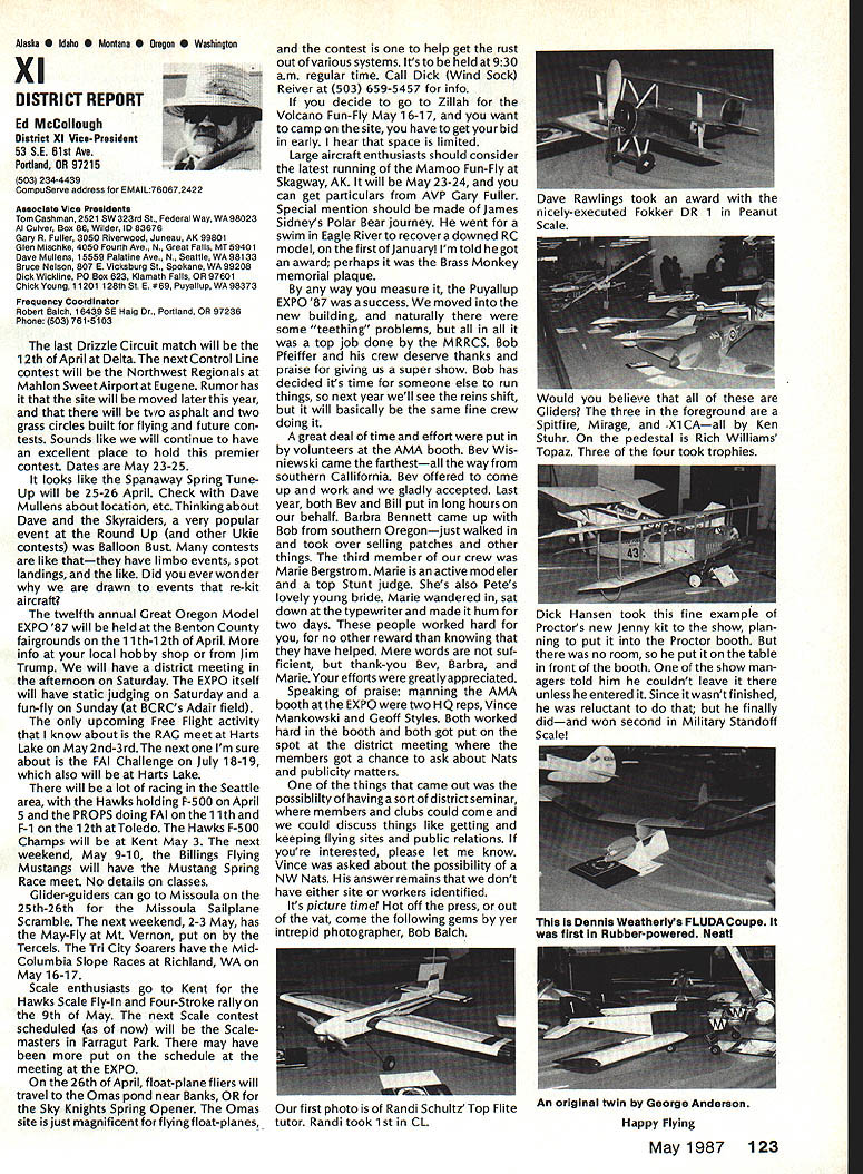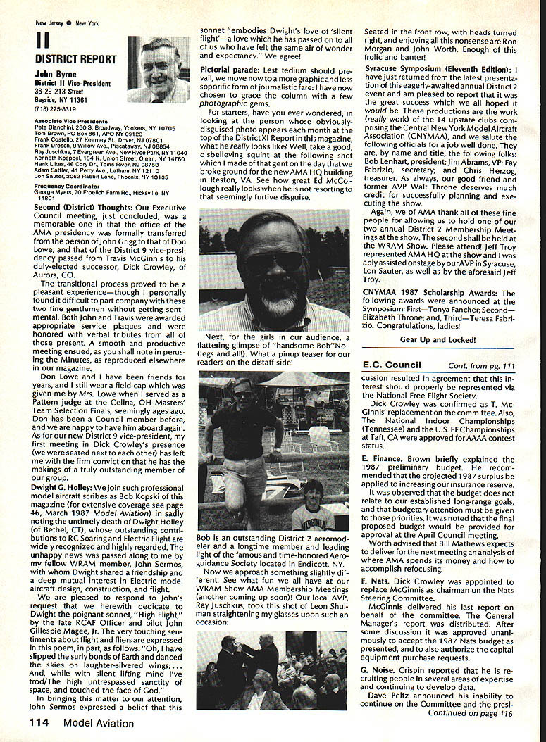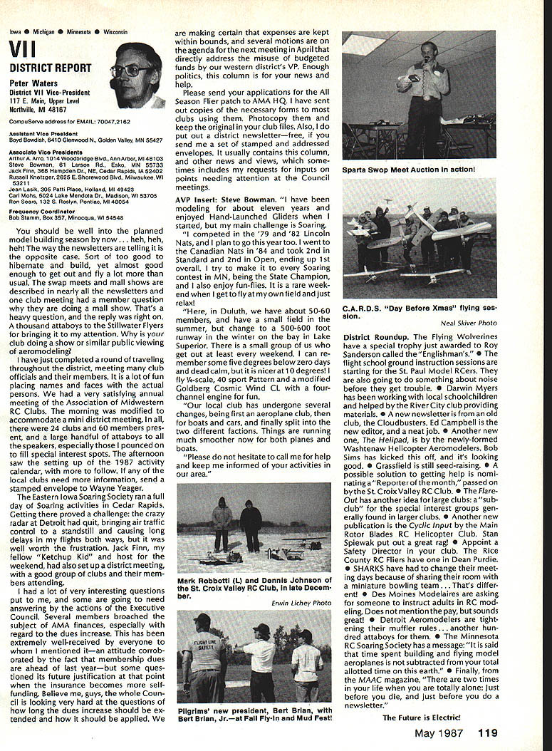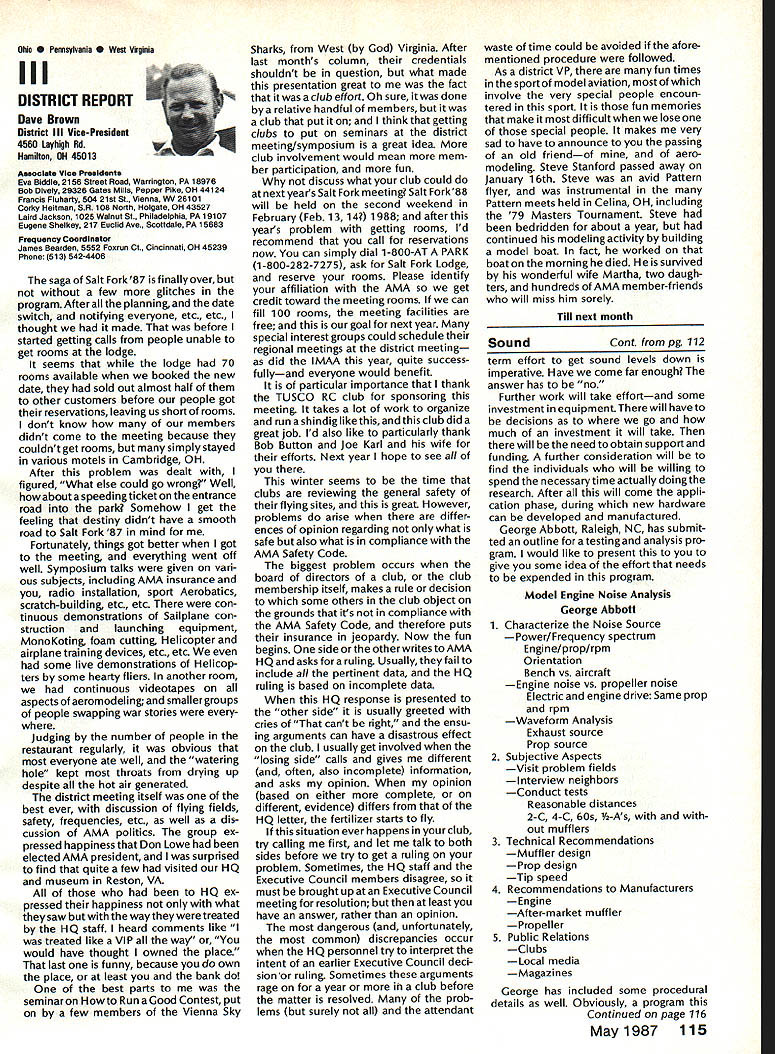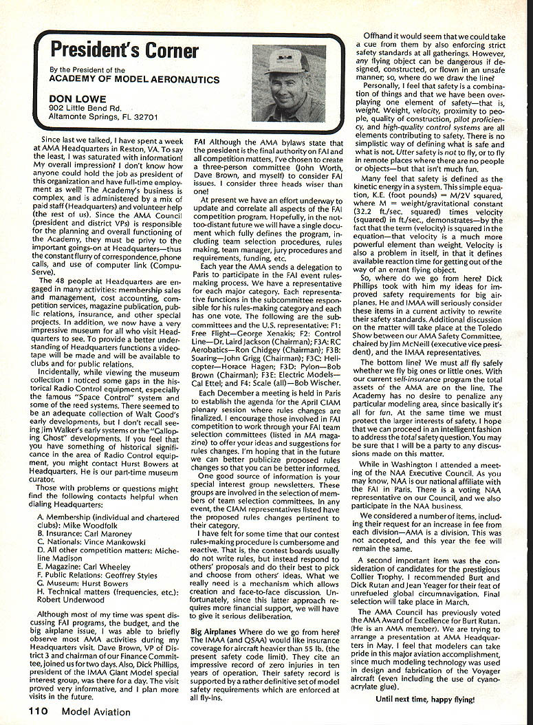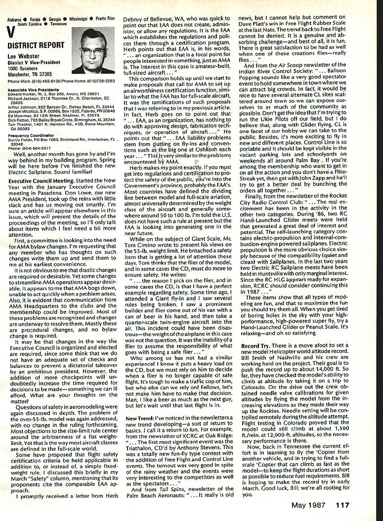 From AMA HO Executive Director including reports AMA President Executive VP Vice-Presidents L Sound & Model Aeronautics Howard Crispin Jr Much has written over past year about subject sound relates sport have very good over view problem causes some basic solutions Primarily have opportunity discuss what needs done local level towards goal preserving flying sites aware dealing loca lized situations different Some means checking field its surroundings have covered well methods checking model aircraft power systems considerably understanding nowand increased appre ciation causes solutions go impor tance manufacturers modeling public getting involved problem stressed early need groups experiment test pass modeling public large advance ments come Out experiments Very little has passed would like very much able print some useful ideas monthideas could applied somewhere few items have ap peared Much needs done Some may have reservations about sharing whatever might come up consideration its potential monetary value manufacturing possibility However copyright protection obtain shields invention duplication Printing information Model Aviation about copyrighted device doesnt dilute ex clusive legal right invention Nothing passes Academy As past individual providing information desires cautionary statement accom panies printed information effect anyone desiringto duplicate device must contact individual holding copyright individual named statement course manufacturers un derstand case can encourage such submission information suggestion Continued page 112 following attendance Presi dent Don Lowe Altamonte Springs FL Executive Director John Worth Fairfax VA District Vice President Don Krafft Dux bury MA VP-Il John Byrne Bayside NY VP Ill Dave Brown Hamilton OH VP-IV Howard Crispin Charlottesville VA VP-V Lee Webster Manchester TN VP-VI Jim Sears Burgin KY VP-VII Pete Waters North ville Ml VP-VIII Johnny Clemens Dallas TX VP-IX Dick Crowley Aurora CO VP-X David Peltz Chatsworth CA VP-XI Ed Mc Collough Portland OR Ev Langworthy NAA Executive Director Present Academys executive staff Bob Underwood Technical Director Micheline Madison Competitions Depart ment Director copy official minutes may obtained upon request AMA HQ available approximately May 15 minutes official until review suggested changes original draft made next Council meetingApril 25 1987 regular meeting Academy Model Aeronautics Executive Council brought order 902 am Newly elected President Lowe intro duced himself brief biography past activities AMA thanked voted him expressed deep interest modeling desire strive meet members needs during tenure outgoing officers past presidentJohn Grigg past vice-president Travis Mc Ginnis presented Meritorious Service plaques Following two outgoing officers conducted farewell induction ceremony Two agenda items taken up out sequence accommodate visitors direct interest a F3B FAI RC Soaring Council asked finance eight-man team instead customary four detailed proposal distributed Further discussion vote AMA members now eligible apply personal unsecured loans amounts up $10000 under joint program Academy Model Aeronautics National Aeronautic Association program offered since June 1984 through Colonial National Bank USA Delaware previously $7500 credit limit Known Freedom loan pro gram allows members apply tele phone handle arrangements mail preferred rates terms current annual percentage rate both fixed variable interest rates 1450% Special terms credit program per mit members choose fixed interest rate term loans variable based prime-rate index addition members have choice repayment terms up five years An added benefit Freedom pro gram requires members apply just once Thereafter members qualify can simply call Colonial Nationals nationwide WATS line additional funds needed Members interested information may call Colonial National 1-800-5231888 followed later meeting see item IX b Show Teams Mr Reginald Keyawa ex pressed opinion showteams should given improved financial procedural assistance Headquarters concerns deliberated later meeting see item VIII I Previous Minutes approved unanimously accept October 18-19 1986 minutes amended written Council input except amendment request II Executive Vice-Presidents Report absence Jim McNeill Dave Brown delivered report dealt Continued page 111 AMA HO SERVICES STAFF S Executive Director John Worth S Executive Coordinator Joyce Hager 0 Comptrolier Gisele Jsckson0 Competition Services Director Micheline Madison 0 Nets General Managar vince MankowakiS Special Services DIrector carl MaroneyS Special Events Director Douglas Pratt 0 Public Relations Director Geoff Styles 0 Technical Director Bob Underwood 0 AdmInistrative Coordinator Bob VojalavekO Publications DIrector carl R WheeleyS Membership Director Mike Woodfolk0 General Counsel Jeremiah Courtney May1987 109 Synopsis Executive Personal Loan Council MeetingProgram Limit January 9 1987Increased $10000 AMAs Executive Council equivalent toaBoard Directors basically composed President Executive Vice President Executive Director 11 district Vice Presidents officers provided space month AMA News publication Whet say space however matter personal viewpoint sole responsibility author views may may represent official position AMA Executive Council Presidents Corner President ACADEMY OF MODEL AERONAUTICS DON LOWE 902 Little Bend Rd Altamonte Springs FL 32701 Since last talked have spent week AMA Headquarters Reston VA say least saturated information overall impression dont know anyone could hold job president organization have full-time employ ment well Academys business complex administered mix paid staff Headquarters volunteer help rest us Since AMA Council president district VPs responsible planning overall functioning Academy must privy important goings-on Headquartersthus constantflurryof correspondence phone calls use computer link Compu Serve 48 people Headquarters en gaged activities membership sales management cost
