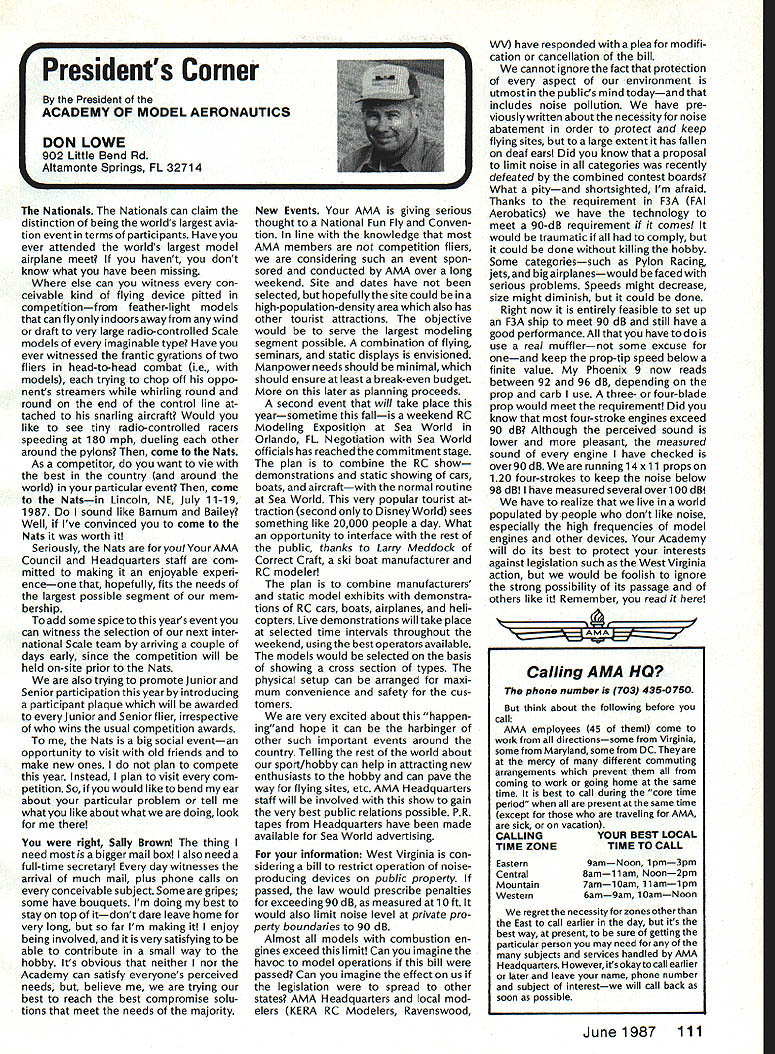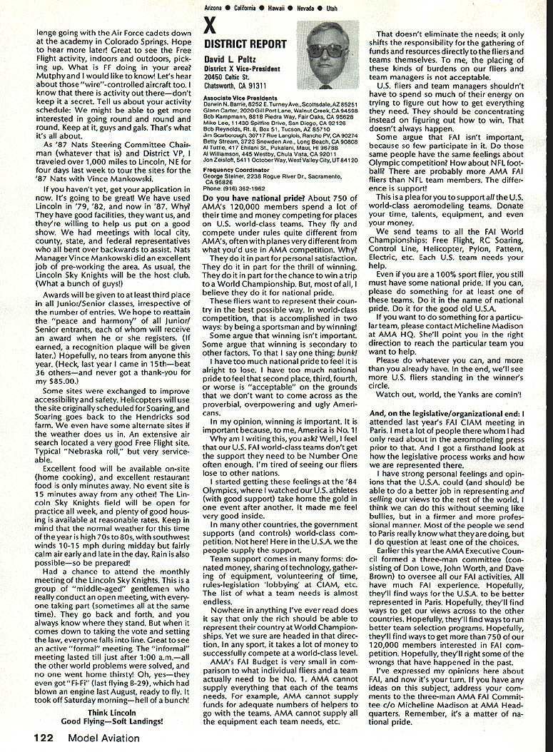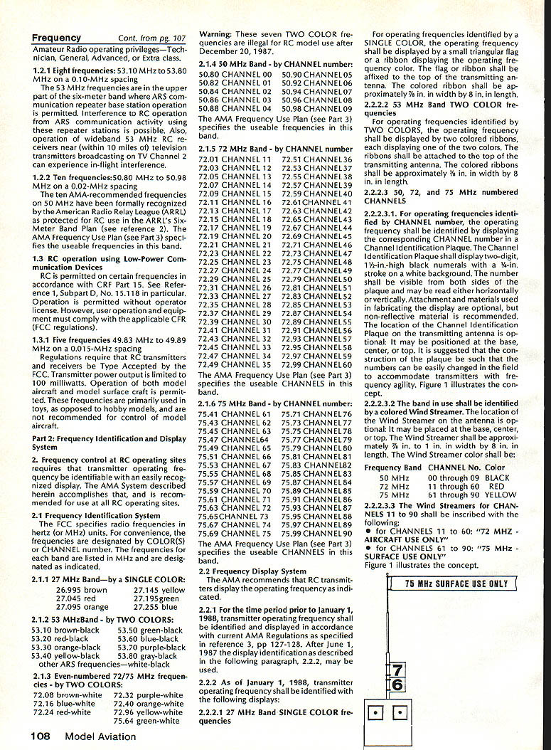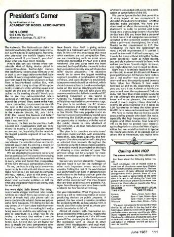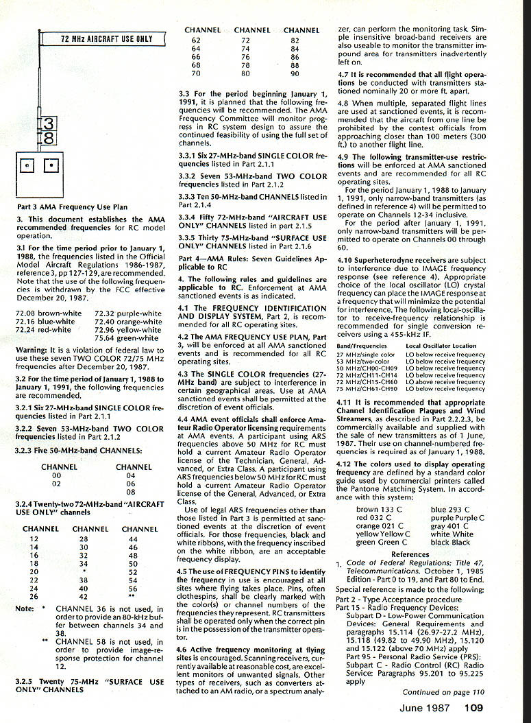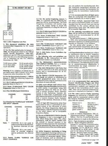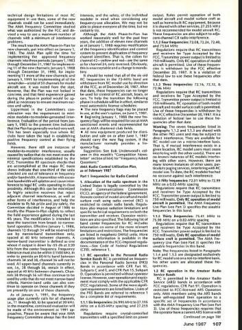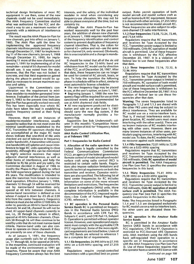 L r AMA Bylaws include various stand ing rules supplement Bylaws concerning details organization opera tion Among standing rules involving AMA Nominations Commit tee procedures making nomina tions AMA officers being elected year 1987 will electing AMA Executive Vice President Vice Presi dents Districts 37 1 ito serve threeyear terms beginning 1988 procedures nomination will follows Nominating Committee 1 Composition 11 Vice Presidents Execu tive Vice-President sit Nomina ting Committee will constitute Committee total b Members Nominating Commit tee shall barred becoming nominees office themselves c Voting proxies permitted long proxy same district absent Vice President has permis sion writing vote An Open member designated absent EVP may act proxy EVP telegram absentee will suffice written permission d The President may appoint member Committee nor ex officio member neither may Executive Director member Committee 1 Chairman a The chairman Nominating Com mittee shall elected among committee members majority vote b The current AMA President absence Executive Director will call meeting order Once chairman Nominating Committee elected President ED will relinquish chair leave meeting 3 Recording Secretary Recording Secretary shall keep full accurate detailed written minutes proceedings b assist Teller distribution collection tabulation ballots 5 Candidate Nominations nomination letters must received AMA Headquarters fifteen 15 days prior convening Nominating Committee Annual Meeting Furthermore letter acceptance bythe candidate must file AMA HQ prior meeting Because Nominating Committee scheduled meet July10 deadline nomination receipt AMA HQ close business Thursday june 25 6 Selection Nominees Limited three 3 upon ballot elective office b The assembly shall examine evaluate discuss written proposals candi dacy office see 5 nomination let ters shall read aloud Recording Secretary c The discussion period shall limited ten 10 minutes per candidate d An incumbent automatically placed ballot except vote 3/4 committee against may withhold cumbents name ballot see laws Article IX section 2 7 Voting a One vote per person per ballot b Oral voting shall district starting District progressing numerical ly ascending sequence through District Xl EVP desired voting secret ballots shall written c If placing incumbents name ballot question voting issue shall precede voting other nominees see 6d Voting placing nominees ballot shall follow sequence Presi dent Executive Vice President Vice Presi dents d When three names nom inated elimination will simple ma jority vote 8 Finalization Proceedings Recording Secretarys report see 3c shall submitted Vice Presidents EVP within 15 days meeting comments corrections approval report must approved 3/4 tendees meeting Vice Presidents EVP proxies 9 Adjournment An affirmative vote adjournment motion duly made seconded will ad journ meeting AMA RC Frequency Utilization Plan Fred Marks Jack Albrecht Warren Plohr first series articles being written members AMA Frequency Committee articles designed inform modeler developments status RC frequency matters sincerely hope will contribute understanding RC community large its support Frequency Utilization Plan response ques tions solicited Please direct input Bob Underwood AMA Headquarters first article will present update radio frequencies situation similar provided ModelAviation 1985 reported earlier history quest 80 RC channels granted 1983 information about AMAs inter nally planned allocation same complete reference however article presents comprehensive plan use channels including frequency iden tification system Note synopsis identification system presented April 1987 issue MA FCC approved 50 aircraft-onlyand 30 non-aircraft-only frequencies RC use December 20 1982 However due AMA HO SERVICES STAFFS Executive Director John Worth 0 Executive Coordinetor Joyce Hager S Comptroller Gisele Jackson 0 Competition Services Director Micheline Madison 0 NatsGeneral Manager Vince Mankowskie Special Services Director Carl Maroneyo Special Events Director Douglas Pratte Public Relations Dlrector Geoff Styles 0 Technical Dlrector Bob Underwood S Administrative Coordinator Bob Voislaveke Publications Director Carl H Wheeley 0 Membership Director Mike Woodtolke General Counsel Jeremiah Courtney 106 Model Aviation AMA HO Executive Director including reports AMA President Executive VP Vice-Presidents c submit President Executive Vice 1 ii Nominating President meeting chairman Executivee simple majority prevails See 6d ProcedureDirector full written report meetingexception results voting procedures within f three names submitted 48 hours after adjournmentdistrict national office chairman may 4Meeting Conductmove nomination acclamation a The President ED shall open meeting preside committee members elect chairman b The newly-elected chairman shall dis miss President ED appoint Recording Secretary Teller Teller shall candidate office AMAs Executive Council equivalent Board Directors basically composed President Esecutive Vice President Esecutive Director 11 district vice Presidents Bach officers provided space month AMA Hems publication What say space however isa matter personal viewpoint sole responsibility author views may may represent official position AMA Executive Council technical design limitations RC equipment use some new channels could used immediately AMA Frequency Committee studied what authorized FCC de vised way use maximum number channels minimum interference problems result AMA Phase-In-Plan new channels put effect January 1 1983 AMA Plan split time implementing approved frequency channels three periods January 11983 through December 311987 implement ing 11 new channels January 11988 through December 31 1990 imple menting 11 new channels January 11991 implementing remaindera total 50 channels model aircraft use noted start however Plan locked concrete field experience gained during phase-in period would ap plied necessary ensure m