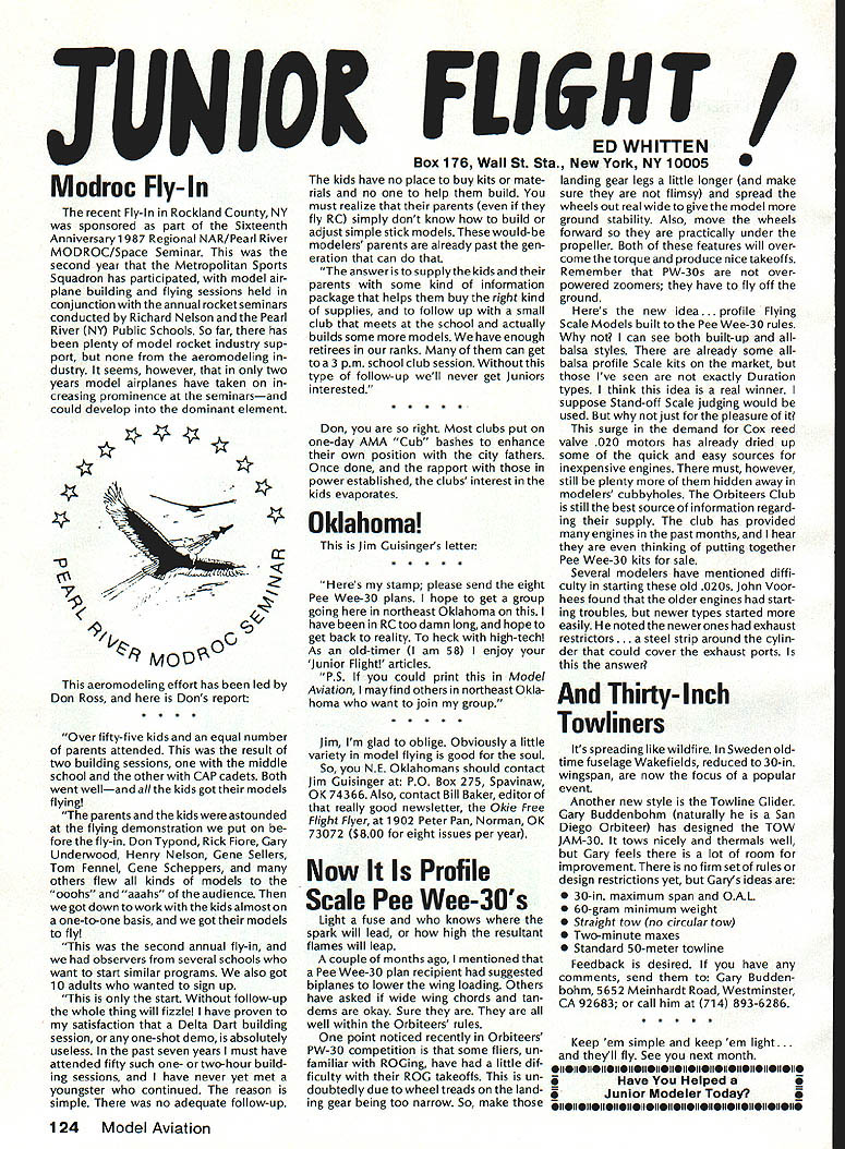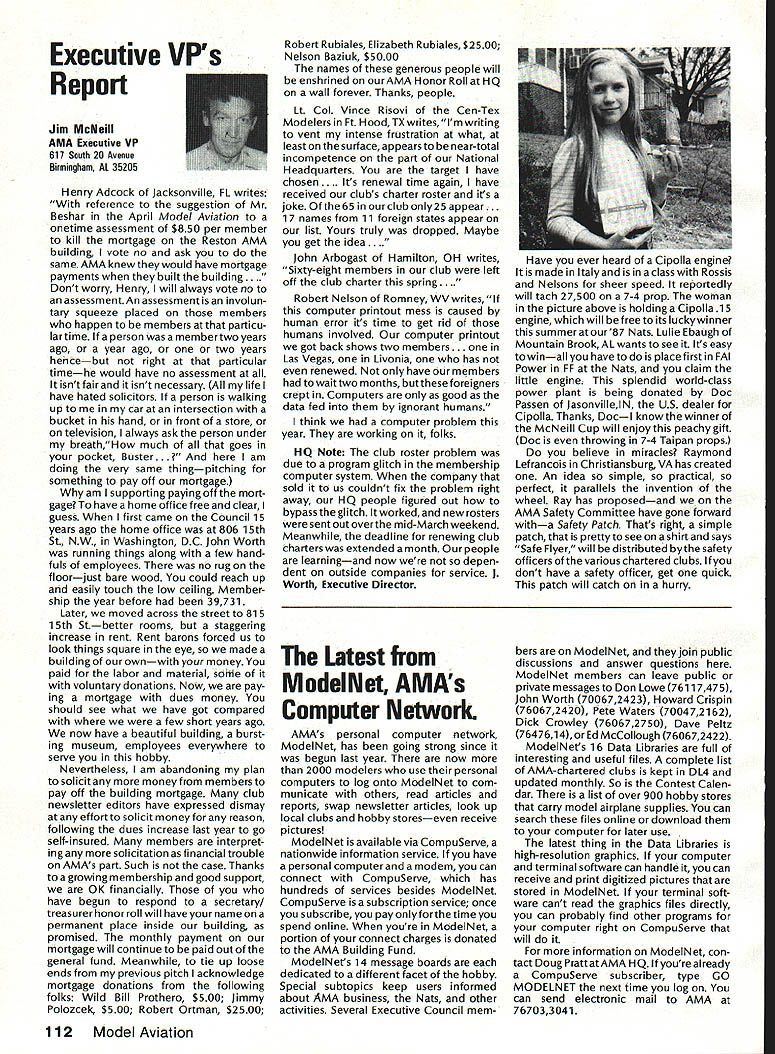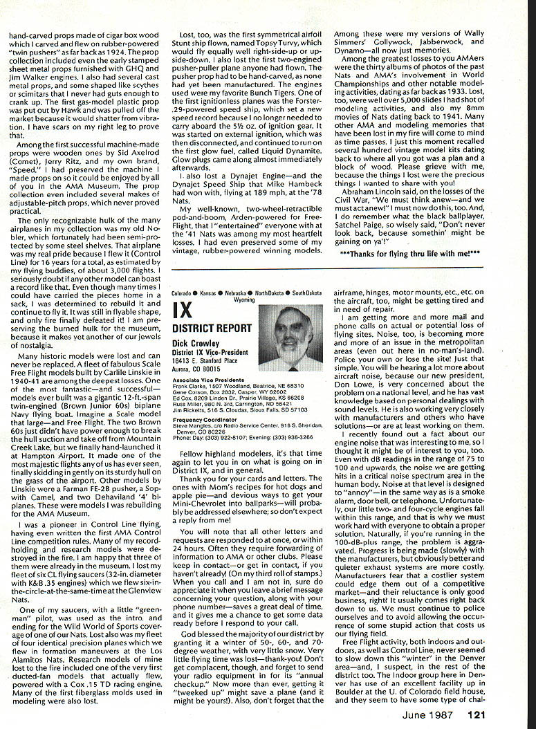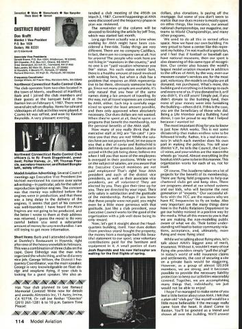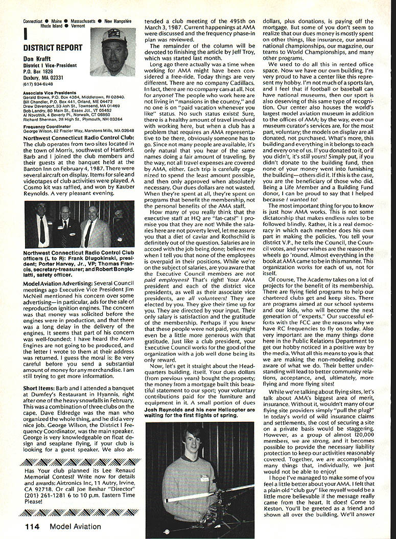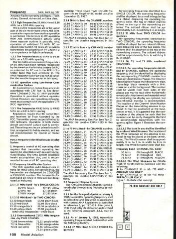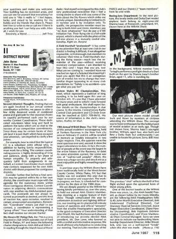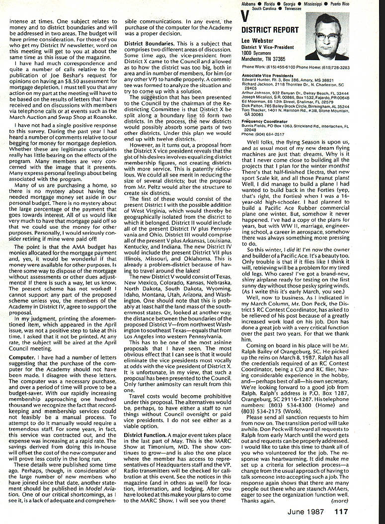 L r AMA Bylaws include various stand ing rules supplement Bylaws concerning details organization opera tion Among standing rules involving AMA Nominations Commit tee procedures making nomina tions AMA officers being elected year 1987 will electing AMA Executive Vice President Vice Presi dents Districts 37 1 ito serve threeyear terms beginning 1988 procedures nomination will follows Nominating Committee 1 Composition 11 Vice Presidents Execu tive Vice-President sit Nomina ting Committee will constitute Committee total b Members Nominating Commit tee shall barred becoming nominees office themselves c Voting proxies permitted long proxy same district absent Vice President has permis sion writing vote An Open member designated absent EVP may act proxy EVP telegram absentee will suffice written permission d The President may appoint member Committee nor ex officio member neither may Executive Director member Committee 1 Chairman a The chairman Nominating Com mittee shall elected among committee members majority vote b The current AMA President absence Executive Director will call meeting order Once chairman Nominating Committee elected President ED will relinquish chair leave meeting 3 Recording Secretary Recording Secretary shall keep full accurate detailed written minutes proceedings b assist Teller distribution collection tabulation ballots 5 Candidate Nominations nomination letters must received AMA Headquarters fifteen 15 days prior convening Nominating Committee Annual Meeting Furthermore letter acceptance bythe candidate must file AMA HQ prior meeting Because Nominating Committee scheduled meet July10 deadline nomination receipt AMA HQ close business Thursday june 25 6 Selection Nominees Limited three 3 upon ballot elective office b The assembly shall examine evaluate discuss written proposals candi dacy office see 5 nomination let ters shall read aloud Recording Secretary c The discussion period shall limited ten 10 minutes per candidate d An incumbent automatically placed ballot except vote 3/4 committee against may withhold cumbents name ballot see laws Article IX section 2 7 Voting a One vote per person per ballot b Oral voting shall district starting District progressing numerical ly ascending sequence through District Xl EVP desired voting secret ballots shall written c If placing incumbents name ballot question voting issue shall precede voting other nominees see 6d Voting placing nominees ballot shall follow sequence Presi dent Executive Vice President Vice Presi dents d When three names nom inated elimination will simple ma jority vote 8 Finalization Proceedings Recording Secretarys report see 3c shall submitted Vice Presidents EVP within 15 days meeting comments corrections approval report must approved 3/4 tendees meeting Vice Presidents EVP proxies 9 Adjournment An affirmative vote adjournment motion duly made seconded will ad journ meeting AMA RC Frequency Utilization Plan Fred Marks Jack Albrecht Warren Plohr first series articles being written members AMA Frequency Committee articles designed inform modeler developments status RC frequency matters sincerely hope will contribute understanding RC community large its support Frequency Utilization Plan response ques tions solicited Please direct input Bob Underwood AMA Headquarters first article will present update radio frequencies situation similar provided ModelAviation 1985 reported earlier history quest 80 RC channels granted 1983 information about AMAs inter nally planned allocation same complete reference however article presents comprehensive plan use channels including frequency iden tification system Note synopsis identification system presented April 1987 issue MA FCC approved 50 aircraft-onlyand 30 non-aircraft-only frequencies RC use December 20 1982 However due AMA HO SERVICES STAFFS Executive Director John Worth 0 Executive Coordinetor Joyce Hager S Comptroller Gisele Jackson 0 Competition Services Director Micheline Madison 0 NatsGeneral Manager Vince Mankowskie Special Services Director Carl Maroneyo Special Events Director Douglas Pratte Public Relations Dlrector Geoff Styles 0 Technical Dlrector Bob Underwood S Administrative Coordinator Bob Voislaveke Publications Director Carl H Wheeley 0 Membership Director Mike Woodtolke General Counsel Jeremiah Courtney 106 Model Aviation AMA HO Executive Director including reports AMA President Executive VP Vice-Presidents c submit President Executive Vice 1 ii Nominating President meeting chairman Executivee simple majority prevails See 6d ProcedureDirector full written report meetingexception results voting procedures within f three names submitted 48 hours after adjournmentdistrict national office chairman may 4Meeting Conductmove nomination acclamation a The President ED shall open meeting preside committee members elect chairman b The newly-elected chairman shall dis miss President ED appoint Recording Secretary Teller Teller shall candidate office AMAs Executive Council equivalent Board Directors basically composed President Esecutive Vice President Esecutive Director 11 district vice Presidents Bach officers provided space month AMA Hems publication What say space however isa matter personal viewpoint sole responsibility author views may may represent official position AMA Executive Council technical design limitations RC equipment use some new channels could used immediately AMA Frequency Committee studied what authorized FCC de vised way use maximum number channels minimum interference problems result AMA Phase-In-Plan new channels put effect January 1 1983 AMA Plan split time implementing approved frequency channels three periods January 11983 through December 311987 implement ing 11 new channels January 11988 through December 31 1990 imple menting 11 new channels January 11991 implementing remaindera total 50 channels model aircraft use noted start however Plan locked concrete field experience gained during phase-in period would ap plied necessary ensure m
