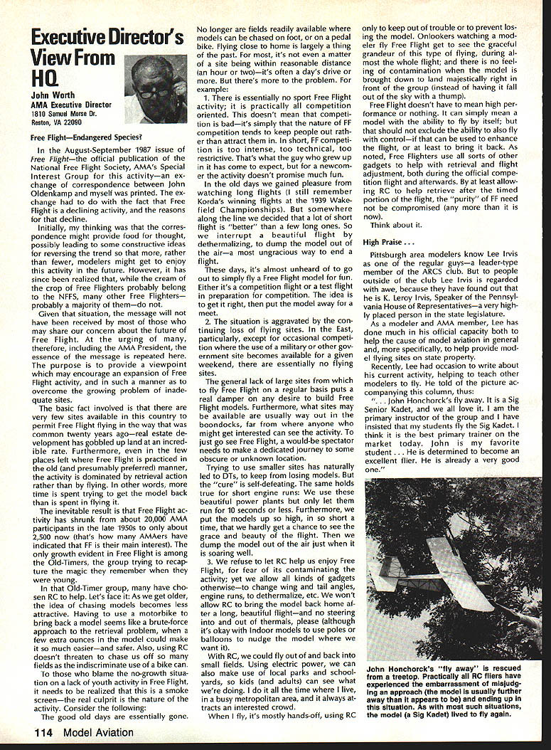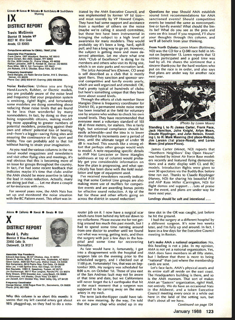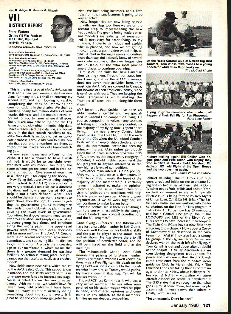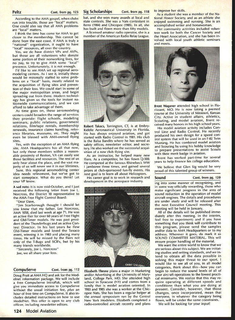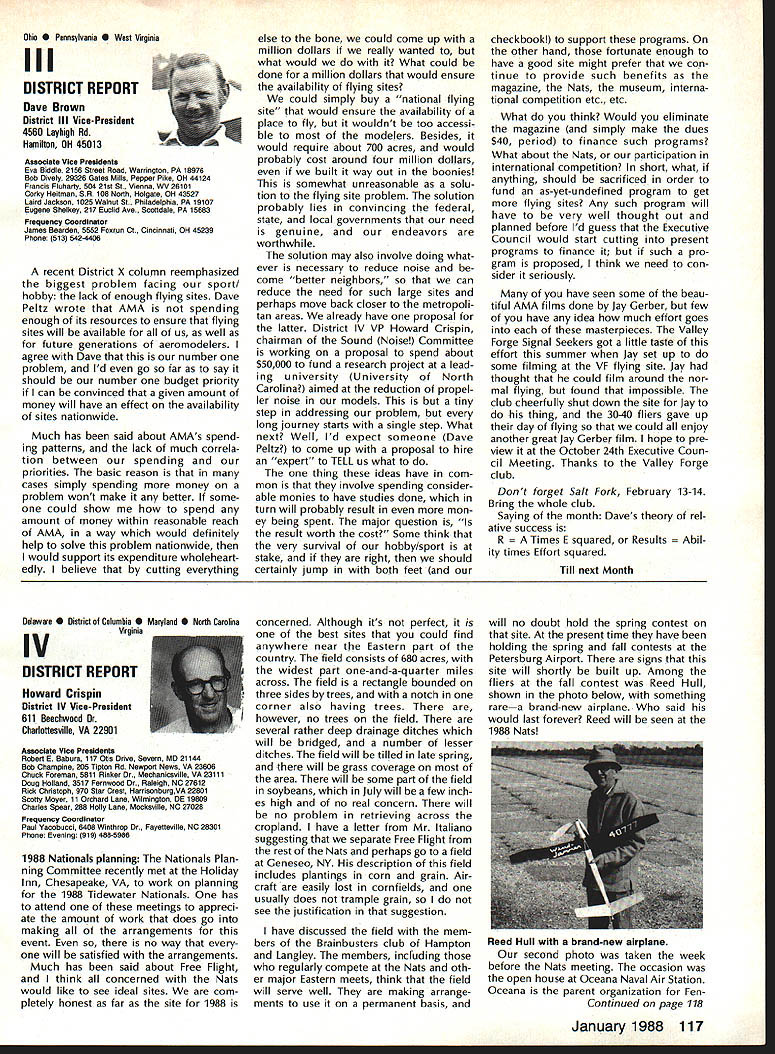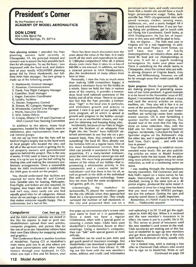 r Sig Memorial Scholarship Program Geoffrey Styles Director Public Relations Sig Scholarship fund created Hazel Sig-Hester President Sig Manufac turing Company honor husband Glen Sigafoose cofounder company killed 1980 crash Pitts Special during full-scale air show purpose fund assist col lege age students higher educa tion plans financial contributions Sig Company friends other supporters fund has become well estab lished fund administered AMA Any student AMA member active aeromodeling background financial need can apply no set number winners year 1986 win ners received $250 Checks have al ready sent specified universities 1986 winners Edward J Dumas Jr Knoxville TN has planning university education since early years aims career aerospace industry Living rural area part-time employment hard find Ed decided develop computer program would have commercial value hopes finance part education Continued page 118 Sound & Model Aemnautics Howard Crispin Jr AMA Executive Council met 24 25 October 1987 Among top ics discussion subject noise relates operation model aircraft struggle obtain flying sites working keep sites sound equipment very important have written about other wise discussed subject standard AMA has established operation past have informed published standard set FAI category F3A RC Aerobatics terms competition standard remains case addition however purposes trying provide some means working toward acceptable levels flying site Executive Council voted establish recommended sound level guide operation field level quite low would have preferred very good beginning nevertheless acceptand work towards accepting level maximum field will moving long way re gion quiet operation think technology already out go lower figure set Executive Council 90 dBA measured 9 ft 900 down wind muffler side aircraft achieve accurate measurement possible figure should taken over hard surface Measuring over pavement consistent readings taken over grass due variance depth grass moisture content soil condition can anywhere 2 6 dBA lower taken over pavement Mathematically level 250 ft aircraft will just over 61 dBA 500 ft will right 55 dBA have following some ar ticles Model Aviation other publications will recognize getting down acceptable ranges far local ordinances concerned However think should Continued page 120 Club Officers Free CompuServe Offer limited time officers newsletter editors chartered AMA clubs can get free introductory subscription Compu Serve CompuServe largest personal computer network country offering hundreds services over 300000 subscribers ModelNet personal com puter network operated AMA ser vice CompuServe Any personal computer has modem connect telephone lines can con nected CompuServe Thanks Compu Serves nationwide network phone numbers 80% households USA can access CompuServe local phone call Once connect CompuServe can access services including electronic mail instant news weather updates Electronic Mall shopping research services stock market quotations much Over 200 Forums provide message services free software text files downloading online information brand com puter imaginable Forums devot ed other interests like space exploration photography racing tropical fish science fiction ModelNet Forum devot ed models kinds Typing GO MODELNET takes Forum have messages waiting ad dressed youll told read can scan through 400 messages 18 message boards look ing subjects youre interested can contribute conversations replying message Topics cover entire spectrum modeling RC Indoor AMA officials staff online lively discussions rules Nats other issues need something AMA HQ message left ModelNets message board under Subtopic #1 AMA Business will get quick response ModelNets Data Libraries like elec tronic filing cabinets Articles Model Aviation lists clubs hobby shops Continued page 112 AMA HO SERVICES STAFF 0 Executive Director John Worth S Executive Coordinetor Joyce Hager 0 Comptroiier Gisele Jackson 0 Competition Services Director M icheline Madison 0 Nate Generai Managers Vince Mankowskio Specisi Services Director Carl MaroneyS Specisi Events Director Douglas Pratt 0 Pubiic Relations Director Geoff Styles S Technicai Directon Bob Underwood 0 Administrative Coordinator Bob VojalavekO Publications Director Carl R Wheeleye Membership Director MikeWoodfolke Generai Counsei Jeremiah Courtney January 1988 111 AMA HQ Executive Director including reports AMA President Executive VP Vice-Presidents ACADEMY OF MODEL AERONAUTICS 1810 Samuel Morse Dr Reston VA 22090 Worlds Largest Sport Aviation Organization AMAs Executive Council equivalent los Board Directors basically composed President Executive Vice President Executive Director 11 district Vice Presidents officers provided space month AMA News publication what say space however isa matterot personal viewpoint sole responsibility auttor views may may represent official position AMA Executive Council Presidents Corner President ACADEMY OF MODEL AERONAUTICS DON LOWE 902 Little Bend Rd Altamonte Springs FL 32714 Nats planning session attended Nats planning session held recently Chesapeake VA principal interest concern assure best possible facil ities categories say least impressed hard work dedica tion mostly VOLUNTEER planning group led Vince Mankowski fulltime AMA Nats manager core group made up following people V Mankowski General Manager C Foreman Communications S Frank Free Flight Category Manager J Guenther Scale Manager J Hager Executive Coordinator R Landry Facilities G Steiner Frequency Control B Stream RC Category Manager B Wisniewski Control Line Manager J Worth Executive Director E Witt Safety Officer H Crispin District IV VP Chairman AMA Council Nats Steering Committee addition above local supporters headed Mike Ingells attendance plus representatives spe cial interest groups Let say up front Nats will held Virginia largely due hard work local people located sites did up-front work getting lo cal property owners governmental agencies behin