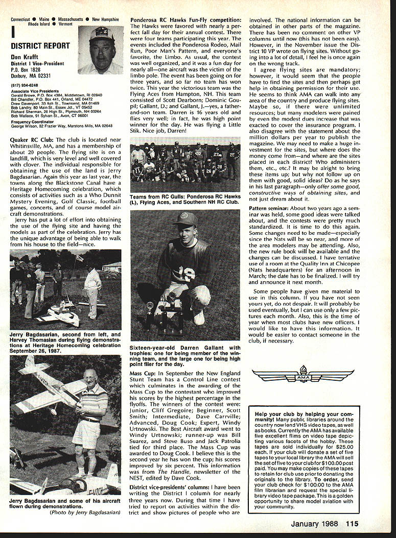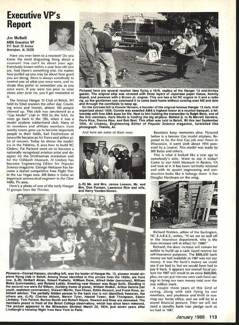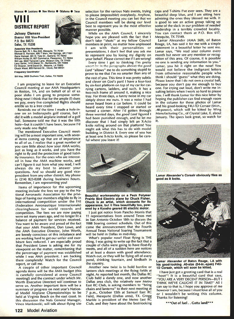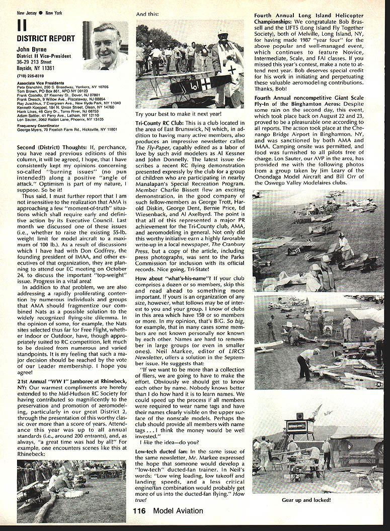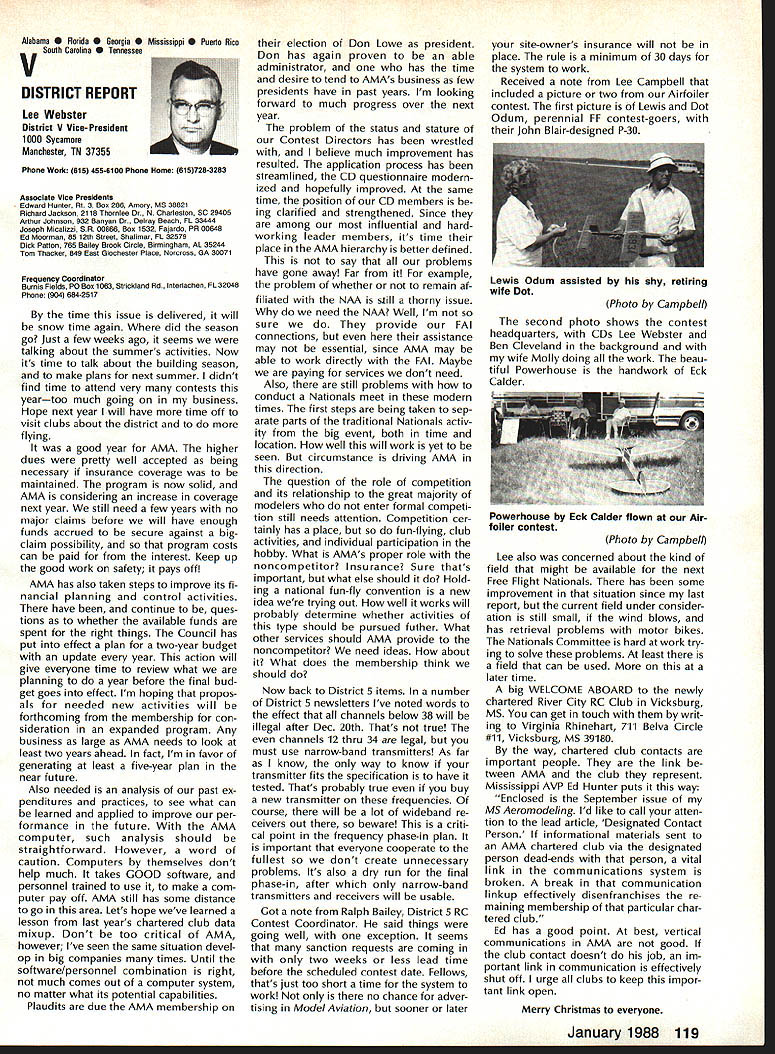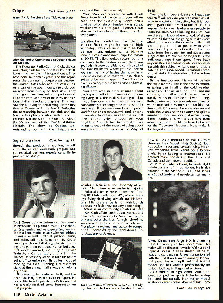 r Sig Memorial Scholarship Program Geoffrey Styles Director Public Relations Sig Scholarship fund created Hazel Sig-Hester President Sig Manufac turing Company honor husband Glen Sigafoose cofounder company killed 1980 crash Pitts Special during full-scale air show purpose fund assist col lege age students higher educa tion plans financial contributions Sig Company friends other supporters fund has become well estab lished fund administered AMA Any student AMA member active aeromodeling background financial need can apply no set number winners year 1986 win ners received $250 Checks have al ready sent specified universities 1986 winners Edward J Dumas Jr Knoxville TN has planning university education since early years aims career aerospace industry Living rural area part-time employment hard find Ed decided develop computer program would have commercial value hopes finance part education Continued page 118 Sound & Model Aemnautics Howard Crispin Jr AMA Executive Council met 24 25 October 1987 Among top ics discussion subject noise relates operation model aircraft struggle obtain flying sites working keep sites sound equipment very important have written about other wise discussed subject standard AMA has established operation past have informed published standard set FAI category F3A RC Aerobatics terms competition standard remains case addition however purposes trying provide some means working toward acceptable levels flying site Executive Council voted establish recommended sound level guide operation field level quite low would have preferred very good beginning nevertheless acceptand work towards accepting level maximum field will moving long way re gion quiet operation think technology already out go lower figure set Executive Council 90 dBA measured 9 ft 900 down wind muffler side aircraft achieve accurate measurement possible figure should taken over hard surface Measuring over pavement consistent readings taken over grass due variance depth grass moisture content soil condition can anywhere 2 6 dBA lower taken over pavement Mathematically level 250 ft aircraft will just over 61 dBA 500 ft will right 55 dBA have following some ar ticles Model Aviation other publications will recognize getting down acceptable ranges far local ordinances concerned However think should Continued page 120 Club Officers Free CompuServe Offer limited time officers newsletter editors chartered AMA clubs can get free introductory subscription Compu Serve CompuServe largest personal computer network country offering hundreds services over 300000 subscribers ModelNet personal com puter network operated AMA ser vice CompuServe Any personal computer has modem connect telephone lines can con nected CompuServe Thanks Compu Serves nationwide network phone numbers 80% households USA can access CompuServe local phone call Once connect CompuServe can access services including electronic mail instant news weather updates Electronic Mall shopping research services stock market quotations much Over 200 Forums provide message services free software text files downloading online information brand com puter imaginable Forums devot ed other interests like space exploration photography racing tropical fish science fiction ModelNet Forum devot ed models kinds Typing GO MODELNET takes Forum have messages waiting ad dressed youll told read can scan through 400 messages 18 message boards look ing subjects youre interested can contribute conversations replying message Topics cover entire spectrum modeling RC Indoor AMA officials staff online lively discussions rules Nats other issues need something AMA HQ message left ModelNets message board under Subtopic #1 AMA Business will get quick response ModelNets Data Libraries like elec tronic filing cabinets Articles Model Aviation lists clubs hobby shops Continued page 112 AMA HO SERVICES STAFF 0 Executive Director John Worth S Executive Coordinetor Joyce Hager 0 Comptroiier Gisele Jackson 0 Competition Services Director M icheline Madison 0 Nate Generai Managers Vince Mankowskio Specisi Services Director Carl MaroneyS Specisi Events Director Douglas Pratt 0 Pubiic Relations Director Geoff Styles S Technicai Directon Bob Underwood 0 Administrative Coordinator Bob VojalavekO Publications Director Carl R Wheeleye Membership Director MikeWoodfolke Generai Counsei Jeremiah Courtney January 1988 111 AMA HQ Executive Director including reports AMA President Executive VP Vice-Presidents ACADEMY OF MODEL AERONAUTICS 1810 Samuel Morse Dr Reston VA 22090 Worlds Largest Sport Aviation Organization AMAs Executive Council equivalent los Board Directors basically composed President Executive Vice President Executive Director 11 district Vice Presidents officers provided space month AMA News publication what say space however isa matterot personal viewpoint sole responsibility auttor views may may represent official position AMA Executive Council Presidents Corner President ACADEMY OF MODEL AERONAUTICS DON LOWE 902 Little Bend Rd Altamonte Springs FL 32714 Nats planning session attended Nats planning session held recently Chesapeake VA principal interest concern assure best possible facil ities categories say least impressed hard work dedica tion mostly VOLUNTEER planning group led Vince Mankowski fulltime AMA Nats manager core group made up following people V Mankowski General Manager C Foreman Communications S Frank Free Flight Category Manager J Guenther Scale Manager J Hager Executive Coordinator R Landry Facilities G Steiner Frequency Control B Stream RC Category Manager B Wisniewski Control Line Manager J Worth Executive Director E Witt Safety Officer H Crispin District IV VP Chairman AMA Council Nats Steering Committee addition above local supporters headed Mike Ingells attendance plus representatives spe cial interest groups Let say up front Nats will held Virginia largely due hard work local people located sites did up-front work getting lo cal property owners governmental agencies behin