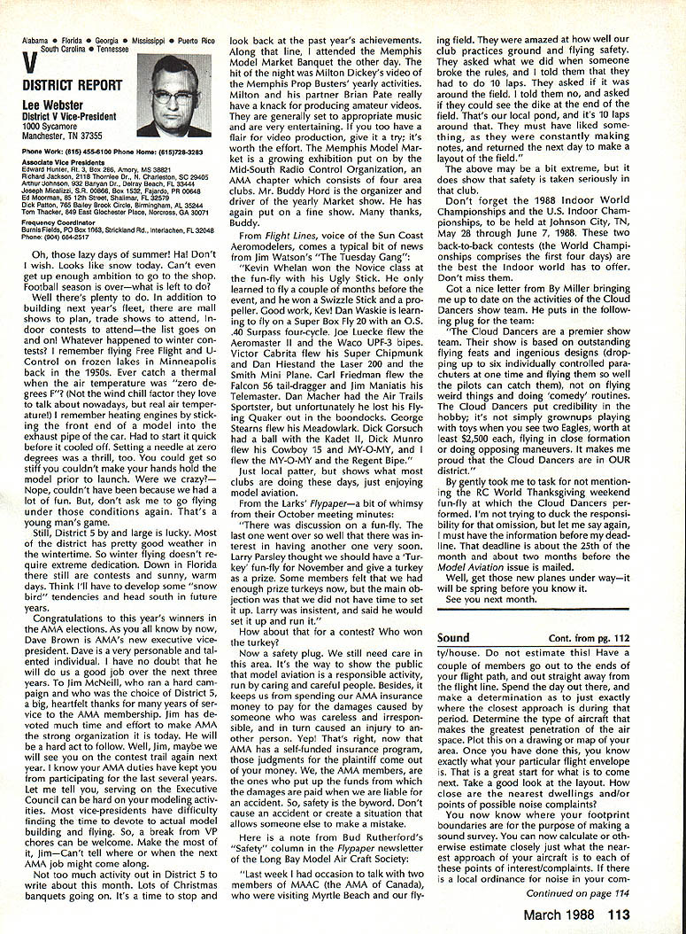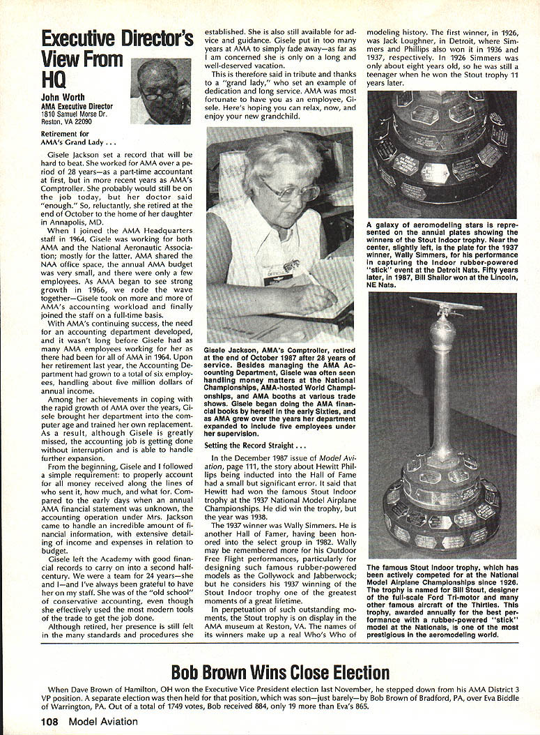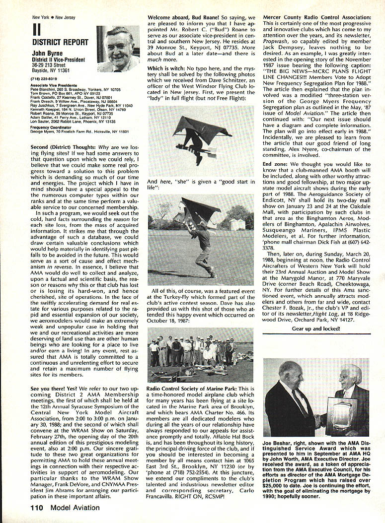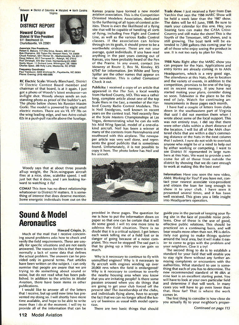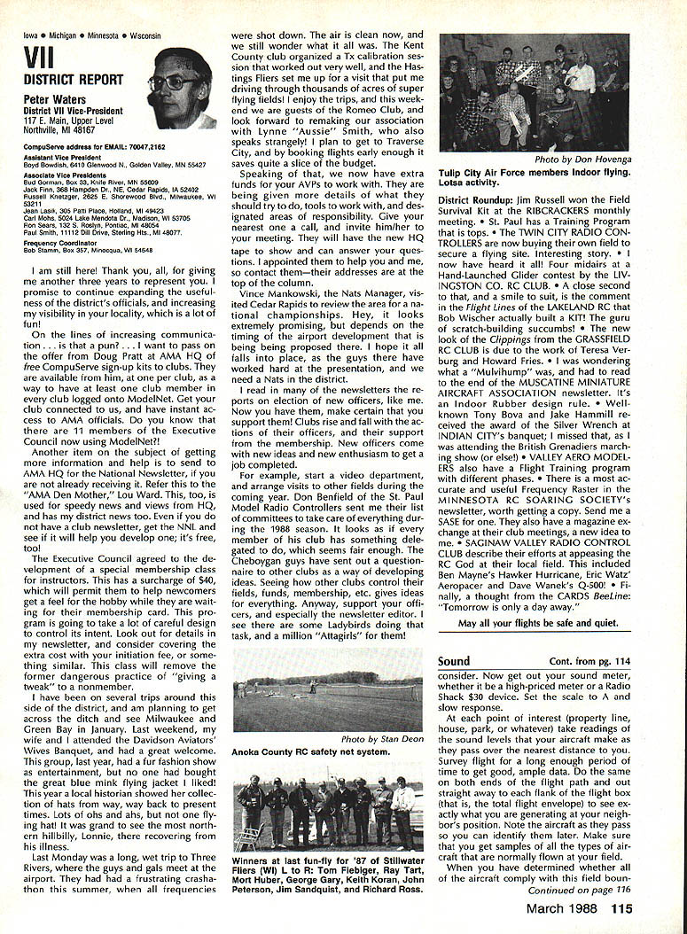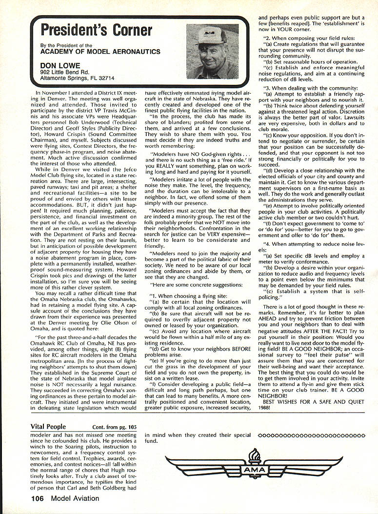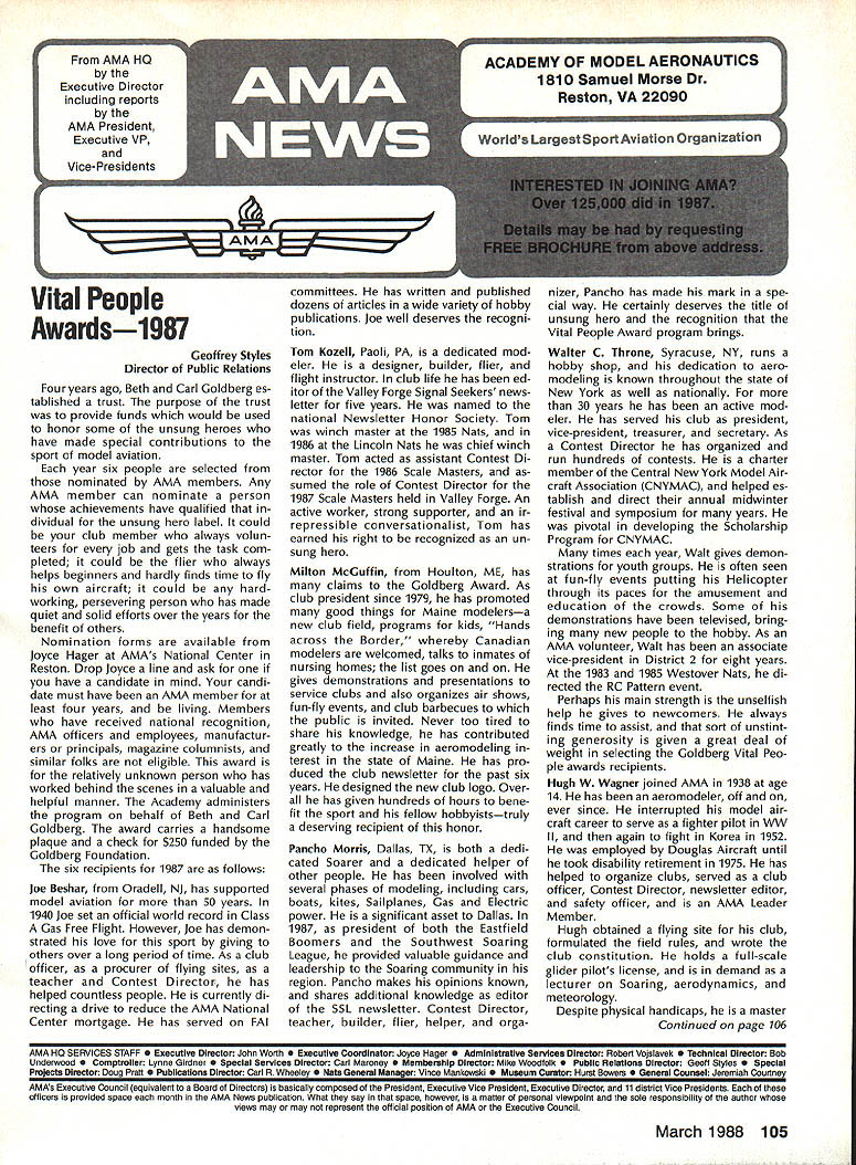 Vital People Awards1987 Geoff rey Styles Director Public Relations Four years ago Beth Carl Goldberg es tablished trust purpose trust provide funds would used honor some unsung heroes have made special contributions sport model aviation year six people selected nominated AMA members Any AMA member can nominate person achievements have qualified dividual unsung hero label could club member always volun teers job gets task com pleted could flier always helps beginners hardly finds time fly own aircraft could hard working persevering person has made quiet solid efforts over years benefit others Nomination forms available Joyce Hager AMAs National Center Reston Drop Joyce line ask have candidate mind candi date must have AMA member least four years living Members have received national recognition AMA officers employees manufactur ers principals magazine columnists similar folks eligible award relatively unknown person has worked behind scenes valuable helpful manner Academy administers program behalf Beth Carl Goldberg award carries handsome plaque check $250 funded Goldberg Foundation six recipients 1987 follows Joe Beshar Oradell NJ has supported model aviation 50 years 1940 Joe set official world record Class Gas Free Flight However Joe has demon strated love sport giving others over long period time As club officer procurer flying sites teacher Contest Director has helped countless people currently di recting drive reduce AMA National Center mortgage has served FAI committees has written published dozens articles wide variety hobby publications Joe well deserves recogni tion Tom Kozell Paoli PA dedicated mod eler designer builder flier flight instructor club life has ed itor Valley Forge Signal Seekers news letter five years named national Newsletter Honor Society Tom winch master 1985 Nats 1986 Lincoln Nats chief winch master Tom acted assistant Contest Di rector 1986 Scale Masters sumed role Contest Director 1987 Scale Masters held Valley Forge An active worker strong supporter ir repressible conversationalist Tom has earned right recognized un sung hero Milton McGuffin Houlton ME has claims Goldberg Award As club president since 1979 has promoted good things Maine modelersa new club field programs kids Hands across Border whereby Canadian modelers welcomed talks inmates nursing homes list goes on gives demonstrations presentations service clubs also organizes air shows fun-fly events club barbecues public invited Never too tired share knowledge has contributed greatly increase aeromodeling terest state Maine has pro duced club newsletter past six years designed new club logo Over has given hundreds hours bene fit sport fellow hobbyiststruly deserving recipient honor Pancho Morris Dallas TX both dedi cated Soarer dedicated helper other people has involved several phases modeling including cars boats kites Sailplanes Gas Electric power significant asset Dallas 1987 president both Eastfield Boomers Southwest Soaring League provided valuable guidance leadership Soaring community region Pancho makes opinions known shares additional knowledge editor SSL newsletter Contest Director teacher builder flier helper orga nizer Pancho has made mark spe cial way certainly deserves title unsung hero recognition Vital People Award program brings Walter C Throne Syracuse NY runs hobby shop dedication aero modeling known throughout state New York well nationally 30 years has active mod eler has served club president vice-president treasurer secretary As Contest Director has organized run hundreds contests charter member Central New York Model Air craft Association CNYMAC helped es tablish direct annual midwinter festival symposium years pivotal developing Scholarship Program CNYMAC times year Walt gives demon strations youth groups often seen fun-fly events putting Helicopter through its paces amusement education crowds Some demonstrations have televised bring ing new people hobby As AMA volunteer Walt has associate vice-president District 2 eight years 1983 1985 Westover Nats di rected RC Pattern event Perhaps main strength unselfish help gives newcomers always finds time assist sort unstint ing generosity given great deal weight selecting Goldberg Vital Peo ple awards recipients Hugh W Wagner joined AMA 1938 age 14 has aeromodeler off ever since interrupted model air craft career serve fighter pilot WW II again fight Korea 1952 employed Douglas Aircraft until took disability retirement 1975 has helped organize clubs served club officer Contest Director newsletter editor safety officer AMA Leader Member Hugh obtained flying site club formulated field rules wrote club constitution holds full-scale glider pilots license demand lecturer Soaring aerodynamics meteorology Despite physical handicaps master Continued page 106 AMA HO SERVICES STAFF 0 executive Director John Worth 0 ExecutIve Coordinator Joyce Hager 0 AdministratIve Services Director Robert voalavek 0 Technical Director Bob underwood 0 Comptroller Lynne Girdner S Special Services Director Carl Maroney ership Director Mike Woodfolk 0 Public Relations Director Geoff Styles ial Projecta Director Doug Pratt 0 PublicatIons Director Carl R VVheeleye Nate General Manager Vince Mankoweki S Museum Curator Hurst Bowers 0 Genersl Counsel Jeremiah Courtney March 1988 105 AMA HO Executive Director including reports AMA President Executive VP Vice-Presidents L L AMAs Executive Council equivalent Board Directors basically composed President Executive vice President Executive Director 11 district Vice Presidents officers provided space month AMA News publication What say space however matter personal viewpoint sole responsibility Ihe author views may may represent official position AMA Executive Council Presidents Corner President ACADEMY OF MODEL AERONAUTICS DON LOWE 902 Little Bend Rd Altamonte Springs FL 32714 November attended District IX meet ing Denver meeting well orga nized attended invited participate district VP Travis McGin nis associate VPs Headqua