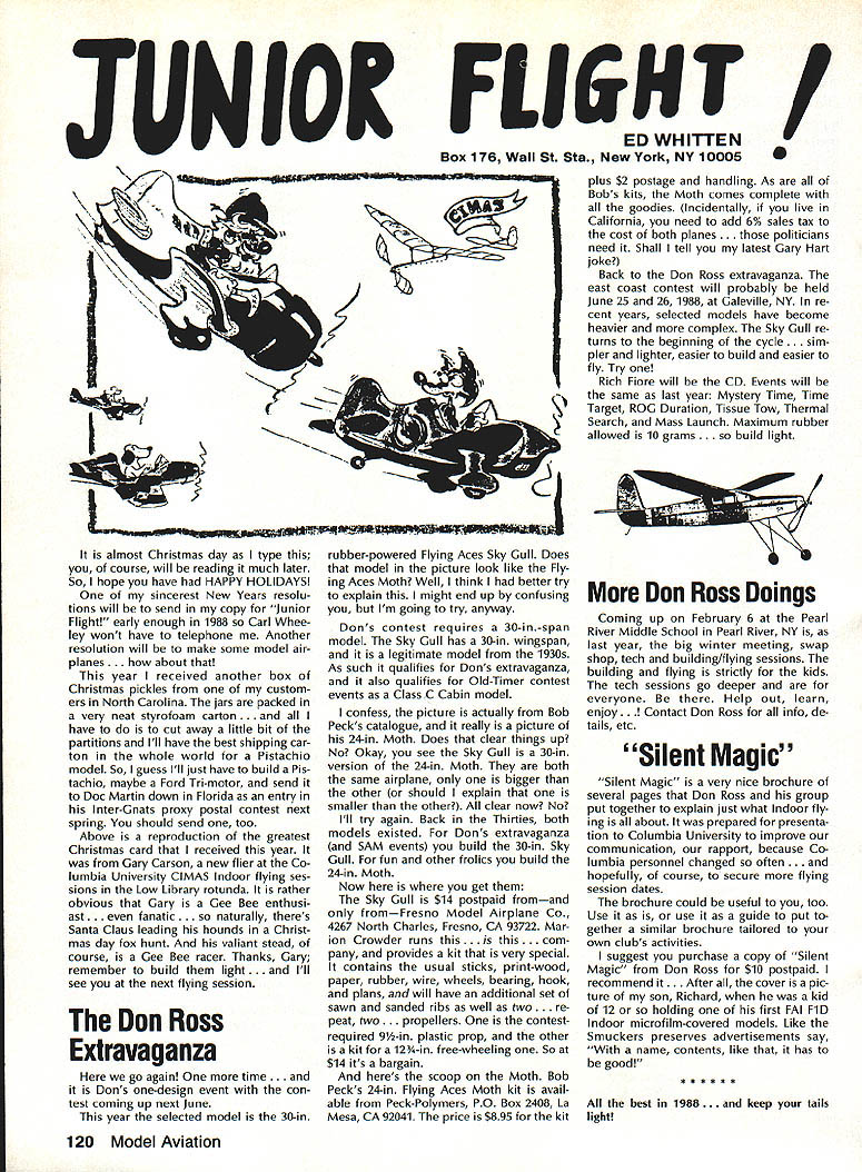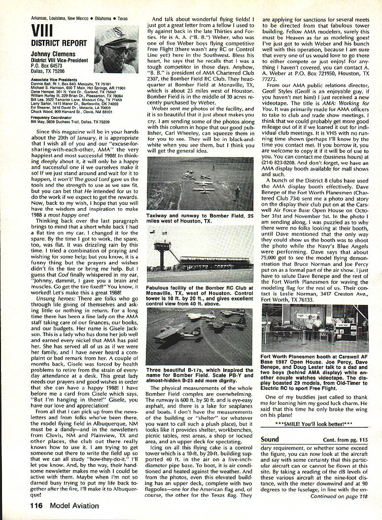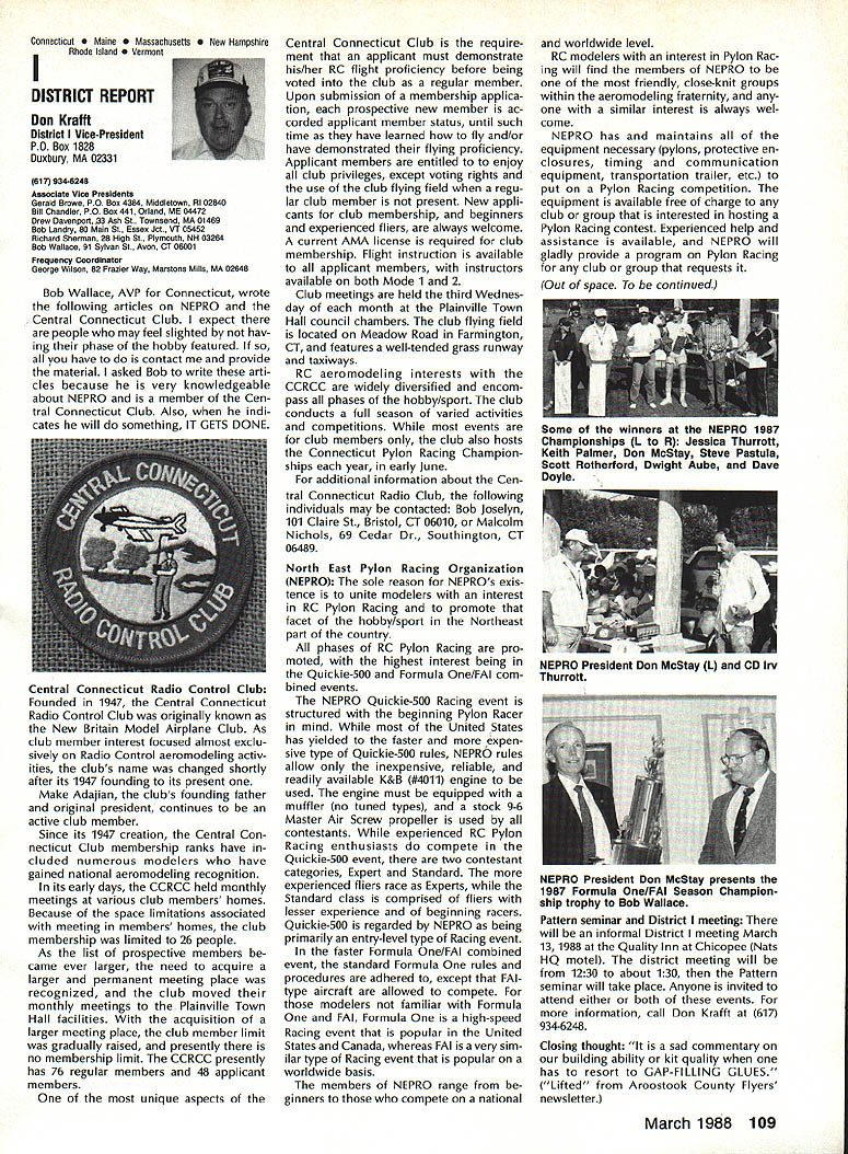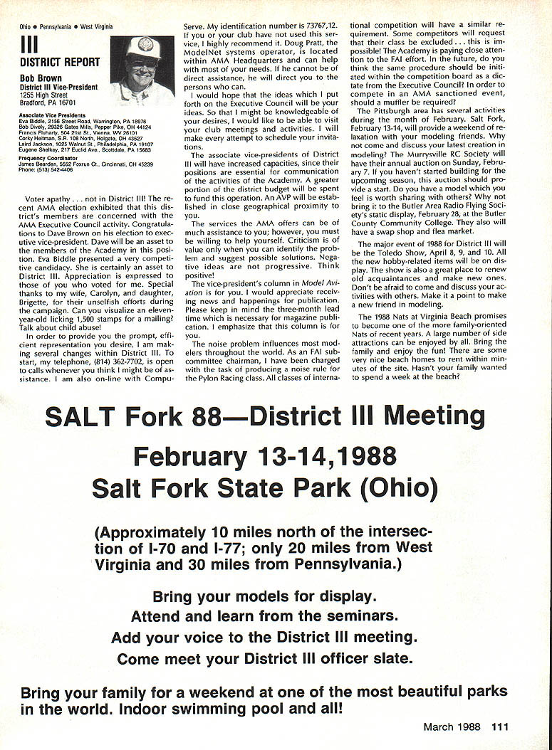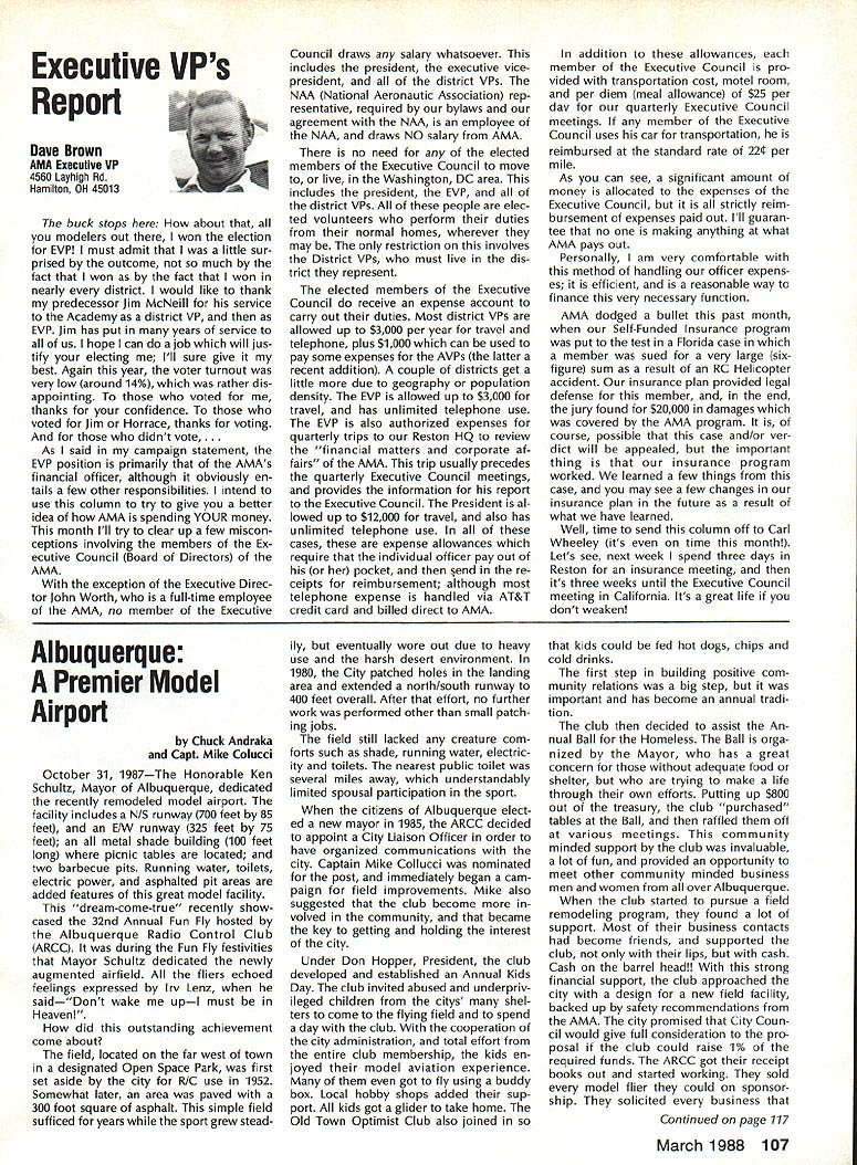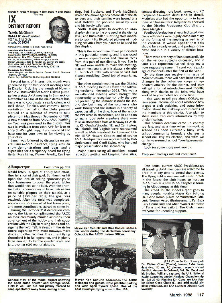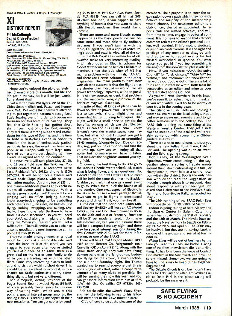 Vital People Awards1987 Geoff rey Styles Director Public Relations Four years ago Beth Carl Goldberg es tablished trust purpose trust provide funds would used honor some unsung heroes have made special contributions sport model aviation year six people selected nominated AMA members Any AMA member can nominate person achievements have qualified dividual unsung hero label could club member always volun teers job gets task com pleted could flier always helps beginners hardly finds time fly own aircraft could hard working persevering person has made quiet solid efforts over years benefit others Nomination forms available Joyce Hager AMAs National Center Reston Drop Joyce line ask have candidate mind candi date must have AMA member least four years living Members have received national recognition AMA officers employees manufactur ers principals magazine columnists similar folks eligible award relatively unknown person has worked behind scenes valuable helpful manner Academy administers program behalf Beth Carl Goldberg award carries handsome plaque check $250 funded Goldberg Foundation six recipients 1987 follows Joe Beshar Oradell NJ has supported model aviation 50 years 1940 Joe set official world record Class Gas Free Flight However Joe has demon strated love sport giving others over long period time As club officer procurer flying sites teacher Contest Director has helped countless people currently di recting drive reduce AMA National Center mortgage has served FAI committees has written published dozens articles wide variety hobby publications Joe well deserves recogni tion Tom Kozell Paoli PA dedicated mod eler designer builder flier flight instructor club life has ed itor Valley Forge Signal Seekers news letter five years named national Newsletter Honor Society Tom winch master 1985 Nats 1986 Lincoln Nats chief winch master Tom acted assistant Contest Di rector 1986 Scale Masters sumed role Contest Director 1987 Scale Masters held Valley Forge An active worker strong supporter ir repressible conversationalist Tom has earned right recognized un sung hero Milton McGuffin Houlton ME has claims Goldberg Award As club president since 1979 has promoted good things Maine modelersa new club field programs kids Hands across Border whereby Canadian modelers welcomed talks inmates nursing homes list goes on gives demonstrations presentations service clubs also organizes air shows fun-fly events club barbecues public invited Never too tired share knowledge has contributed greatly increase aeromodeling terest state Maine has pro duced club newsletter past six years designed new club logo Over has given hundreds hours bene fit sport fellow hobbyiststruly deserving recipient honor Pancho Morris Dallas TX both dedi cated Soarer dedicated helper other people has involved several phases modeling including cars boats kites Sailplanes Gas Electric power significant asset Dallas 1987 president both Eastfield Boomers Southwest Soaring League provided valuable guidance leadership Soaring community region Pancho makes opinions known shares additional knowledge editor SSL newsletter Contest Director teacher builder flier helper orga nizer Pancho has made mark spe cial way certainly deserves title unsung hero recognition Vital People Award program brings Walter C Throne Syracuse NY runs hobby shop dedication aero modeling known throughout state New York well nationally 30 years has active mod eler has served club president vice-president treasurer secretary As Contest Director has organized run hundreds contests charter member Central New York Model Air craft Association CNYMAC helped es tablish direct annual midwinter festival symposium years pivotal developing Scholarship Program CNYMAC times year Walt gives demon strations youth groups often seen fun-fly events putting Helicopter through its paces amusement education crowds Some demonstrations have televised bring ing new people hobby As AMA volunteer Walt has associate vice-president District 2 eight years 1983 1985 Westover Nats di rected RC Pattern event Perhaps main strength unselfish help gives newcomers always finds time assist sort unstint ing generosity given great deal weight selecting Goldberg Vital Peo ple awards recipients Hugh W Wagner joined AMA 1938 age 14 has aeromodeler off ever since interrupted model air craft career serve fighter pilot WW II again fight Korea 1952 employed Douglas Aircraft until took disability retirement 1975 has helped organize clubs served club officer Contest Director newsletter editor safety officer AMA Leader Member Hugh obtained flying site club formulated field rules wrote club constitution holds full-scale glider pilots license demand lecturer Soaring aerodynamics meteorology Despite physical handicaps master Continued page 106 AMA HO SERVICES STAFF 0 executive Director John Worth 0 ExecutIve Coordinator Joyce Hager 0 AdministratIve Services Director Robert voalavek 0 Technical Director Bob underwood 0 Comptroller Lynne Girdner S Special Services Director Carl Maroney ership Director Mike Woodfolk 0 Public Relations Director Geoff Styles ial Projecta Director Doug Pratt 0 PublicatIons Director Carl R VVheeleye Nate General Manager Vince Mankoweki S Museum Curator Hurst Bowers 0 Genersl Counsel Jeremiah Courtney March 1988 105 AMA HO Executive Director including reports AMA President Executive VP Vice-Presidents L L AMAs Executive Council equivalent Board Directors basically composed President Executive vice President Executive Director 11 district Vice Presidents officers provided space month AMA News publication What say space however matter personal viewpoint sole responsibility Ihe author views may may represent official position AMA Executive Council Presidents Corner President ACADEMY OF MODEL AERONAUTICS DON LOWE 902 Little Bend Rd Altamonte Springs FL 32714 November attended District IX meet ing Denver meeting well orga nized attended invited participate district VP Travis McGin nis associate VPs Headqua