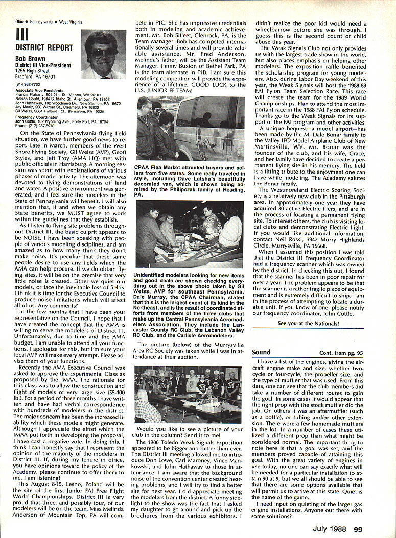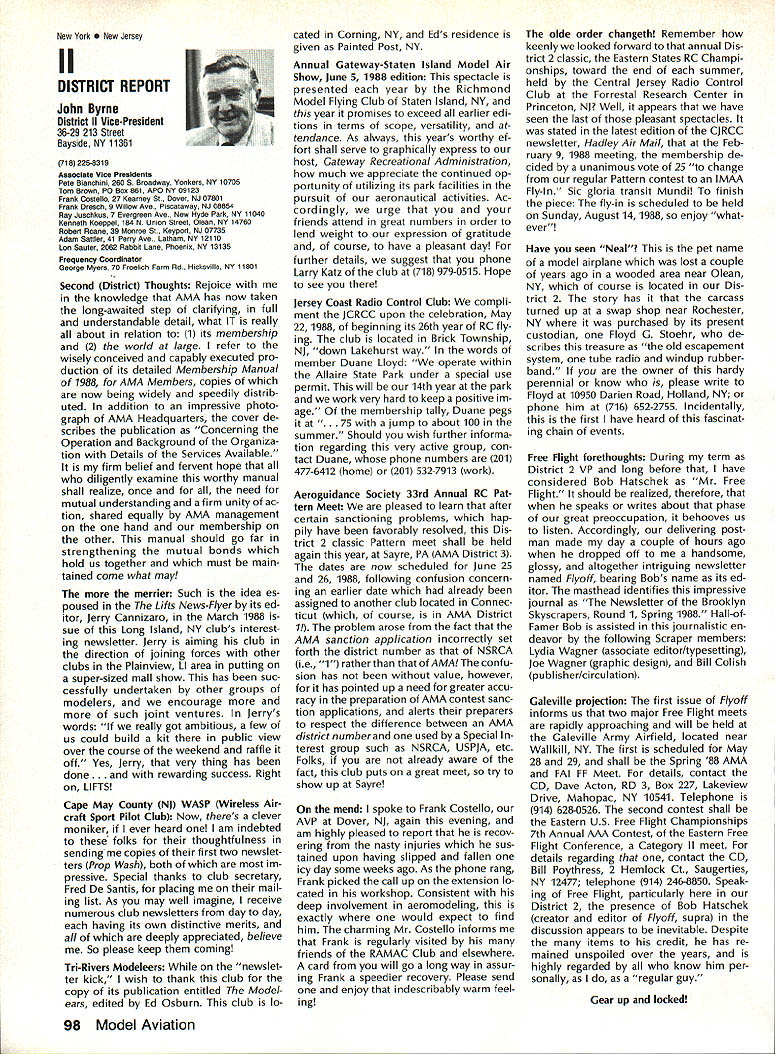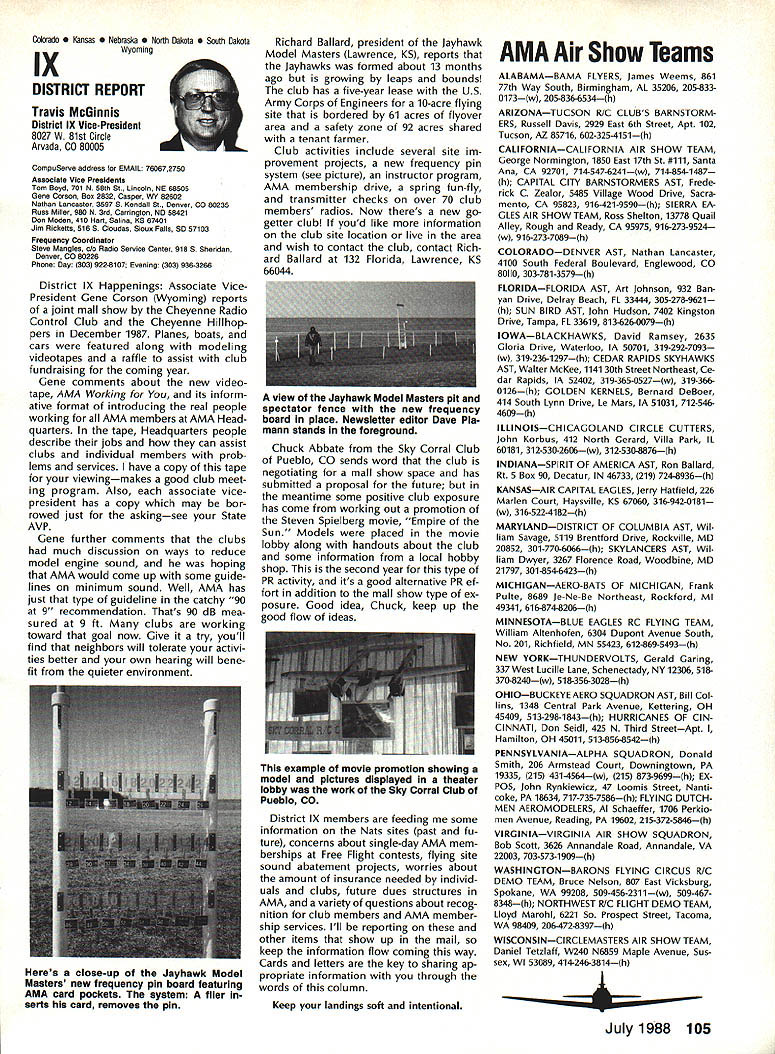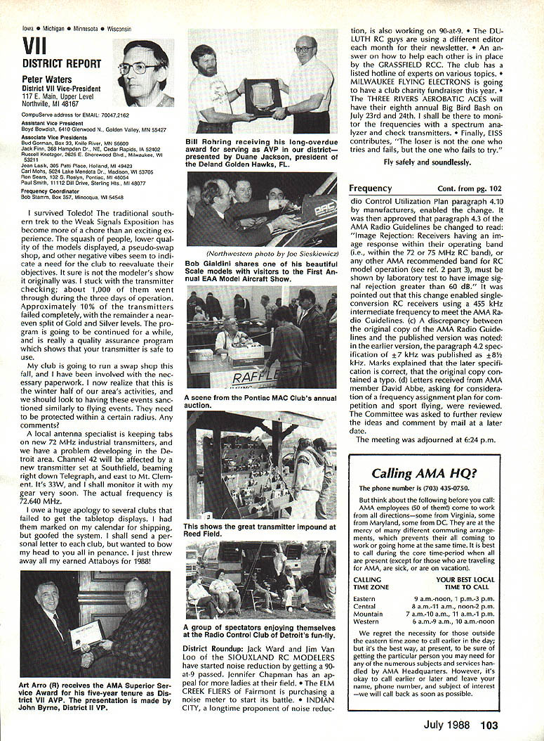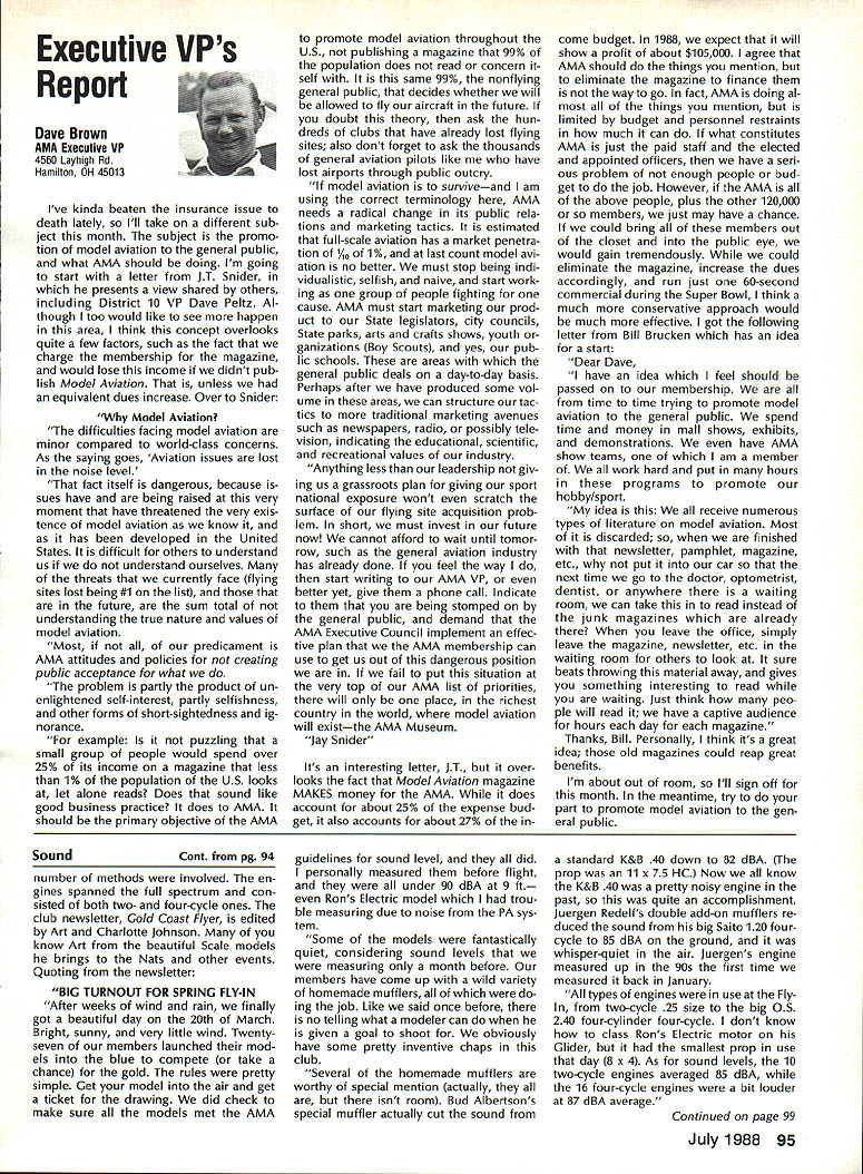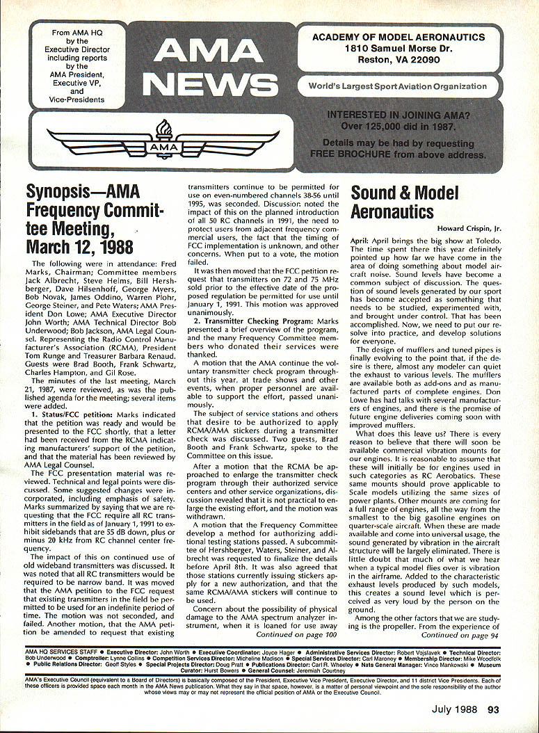 7SynopsisAMA Frequency Commit tee Meeting March 12 1988 following attendance Fred Marks Chairman Committee members Jack Albrecht Steve Helms Bill Hersh berger Dave Hilsenhoff George Myers Bob Novak James Oddino Warren Plohr George Steiner Pete Waters AMA Pres ident Don Lowe AMA Executive Director John Worth AMA Technical Director Bob Underwood Bob Jackson AMA Legal Coun sel Representing Radio Control Manu facturers Association RCMA President Tom Runge Treasurer Barbara Renaud Guests Brad Booth Frank Schwartz Charles Hampton Gil Rose minutes last meeting March 21 1987 reviewed pub lished agenda meeting several items added 1 Status/FCC petition Marks indicated petition ready would presented FCC shortly letter received RCMA indicat ing manufacturers support petition material has reviewed AMA Legal Counsel FCC presentation material re viewed Technical legal points dis cussed Some suggested changes corporated including emphasis safety Marks summarized saying re questing FCC require RC trans mitters field January 11991 ex hibit sidebands 55 dB down plus minus 20 kHz RC channel center fre q uency impact continued use old wideband transmitters discussed noted RC transmitters would required narrow band moved AMA petition FCC request existing transmitters field per mitted used indefinite period time motion seconded failed Another motion AMA peti tion amended request existing transmitters continue permitted use even-numbered channels 38-56 until 1995 seconded Discussion noted impact planned introduction 50 RC channels 1991 need protect users adjacent frequency com mercial users fact timing FCC implementation unknown other concerns put vote motion failed moved FCC petition re quest transmitters 72 75 MHz sold prior effective date pro posed regulation permitted use until January 11991 motion approved unanimously 2 Transmitter Checking Program Marks presented brief overview program Frequency Committee mem bers donated services thanked motion AMA continue vol untary transmitter check program through out year trade shows other events proper personnel avail able support effort passed unani mously subject service stations others desire authorized apply RCMA/AMA stickers during transmitter check discussed Two guests Brad Booth Frank Schwartz spoke Committee issue After motion RCMA ap proached enlarge transmitter check program through authorized service centers other service organizations dis cussion revealed practical en large existing effort motion withdrawn motion Frequency Committee develop method authorizing addi tional testing stations passed subcommit tee Hershberger Waters Steiner Al brecht requested finalize details before April 8th also agreed stations currently issuing stickers ap ply new authorization same RCMAIAMA stickers will continue used Concern about possibility physical damage AMA spectrum analyzer strument loaned use away Continued page 100 Howard Crispin Jr April April brings big show Toledo time spent year definitely pointed up far have come area doing something about model air craft noise Sound levels have become common subject discussion ques tion sound levels generated sport has become accepted something needs studied experimented brought under control has accomplished Now need put re solve practice develop solutions everyone design mufflers tuned pipes finally evolving point de sire almost modeler can quiet exhaust various levels mufflers available both add-ons manu factured parts complete engines Don Lowe has talks several manufactur ers engines promise future engine deliveries coming soon improved mufflers What does leave us reason believe will soon available commercial vibration mounts engines reasonable assume will initially engines used such categories RC Aerobatics same mounts should prove applicable Scale models utilizing same sizes power plants Other mounts coming full range engines way smallest big gasoline engines quarter-scale aircraft made available come universal usage sound generated vibration aircraft structure will largely eliminated little doubt much what hear typical model flies over vibration airframe Added characteristic exhaust levels produced such models creates sound level per ceived very loud person ground Among other factors study ing propeller experience Continued page 94 AMA HO SERVICES STAFF 0 ExecutIve Director John worth 0 Executive Coordinator Joyce Hager 0 Administrative Services Director Robert Vojslavek Technical Director Bob underwood S Comptroller Lynne Collins 0 Competition Services Director Micheline Madison 0 Special Services Director Carl Maroney ership Director Mike Woodlolk 0 Public Relations Director Geoff Styles ial Projects Director Doug Pratt 0 PublicatIons Director Carl R wheeley S Nets General Manager vince Mankowaki 0 Museum Curator Hurst Bowers 0 General Counsel Jeremiah Courtney July 1988 93 AMA HQ Executive Director including reports AMA President Executive VP Vice-Presidents Sound & Model Aeronautics AMAs Executive Council lequivalent Board Directors basically composed ot President Executive vice President Executive Director 11 district vice Presidents officers provided space month AMA News publicstion What say space however matter personal viewpoint sole responsibility author views may may represent official position AMA Executive Council Flying site survey nothing im portant health model aviation having good place fly crea tions clubs struggle prob lem keeping field have search ing new site obviously finan cial limit what AMA can about would great resources buy flying sites over country thats impossible Personally would like see day AMA owns operates least sitemaybe someday have taken initiative pulse peo ple control public lands such military FAA National Parks peo ple enlist support use pub lic lands already have positive re sponse FAA NAA helping quest using its influence Currently military has local option situation use military bases model flying base commander authorized allow use noninterference basis want influence loca