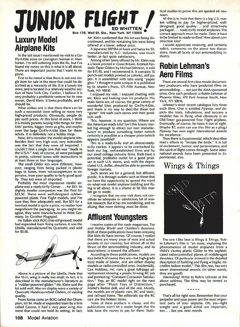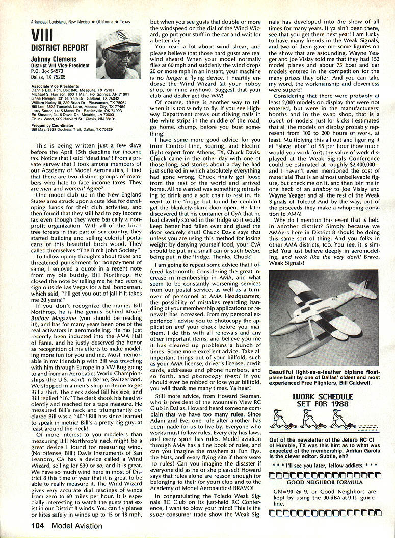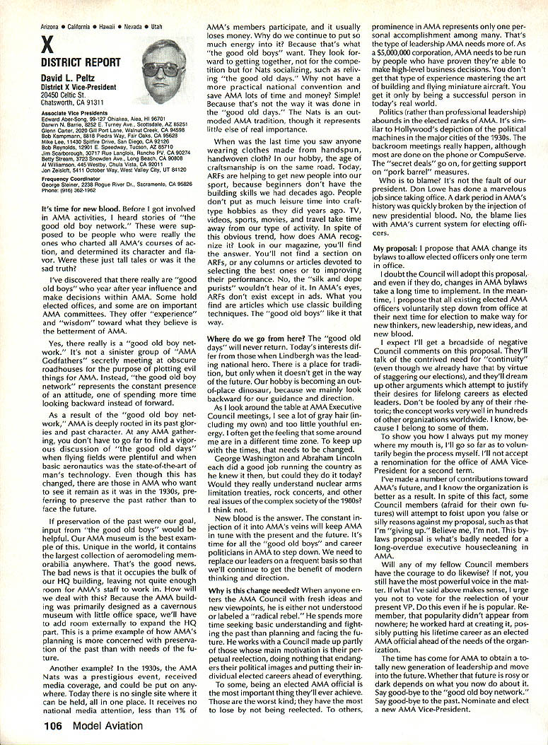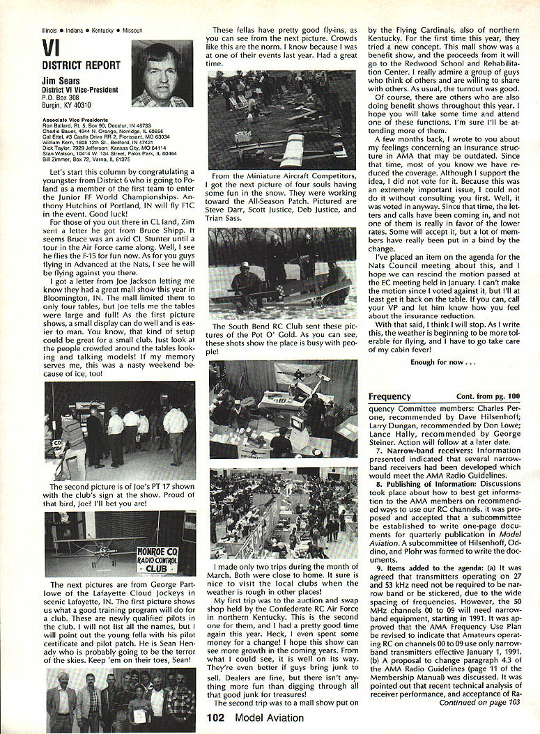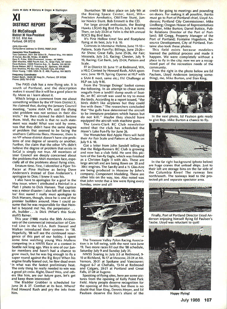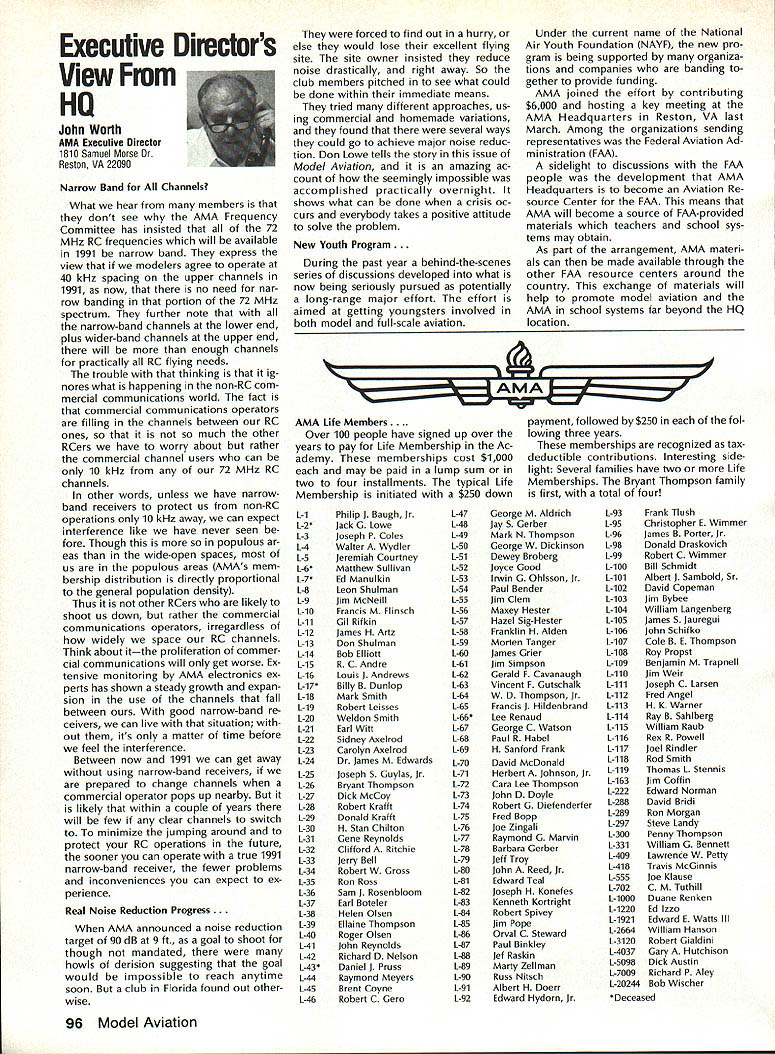 7SynopsisAMA Frequency Commit tee Meeting March 12 1988 following attendance Fred Marks Chairman Committee members Jack Albrecht Steve Helms Bill Hersh berger Dave Hilsenhoff George Myers Bob Novak James Oddino Warren Plohr George Steiner Pete Waters AMA Pres ident Don Lowe AMA Executive Director John Worth AMA Technical Director Bob Underwood Bob Jackson AMA Legal Coun sel Representing Radio Control Manu facturers Association RCMA President Tom Runge Treasurer Barbara Renaud Guests Brad Booth Frank Schwartz Charles Hampton Gil Rose minutes last meeting March 21 1987 reviewed pub lished agenda meeting several items added 1 Status/FCC petition Marks indicated petition ready would presented FCC shortly letter received RCMA indicat ing manufacturers support petition material has reviewed AMA Legal Counsel FCC presentation material re viewed Technical legal points dis cussed Some suggested changes corporated including emphasis safety Marks summarized saying re questing FCC require RC trans mitters field January 11991 ex hibit sidebands 55 dB down plus minus 20 kHz RC channel center fre q uency impact continued use old wideband transmitters discussed noted RC transmitters would required narrow band moved AMA petition FCC request existing transmitters field per mitted used indefinite period time motion seconded failed Another motion AMA peti tion amended request existing transmitters continue permitted use even-numbered channels 38-56 until 1995 seconded Discussion noted impact planned introduction 50 RC channels 1991 need protect users adjacent frequency com mercial users fact timing FCC implementation unknown other concerns put vote motion failed moved FCC petition re quest transmitters 72 75 MHz sold prior effective date pro posed regulation permitted use until January 11991 motion approved unanimously 2 Transmitter Checking Program Marks presented brief overview program Frequency Committee mem bers donated services thanked motion AMA continue vol untary transmitter check program through out year trade shows other events proper personnel avail able support effort passed unani mously subject service stations others desire authorized apply RCMA/AMA stickers during transmitter check discussed Two guests Brad Booth Frank Schwartz spoke Committee issue After motion RCMA ap proached enlarge transmitter check program through authorized service centers other service organizations dis cussion revealed practical en large existing effort motion withdrawn motion Frequency Committee develop method authorizing addi tional testing stations passed subcommit tee Hershberger Waters Steiner Al brecht requested finalize details before April 8th also agreed stations currently issuing stickers ap ply new authorization same RCMAIAMA stickers will continue used Concern about possibility physical damage AMA spectrum analyzer strument loaned use away Continued page 100 Howard Crispin Jr April April brings big show Toledo time spent year definitely pointed up far have come area doing something about model air craft noise Sound levels have become common subject discussion ques tion sound levels generated sport has become accepted something needs studied experimented brought under control has accomplished Now need put re solve practice develop solutions everyone design mufflers tuned pipes finally evolving point de sire almost modeler can quiet exhaust various levels mufflers available both add-ons manu factured parts complete engines Don Lowe has talks several manufactur ers engines promise future engine deliveries coming soon improved mufflers What does leave us reason believe will soon available commercial vibration mounts engines reasonable assume will initially engines used such categories RC Aerobatics same mounts should prove applicable Scale models utilizing same sizes power plants Other mounts coming full range engines way smallest big gasoline engines quarter-scale aircraft made available come universal usage sound generated vibration aircraft structure will largely eliminated little doubt much what hear typical model flies over vibration airframe Added characteristic exhaust levels produced such models creates sound level per ceived very loud person ground Among other factors study ing propeller experience Continued page 94 AMA HO SERVICES STAFF 0 ExecutIve Director John worth 0 Executive Coordinator Joyce Hager 0 Administrative Services Director Robert Vojslavek Technical Director Bob underwood S Comptroller Lynne Collins 0 Competition Services Director Micheline Madison 0 Special Services Director Carl Maroney ership Director Mike Woodlolk 0 Public Relations Director Geoff Styles ial Projects Director Doug Pratt 0 PublicatIons Director Carl R wheeley S Nets General Manager vince Mankowaki 0 Museum Curator Hurst Bowers 0 General Counsel Jeremiah Courtney July 1988 93 AMA HQ Executive Director including reports AMA President Executive VP Vice-Presidents Sound & Model Aeronautics AMAs Executive Council lequivalent Board Directors basically composed ot President Executive vice President Executive Director 11 district vice Presidents officers provided space month AMA News publicstion What say space however matter personal viewpoint sole responsibility author views may may represent official position AMA Executive Council Flying site survey nothing im portant health model aviation having good place fly crea tions clubs struggle prob lem keeping field have search ing new site obviously finan cial limit what AMA can about would great resources buy flying sites over country thats impossible Personally would like see day AMA owns operates least sitemaybe someday have taken initiative pulse peo ple control public lands such military FAA National Parks peo ple enlist support use pub lic lands already have positive re sponse FAA NAA helping quest using its influence Currently military has local option situation use military bases model flying base commander authorized allow use noninterference basis want influence loca