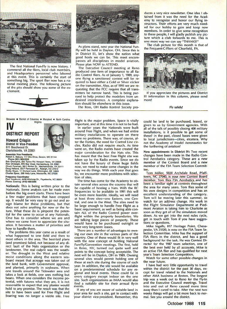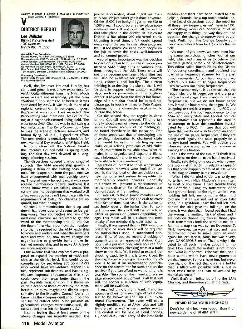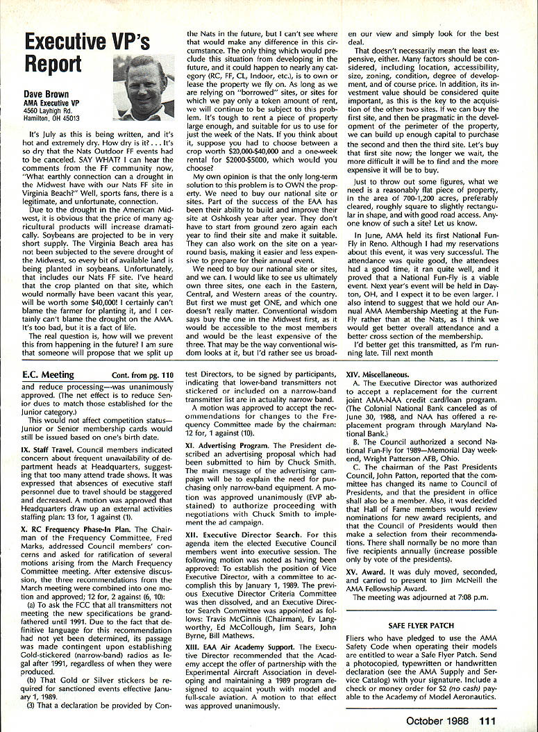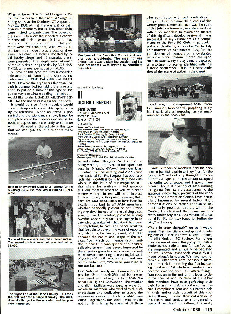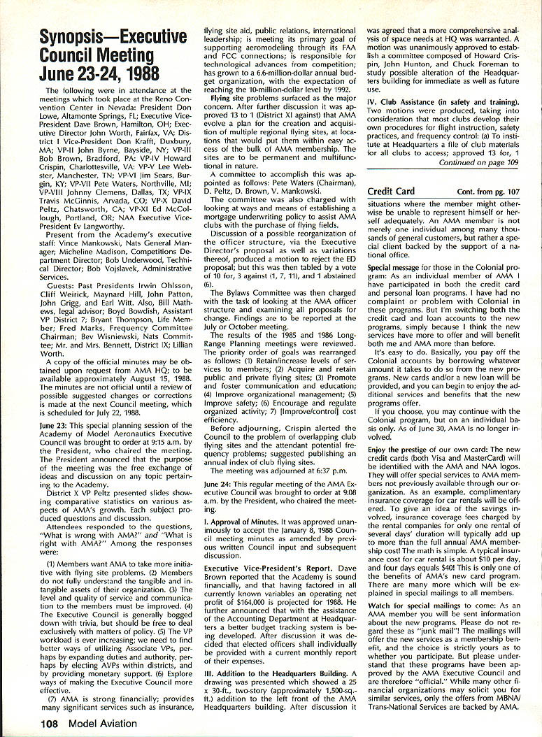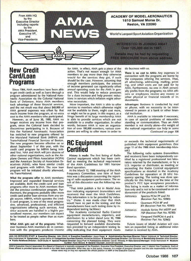 Since 1984 AMA members have able get credit cards well loans through program administered National Aero nautic Association via Colonial National Bank Delaware AMA members took advantage financial services net result about $40000 AMA general expenses offset much income program no extra cost AMA members participated However June 30 1988 AMA no longer receives income pro gram since Colonial bank decided discontinue participating Because National Aeronautic Association has switched new programs offered Maryland National Bank MBNA Trans-National Financial Services Boston new programs become effective about September 1 year credit card program MBNA being initi ated first NAA AMA will join dozens other national organizations such Air plane Owners Pilots Association AOPA American Society Association Ex ecutives ASAE have similar credit card programs MBNA new loan program will initiated shortly afterward via Trans-National What programs offer AMA members Improved expanded financial services available Both credit card loan programs offer AMA members did previous combination program Fur thermore programs probably offer credit card and/or loan services sin gle source MBNA operates cred card program progres sive advanced professional efficient organizations offering such services since accounts handled highly per sonalized manner members can expect treated people rather num bers What AMA gets out programs What ever business AMA members connec tion programs produces income AMA effect AMA gets piece action Thats reason enough AMA members pay otherwise would services get such should case However assuming enough members participate amount income generated can significantly offset annual operating costs AMA gen eral would help reduce pressures dues increase help prevent reduc tions services inflation might other wise necessitate important AMA able offer services members otherwise might available might cost might great respect fringe benefit its large membership AMA able provide services available smaller organization other words because AMA now organiza tion over 100000 members various com panies willing offer order RC Equipment Certified History made first listing Radio Control equipment has certi fied meeting technical requirement AMA Guidelines 1991 Narrow Band operation March 12 1988 meeting AMA Frequency Committee item busi ness discussion concerning report ing radio equipment performance re sult discussion following mo tion AMA publish list Model Avia tion indicating equipment transmitters receivers meet AMA Guidelines information provided indus try Note made clear AMA would have no part testing manufacturers have such testing done dependent testing facilities Academy contacted Radio Control equipment manufacturers importers distributors letter dated June 10 1988 concerning planned listing requested forward available documenta tion provided independent testing fa cility indicating equipment meets no cost AMA Any expenses connection programs borne companies offering services Thus advertising addressing mailing print ing other costs paid AMA Furthermore no AMA person ally profits programs no AMA offi cers employees receive money other physical financial rewards ducements Advantages Business conducted mail phone no necessity inter viewed person bank other finan cial institution AMA available intercede necessary case special problems misunder standing communication Thus AMA member strictly alonethe weight national organization can help some Continued page 108 exceeds technical requirements published AMA equipment guidelines See page 11 1988 AMA Membership Man ual following radio systems transmitters receivers have independently cer tified registered professional test labo ratory retained manufacturer US importer distributor meeting exceeding Radio Control equipment specifications detailed Academy Guidelines operation 20 kHz fre quency spacing testing done spe cifically listing time products FCC type acceptance procedure listing made matter informa tion construed en dorsement products listed AirtronicsSpectra PCM 7P 7H Receiver Part No 92985 AirtronicsQuantum PCM 8P 8H Receiver Part No 92985 AirtronicsModule Series FM MD7P 75P Receiver Part No 92785 AirtronicsVanguard FMIPCM 4 6 Receiver Part No 92965 Future issues Model Aviation will con tain expanded listing additional infor mation received AMA AMA HQ SERVICES STAFF 0 Executive Director John worth 0 Executive Coordinator Joyce Hager 0 AdmInistrative Services Director Robert Vojsiavek 0 Technical Director Bob Underwood S Comptroller Lynne Collins e Competition Services Director Micheline Madison 0 Specisi Services Director Carl Maroney ership Director Mike Woodfolk 0 PublIc Reiations Director Geoff Styles iai Prolects Director Doug Pratt S Publications Director Carl R Aheeley 0 Nets Genersi Manager Vince Mankowski 0 Museum Curator Hurst Bowers 0 Genersi Counsel Jeremiah Courtney October 1988 107 AMA HQ Executive Director including reports AMA President Executive VP Vice-Presidents business us New Credit CardlLoan Programs AMAs Executive Council equivaient tb Board Directors basically composed President Executive vice President Executive Director 11 district Vice Presidents officers provided space month AMA News publication What say space however matter personal viewpoint sole responsibility author views may may represent official position AMA Executive Council SynopsisExecutive Council Meeting June 23-24 1988 following attendance meetings took place Reno Con vention Center Nevada President Don Lowe Altamonte Springs FL Executive VicePresident Dave Brown Hamilton OH Exec utive Director John Worth Fairfax VA Dis trict Vice-President Don Krafft Duxbury MA VP-Il John Byrne Bayside NY VP-Ill Bob Brown Bradford PA VP-IV Howard Crispin Charlottesville VA VP-V Lee Web ster Manchester TN VP-VI Jim Sears Bur gin KY VP-VII Pete Waters Northville Ml VP-VIII Johnny Clemens Dallas TX VP-IX Travis McGinnis Arvada CO VP-X David Peltz Chatsworth CA VP-XI Ed McCol lough 