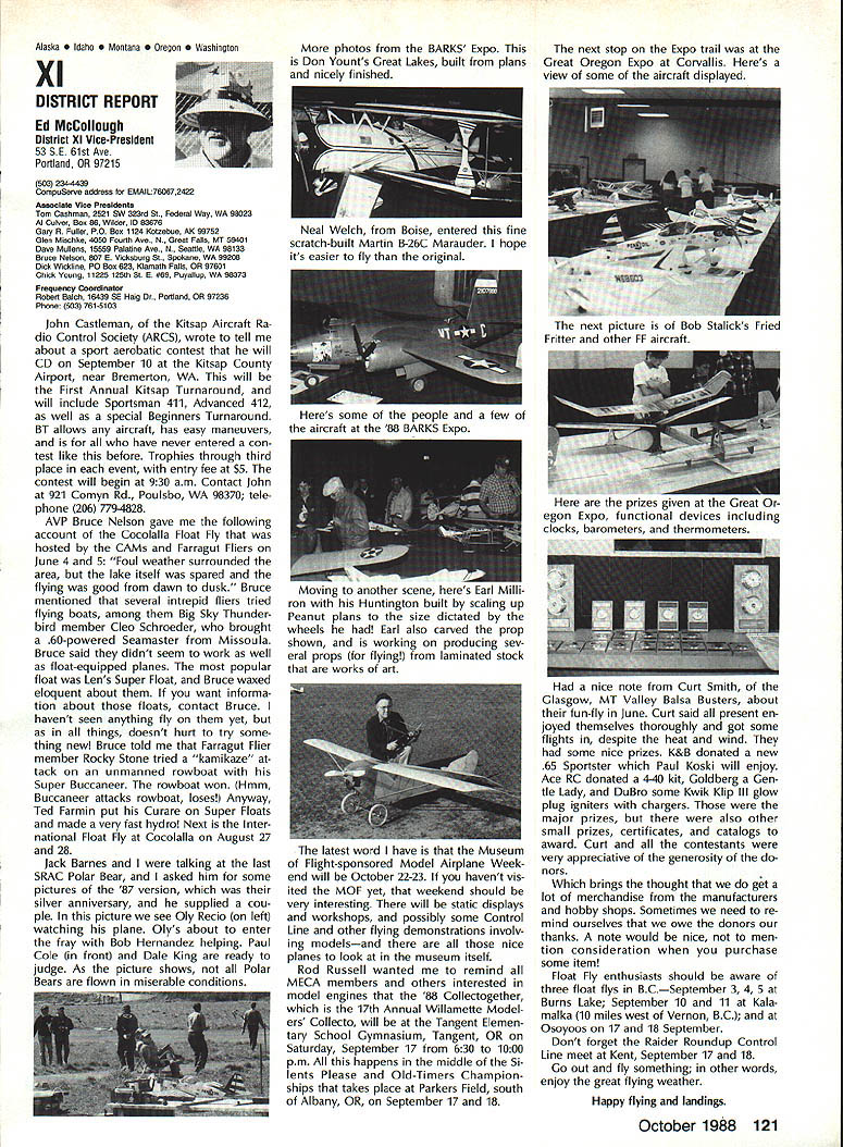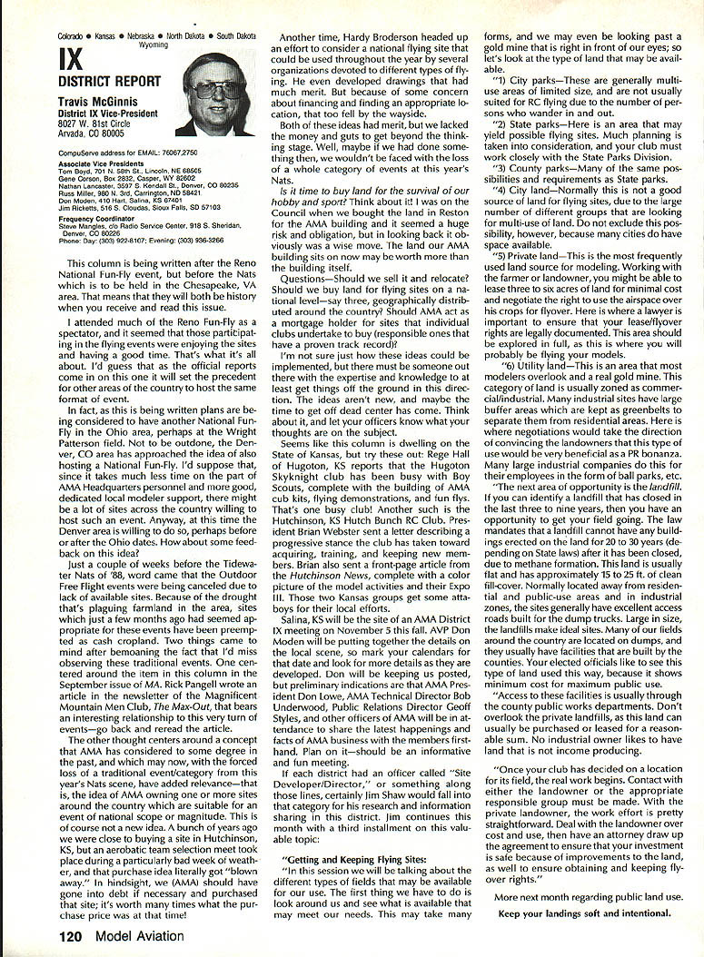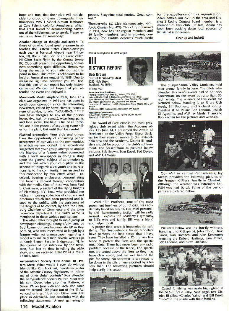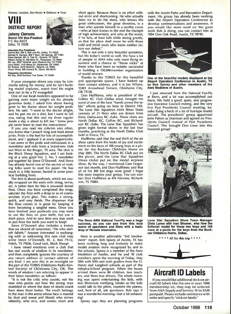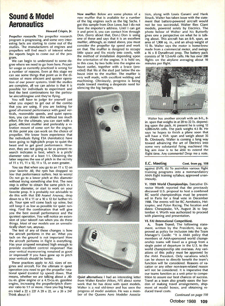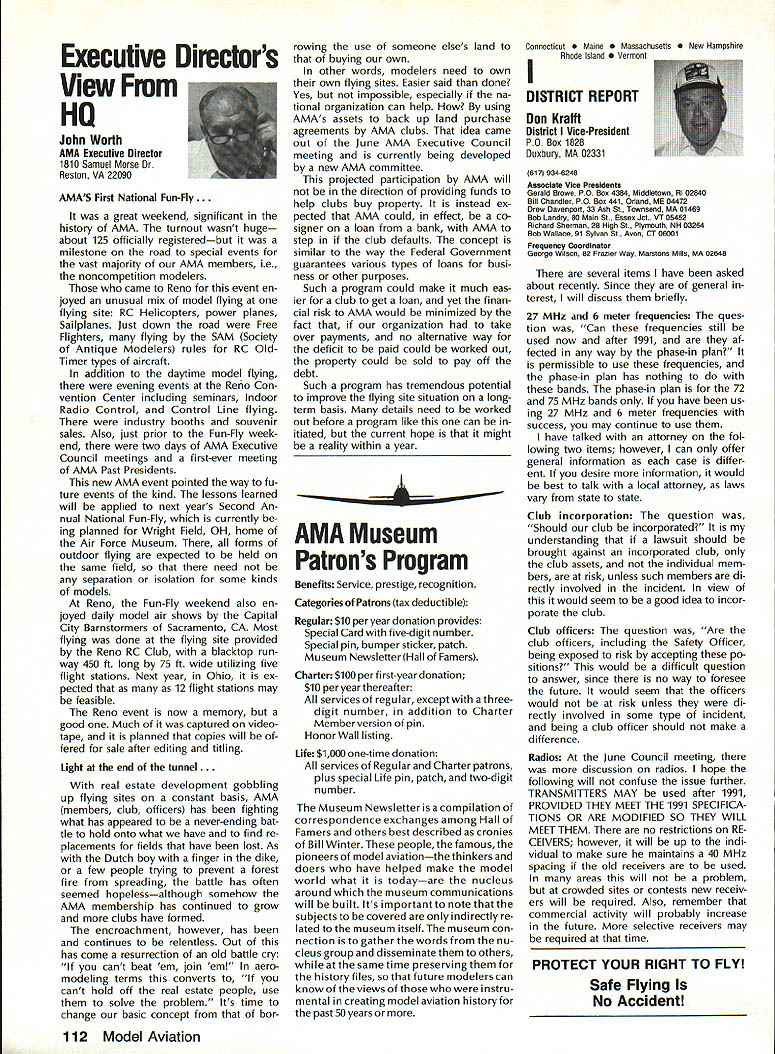 Since 1984 AMA members have able get credit cards well loans through program administered National Aero nautic Association via Colonial National Bank Delaware AMA members took advantage financial services net result about $40000 AMA general expenses offset much income program no extra cost AMA members participated However June 30 1988 AMA no longer receives income pro gram since Colonial bank decided discontinue participating Because National Aeronautic Association has switched new programs offered Maryland National Bank MBNA Trans-National Financial Services Boston new programs become effective about September 1 year credit card program MBNA being initi ated first NAA AMA will join dozens other national organizations such Air plane Owners Pilots Association AOPA American Society Association Ex ecutives ASAE have similar credit card programs MBNA new loan program will initiated shortly afterward via Trans-National What programs offer AMA members Improved expanded financial services available Both credit card loan programs offer AMA members did previous combination program Fur thermore programs probably offer credit card and/or loan services sin gle source MBNA operates cred card program progres sive advanced professional efficient organizations offering such services since accounts handled highly per sonalized manner members can expect treated people rather num bers What AMA gets out programs What ever business AMA members connec tion programs produces income AMA effect AMA gets piece action Thats reason enough AMA members pay otherwise would services get such should case However assuming enough members participate amount income generated can significantly offset annual operating costs AMA gen eral would help reduce pressures dues increase help prevent reduc tions services inflation might other wise necessitate important AMA able offer services members otherwise might available might cost might great respect fringe benefit its large membership AMA able provide services available smaller organization other words because AMA now organiza tion over 100000 members various com panies willing offer order RC Equipment Certified History made first listing Radio Control equipment has certi fied meeting technical requirement AMA Guidelines 1991 Narrow Band operation March 12 1988 meeting AMA Frequency Committee item busi ness discussion concerning report ing radio equipment performance re sult discussion following mo tion AMA publish list Model Avia tion indicating equipment transmitters receivers meet AMA Guidelines information provided indus try Note made clear AMA would have no part testing manufacturers have such testing done dependent testing facilities Academy contacted Radio Control equipment manufacturers importers distributors letter dated June 10 1988 concerning planned listing requested forward available documenta tion provided independent testing fa cility indicating equipment meets no cost AMA Any expenses connection programs borne companies offering services Thus advertising addressing mailing print ing other costs paid AMA Furthermore no AMA person ally profits programs no AMA offi cers employees receive money other physical financial rewards ducements Advantages Business conducted mail phone no necessity inter viewed person bank other finan cial institution AMA available intercede necessary case special problems misunder standing communication Thus AMA member strictly alonethe weight national organization can help some Continued page 108 exceeds technical requirements published AMA equipment guidelines See page 11 1988 AMA Membership Man ual following radio systems transmitters receivers have independently cer tified registered professional test labo ratory retained manufacturer US importer distributor meeting exceeding Radio Control equipment specifications detailed Academy Guidelines operation 20 kHz fre quency spacing testing done spe cifically listing time products FCC type acceptance procedure listing made matter informa tion construed en dorsement products listed AirtronicsSpectra PCM 7P 7H Receiver Part No 92985 AirtronicsQuantum PCM 8P 8H Receiver Part No 92985 AirtronicsModule Series FM MD7P 75P Receiver Part No 92785 AirtronicsVanguard FMIPCM 4 6 Receiver Part No 92965 Future issues Model Aviation will con tain expanded listing additional infor mation received AMA AMA HQ SERVICES STAFF 0 Executive Director John worth 0 Executive Coordinator Joyce Hager 0 AdmInistrative Services Director Robert Vojsiavek 0 Technical Director Bob Underwood S Comptroller Lynne Collins e Competition Services Director Micheline Madison 0 Specisi Services Director Carl Maroney ership Director Mike Woodfolk 0 PublIc Reiations Director Geoff Styles iai Prolects Director Doug Pratt S Publications Director Carl R Aheeley 0 Nets Genersi Manager Vince Mankowski 0 Museum Curator Hurst Bowers 0 Genersi Counsel Jeremiah Courtney October 1988 107 AMA HQ Executive Director including reports AMA President Executive VP Vice-Presidents business us New Credit CardlLoan Programs AMAs Executive Council equivaient tb Board Directors basically composed President Executive vice President Executive Director 11 district Vice Presidents officers provided space month AMA News publication What say space however matter personal viewpoint sole responsibility author views may may represent official position AMA Executive Council SynopsisExecutive Council Meeting June 23-24 1988 following attendance meetings took place Reno Con vention Center Nevada President Don Lowe Altamonte Springs FL Executive VicePresident Dave Brown Hamilton OH Exec utive Director John Worth Fairfax VA Dis trict Vice-President Don Krafft Duxbury MA VP-Il John Byrne Bayside NY VP-Ill Bob Brown Bradford PA VP-IV Howard Crispin Charlottesville VA VP-V Lee Web ster Manchester TN VP-VI Jim Sears Bur gin KY VP-VII Pete Waters Northville Ml VP-VIII Johnny Clemens Dallas TX VP-IX Travis McGinnis Arvada CO VP-X David Peltz Chatsworth CA VP-XI Ed McCol lough 