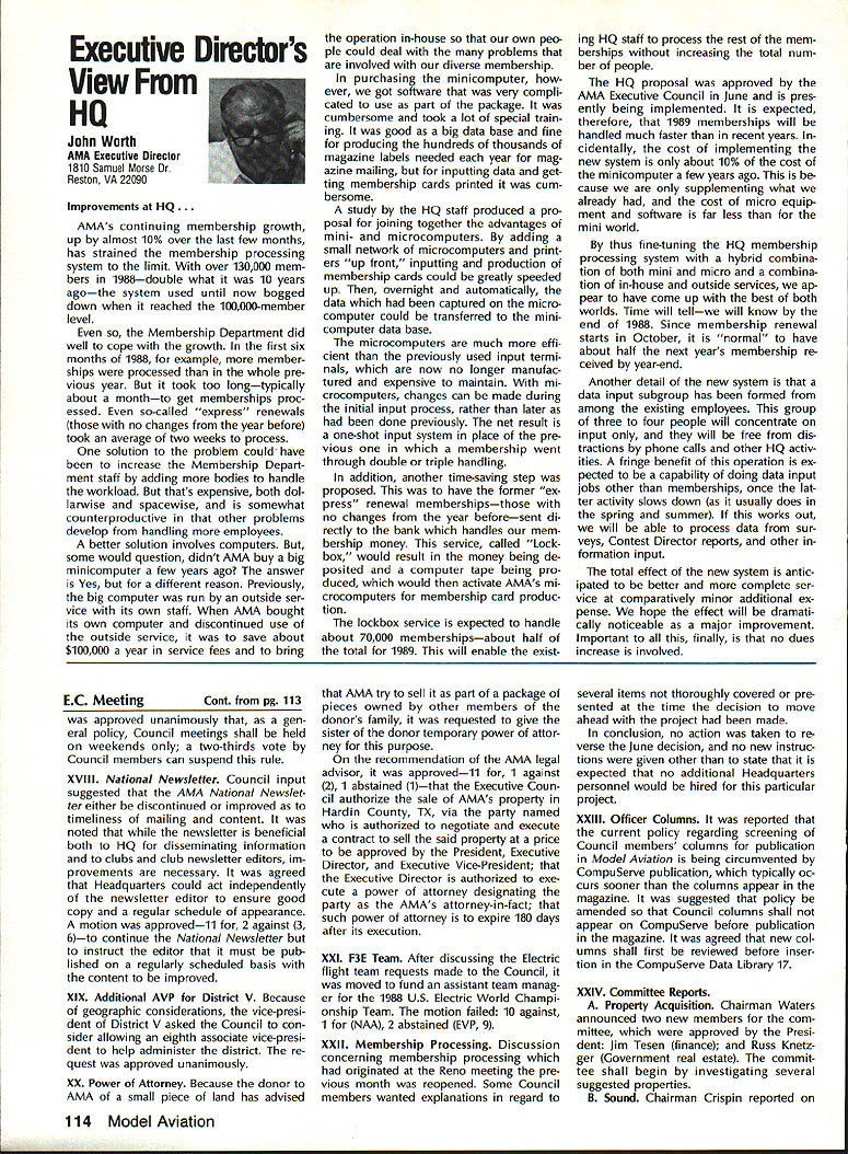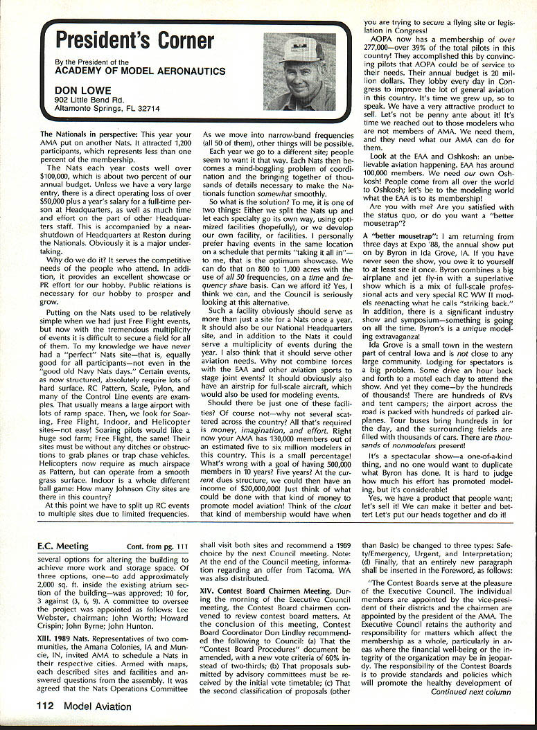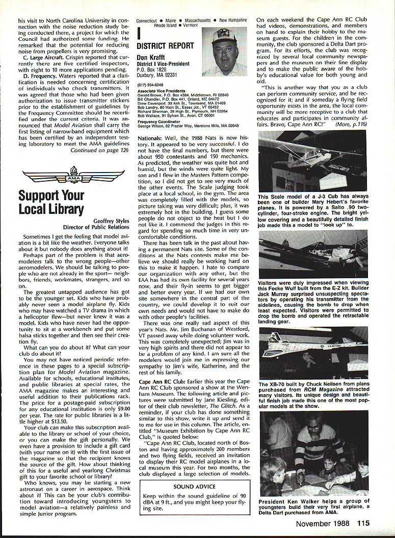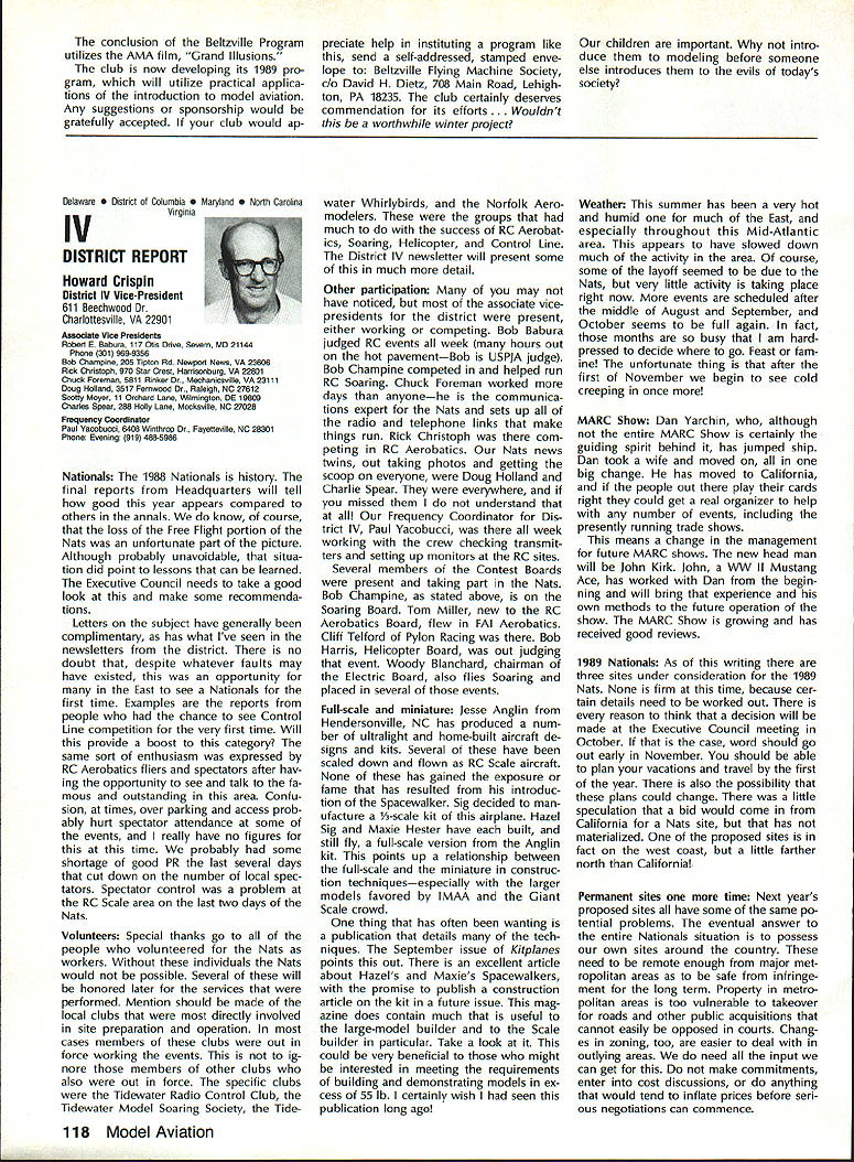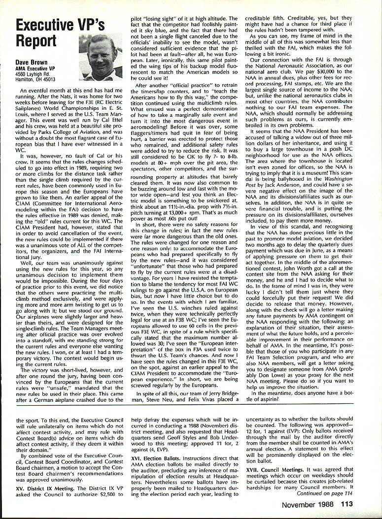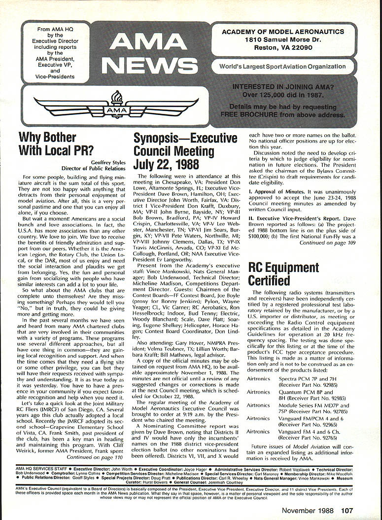 Geoffrey Styles Director Public Relations some people building flying min lature aircraft sum total sport too happy anything detracts personal enjoyment model aviation After very per sonal pastime can enjoy alone choose wait moment Americans social bunch love associations fact USA has associations other country love join love receive benefits friendly admiration sup port peers Whether Amer ican Legion Rotary Club Union Lo cal DAR us enjoy need social interaction plaudits get belonging Yes fun personal gain socializing people have similar interests can add lot life So what about AMA clubs complete unto themselves Are miss ing something Perhaps would tell No truth could giving getting past several months have seen heard AMA chartered clubs very involved communities variety programs programs use several different approaches have thing commonthey gain ing local recognition support time comes need flying site some other privilege can bet will have requests received sympa thy understanding true today yesterday have have pres ence community expect favor able recognition help need Lets take quick look Joint Military RC Fliers JMRCF San Diego CA Several years ago club actually adopted local school Recently JMRCF adopted its sec ond schoolGrapevine Elementary School Vista CA Frank Smith past president club has key man heading maintaining program Cliff Weirick former AMA President Frank spent Continued page 110 SynopsisExecutive Council Meeting July 22 1988 following attendance meeting Chesapeake VA President Don Lowe Altamonte Springs FL Executive VicePresident Dave Brown Hamilton OH Exec utive Director John Worth Fairfax VA Dis trict Vice-President Don Krafft Duxbury MA VP-Il John Byrne Bayside NY VP-Ill Bob Brown Bradford PA VP-IV Howard Crispin Charlottesville VA VP-V Lee Web ster Manchester TN VP-VI Jim Sears Bur gin KY VP-VII Pete Waters Northville Ml VP-VIII Johnny Clemens Dallas TX VP-IX Travis McGinnis Arvada CO VP-XI Ed Mc Collough Portland OR NAA Executive VicePresident Ev Langworthy Present Academys executive staff Vince Mankowski Nats General Man ager Bob Underwood Technical Director Micheline Madison Competitions Depart ment Director Guests Chairmen Contest BoardsFE Contest Board Joe Boyle proxy Bonny Jenkins Pylon Wayne Yeager CL Vic Garner RC Aerobatics Ron Hesseibrock Indoor Bud Tenny Electric Woody Blanchard Scale Dave Platt Soar ing Eugene Shelkey Helicopter Horace Ha gen Contest Board Coordinator Don Lind ley Also attending Gary Hover NMPRA Pres ident Velma Teubner TX Lillian Worth Bar bara Krafft Bill Mathews legal advisor copy official minutes may ob tained request AMA HQ avail able approximately November 1 1988 minutes official until review suggested changes corrections made next Council meeting sched uled October 22 1988 regular meeting Academy Model Aeronautics Executive Council brought order 919 am Presi dent chaired meeting Nominating Committee report given Dave Brown noting Districts II IV would have incumbents names 1988 district vice-president election ballot no other nominations offered Districts VI VII X would have two names ballot No national officer positions up elec tion year Discussion noted need develop cri teria judge eligibility nomi nation future elections President asked chairman Bylaws Commit tee Crispin draft requirements candi date eligibility I Approval Minutes unanimously approved accept June 23-24 1988 Council meeting minutes amended written Council input II Executive Vice-Presidents Report Dave Brown reported follows project ed 1988 bottom line plus side $100000 b first National Fun-Fly Continued page 109 RC Equipment Certified follow ng adio systems transmitters receivers have independently cer tified registered professional test labo ratory retained manufacturer US importer distributor meeting exceeding Radio Control equipment specifications detailed Academy Guidelines operation 20 kHz fre quency spacing testing done spe cifically listing time products FCC type acceptance procedure listing made matter informa tion construed en dorsement products listed AirtronicsSpectra PCM 7P 7H Receiver Part No 92985 AirtronicsQuantum PCM 8P 8H Receiver Part No 92985 AirtronicsModule Series FM MD7P 75P Receiver Part No 92785 AirtronicsVanguard FM/PCM 4 6 Receiver Part No 92965 AirtronicsVanguard FM 4 6 Ch Receiver Part No 92765 Future issues Model Aviation will con tain expanded listing additional infor mation received AMA AMA HO SERVICES STAFF S Executive Director John worth S Executive Coordinator Joyce Hager S Administrative Services Director Robert Voislavek S Technical Director Bob underwood S Comptroller Lynne Collins S Competition Services Director Micheline Madison 0 Special Services Director Carl Maroney ership Director Mike Woodfolk 0 Public Relations Director Geoff Styles ial Projects Director Doug Pratt 0 Publications Director Carl R Wheeley S Nats General Manager Vince Mankowski S Museum Curator Hurst Bowers S General Counsel Jeremiah Courtney November 1988 107 AMA HQ Executive Director including reports AMA President Executive VP Vice-Presidents L ACADEMY OF MODEL AERONAUTICS 1810 Samuel Morse Dr Reston VA 22090 WorIds Largest Sport Aviation Organization Bother Local PR AMAs Executive Council equivalent Board Directors basically composed President Eseculive Vice President Executive Director district Vice Presidents officers provided space month AMA News publication what say space however matter personal viewpoint sole responsibility author views may may represent official position AMA Executive Council Vice-President Campaign Statements District 2 John Byrne Bayside NY incumbent AMA 171/CD NSRCA 45 USPJA 84 Level 1 re spectfully ask elect another term vice-president AMA District 2 based upon record service during first five terms office addition certain items unfinished business am ready able eager cope problems AMA now confronted no substitute expe rience have combined high degree enthusiasm integrity am lawyer profession vicepresident national corp