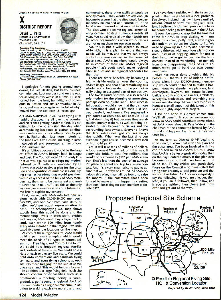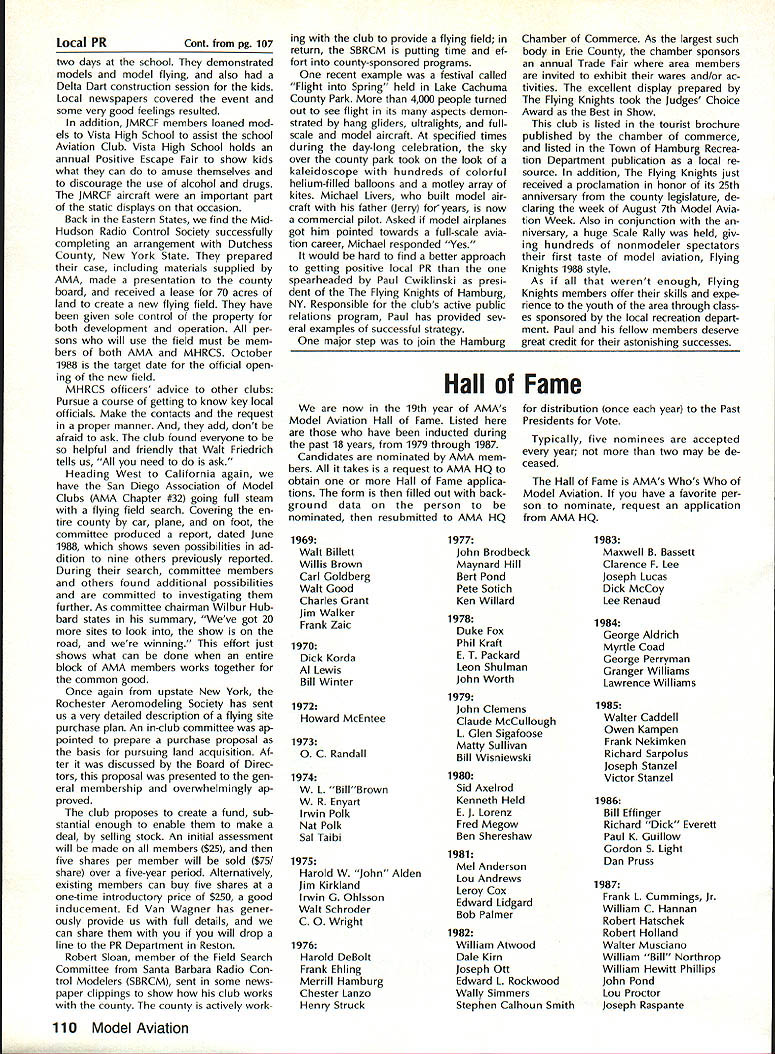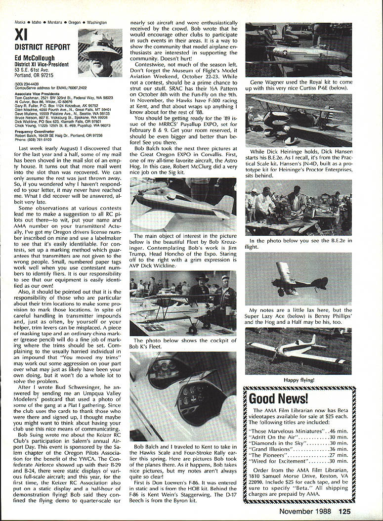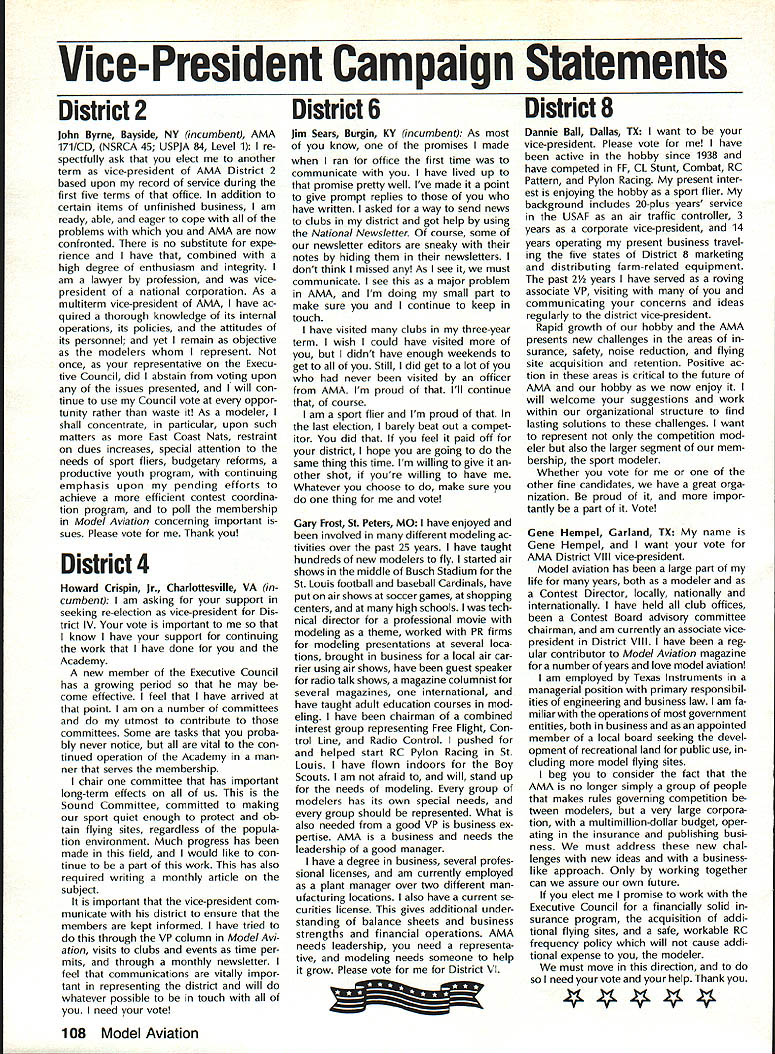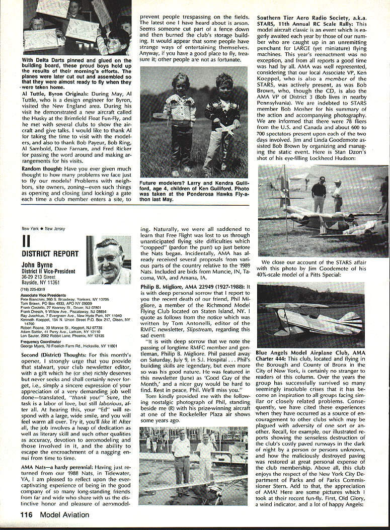 Geoffrey Styles Director Public Relations some people building flying min lature aircraft sum total sport too happy anything detracts personal enjoyment model aviation After very per sonal pastime can enjoy alone choose wait moment Americans social bunch love associations fact USA has associations other country love join love receive benefits friendly admiration sup port peers Whether Amer ican Legion Rotary Club Union Lo cal DAR us enjoy need social interaction plaudits get belonging Yes fun personal gain socializing people have similar interests can add lot life So what about AMA clubs complete unto themselves Are miss ing something Perhaps would tell No truth could giving getting past several months have seen heard AMA chartered clubs very involved communities variety programs programs use several different approaches have thing commonthey gain ing local recognition support time comes need flying site some other privilege can bet will have requests received sympa thy understanding true today yesterday have have pres ence community expect favor able recognition help need Lets take quick look Joint Military RC Fliers JMRCF San Diego CA Several years ago club actually adopted local school Recently JMRCF adopted its sec ond schoolGrapevine Elementary School Vista CA Frank Smith past president club has key man heading maintaining program Cliff Weirick former AMA President Frank spent Continued page 110 SynopsisExecutive Council Meeting July 22 1988 following attendance meeting Chesapeake VA President Don Lowe Altamonte Springs FL Executive VicePresident Dave Brown Hamilton OH Exec utive Director John Worth Fairfax VA Dis trict Vice-President Don Krafft Duxbury MA VP-Il John Byrne Bayside NY VP-Ill Bob Brown Bradford PA VP-IV Howard Crispin Charlottesville VA VP-V Lee Web ster Manchester TN VP-VI Jim Sears Bur gin KY VP-VII Pete Waters Northville Ml VP-VIII Johnny Clemens Dallas TX VP-IX Travis McGinnis Arvada CO VP-XI Ed Mc Collough Portland OR NAA Executive VicePresident Ev Langworthy Present Academys executive staff Vince Mankowski Nats General Man ager Bob Underwood Technical Director Micheline Madison Competitions Depart ment Director Guests Chairmen Contest BoardsFE Contest Board Joe Boyle proxy Bonny Jenkins Pylon Wayne Yeager CL Vic Garner RC Aerobatics Ron Hesseibrock Indoor Bud Tenny Electric Woody Blanchard Scale Dave Platt Soar ing Eugene Shelkey Helicopter Horace Ha gen Contest Board Coordinator Don Lind ley Also attending Gary Hover NMPRA Pres ident Velma Teubner TX Lillian Worth Bar bara Krafft Bill Mathews legal advisor copy official minutes may ob tained request AMA HQ avail able approximately November 1 1988 minutes official until review suggested changes corrections made next Council meeting sched uled October 22 1988 regular meeting Academy Model Aeronautics Executive Council brought order 919 am Presi dent chaired meeting Nominating Committee report given Dave Brown noting Districts II IV would have incumbents names 1988 district vice-president election ballot no other nominations offered Districts VI VII X would have two names ballot No national officer positions up elec tion year Discussion noted need develop cri teria judge eligibility nomi nation future elections President asked chairman Bylaws Commit tee Crispin draft requirements candi date eligibility I Approval Minutes unanimously approved accept June 23-24 1988 Council meeting minutes amended written Council input II Executive Vice-Presidents Report Dave Brown reported follows project ed 1988 bottom line plus side $100000 b first National Fun-Fly Continued page 109 RC Equipment Certified follow ng adio systems transmitters receivers have independently cer tified registered professional test labo ratory retained manufacturer US importer distributor meeting exceeding Radio Control equipment specifications detailed Academy Guidelines operation 20 kHz fre quency spacing testing done spe cifically listing time products FCC type acceptance procedure listing made matter informa tion construed en dorsement products listed AirtronicsSpectra PCM 7P 7H Receiver Part No 92985 AirtronicsQuantum PCM 8P 8H Receiver Part No 92985 AirtronicsModule Series FM MD7P 75P Receiver Part No 92785 AirtronicsVanguard FM/PCM 4 6 Receiver Part No 92965 AirtronicsVanguard FM 4 6 Ch Receiver Part No 92765 Future issues Model Aviation will con tain expanded listing additional infor mation received AMA AMA HO SERVICES STAFF S Executive Director John worth S Executive Coordinator Joyce Hager S Administrative Services Director Robert Voislavek S Technical Director Bob underwood S Comptroller Lynne Collins S Competition Services Director Micheline Madison 0 Special Services Director Carl Maroney ership Director Mike Woodfolk 0 Public Relations Director Geoff Styles ial Projects Director Doug Pratt 0 Publications Director Carl R Wheeley S Nats General Manager Vince Mankowski S Museum Curator Hurst Bowers S General Counsel Jeremiah Courtney November 1988 107 AMA HQ Executive Director including reports AMA President Executive VP Vice-Presidents L ACADEMY OF MODEL AERONAUTICS 1810 Samuel Morse Dr Reston VA 22090 WorIds Largest Sport Aviation Organization Bother Local PR AMAs Executive Council equivalent Board Directors basically composed President Eseculive Vice President Executive Director district Vice Presidents officers provided space month AMA News publication what say space however matter personal viewpoint sole responsibility author views may may represent official position AMA Executive Council Vice-President Campaign Statements District 2 John Byrne Bayside NY incumbent AMA 171/CD NSRCA 45 USPJA 84 Level 1 re spectfully ask elect another term vice-president AMA District 2 based upon record service during first five terms office addition certain items unfinished business am ready able eager cope problems AMA now confronted no substitute expe rience have combined high degree enthusiasm integrity am lawyer profession vicepresident national corp