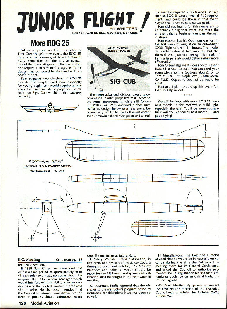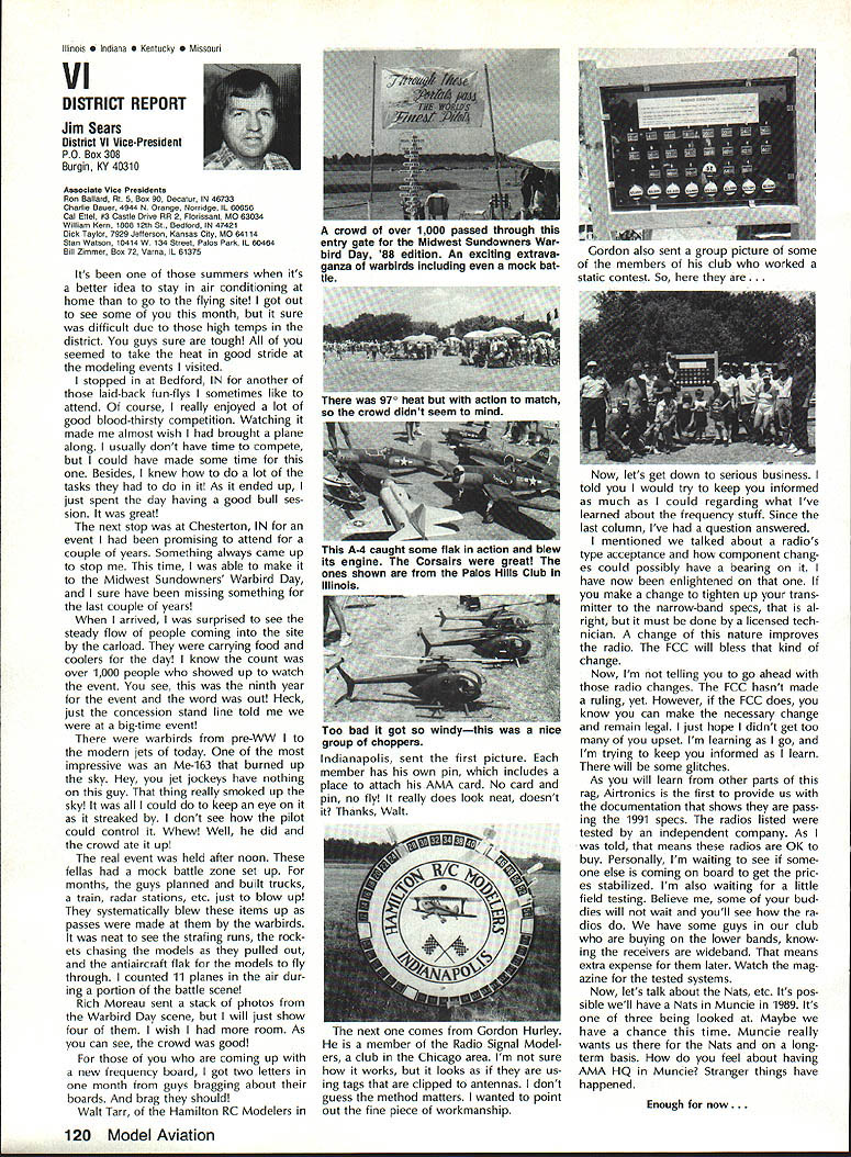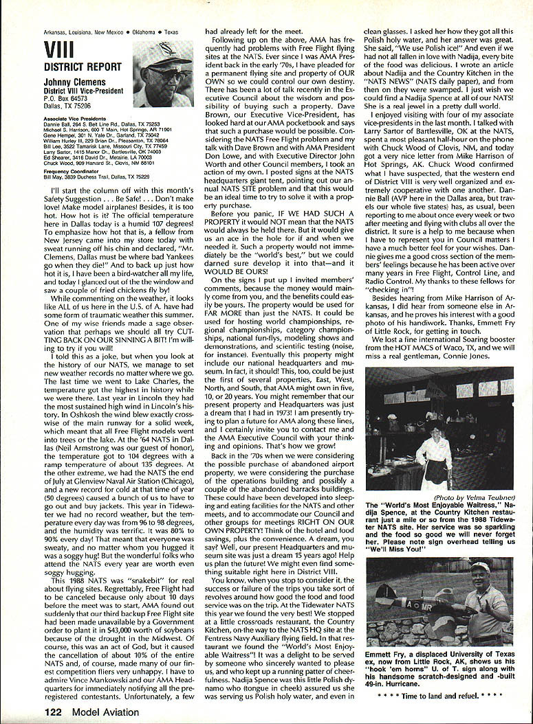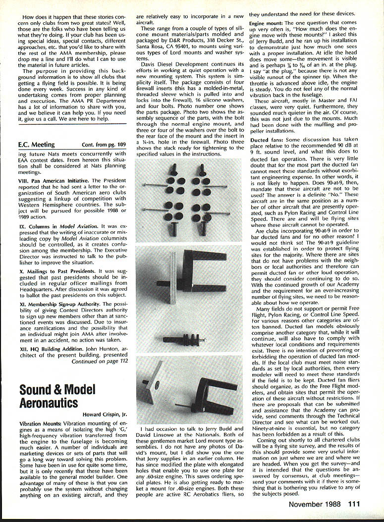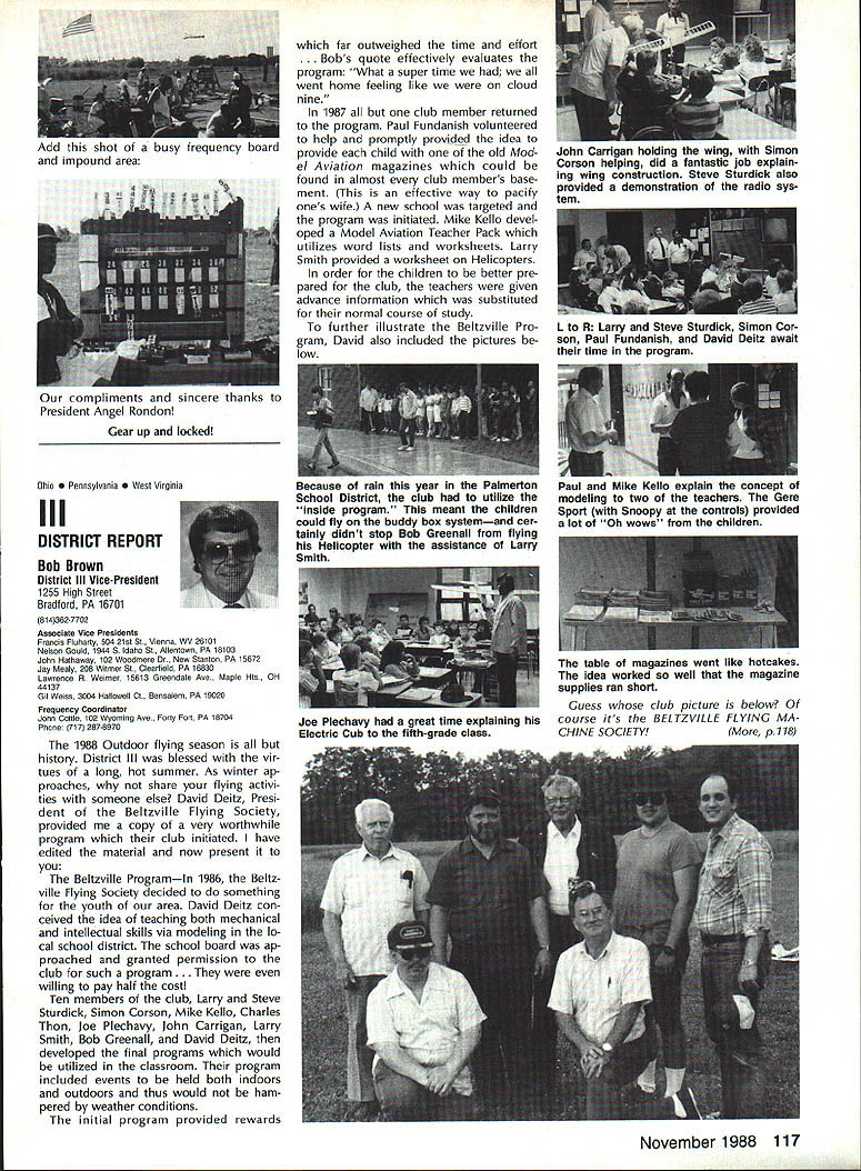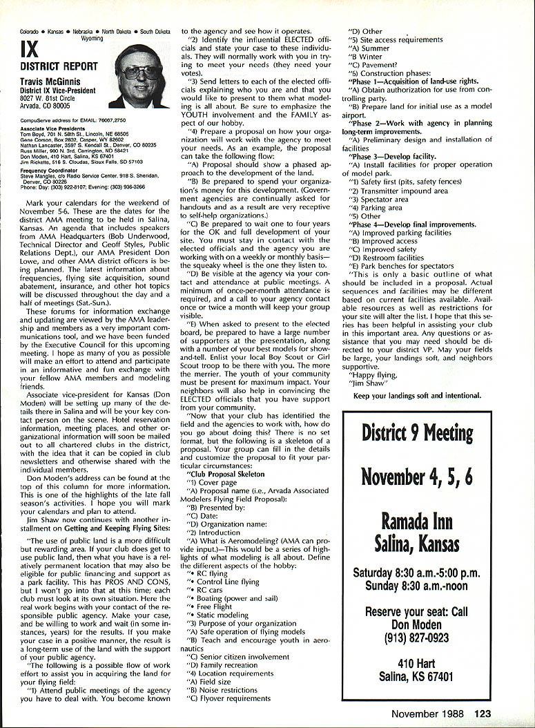 Geoffrey Styles Director Public Relations some people building flying min lature aircraft sum total sport too happy anything detracts personal enjoyment model aviation After very per sonal pastime can enjoy alone choose wait moment Americans social bunch love associations fact USA has associations other country love join love receive benefits friendly admiration sup port peers Whether Amer ican Legion Rotary Club Union Lo cal DAR us enjoy need social interaction plaudits get belonging Yes fun personal gain socializing people have similar interests can add lot life So what about AMA clubs complete unto themselves Are miss ing something Perhaps would tell No truth could giving getting past several months have seen heard AMA chartered clubs very involved communities variety programs programs use several different approaches have thing commonthey gain ing local recognition support time comes need flying site some other privilege can bet will have requests received sympa thy understanding true today yesterday have have pres ence community expect favor able recognition help need Lets take quick look Joint Military RC Fliers JMRCF San Diego CA Several years ago club actually adopted local school Recently JMRCF adopted its sec ond schoolGrapevine Elementary School Vista CA Frank Smith past president club has key man heading maintaining program Cliff Weirick former AMA President Frank spent Continued page 110 SynopsisExecutive Council Meeting July 22 1988 following attendance meeting Chesapeake VA President Don Lowe Altamonte Springs FL Executive VicePresident Dave Brown Hamilton OH Exec utive Director John Worth Fairfax VA Dis trict Vice-President Don Krafft Duxbury MA VP-Il John Byrne Bayside NY VP-Ill Bob Brown Bradford PA VP-IV Howard Crispin Charlottesville VA VP-V Lee Web ster Manchester TN VP-VI Jim Sears Bur gin KY VP-VII Pete Waters Northville Ml VP-VIII Johnny Clemens Dallas TX VP-IX Travis McGinnis Arvada CO VP-XI Ed Mc Collough Portland OR NAA Executive VicePresident Ev Langworthy Present Academys executive staff Vince Mankowski Nats General Man ager Bob Underwood Technical Director Micheline Madison Competitions Depart ment Director Guests Chairmen Contest BoardsFE Contest Board Joe Boyle proxy Bonny Jenkins Pylon Wayne Yeager CL Vic Garner RC Aerobatics Ron Hesseibrock Indoor Bud Tenny Electric Woody Blanchard Scale Dave Platt Soar ing Eugene Shelkey Helicopter Horace Ha gen Contest Board Coordinator Don Lind ley Also attending Gary Hover NMPRA Pres ident Velma Teubner TX Lillian Worth Bar bara Krafft Bill Mathews legal advisor copy official minutes may ob tained request AMA HQ avail able approximately November 1 1988 minutes official until review suggested changes corrections made next Council meeting sched uled October 22 1988 regular meeting Academy Model Aeronautics Executive Council brought order 919 am Presi dent chaired meeting Nominating Committee report given Dave Brown noting Districts II IV would have incumbents names 1988 district vice-president election ballot no other nominations offered Districts VI VII X would have two names ballot No national officer positions up elec tion year Discussion noted need develop cri teria judge eligibility nomi nation future elections President asked chairman Bylaws Commit tee Crispin draft requirements candi date eligibility I Approval Minutes unanimously approved accept June 23-24 1988 Council meeting minutes amended written Council input II Executive Vice-Presidents Report Dave Brown reported follows project ed 1988 bottom line plus side $100000 b first National Fun-Fly Continued page 109 RC Equipment Certified follow ng adio systems transmitters receivers have independently cer tified registered professional test labo ratory retained manufacturer US importer distributor meeting exceeding Radio Control equipment specifications detailed Academy Guidelines operation 20 kHz fre quency spacing testing done spe cifically listing time products FCC type acceptance procedure listing made matter informa tion construed en dorsement products listed AirtronicsSpectra PCM 7P 7H Receiver Part No 92985 AirtronicsQuantum PCM 8P 8H Receiver Part No 92985 AirtronicsModule Series FM MD7P 75P Receiver Part No 92785 AirtronicsVanguard FM/PCM 4 6 Receiver Part No 92965 AirtronicsVanguard FM 4 6 Ch Receiver Part No 92765 Future issues Model Aviation will con tain expanded listing additional infor mation received AMA AMA HO SERVICES STAFF S Executive Director John worth S Executive Coordinator Joyce Hager S Administrative Services Director Robert Voislavek S Technical Director Bob underwood S Comptroller Lynne Collins S Competition Services Director Micheline Madison 0 Special Services Director Carl Maroney ership Director Mike Woodfolk 0 Public Relations Director Geoff Styles ial Projects Director Doug Pratt 0 Publications Director Carl R Wheeley S Nats General Manager Vince Mankowski S Museum Curator Hurst Bowers S General Counsel Jeremiah Courtney November 1988 107 AMA HQ Executive Director including reports AMA President Executive VP Vice-Presidents L ACADEMY OF MODEL AERONAUTICS 1810 Samuel Morse Dr Reston VA 22090 WorIds Largest Sport Aviation Organization Bother Local PR AMAs Executive Council equivalent Board Directors basically composed President Eseculive Vice President Executive Director district Vice Presidents officers provided space month AMA News publication what say space however matter personal viewpoint sole responsibility author views may may represent official position AMA Executive Council Vice-President Campaign Statements District 2 John Byrne Bayside NY incumbent AMA 171/CD NSRCA 45 USPJA 84 Level 1 re spectfully ask elect another term vice-president AMA District 2 based upon record service during first five terms office addition certain items unfinished business am ready able eager cope problems AMA now confronted no substitute expe rience have combined high degree enthusiasm integrity am lawyer profession vicepresident national corp