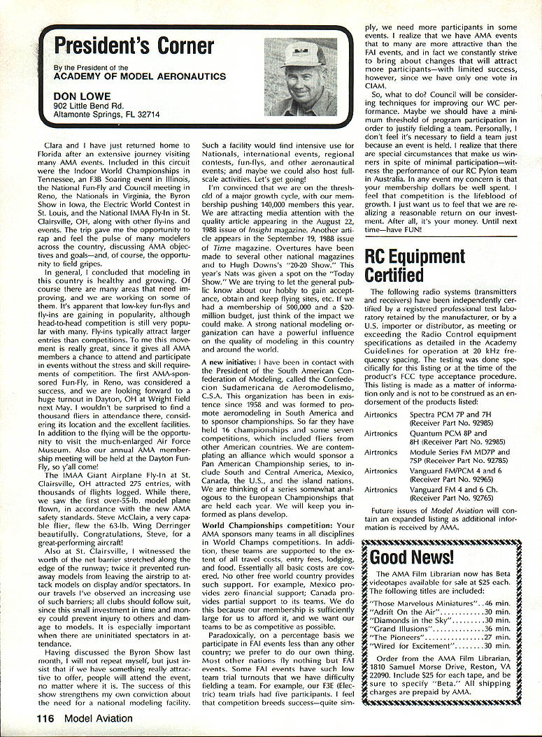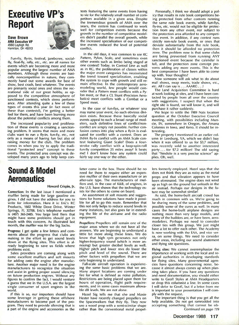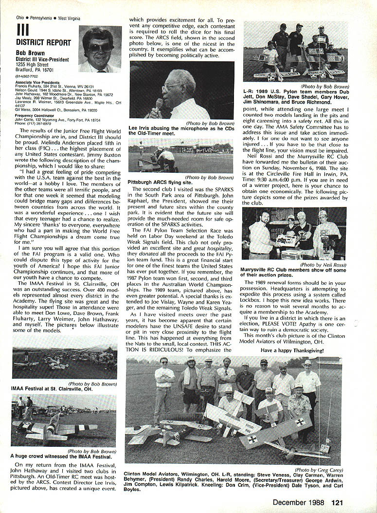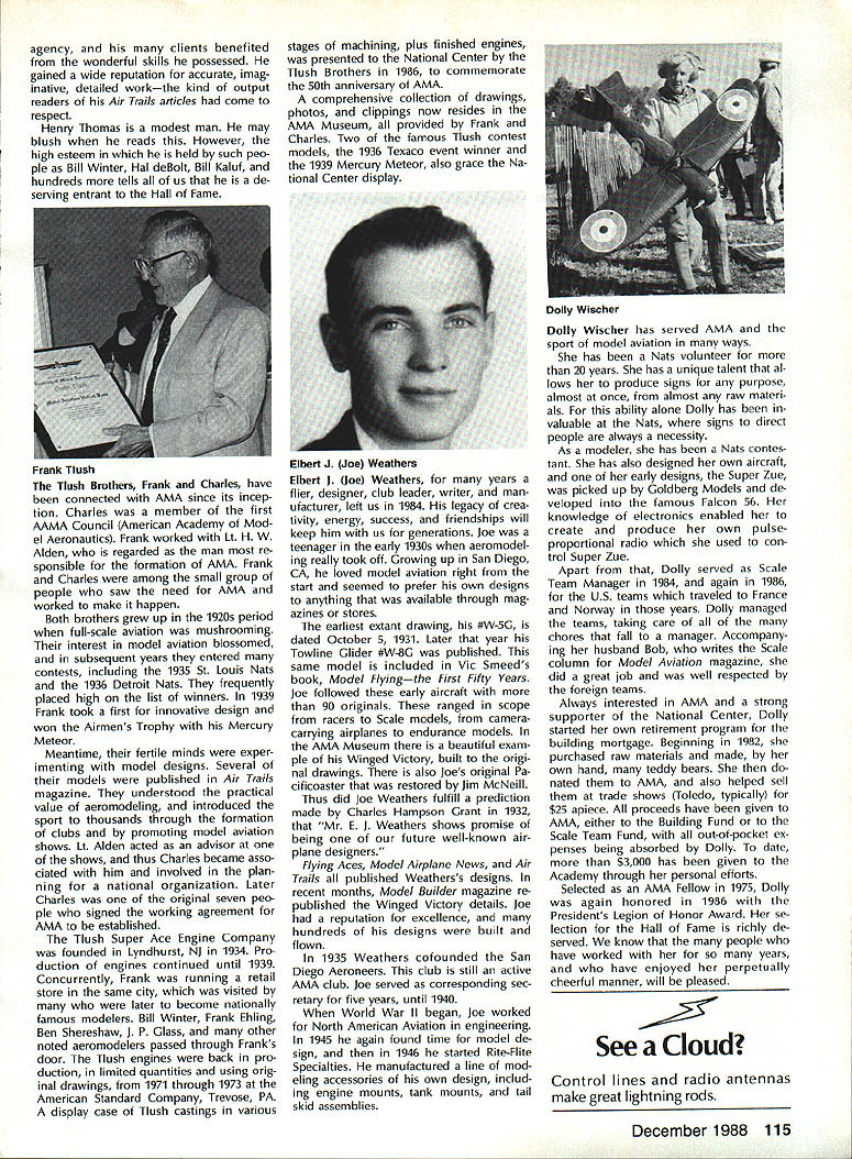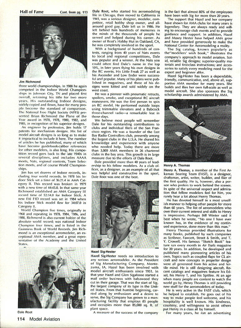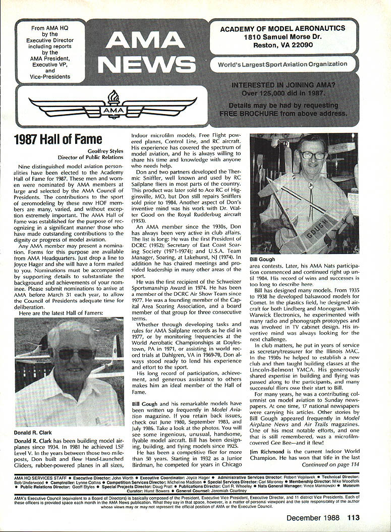 L L 1987 HaIl Fame Nine distinguished model aviation person alities have elected Academy Hall Fame 1987 men wom en nominated AMA members large selected AMA Council Presidents contributions sport aeromodeling new HOF mem bers varied excep tion extremely important AMA Hall Fame established purpose rec ognizing significant manner have made outstanding contributions dignity progress model aviation Any AMA member may present nomina tion Forms purpose available AMA Headquarters Just drop line Joyce Hager will have form mailed Nominations must accompanied supporting details substantiate background achievements nom inee Please submit nominations arrive AMA before March 31 year allow Council Presidents adequate time deliberation latest Hall Famers Donald R Clark has building model air planes since 1934 1981 achieved LSF Level V years between two mile posts Don built flew Hand-Launched Gliders rubber-powered planes sizes Geoffrey Styles Director Public Relations Indoor microfilm models Free Flight pow ered planes Control Line RC aircraft experience has covered spectrum model aviation always willing share time knowledge anyone needs help Don two partners developed Ther mic Sniffler well known used RC Sailplane fliers parts country product later sold Ace RC Hig ginsville MO Don still repairs Snifflers sold prior 1984 Another aspect Dons inventive mind work Dr Wal ter Good Royal Rudderbug aircraft 1953 An AMA member since 1930s Don has always very active club affairs list long first President DCRC 1952 Secretary East Coast Soar ing Society 1971-1974 USA Team Manager Soaring Lakehurst NJ 1974 addition has chaired meetings pro vided leadership other areas sport first recipient Schweizer Sportsmanship Award 1974 has member DCRC Air Show Team since 1977 founding member Cap ital Area Soaring Association board member group three consecutive terms Whether through developing tasks rules AMA Sailplane records did 1977 monitoring frequencies World Aerobatic Championships Doyles town PA 1971 assisting world rec ord trials Dahlgren VA 1969-70 Don al ways stood ready lend experience effort sport long record participation achieve ment generous assistance others makes him ideal member Hall Fame Bill Cough remarkable models have written up frequently Model Avia tion magazine retain back issues check out June 1980 September 1983 July 1986 Take look photos will see some ingenious unusual handsome flyable model aircraft Bill has design ing building flying models since 1925 has competitive flier 50 years Starting 1932 Junior Birdman competed years Chicago Bill cough area contests Later AMA Nats participa tion commenced continued right up un til 1984 record wins successes too long describe Bill has designed models 1935 1938 developed balsawood models Comet plastics field designed air craft both Lindberg Monogram Warwick Electronics experimented radio phonograph prototypes involved TV cabinet design ventive mind always looking next challenge club matters put years service secretary/treasurer Illinois MAC 1930s helped establish new club taught building classes Lincoln-Belmont YMCA generously shared expertise building flying passed along participants successful fliers owe start Bill years contributing col umnist model aviation Sunday news papers time 17 national newspapers carrying articles Other stories Bill Gough appeared frequently Model Airplane News Air Trails magazines notable efforts still remembered microfilmcovered Gee Beeand flew jim Richmond current Indoor World Champion has won title last Continued page 114 AMA HO SERVICES STAFF 0 Executive Director John Worth 0 Executive Coordinator Joyce Hager 0 Administrative Services Director Robert vojslavek 0 Technical Director Bob underwood 0 Comptroller Lynne Collina 0 Competition Services Director Micheline Madiaon 0 Special Services Director carl Maroney ership Director Mike Woodtolk 0 Public Relations Director Geoft Styles ial Projects Director Doug Pratt 0 Publications Director carl R Wheeleye Nats General Manager ymca Mankowski S Museum Curator Hurst Bowers 0 General Counsel Jeremiah courtney December 1988 113 AMA HO Executive Director including reports AMA President Executive VP Vice-Presidents Donald R Clark AMAs Esecutive council equivalent Board ot Directors basically composed ot President Executive vice President Executive Director 11 district vice Presidents 01 officers provided space month AMA News publication What say space however matter ot personal viewpoint sole responsibility ot author views may may represent official position ot AMA Executive council Cont pg 113 Jim Richmond three world championships 1988 again competed Indoor World Champion ships Johnson City TN placed first overall retaining title two years outstanding Indoor designs widely copied flown have peo ple hecome standard comparison National Free Flight Society NFFS pre sented Brian Richmond Plane Year award 1970 1978 1980 1982 1985 recognition superior designs An engineer hy profession Jim holds 17 patents mechanism designs list model aircraft designs long make impractical include number articles has published have become guidebook-caliber references other modelers also long compe tition record goes back late 1940s several disciplines includes AAAA meets Nats regional contests Team Selec tion meets course World Champion ships lim has set dozens Indoor records cluding four world records 1978 door Stick set time 36214 AMA Cat egory II record broken 1979 new time 44430 same year Richmond established AMA Category Ill record time 52140 Indoor Stick new FAI FiD record set 1984 Indoor Stick model flew 34070 Category II World Champion five times originally 1968 repeating 1978 1984 1986 1988 Richmond also current holder absolute world record national Indoor Champion four times listed Guinness Book World Records Jim Rich mond exceptional aeromodeler ex ceptional AMA member great repre sentative Academy United States Dale Root Dale Root started aeromodeling life Chicago moved California 1941 serious d