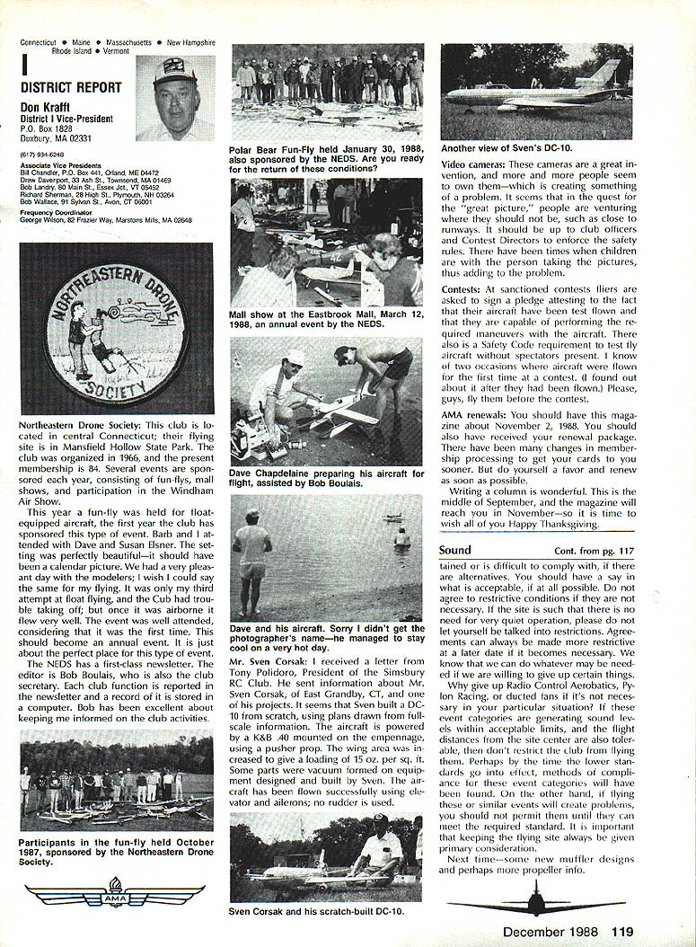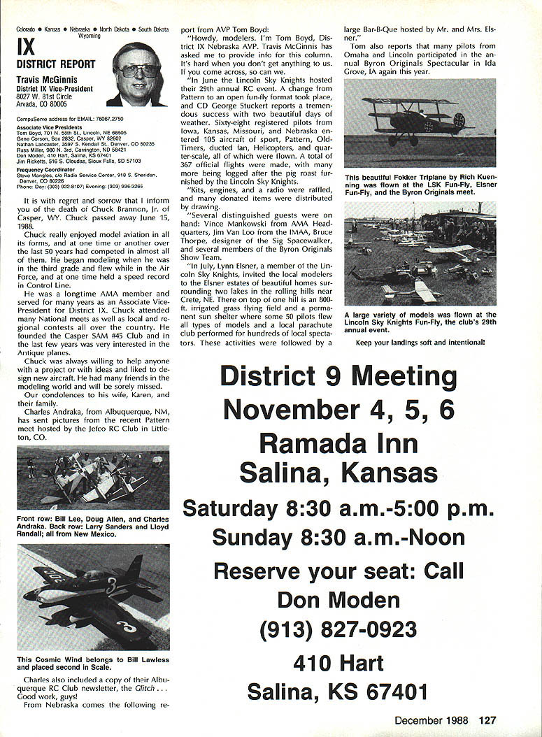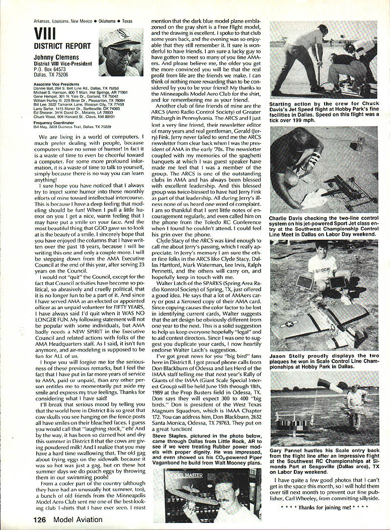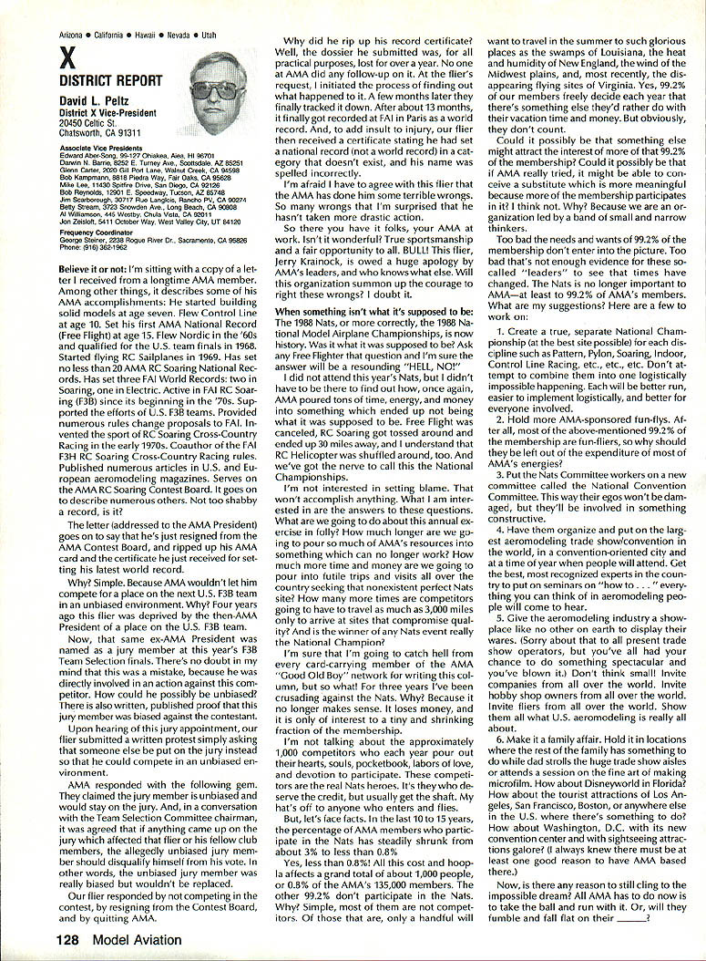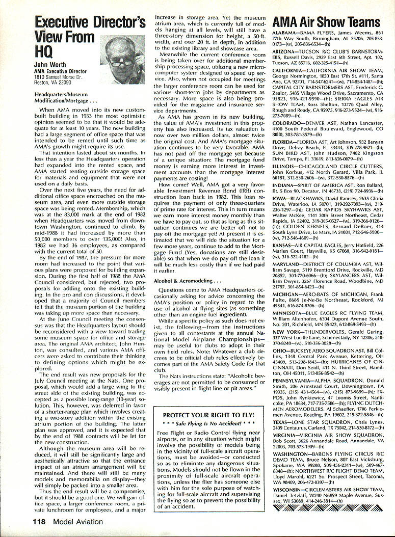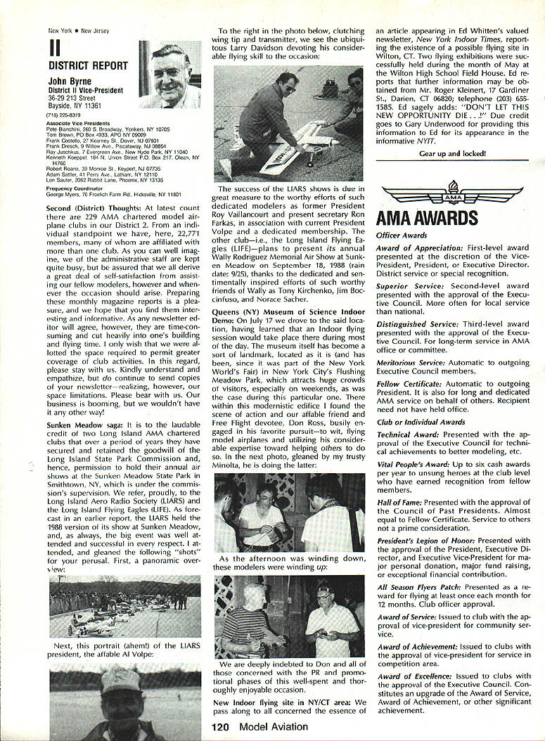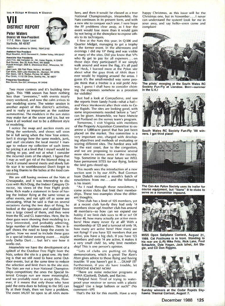 L L 1987 HaIl Fame Nine distinguished model aviation person alities have elected Academy Hall Fame 1987 men wom en nominated AMA members large selected AMA Council Presidents contributions sport aeromodeling new HOF mem bers varied excep tion extremely important AMA Hall Fame established purpose rec ognizing significant manner have made outstanding contributions dignity progress model aviation Any AMA member may present nomina tion Forms purpose available AMA Headquarters Just drop line Joyce Hager will have form mailed Nominations must accompanied supporting details substantiate background achievements nom inee Please submit nominations arrive AMA before March 31 year allow Council Presidents adequate time deliberation latest Hall Famers Donald R Clark has building model air planes since 1934 1981 achieved LSF Level V years between two mile posts Don built flew Hand-Launched Gliders rubber-powered planes sizes Geoffrey Styles Director Public Relations Indoor microfilm models Free Flight pow ered planes Control Line RC aircraft experience has covered spectrum model aviation always willing share time knowledge anyone needs help Don two partners developed Ther mic Sniffler well known used RC Sailplane fliers parts country product later sold Ace RC Hig ginsville MO Don still repairs Snifflers sold prior 1984 Another aspect Dons inventive mind work Dr Wal ter Good Royal Rudderbug aircraft 1953 An AMA member since 1930s Don has always very active club affairs list long first President DCRC 1952 Secretary East Coast Soar ing Society 1971-1974 USA Team Manager Soaring Lakehurst NJ 1974 addition has chaired meetings pro vided leadership other areas sport first recipient Schweizer Sportsmanship Award 1974 has member DCRC Air Show Team since 1977 founding member Cap ital Area Soaring Association board member group three consecutive terms Whether through developing tasks rules AMA Sailplane records did 1977 monitoring frequencies World Aerobatic Championships Doyles town PA 1971 assisting world rec ord trials Dahlgren VA 1969-70 Don al ways stood ready lend experience effort sport long record participation achieve ment generous assistance others makes him ideal member Hall Fame Bill Cough remarkable models have written up frequently Model Avia tion magazine retain back issues check out June 1980 September 1983 July 1986 Take look photos will see some ingenious unusual handsome flyable model aircraft Bill has design ing building flying models since 1925 has competitive flier 50 years Starting 1932 Junior Birdman competed years Chicago Bill cough area contests Later AMA Nats participa tion commenced continued right up un til 1984 record wins successes too long describe Bill has designed models 1935 1938 developed balsawood models Comet plastics field designed air craft both Lindberg Monogram Warwick Electronics experimented radio phonograph prototypes involved TV cabinet design ventive mind always looking next challenge club matters put years service secretary/treasurer Illinois MAC 1930s helped establish new club taught building classes Lincoln-Belmont YMCA generously shared expertise building flying passed along participants successful fliers owe start Bill years contributing col umnist model aviation Sunday news papers time 17 national newspapers carrying articles Other stories Bill Gough appeared frequently Model Airplane News Air Trails magazines notable efforts still remembered microfilmcovered Gee Beeand flew jim Richmond current Indoor World Champion has won title last Continued page 114 AMA HO SERVICES STAFF 0 Executive Director John Worth 0 Executive Coordinator Joyce Hager 0 Administrative Services Director Robert vojslavek 0 Technical Director Bob underwood 0 Comptroller Lynne Collina 0 Competition Services Director Micheline Madiaon 0 Special Services Director carl Maroney ership Director Mike Woodtolk 0 Public Relations Director Geoft Styles ial Projects Director Doug Pratt 0 Publications Director carl R Wheeleye Nats General Manager ymca Mankowski S Museum Curator Hurst Bowers 0 General Counsel Jeremiah courtney December 1988 113 AMA HO Executive Director including reports AMA President Executive VP Vice-Presidents Donald R Clark AMAs Esecutive council equivalent Board ot Directors basically composed ot President Executive vice President Executive Director 11 district vice Presidents 01 officers provided space month AMA News publication What say space however matter ot personal viewpoint sole responsibility ot author views may may represent official position ot AMA Executive council Cont pg 113 Jim Richmond three world championships 1988 again competed Indoor World Champion ships Johnson City TN placed first overall retaining title two years outstanding Indoor designs widely copied flown have peo ple hecome standard comparison National Free Flight Society NFFS pre sented Brian Richmond Plane Year award 1970 1978 1980 1982 1985 recognition superior designs An engineer hy profession Jim holds 17 patents mechanism designs list model aircraft designs long make impractical include number articles has published have become guidebook-caliber references other modelers also long compe tition record goes back late 1940s several disciplines includes AAAA meets Nats regional contests Team Selec tion meets course World Champion ships lim has set dozens Indoor records cluding four world records 1978 door Stick set time 36214 AMA Cat egory II record broken 1979 new time 44430 same year Richmond established AMA Category Ill record time 52140 Indoor Stick new FAI FiD record set 1984 Indoor Stick model flew 34070 Category II World Champion five times originally 1968 repeating 1978 1984 1986 1988 Richmond also current holder absolute world record national Indoor Champion four times listed Guinness Book World Records Jim Rich mond exceptional aeromodeler ex ceptional AMA member great repre sentative Academy United States Dale Root Dale Root started aeromodeling life Chicago moved California 1941 serious d