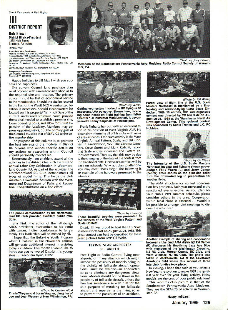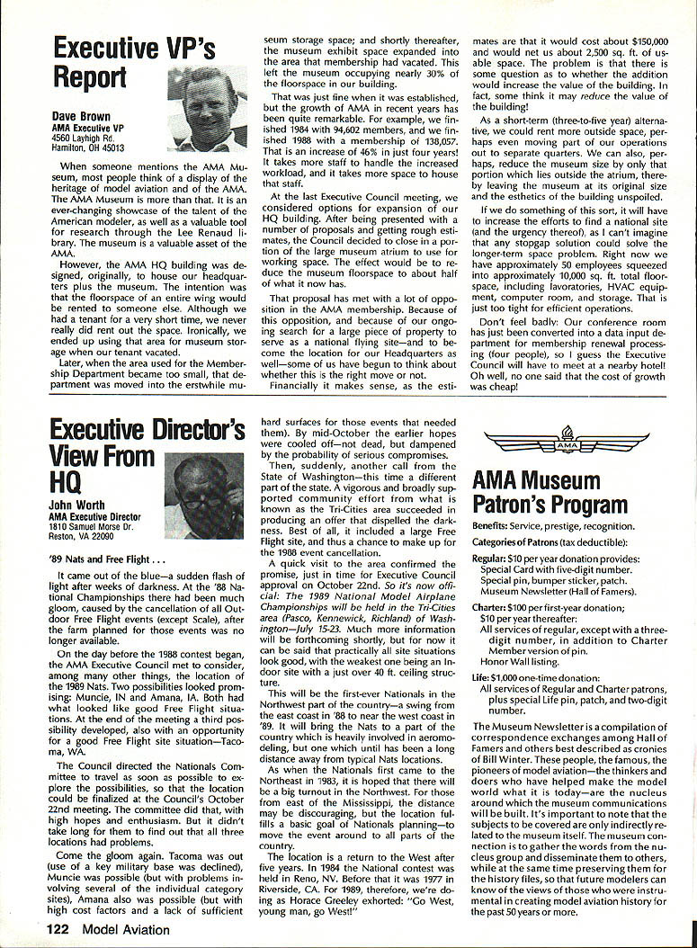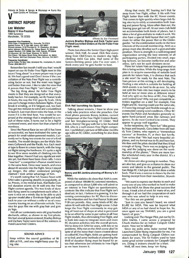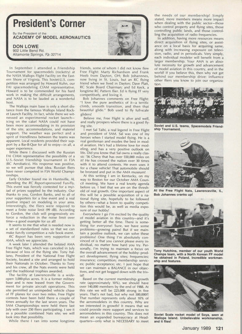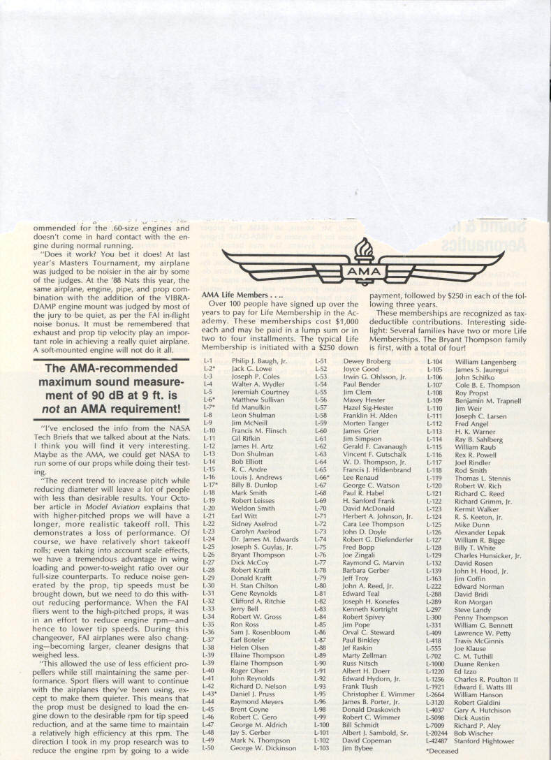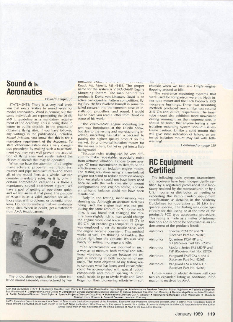 Sound & Aeronautics Howard Crispin Jr STATEMENTS There very reai prob lem exists relative sound levels model aeronautics Word coming out some individuals representing 90-dBat-9 ft guideline mandatory require ment Academy being done letters public officials process obtaining flying sites have followed writings publications including Model Aviation know mandatory requirement Academy state otherwise establishes very danger ous precedent making such false state ment may very well prevent acquisi tion flying sites surely restrict classes aircraft may operated have attention engine manufacturers propeller manufacturers muffler pipe manufacturersand above model fliers wholewe can consider mandatory rules As certain competition categories mandatory sound abatement figure have goal getting operations quiet will arrive point purpose 90-at-9 valid standard sites problems potential prob lems anything will endanger flying sites doubt get statement AMA Headquarters tornnce rruu. . , Road Mt Morris Ml 48458 proper name system VIBRA-DAMP Engine Mounting System man behind product David von Linsowe David active participant Pattern competition fly ing F3A has involved himself some de tailed research common areas stallation propellers sound would like have read letter David some work VIBRA-DAMP Engine Mounting Sys tem introduced Toledo Show due testing manufacturing volved marketing has taken backseat putting highest quality product market So universal isolation mount masses let us get little background Because noise testing can very diffi cult make repeatable especially noise airframe vibration chose use aver age G force transmission determine effectiveness isolation engine mount testing done using foam-isolated engine test stand reduce vibration absorp tion An airplane could have used because wide diversity mount configurations engines tested consist ent airframe isolation could have maintained Early testing inconsistency showing up Although accurate tach being used engine itself pro ducing same amount G forces time found changing mix ture slightly rich lean would change engine vibrational force 92 Cs 150 Cs An exhaust gas temperature gauge employed set needle valve engine became consistent method works well Im thinking building probe right airplane Its also very handy setting midrange idle accelerometer mounted such way measure both vertical rota tional vibration important because en gine vibrating both modes simultane ously main objective testing compare what has used versus what could accomplished special rubber compounds mount spacing lot credit needs go Myrle Hyde Dean Koger pioneering efforts soft Chips chuckle first saw engine flopping around idle reference mounting systems used comparison Hyde ner tube mount Tech Products 5305 neoprene bushings two mounting methods produced very similar test results 211/2 Cs 20 Cs respectively inner tube mount also exhibited movement during running neoprene should noted anyone testing new isolation mounting system should use ex treme caution Unlike solid mount will give some indication failure un tested isolation mount may fail little warning Continued page 120 RC Equipment Certified following radio systems transmitters receivers have independently cer tified registered professional test labo ratory retained manufacturer US importer distributor meeting exceeding Radio Control equipment specifications detailed Academy Guidelines operation 20 kHz fre quency spacing testing done spe cifically listing time products FCC type acceptance procedure listing made matter informa tion construed en dorsement products listed Airtronics Ai rtronics Spectra PCM 7P 7H Receiver Part No 92985 Quantum PCM 8P 8H Receiver Part No 92985 AirtronicsModule Series FM MD7P 75P Receiver Part No 92785 Vanguard FM/PCM 4 6 Receiver Part No 92965 Vanguard FM 4 6 Ch Receiver Part No 92765 Airtronics Airtronics Future issues Model Aviation will con tain expanded listing additional infor mation received AMA AMA HQ SERVICES STAFF 0 Executive Director John worth 0 Executive Coordinator Joyce Hager S Administrative Services Director Robert Iojslavek 0 Technical Director Bob Underwood 0 Comptroller Lynne Collins 0 Competition Services Director Micheiine Madison 0 Special Services Director Carl Maroney C Membership Director Mike Woodiolk C Public Relations Director Geoff Styles 0 Special Prolecte Director Doug Pratt e Publications Director Carl R Wheeley 0 Nate General Manager Vince Mankowaki 0 Museum Curator Hurst Bowers 0 General Counsel Jeremiah Courtney AMAs Executive Council equivalent Board Directors basically composed President Executive Vice President Executive Director 11 district vice Presidents officers provided space month AMA News publication What say space however matter personal viewpoint sole responsibility author views may may represent official position AMA Executive Council January 1989 119 photo above depicts vibration iso lation mount assembly manufactured Per 0 ommended 60-size engines doesnt come hard contact en gine during normal running Does work bet does last years Masters Tournament airplane judged noisier air some judges 88 Nats year same airplane engine pipe prop com bination addition VIBRA DAMP engine mount judged jury quiet per FAI in-flight noise bonus must remembered exhaust prop tip velocity play impor tant role achieving really quiet airplane soft-mounted engine will AMA AMA Life Members.. Over 100 people have signed up over years pay Life Membership Ac ademy memberships cost $1000 may paid lump sum two four installments typical Life Membership initiated $250 down payment followed $250 fol lowing three years memberships recognized taxdeductible contributions Interesting side light Several families have two Life Memberships Bryant Thompson family first total four AMA-recommended maximum sound measure ment 90 dB 9 ft AMA requirement Ive enclosed info NASA Tech Briefs talked about Nats think will find very interesting Maybe AMA could get NASA run some props doing test ing 