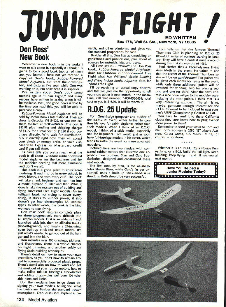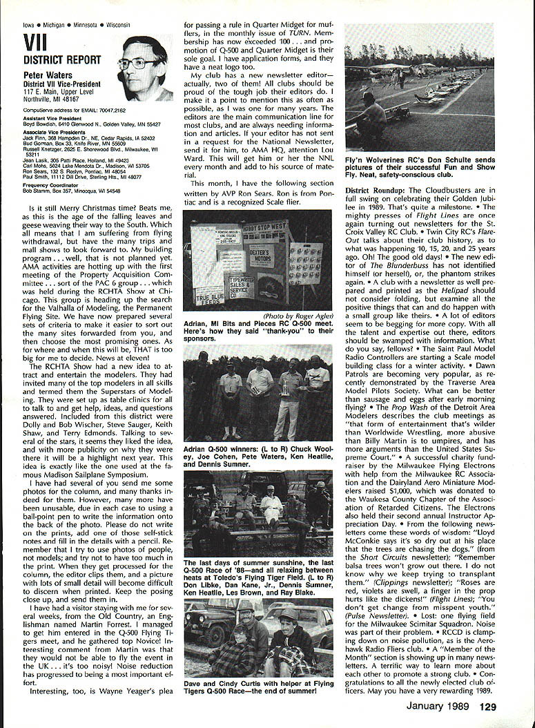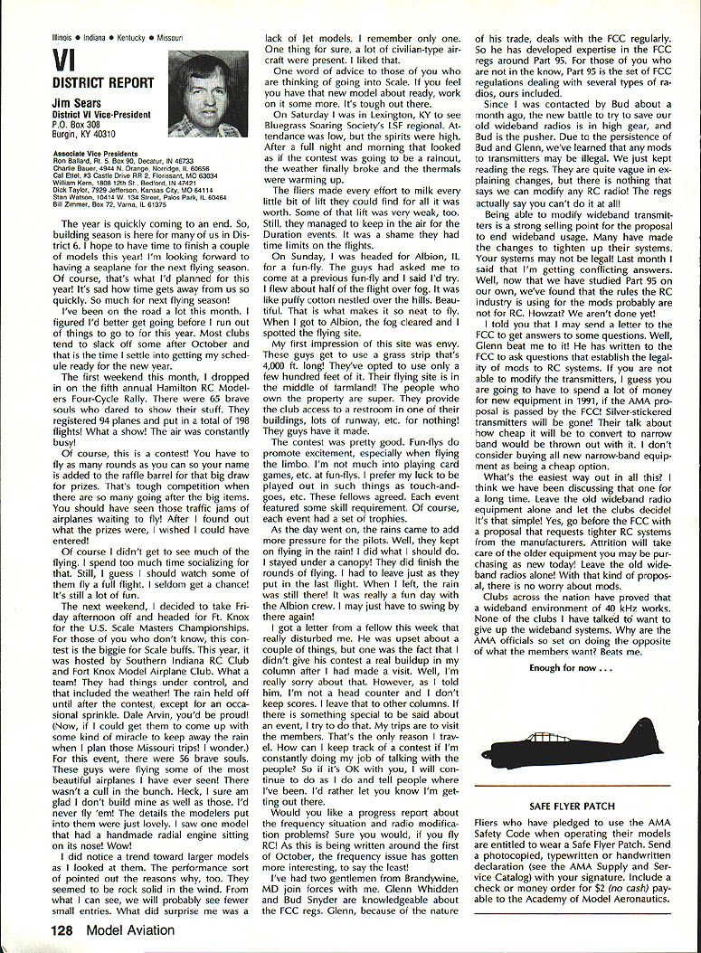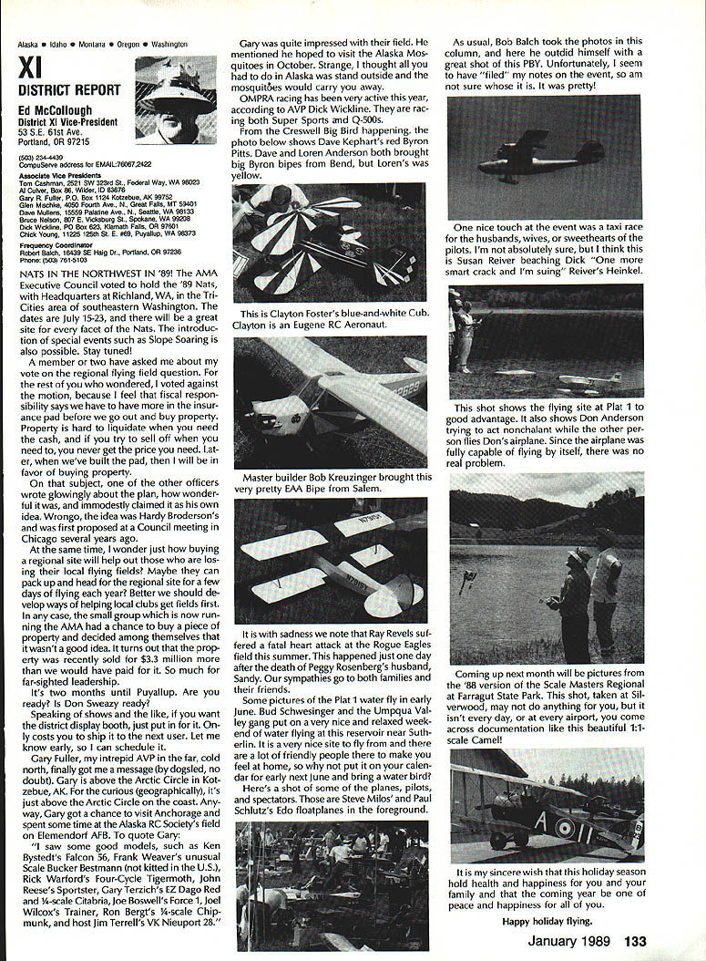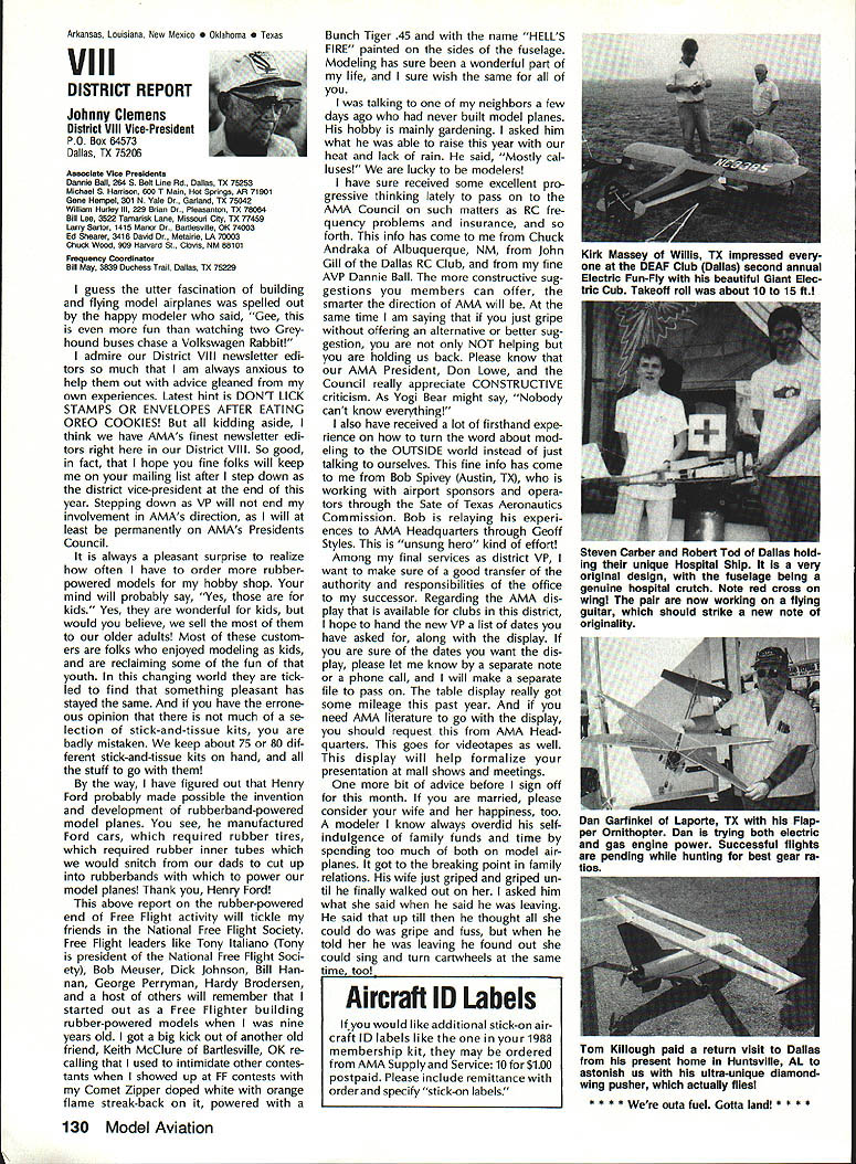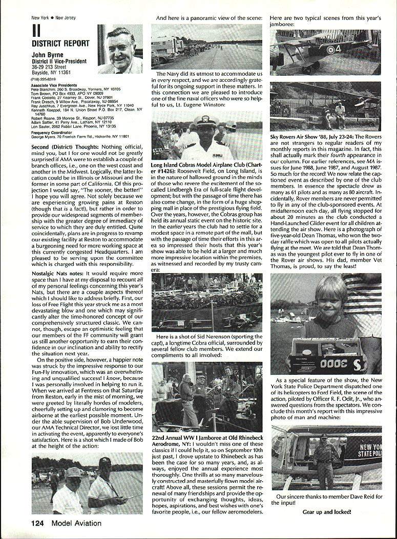 Sound & Aeronautics Howard Crispin Jr STATEMENTS There very reai prob lem exists relative sound levels model aeronautics Word coming out some individuals representing 90-dBat-9 ft guideline mandatory require ment Academy being done letters public officials process obtaining flying sites have followed writings publications including Model Aviation know mandatory requirement Academy state otherwise establishes very danger ous precedent making such false state ment may very well prevent acquisi tion flying sites surely restrict classes aircraft may operated have attention engine manufacturers propeller manufacturers muffler pipe manufacturersand above model fliers wholewe can consider mandatory rules As certain competition categories mandatory sound abatement figure have goal getting operations quiet will arrive point purpose 90-at-9 valid standard sites problems potential prob lems anything will endanger flying sites doubt get statement AMA Headquarters tornnce rruu. . , Road Mt Morris Ml 48458 proper name system VIBRA-DAMP Engine Mounting System man behind product David von Linsowe David active participant Pattern competition fly ing F3A has involved himself some de tailed research common areas stallation propellers sound would like have read letter David some work VIBRA-DAMP Engine Mounting Sys tem introduced Toledo Show due testing manufacturing volved marketing has taken backseat putting highest quality product market So universal isolation mount masses let us get little background Because noise testing can very diffi cult make repeatable especially noise airframe vibration chose use aver age G force transmission determine effectiveness isolation engine mount testing done using foam-isolated engine test stand reduce vibration absorp tion An airplane could have used because wide diversity mount configurations engines tested consist ent airframe isolation could have maintained Early testing inconsistency showing up Although accurate tach being used engine itself pro ducing same amount G forces time found changing mix ture slightly rich lean would change engine vibrational force 92 Cs 150 Cs An exhaust gas temperature gauge employed set needle valve engine became consistent method works well Im thinking building probe right airplane Its also very handy setting midrange idle accelerometer mounted such way measure both vertical rota tional vibration important because en gine vibrating both modes simultane ously main objective testing compare what has used versus what could accomplished special rubber compounds mount spacing lot credit needs go Myrle Hyde Dean Koger pioneering efforts soft Chips chuckle first saw engine flopping around idle reference mounting systems used comparison Hyde ner tube mount Tech Products 5305 neoprene bushings two mounting methods produced very similar test results 211/2 Cs 20 Cs respectively inner tube mount also exhibited movement during running neoprene should noted anyone testing new isolation mounting system should use ex treme caution Unlike solid mount will give some indication failure un tested isolation mount may fail little warning Continued page 120 RC Equipment Certified following radio systems transmitters receivers have independently cer tified registered professional test labo ratory retained manufacturer US importer distributor meeting exceeding Radio Control equipment specifications detailed Academy Guidelines operation 20 kHz fre quency spacing testing done spe cifically listing time products FCC type acceptance procedure listing made matter informa tion construed en dorsement products listed Airtronics Ai rtronics Spectra PCM 7P 7H Receiver Part No 92985 Quantum PCM 8P 8H Receiver Part No 92985 AirtronicsModule Series FM MD7P 75P Receiver Part No 92785 Vanguard FM/PCM 4 6 Receiver Part No 92965 Vanguard FM 4 6 Ch Receiver Part No 92765 Airtronics Airtronics Future issues Model Aviation will con tain expanded listing additional infor mation received AMA AMA HQ SERVICES STAFF 0 Executive Director John worth 0 Executive Coordinator Joyce Hager S Administrative Services Director Robert Iojslavek 0 Technical Director Bob Underwood 0 Comptroller Lynne Collins 0 Competition Services Director Micheiine Madison 0 Special Services Director Carl Maroney C Membership Director Mike Woodiolk C Public Relations Director Geoff Styles 0 Special Prolecte Director Doug Pratt e Publications Director Carl R Wheeley 0 Nate General Manager Vince Mankowaki 0 Museum Curator Hurst Bowers 0 General Counsel Jeremiah Courtney AMAs Executive Council equivalent Board Directors basically composed President Executive Vice President Executive Director 11 district vice Presidents officers provided space month AMA News publication What say space however matter personal viewpoint sole responsibility author views may may represent official position AMA Executive Council January 1989 119 photo above depicts vibration iso lation mount assembly manufactured Per 0 ommended 60-size engines doesnt come hard contact en gine during normal running Does work bet does last years Masters Tournament airplane judged noisier air some judges 88 Nats year same airplane engine pipe prop com bination addition VIBRA DAMP engine mount judged jury quiet per FAI in-flight noise bonus must remembered exhaust prop tip velocity play impor tant role achieving really quiet airplane soft-mounted engine will AMA AMA Life Members.. Over 100 people have signed up over years pay Life Membership Ac ademy memberships cost $1000 may paid lump sum two four installments typical Life Membership initiated $250 down payment followed $250 fol lowing three years memberships recognized taxdeductible contributions Interesting side light Several families have two Life Memberships Bryant Thompson family first total four AMA-recommended maximum sound measure ment 90 dB 9 ft AMA requirement Ive enclosed info NASA Tech Briefs talked about Nats think will find very interesting Maybe AMA could get NASA run some props doing test ing 
