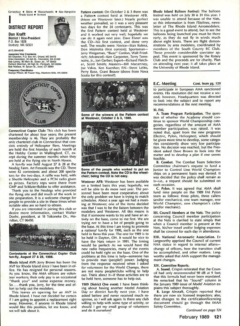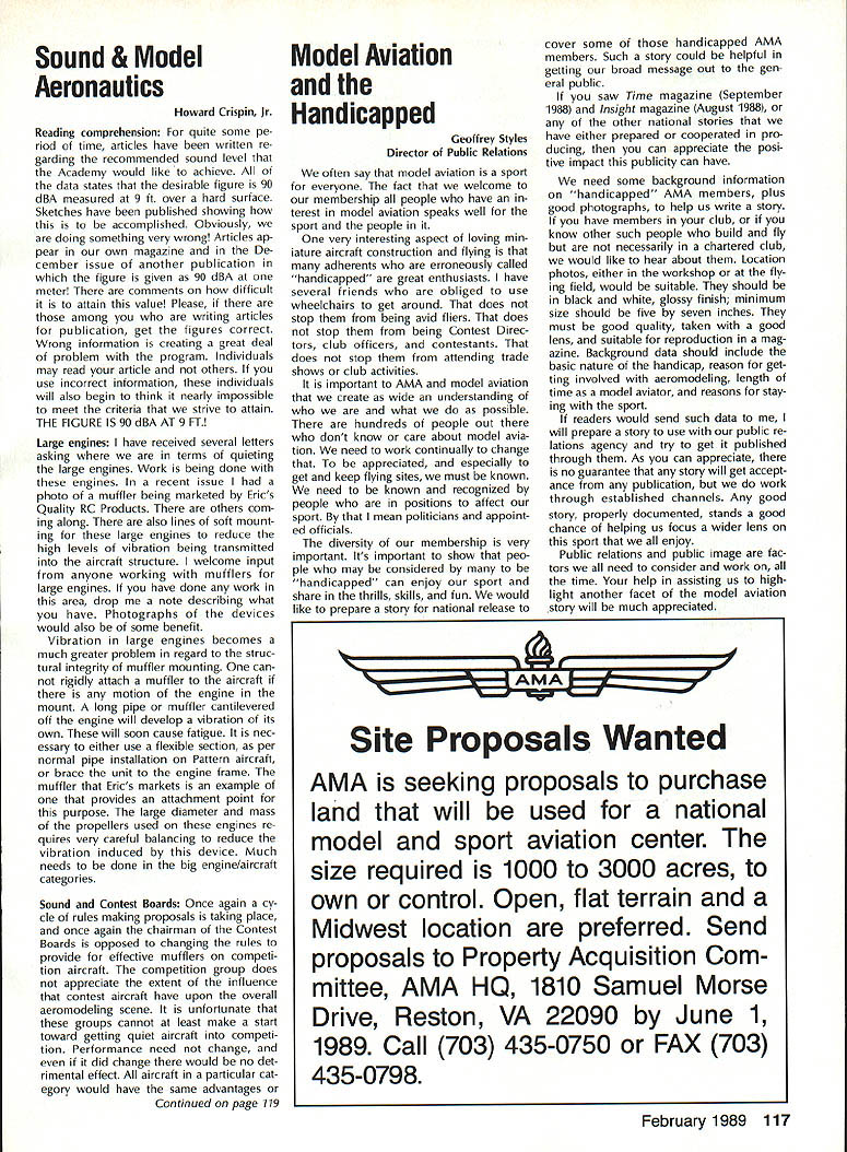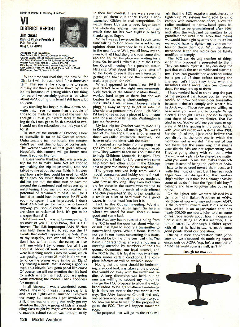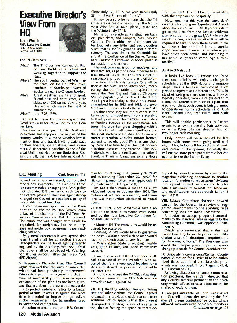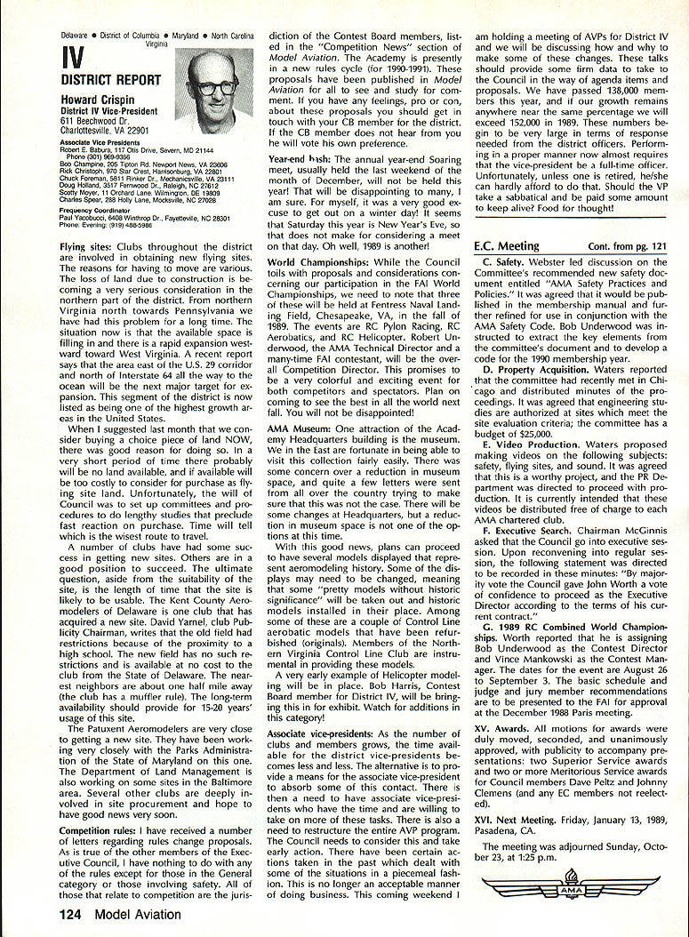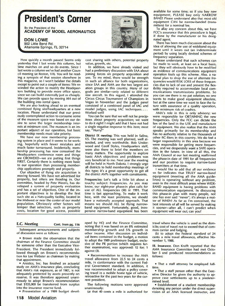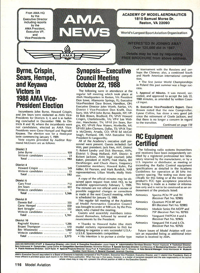 Byrne Crispin Sears Hempel Keyawa Victors 1988 AMA VicePresident Election Incumbents John Byrne Howard Crispin Jim Sears reelected AMA VicePresidents Districts 2 4 6 ballot ing concluded December 1988 Dis tricts 8 10 incumbents candidates elected AMA VicePresidents Gene Hempel Reginald Keyawa election three-year term commencing January 1 1989 Vote counts provided Auditor Ray mond McGivern follows District 2 John Byrne959 Write-in candidates23 Total982 District 4 Howard Crispin549 Write-in candidates33 Total582 District 6 Gary Frost712 Jim Sears853 Write-in candidates1 Total1566 District 8 Dannie Ball335 Gene Hempel830 Bert Striegler532 Write-in candidates4 Total1701 District 10 Reginald Keyawa1286 Bryant Thompson610 Bev Wisniewski1060 Write-in candidates17 Total2973 SynopsisExecutive Council Meeting October 221988 following attendance regular fall meeting took place AMA Headquarters Reston VA President Don Lowe Altamonte Springs FL Executive Vice-President Dave Brown Hamilton OH Executive Director John Worth Fairfax VA District Vice-President Don Krafft Dux bury MA VP-Il John Byrne Bayside NY VP Ill Bob Brown Bradford PA VP-IV Howard Crispin Charlottesville VA VP-V Lee Web ster Manchester TN VP-VI Jim Sears Bur gin KY VP-VII Pete Waters Northville Ml VP-VIII John Clemens Dallas TX VP-IX Trav McGinnis Arvada CO VP-XI Ed McCol lough Portland OR NAA Executive VicePresident Ev Langworthy Academys executive staff per sonnel present Guests included Earl Witt past president Jack Finn AVP District 7 Robert Landry Dick Sherman AVPs District 1 Doug Holland AVP District 4 Robert Jackson AMA legal counsel John Baker president AOPA Fred Marks Bill Hershberger Chuck Ahern Frequency Committee members Howard Kuhn Pat Miller Ed Pearson Mark Bundick NAR representatives Lillian Worth Molly Web ster copy official minutes may ob tained upon request AMA HQ available approximately February 1 1989 minutes official until review possible suggested changes corrections made next Council meeting scheduled January 13 1989 regular fall meeting Academy Model Aeronautics Executive Council brought order 900 am Pres ident chaired meeting Guests assembly members intro duced themselves followed several nouncements President Thanks Howard Kuhn AMA model rocketry representative FAI helping organize very successful USA USSR Spacemodels competition intention pursue similar type Approval Minutes moved sec onded approved accept July 22 1988 minutes amended written Coun cil input II Executive Vice-Presidents Report Dave Brown noted new Comptroller Lynne Collins has done very good job since retirement Gisele Jackson no longer concern regard transition Continued page 118 RC Equipment Certified following radio systems transmitters receivers have independently cer tified registered professional test labo ratory retained manufacturer US importer distributor meeting exceeding Radio Control equipment specifications detailed Academy Guidelines operation 20 kHz fre quency spacing testing done spe cifically listing time products FCC type acceptance procedure listing made matter informa tion construed en dorsement products listed AirtronicsSpectra PCM 7P 7H Receiver Part No 92985 AirtronicsQuantum PCM 8P 8H Receiver Part No 92985 AirtronicsModule Series FM MD7P 75P Receiver Part No 92785 AirtronicsVanguard FM/PCM 4 6 Receiver Part No 92965 AirtronicsVanguard FM 4 6 Ch Receiver Part No 92765 Future issues Model Aviation will con tain expanded listing additional infor mation received AMA AMA HO SERVICES STAFF 0 Executive Director John worth S Executive Coordinator Joyce Hager 0 Administrative Services Director Robert Vojslavek 0 Technicai Director Bob Underwood 0 Comptrolier Lynne Collins S Competition Services Director Micheline Madison 0 Special Servicee Director Carl Maroney erahip Director Mike woodtolk 0 Pubiic Relations Director Geoff Styles iai Prolects Director Doug Preit 0 Publicationa Director Ceri R Wheeley 0 Nata General Manager ymca Msnkowski 0 Muasum Curator Hurst Bowers 0 Generai Counsei Jeremish Courtney 116 Model Aviation AMA HO Executive DireCtor including reports AMA President Executive VP Vice-Presidents ACADEMY OF MODEL AERONAUTICS 1810 Samuel Morse Dr 3 Reston VA 22090 tournament Russians per haps Chinese also combined South North American international competi tion first Junior World Championships Poland past summer huge suc cess AMAs Executive Council equivalent Board Directors basically composed President Esecutive vice President Executive Director 11 district Vice Presidents officers provided space month AMA News publication What say space however matter personal viewpoint sole responsibility author views may may represent official position AMA Executive Council Sound & Model Aeronautics Howard Crispin Jr Reading comprehension quite some pe riod time articles have written re garding recommended sound level Academy would like achieve data states desirable figure 90 dBA measured 9 ft over hard surface Sketches have published showing accomplished Obviously doing something very wrong Articles ap pear own magazine De cember issue another publication figure given 90 dBA meter comments difficult attain value Please among writing articles publication get figures correct Wrong information creating great deal problem program Individuals may read article others use incorrect information individuals will also begin think nearly impossible meet criteria strive attain THE FIGURE IS 90 dBA AT 9 FT Large engines have received several letters asking terms quieting large engines Work being done engines recent issue photo muffler being marketed Erics Quality RC Products others com ing along also lines soft mount ing large engines reduce high levels vibration being transmitted aircraft structure welcome input anyone working mufflers large engines have done work area drop note describing what have Photographs devices would also some benefit Vibration large engines becomes much greater problem regard struc tural integrity muffler mounting 