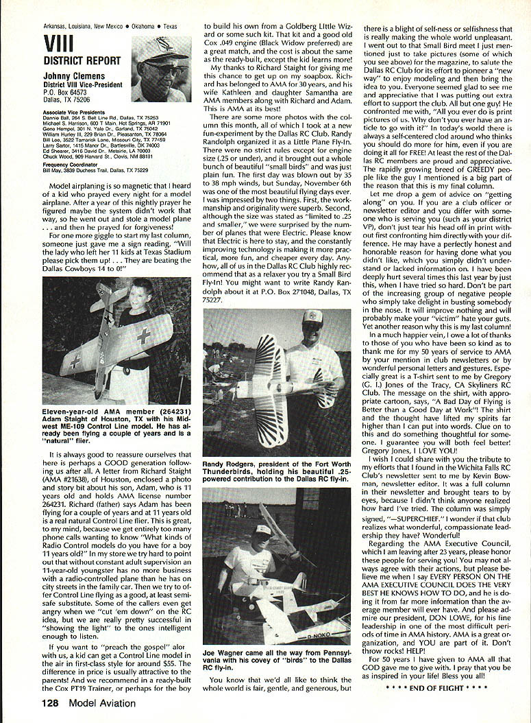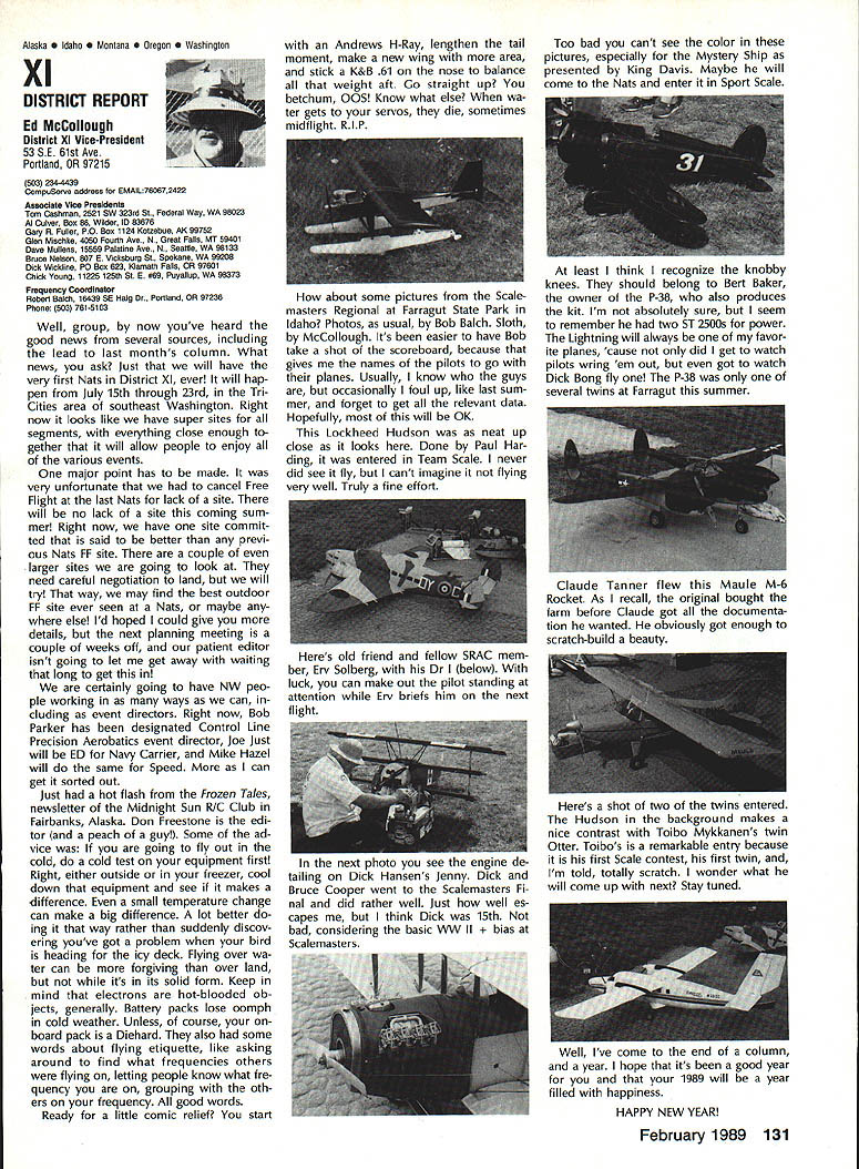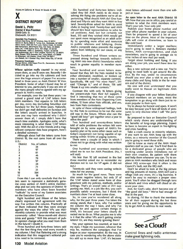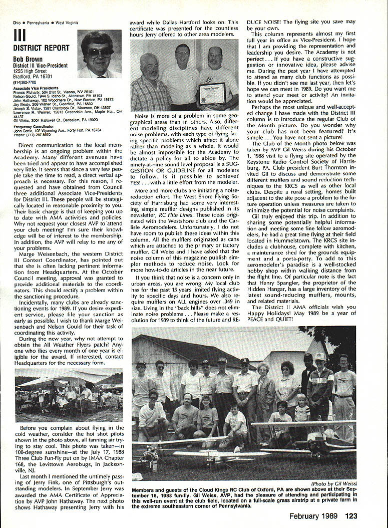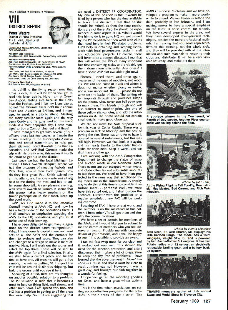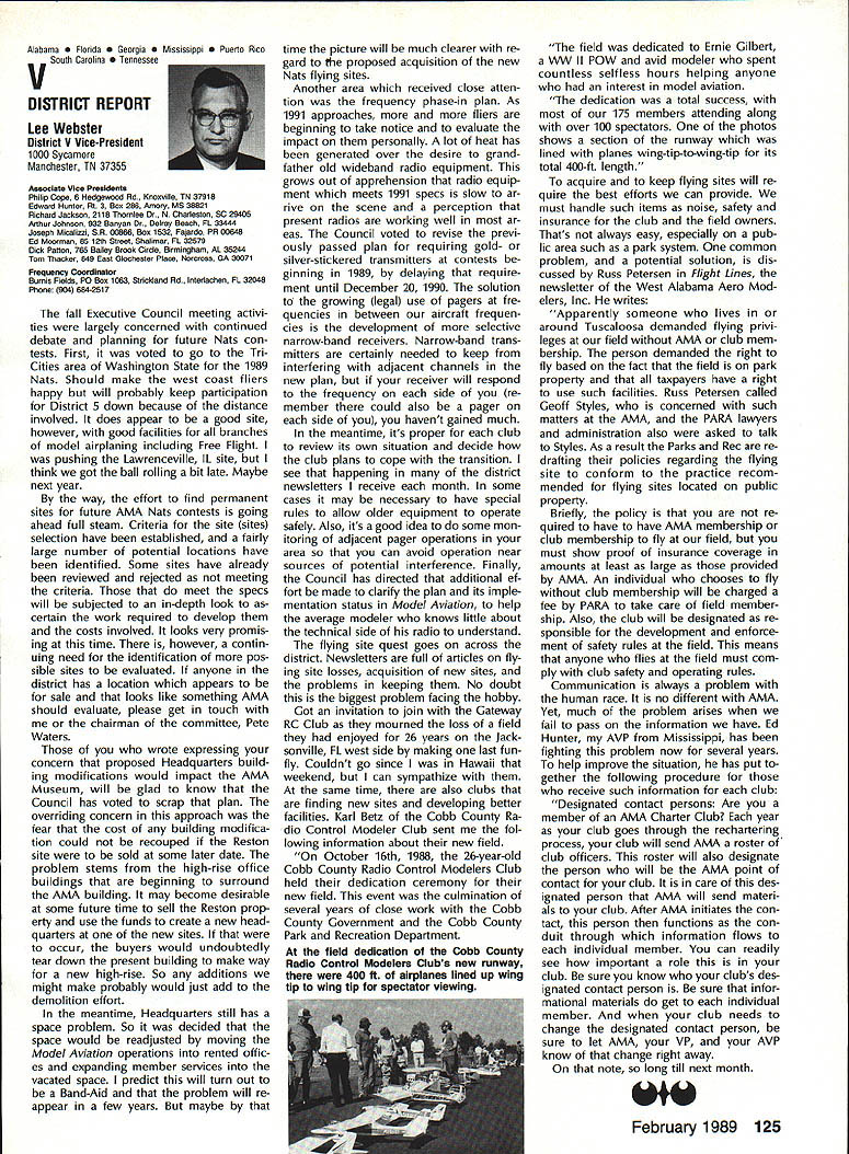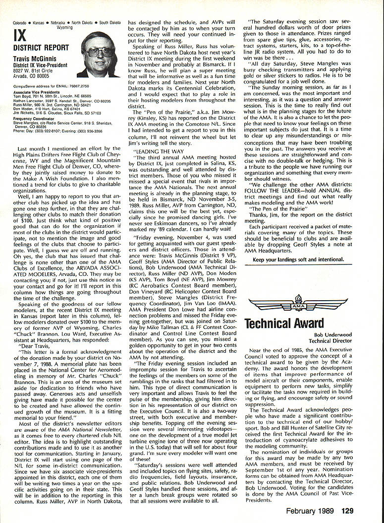 Byrne Crispin Sears Hempel Keyawa Victors 1988 AMA VicePresident Election Incumbents John Byrne Howard Crispin Jim Sears reelected AMA VicePresidents Districts 2 4 6 ballot ing concluded December 1988 Dis tricts 8 10 incumbents candidates elected AMA VicePresidents Gene Hempel Reginald Keyawa election three-year term commencing January 1 1989 Vote counts provided Auditor Ray mond McGivern follows District 2 John Byrne959 Write-in candidates23 Total982 District 4 Howard Crispin549 Write-in candidates33 Total582 District 6 Gary Frost712 Jim Sears853 Write-in candidates1 Total1566 District 8 Dannie Ball335 Gene Hempel830 Bert Striegler532 Write-in candidates4 Total1701 District 10 Reginald Keyawa1286 Bryant Thompson610 Bev Wisniewski1060 Write-in candidates17 Total2973 SynopsisExecutive Council Meeting October 221988 following attendance regular fall meeting took place AMA Headquarters Reston VA President Don Lowe Altamonte Springs FL Executive Vice-President Dave Brown Hamilton OH Executive Director John Worth Fairfax VA District Vice-President Don Krafft Dux bury MA VP-Il John Byrne Bayside NY VP Ill Bob Brown Bradford PA VP-IV Howard Crispin Charlottesville VA VP-V Lee Web ster Manchester TN VP-VI Jim Sears Bur gin KY VP-VII Pete Waters Northville Ml VP-VIII John Clemens Dallas TX VP-IX Trav McGinnis Arvada CO VP-XI Ed McCol lough Portland OR NAA Executive VicePresident Ev Langworthy Academys executive staff per sonnel present Guests included Earl Witt past president Jack Finn AVP District 7 Robert Landry Dick Sherman AVPs District 1 Doug Holland AVP District 4 Robert Jackson AMA legal counsel John Baker president AOPA Fred Marks Bill Hershberger Chuck Ahern Frequency Committee members Howard Kuhn Pat Miller Ed Pearson Mark Bundick NAR representatives Lillian Worth Molly Web ster copy official minutes may ob tained upon request AMA HQ available approximately February 1 1989 minutes official until review possible suggested changes corrections made next Council meeting scheduled January 13 1989 regular fall meeting Academy Model Aeronautics Executive Council brought order 900 am Pres ident chaired meeting Guests assembly members intro duced themselves followed several nouncements President Thanks Howard Kuhn AMA model rocketry representative FAI helping organize very successful USA USSR Spacemodels competition intention pursue similar type Approval Minutes moved sec onded approved accept July 22 1988 minutes amended written Coun cil input II Executive Vice-Presidents Report Dave Brown noted new Comptroller Lynne Collins has done very good job since retirement Gisele Jackson no longer concern regard transition Continued page 118 RC Equipment Certified following radio systems transmitters receivers have independently cer tified registered professional test labo ratory retained manufacturer US importer distributor meeting exceeding Radio Control equipment specifications detailed Academy Guidelines operation 20 kHz fre quency spacing testing done spe cifically listing time products FCC type acceptance procedure listing made matter informa tion construed en dorsement products listed AirtronicsSpectra PCM 7P 7H Receiver Part No 92985 AirtronicsQuantum PCM 8P 8H Receiver Part No 92985 AirtronicsModule Series FM MD7P 75P Receiver Part No 92785 AirtronicsVanguard FM/PCM 4 6 Receiver Part No 92965 AirtronicsVanguard FM 4 6 Ch Receiver Part No 92765 Future issues Model Aviation will con tain expanded listing additional infor mation received AMA AMA HO SERVICES STAFF 0 Executive Director John worth S Executive Coordinator Joyce Hager 0 Administrative Services Director Robert Vojslavek 0 Technicai Director Bob Underwood 0 Comptrolier Lynne Collins S Competition Services Director Micheline Madison 0 Special Servicee Director Carl Maroney erahip Director Mike woodtolk 0 Pubiic Relations Director Geoff Styles iai Prolects Director Doug Preit 0 Publicationa Director Ceri R Wheeley 0 Nata General Manager ymca Msnkowski 0 Muasum Curator Hurst Bowers 0 Generai Counsei Jeremish Courtney 116 Model Aviation AMA HO Executive DireCtor including reports AMA President Executive VP Vice-Presidents ACADEMY OF MODEL AERONAUTICS 1810 Samuel Morse Dr 3 Reston VA 22090 tournament Russians per haps Chinese also combined South North American international competi tion first Junior World Championships Poland past summer huge suc cess AMAs Executive Council equivalent Board Directors basically composed President Esecutive vice President Executive Director 11 district Vice Presidents officers provided space month AMA News publication What say space however matter personal viewpoint sole responsibility author views may may represent official position AMA Executive Council Sound & Model Aeronautics Howard Crispin Jr Reading comprehension quite some pe riod time articles have written re garding recommended sound level Academy would like achieve data states desirable figure 90 dBA measured 9 ft over hard surface Sketches have published showing accomplished Obviously doing something very wrong Articles ap pear own magazine De cember issue another publication figure given 90 dBA meter comments difficult attain value Please among writing articles publication get figures correct Wrong information creating great deal problem program Individuals may read article others use incorrect information individuals will also begin think nearly impossible meet criteria strive attain THE FIGURE IS 90 dBA AT 9 FT Large engines have received several letters asking terms quieting large engines Work being done engines recent issue photo muffler being marketed Erics Quality RC Products others com ing along also lines soft mount ing large engines reduce high levels vibration being transmitted aircraft structure welcome input anyone working mufflers large engines have done work area drop note describing what have Photographs devices would also some benefit Vibration large engines becomes much greater problem regard struc tural integrity muffler mounting 