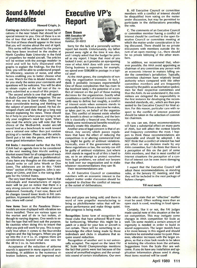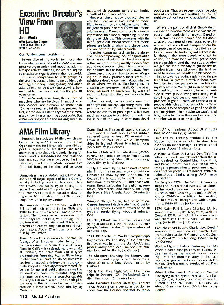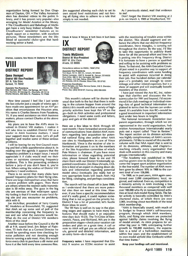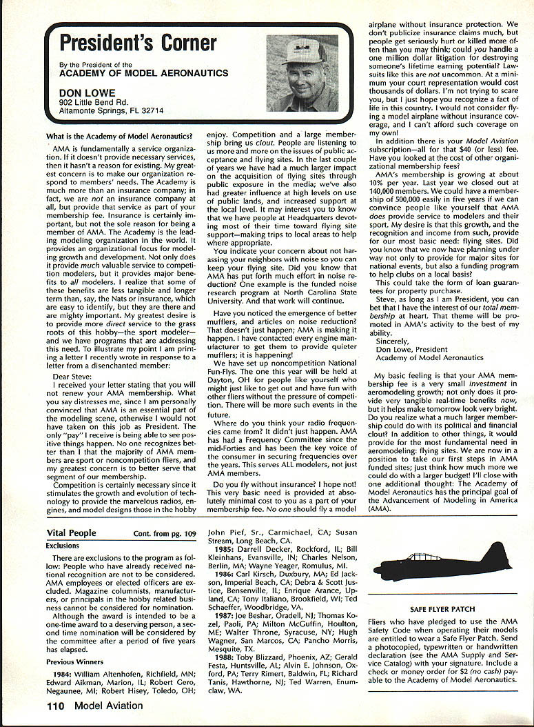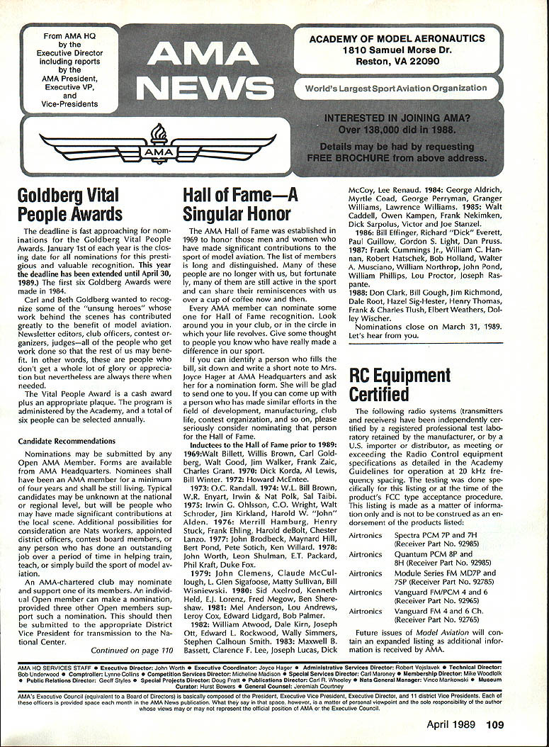 Goldberg Vital People Awards deadline fast approaching nom inations Goldberg Vital People Awards January 1st year clos ing date nominations presti gious valuable recognition year deadline has extended until April 30 1989 first six Goldberg Awards made 1984 Carl Beth Goldberg wanted recog nize some unsung heroes work behind scenes has contributed greatly benefit model aviation Newsletter editors club officers contest ganizers judgesall people get work done rest us may bene fit other words people dont get whole lot glory apprecia tion nevertheless always needed Vital People Award cash award plus appropriate plaque program administered Academy total six people can selected annually Candidate Recommendations Nominations may submitted Open AMA Member Forms available AMA Headquarters Nominees shall have AMA member minimum four years shall still living Typical candidates may unknown national regional level will people may have made significant contributions local scene Additional possibilities consideration Nats workers appointed district officers contest board members person has done outstanding job over period time helping train teach simply build sport model av iation An AMA-chartered club may nominate support its members An individ ual Open member can make nomination provided three other Open members sup port such nomination should submitted appropriate District Vice President transmission Na tional Center Continued page 110 Hall FameA Singular Honor AMA Hall Fame established 1969 honor men women have made significant contributions sport model aviation list members long distinguished people no longer us fortunate ly still active sport can share reminiscences us over cup coffee now AMA member can nominate some Hall Fame recognition Look around club circle life revolves Give some thought people know have really made difference sport can identify person fills bill sit down write short note Mrs Joyce Hager AMA Headquarters ask nomination form will glad send you can come up person has made similar efforts field development manufacturing club life contest organization please seriously consider nominating person Hall Fame Inductees Hall Fame prior 1989 1969Walt Billett Willis Brown Carl Gold berg Walt Good Jim Walker Frank Zaic Charles Grant 1970 Dick Korda Al Lewis Bill Winter 1972 Howard McEntee 1973 OC Randall 1974 WL Bill Brown WR Enyart Irwin & Nat Polk Sal Taibi 1975 Irwin G Ohlsson CO Wright Walt Schroder Jim Kirkland Harold W John Alden 1976 Merrill Hamburg Henry Stuck Frank Ehling Harold deBolt Chester Lanzo 1977 John Brodbeck Maynard Hill Bert Pond Pete Sotich Ken Willard 1978 John Worth Leon Shulman ET Packard Phil Kraft Duke Fox 1979 John Clemens Claude McCul lough L Glen Sigafoose Matty Sullivan Bill Wisniewski 1980 Sid Axelrod Kenneth Held EJ Lorenz Fred Megow Ben Shere shaw 1981 Mel Anderson Lou Andrews Leroy Cox Edward Lidgard Bob Palmer 1982 William Atwood Dale Kim Joseph Ott Edward L Rockwood Wally Simmers Stephen Calhoun Smith 1983 Maxwell B Bassett Clarence F Lee Joseph Lucas Dick McCoy Lee Renaud 1984 George Aldrich Myrtle Coad George Perryman Granger Williams Lawrence Williams 1985 Walt Caddell Owen Kampen Frank Nekimken Dick Sarpolus Victor Joe Stanzel 1986 Bill Effinger Richard Dick Everett Paul Guillow Gordon S Light Dan Pruss 1987 Frank Cummings Jr William C Hannan Robert Hatschek Bob Holland Walter Musciano William Northrop John Pond William Phillips Lou Proctor Joseph Ras pante 1988 Don Clark Bill Gough Jim Richmond Dale Root Hazel Sig-Hester Henry Thomas Frank & Charles Tlush Elbert Weathers Dol ley Wischer Nominations close March 31 1989 Lets hear RC Equipment Certified following radio systems transmitters receivers have independently cer tified registered professional test labo ratory retained manufacturer US importer distributor meeting exceeding Radio Control equipment specifications detailed Academy Guidelines operation 20 kHz fre quency spacing testing done spe cifically listing time products FCC type acceptance procedure listing made matter informa tion construed en dorsement products listed AirtronicsSpectra PCM 7P 7H Receiver Part No 92985 AirtronicsQuantum PCM 8P 8H Receiver Part No 92985 AirtronicsModule Series FM MD7P 75P Receiver Part No 92785 AirtronicsVanguard FM/PCM 4 6 Receiver Part No 92965 AirtronicsVanguard FM 4 6 Ch Receiver Part No 92765 Future issues Model Aviation will con tain expanded listing additional infor mation received AMA AMA HO SERVICES STAFF 0 Executive Director John Worth 0 Executive Coordinator Joyce Hager 0 Administrative Services Director Robert Voislavek S Technicai Director Bob Underwood e Comptroiier Lynne Collins 0 Competition Servicex Director Micheline Madison 0 Specici Services Director Carl Maroney ership Director Mike Woodfolk 0 Pubiic Reiations Director Geoff Styles iai Prolecta Director Doug Pratt 0 Pubiicationa Director Carl R Wheeiey S Nats Generai Manager Vince Mankowaki S Muasum Curator Hurst Bowers 0 General Counsei Jeremiah Courtney April 1989 109 AMA HO Executive Director including reports AMA President Executive VP Vice-Presidents ACADEMY OF MODEL AERONAUTICS 1810 Samuel Morse Dr Reston VA 22090 Worlds Largest Sport Aviation Organization AMAs Esecutive Council equivalent Board Directors basically composed President Executive Vice President Esecutive Director 11 district Vice Presidents Bach ihese officers provided space month AMA News publication What say space however matter personal viewpoint sole responsibility author views may may represent official position AMA Executive Council Presidents Corner President ACADEMY OF MODEL AERONAUTICS DON LOWE 902 Little Bend Rd Altamonte Springs FL 32714 What Academy Model Aeronautics AMA fundamentally service organiza tion doesnt provide necessary services hasnt reason existing great est concern make organization re spond members needs Academy much insurance company fact insurance company provide service part membership fee Insurance certainly im portant sole reason being