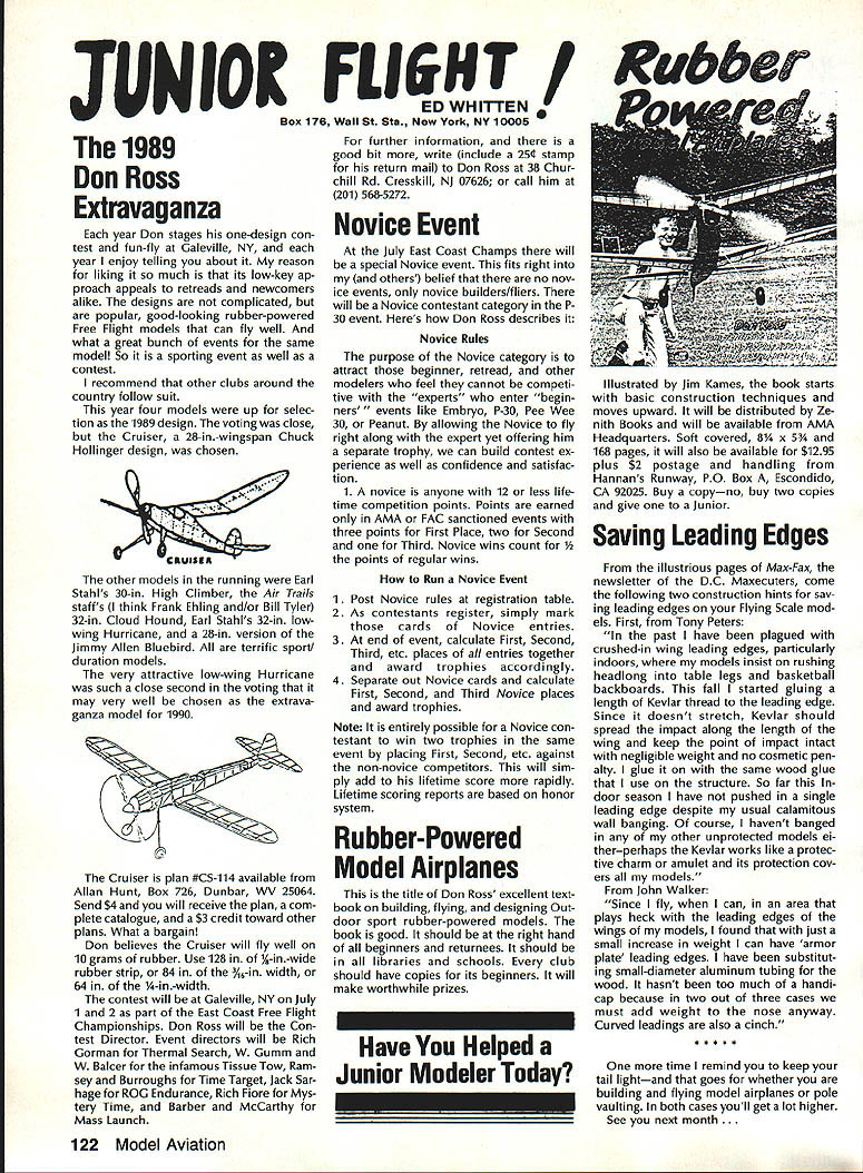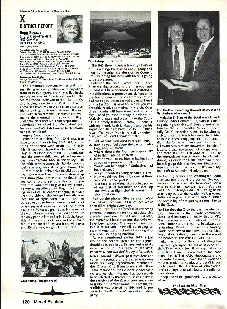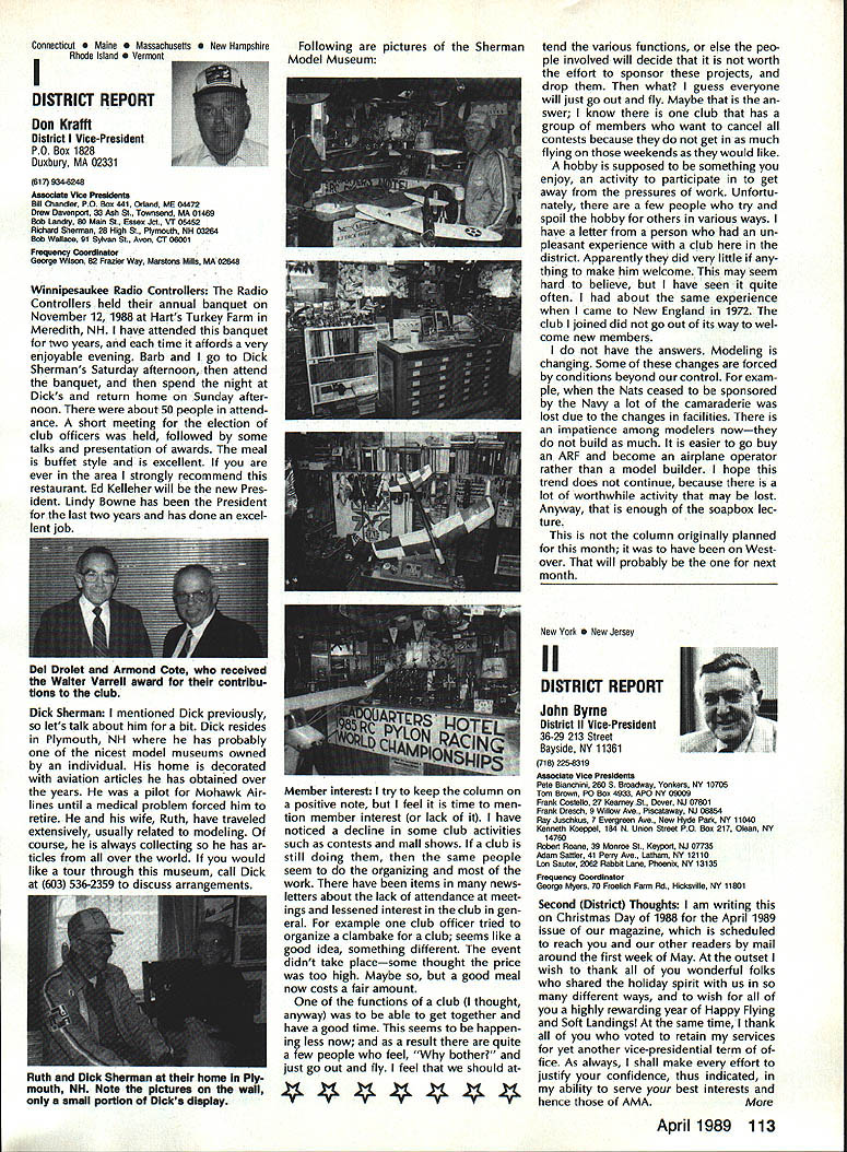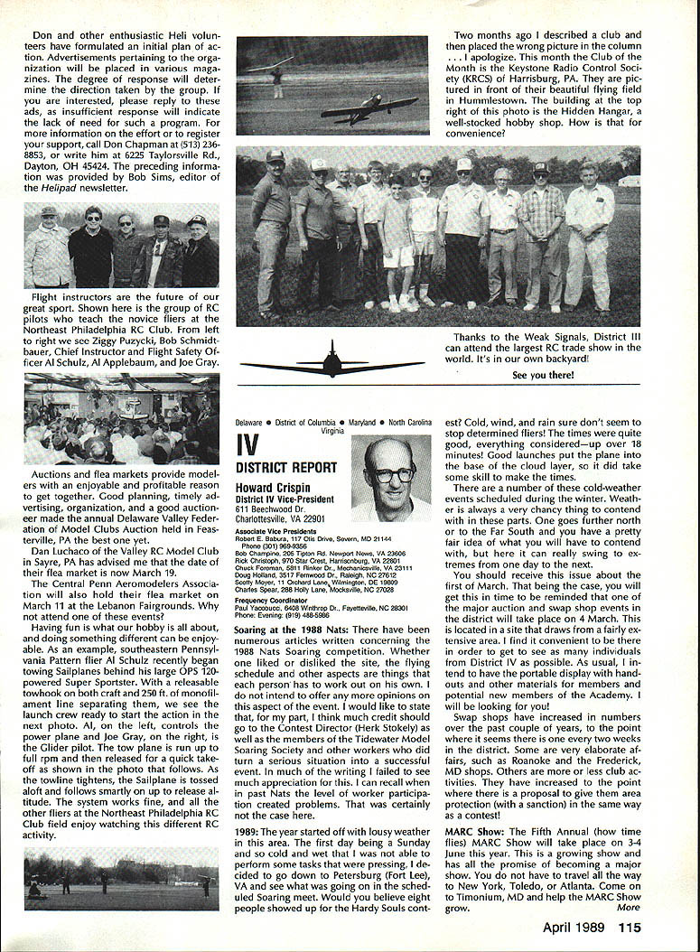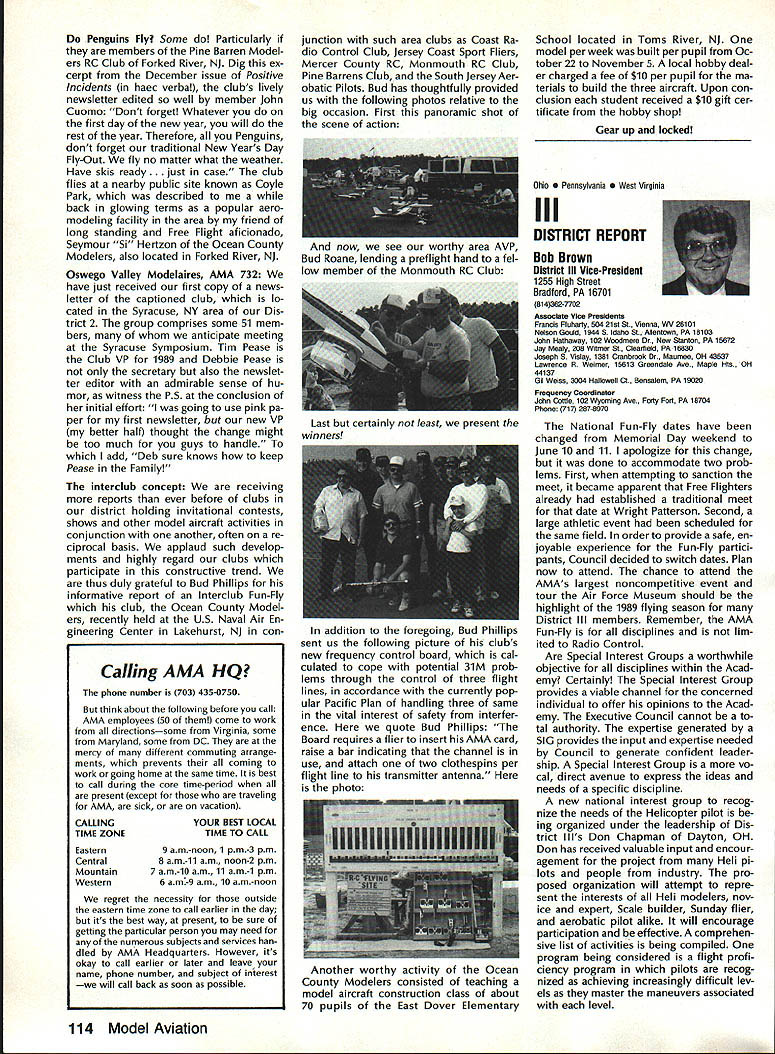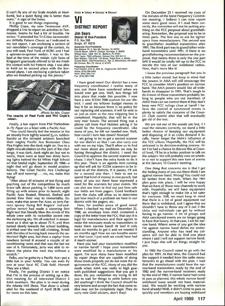 Goldberg Vital People Awards deadline fast approaching nom inations Goldberg Vital People Awards January 1st year clos ing date nominations presti gious valuable recognition year deadline has extended until April 30 1989 first six Goldberg Awards made 1984 Carl Beth Goldberg wanted recog nize some unsung heroes work behind scenes has contributed greatly benefit model aviation Newsletter editors club officers contest ganizers judgesall people get work done rest us may bene fit other words people dont get whole lot glory apprecia tion nevertheless always needed Vital People Award cash award plus appropriate plaque program administered Academy total six people can selected annually Candidate Recommendations Nominations may submitted Open AMA Member Forms available AMA Headquarters Nominees shall have AMA member minimum four years shall still living Typical candidates may unknown national regional level will people may have made significant contributions local scene Additional possibilities consideration Nats workers appointed district officers contest board members person has done outstanding job over period time helping train teach simply build sport model av iation An AMA-chartered club may nominate support its members An individ ual Open member can make nomination provided three other Open members sup port such nomination should submitted appropriate District Vice President transmission Na tional Center Continued page 110 Hall FameA Singular Honor AMA Hall Fame established 1969 honor men women have made significant contributions sport model aviation list members long distinguished people no longer us fortunate ly still active sport can share reminiscences us over cup coffee now AMA member can nominate some Hall Fame recognition Look around club circle life revolves Give some thought people know have really made difference sport can identify person fills bill sit down write short note Mrs Joyce Hager AMA Headquarters ask nomination form will glad send you can come up person has made similar efforts field development manufacturing club life contest organization please seriously consider nominating person Hall Fame Inductees Hall Fame prior 1989 1969Walt Billett Willis Brown Carl Gold berg Walt Good Jim Walker Frank Zaic Charles Grant 1970 Dick Korda Al Lewis Bill Winter 1972 Howard McEntee 1973 OC Randall 1974 WL Bill Brown WR Enyart Irwin & Nat Polk Sal Taibi 1975 Irwin G Ohlsson CO Wright Walt Schroder Jim Kirkland Harold W John Alden 1976 Merrill Hamburg Henry Stuck Frank Ehling Harold deBolt Chester Lanzo 1977 John Brodbeck Maynard Hill Bert Pond Pete Sotich Ken Willard 1978 John Worth Leon Shulman ET Packard Phil Kraft Duke Fox 1979 John Clemens Claude McCul lough L Glen Sigafoose Matty Sullivan Bill Wisniewski 1980 Sid Axelrod Kenneth Held EJ Lorenz Fred Megow Ben Shere shaw 1981 Mel Anderson Lou Andrews Leroy Cox Edward Lidgard Bob Palmer 1982 William Atwood Dale Kim Joseph Ott Edward L Rockwood Wally Simmers Stephen Calhoun Smith 1983 Maxwell B Bassett Clarence F Lee Joseph Lucas Dick McCoy Lee Renaud 1984 George Aldrich Myrtle Coad George Perryman Granger Williams Lawrence Williams 1985 Walt Caddell Owen Kampen Frank Nekimken Dick Sarpolus Victor Joe Stanzel 1986 Bill Effinger Richard Dick Everett Paul Guillow Gordon S Light Dan Pruss 1987 Frank Cummings Jr William C Hannan Robert Hatschek Bob Holland Walter Musciano William Northrop John Pond William Phillips Lou Proctor Joseph Ras pante 1988 Don Clark Bill Gough Jim Richmond Dale Root Hazel Sig-Hester Henry Thomas Frank & Charles Tlush Elbert Weathers Dol ley Wischer Nominations close March 31 1989 Lets hear RC Equipment Certified following radio systems transmitters receivers have independently cer tified registered professional test labo ratory retained manufacturer US importer distributor meeting exceeding Radio Control equipment specifications detailed Academy Guidelines operation 20 kHz fre quency spacing testing done spe cifically listing time products FCC type acceptance procedure listing made matter informa tion construed en dorsement products listed AirtronicsSpectra PCM 7P 7H Receiver Part No 92985 AirtronicsQuantum PCM 8P 8H Receiver Part No 92985 AirtronicsModule Series FM MD7P 75P Receiver Part No 92785 AirtronicsVanguard FM/PCM 4 6 Receiver Part No 92965 AirtronicsVanguard FM 4 6 Ch Receiver Part No 92765 Future issues Model Aviation will con tain expanded listing additional infor mation received AMA AMA HO SERVICES STAFF 0 Executive Director John Worth 0 Executive Coordinator Joyce Hager 0 Administrative Services Director Robert Voislavek S Technicai Director Bob Underwood e Comptroiier Lynne Collins 0 Competition Servicex Director Micheline Madison 0 Specici Services Director Carl Maroney ership Director Mike Woodfolk 0 Pubiic Reiations Director Geoff Styles iai Prolecta Director Doug Pratt 0 Pubiicationa Director Carl R Wheeiey S Nats Generai Manager Vince Mankowaki S Muasum Curator Hurst Bowers 0 General Counsei Jeremiah Courtney April 1989 109 AMA HO Executive Director including reports AMA President Executive VP Vice-Presidents ACADEMY OF MODEL AERONAUTICS 1810 Samuel Morse Dr Reston VA 22090 Worlds Largest Sport Aviation Organization AMAs Esecutive Council equivalent Board Directors basically composed President Executive Vice President Esecutive Director 11 district Vice Presidents Bach ihese officers provided space month AMA News publication What say space however matter personal viewpoint sole responsibility author views may may represent official position AMA Executive Council Presidents Corner President ACADEMY OF MODEL AERONAUTICS DON LOWE 902 Little Bend Rd Altamonte Springs FL 32714 What Academy Model Aeronautics AMA fundamentally service organiza tion doesnt provide necessary services hasnt reason existing great est concern make organization re spond members needs Academy much insurance company fact insurance company provide service part membership fee Insurance certainly im portant sole reason being