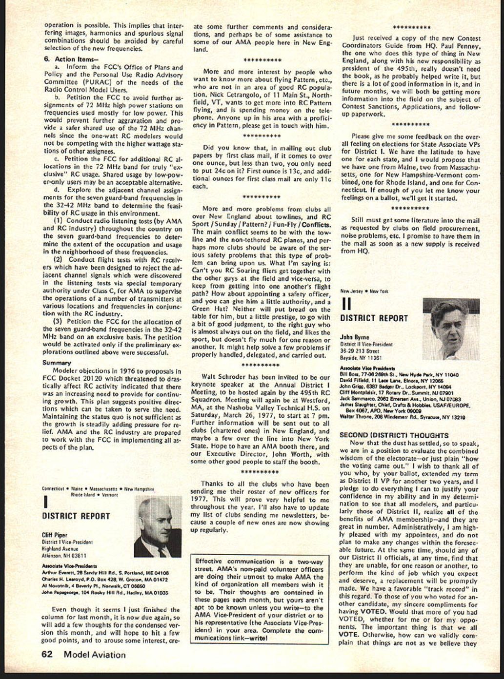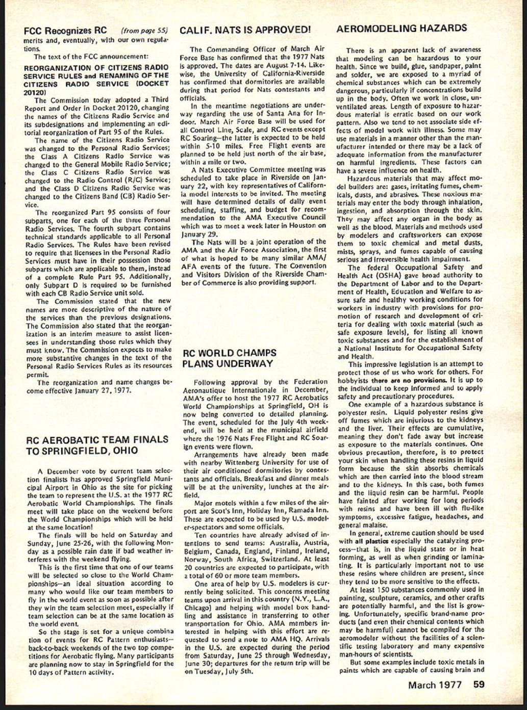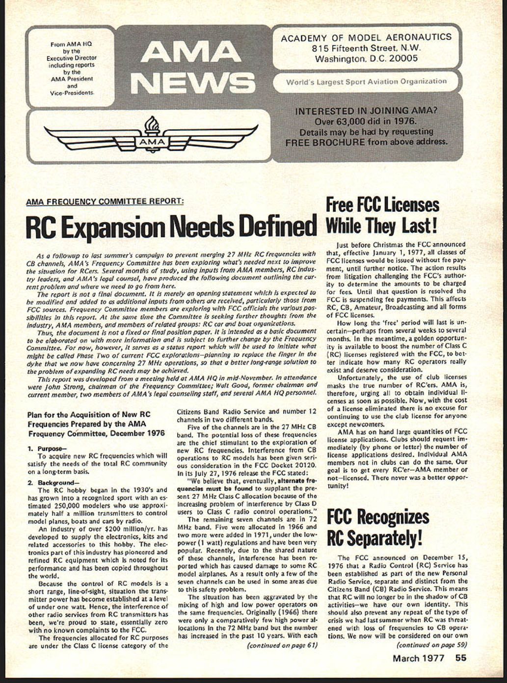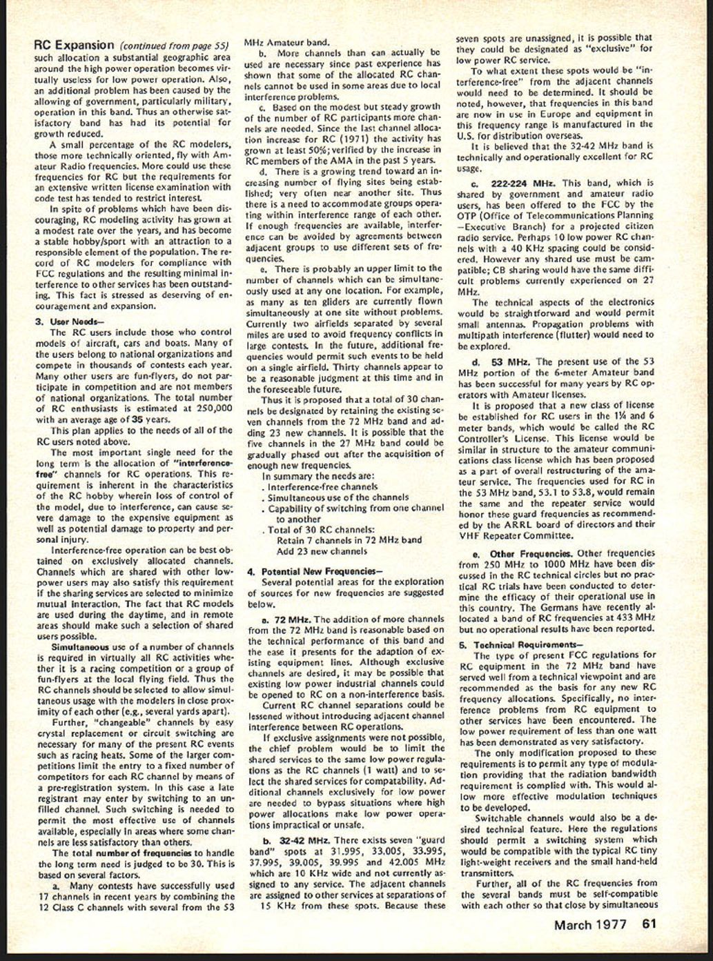 AMA FREQUENCY COMMITTEE REPORTFree FCC Licenses RC Expansion Needs Defined Last As folio wup last summers campaign prevent merging 27 MHz RC frequencies CB channels AMAs Frequency Committee has exploring whats needed next improve situation RCers Several months study using inputs AMA members RC indus try leaders AMA s legal counsel have produced following document outlining cur rent problem need go report final document merely opening statement expected modified added additional inputs others received particularly FCC sources Frequency Committee members exploring FCC officials various pos sibilities report same time Committee seeking further thoughts industry MA members members related groups RC car boat organizations Thus document fixed final position paper intended basic document elaborated information subject further change Frequency Committee now however serves status report will used initiate what might called Phase Two current FCC explorationsplanning replace finger dyke now have concerning 27 MHz operations better long-range solution problem expanding RC needs may achieved report developed meeting held AMA HQ mid-November attendance John Strong chairman Frequency Committee Walt Good former chairman current member two members AMA s legal counseling staff several AMA HQ personnel Plan Acquisition New RC Frequencies Prepared AMA Frequency Committee December 1976 1 Purpose acquire new RC frequencies will satisfy needs total RC community long-term basis 2 Background RC hobby began 1930s has grown recognized sport es timated 250000 modelers use approxi mately half million transmitters control model planes boats cars radio An industry over $200 million/yr has developed supply electronics kits related accessories hobby elec tronics part industry has pioneered refined RC equipment noted its performance has copied throughout world Because control RC models short range line-of-sight situation trans mitter power has become established level under watt Hence interference other radio services RC transmitters has proud state essentially zero no known complaints FCC frequencies allocated RC purposes under Class C license category Citizens Band Radio Service number 12 channels two different bands Five channels 27 MHz CB band potential loss frequencies chief stimulant exploration new RC frequencies Interference CB operations RC models has given seri ous consideration FCC Docket 20120 its July 27 1976 release FCC stated believe eventuallyalternatefro quencies must found supplant pre sent 27 MHz Class C allocation because increasing problem interference Class D users Class C radio control operations remaining seven channels 72 MHz band Five allocated 1966 two added 1971 under lowpower 1 watt regulations have very popular Recently due shared nature channels interference has re ported has caused damage some RC model airplanes As result few seven channels can used some areas due safety problem situation has aggravated mixing high low power operators same frequencies Originally 1966 comparatively few high power al locations 72 MHz band number has increased past 10 years continued page 61 Just before Christmas FCC announced effective January 1 1977 classes FCC licenses would issued fee pay ment until further notice action results litigation challenging FCCs author ity determine amounts charged fees Until question resolved FCC suspending fee payments affects RC CB Amateur Broadcasting forms FCC licenses long free period will last un certainperhaps several weeks several months meantime golden opportun ity available boost number Class C RC licenses registered FCC bet ter indicate RC operators really exist deserve consideration Unfortunately use club licenses masks true number RCers AMA therefore urging obtain individual li censes soon possible Now cost license eliminated no excuse continuing use club license anyone except newcomers AMA has hand large quantities FCC license applications Clubs should request im mediately phone letter number license applications desired Individual AMA members clubs can same goal get RCerAMA member notlicensed never better oppor tu nity FCC Recognizes RC Separately FCC announced December 15 1976 Radio Control RC Service has established part new Personal Radio Service separate distinct Citizens Band CB Radio Service means RC will no longer shadow CB activitieswe have own identity should also prevent repeat type crisis last summer RC threat ened loss frequencies CB opera tions now will considered own continued page 59 March1977 55 AMA HO Executive Director including reports AMA President Vice-Presidents EXECUTIVE COUNCIL MEETS IN HOUSTON ON JANUARY 29 annual winter meeting AMA Executive Council will meet during Hob Industry Association trade show Texas agenda will following items plus others may develop between press time issue meeting date 1 1977 Budget main item business will determine size scope AMAs operations rest year explored will number cost-re lated topics a PR Programs nature extent 77 activities will decided including gui dance concerning much should inter nal AMA members much should external general public possible tie medical and/or charitable ganizations air show teams will ex plored well greater emphasis FAI es pecially regard World Championships held Ohio year Discussion major expansion AMAs PR efforts 78 sooner will also considered par ticular goal flying site aid b HQ Operations look current oper ations vs future needs will given view toward possible expansion services officers clubs through improved compu ter processing c Nats/FAI extent AMA financing Nats FAI programs will determined goal budgeting activities within means possible what ever subsidy Council may deem appropri ate d Film Projects Related PR need separate budgeting activity will reviewed regard status current projects funding needed complete improve AMA Film Library ser vice e Model Aviation Magazine operations will reviewed regarding current status fu ture outlook possible improvement margin reserv